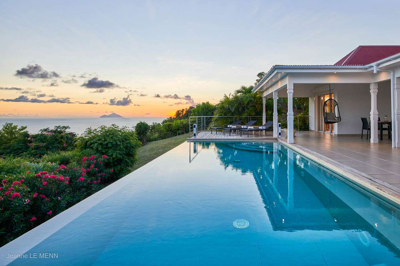 A terrace surrounds the infinity pool, stretching towards the edge of the property. Comfortable lounge chairs surround the water, ideal spots to admire the sunny views by day or twinkling harbor lights at night. In the distance is St. Kitts, while closer to shore are the islands of Les Gros Islets, Le Pain de Sucre, and Les Petits Saints.