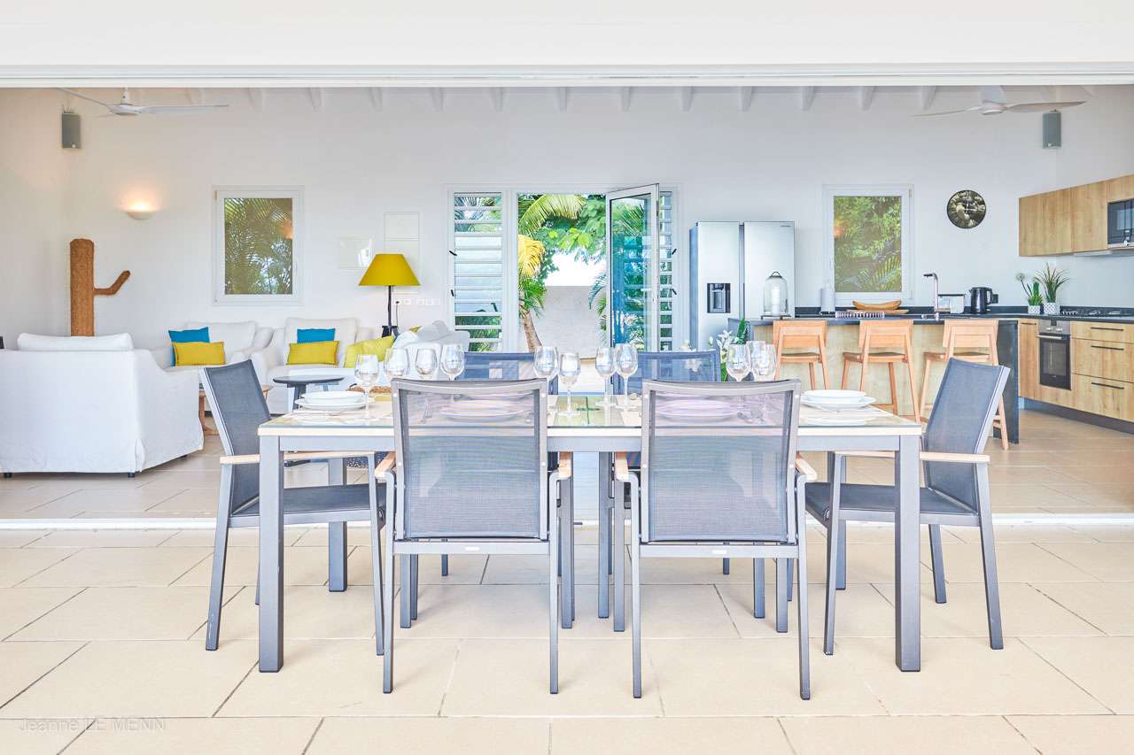 The large, covered terrace is great for enjoying the island weather. Next to the dining table is a comfortable lounge area, encouraging you to curl up with a good book or kick back with a tropical cocktail. From here, the sunset views over the water are amazing.