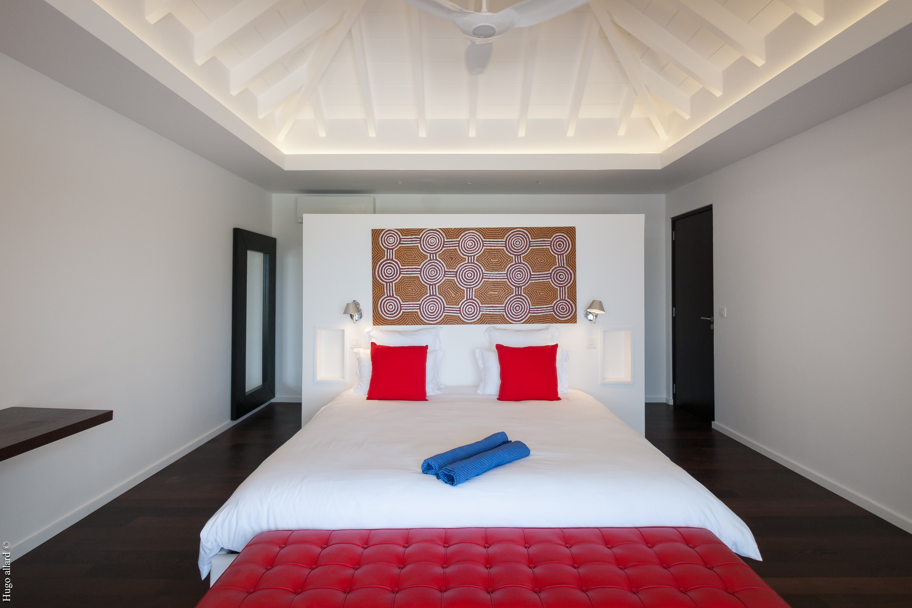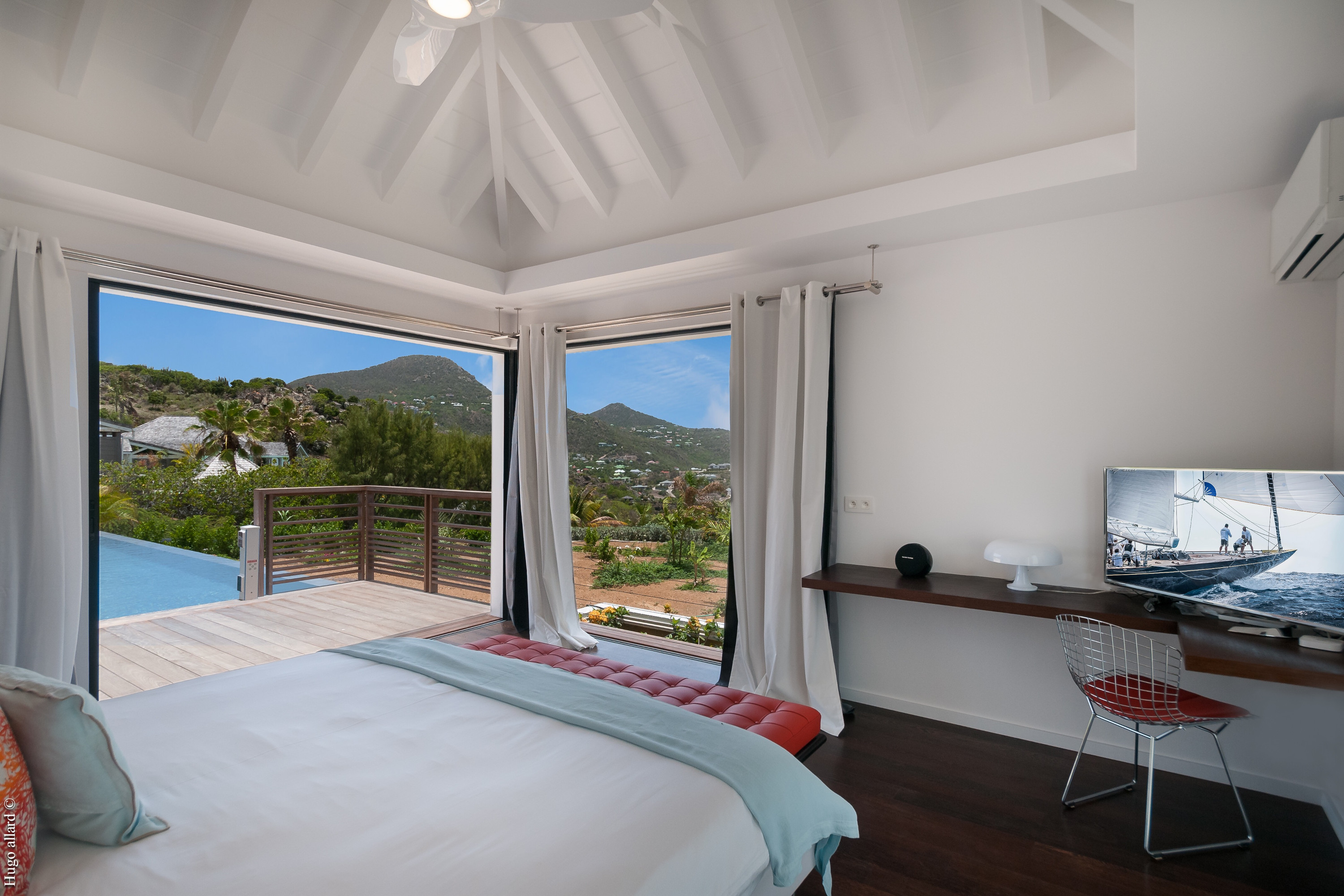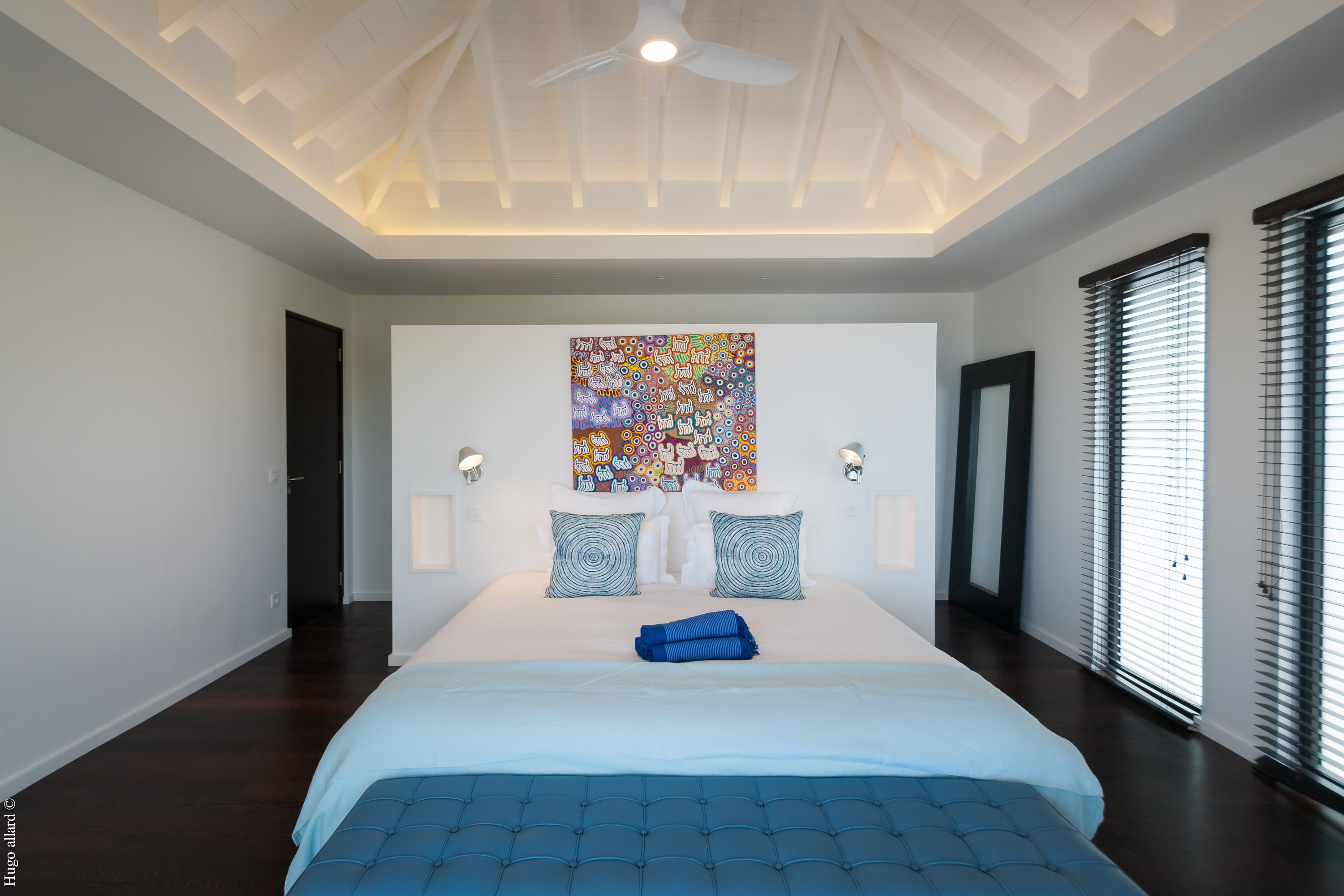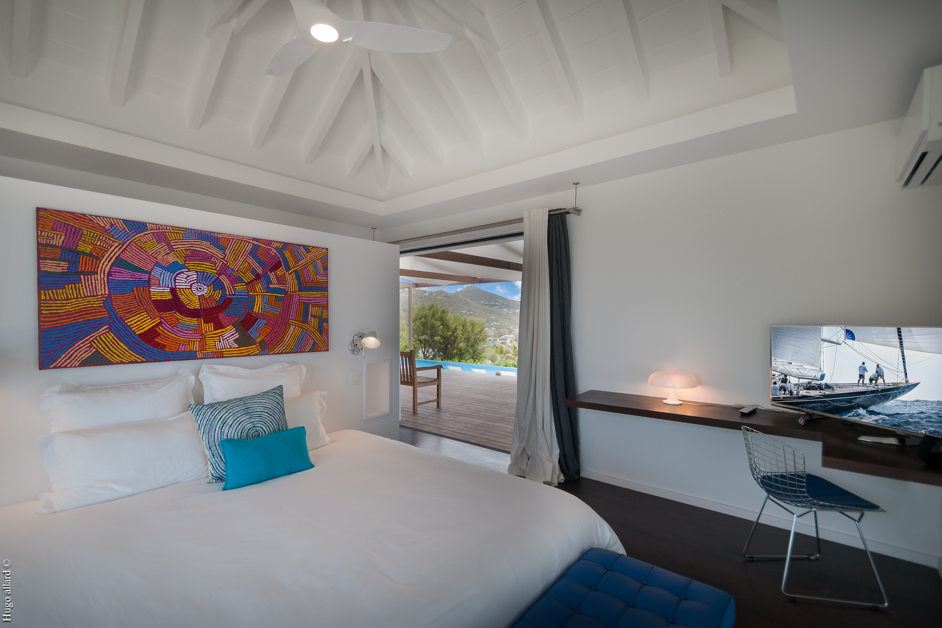 Welcome to Villa Cairn (villa code: WV CAI), a contemporary 4-bedroom villa in Petit Cul de Sac, St. Barts. Chic, elegant, and gracefully blending and complementing the surrounding landscapes, this island home is a comfortable base for a laid-back Caribbean getaway. The interiors of Villa Cairn are understated and elegant. Clean white walls and vaulted ceilings combine to create a space that’s rich in natural light, with high-end furnishings providing the comforts of home. Tasteful Aboriginal artworks on the walls add an earthy touch, ideally suited for the rugged hills in this corner of St. Barts. As part of the private Domaine Du Levant gated community, Villa Cairn enjoys sublime views over the Petit Cul de Sac. Facing to the west, the sunset views are also incredible. The azure waters and soft sands of the beach are 3 minutes away, while shops and restaurants are 10 minutes by car. The large main room with a high ceiling features a living room on one side, a dining room, and a modern open kitchen on the other side. At once sophisticated yet accessible, it’s a graceful spot to spend some relaxed downtime inside. The living room is furnished with modern couches and has satellite TV. The entire main room opens wide to the covered deck, letting you kick back and admire the views with the ocean breeze washing through the home. The high-end kitchen at Villa Cairn is sleek and modern, with a suite of appliances to help make cooking easy. WIMCO’s concierge service can even step in by arranging a private chef to pay a visit to your villa one evening, preparing a gourmet island feast for your family and friends. There’s an indoor dining room with seating for up to 8 guests, and a convivial place to gather over some great food. A second table sits on the covered terrace outside, encouraging long cocktail hours that turn into dinner and more drinks after the incredible sunset. Each air-conditioned bedroom at Villa Cairn has a king-sized bed, an ensuite bathroom with a shower, safe, screens, and U.S. satellite TV. The Aboriginal artworks hanging above each bed give the room a rustic touch, complementing the otherwise all-white décor. Stylish and low-key, these spaces are well-suited to getting a good night’s rest. There are two bedrooms located on either side of the main room. The third guest bedroom is accessed from the terrace, while the fourth bedroom is situated in a separate bungalow. A vast terrace stretches out the full length of Villa Cairn, offering ample shade and seating. A few steps descend to the sundeck, which surrounds the large, solar-heated pool with stairs and an alarm. You could easily spend a whole day here, slipping into the water between sunbathing sessions on the loungers. The outdoor lounge area is the ideal setting for sunset drinks, toasting to your island vacation as the fading afternoon sends hues of red, yellow, and gold across the hills on either side of Petit Cul de Sac. And for beach days, it’s only 3 minutes away to the quiet shores of the bay – or there’s the private beach a part of Domaine the Levant. During the December holidays, the villa rents at full occupancy rates regardless of how many bedrooms are used.Please fill out the form to begin your inquiry and we will connect you with a seasoned villa rental specialist.