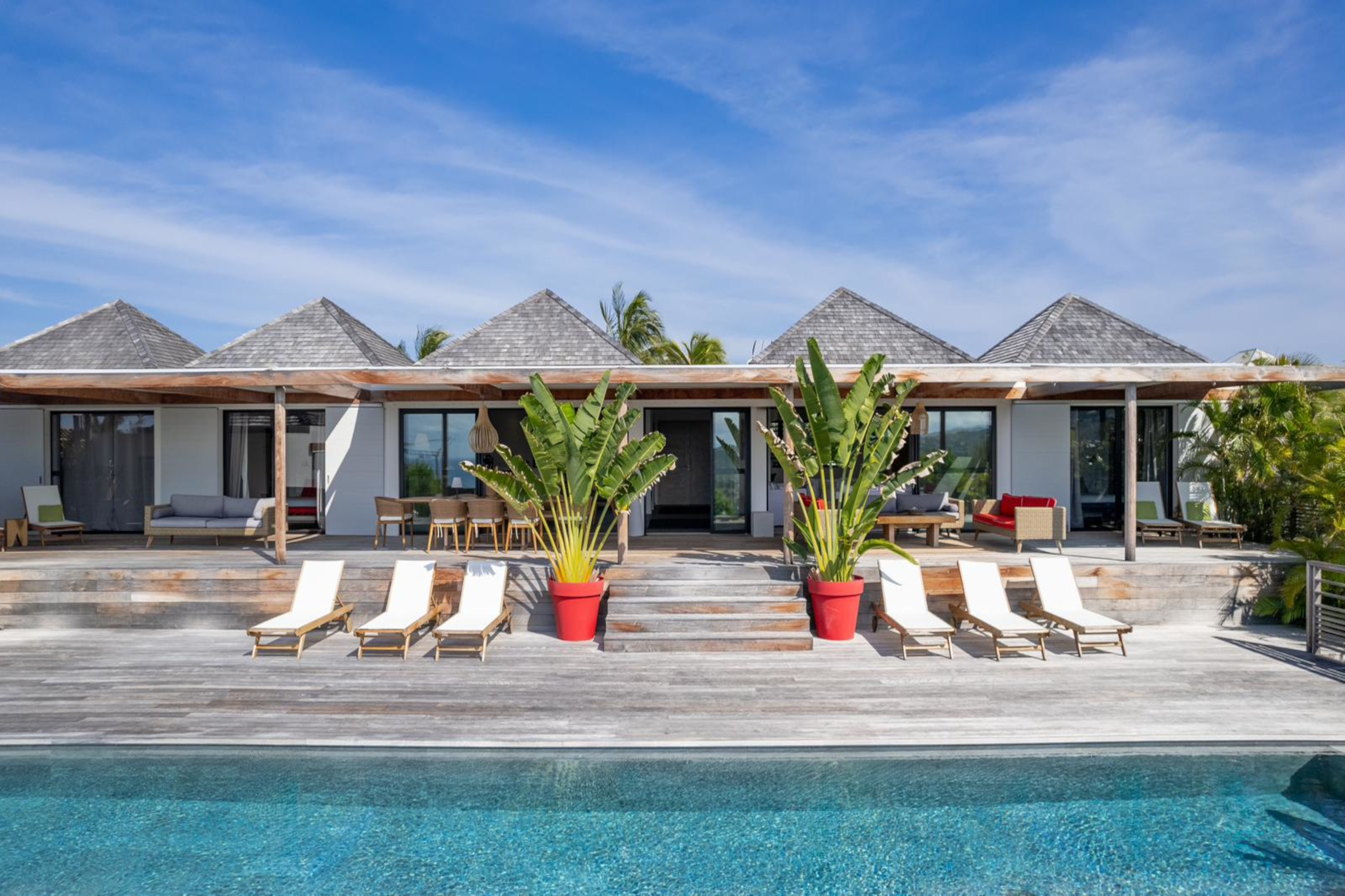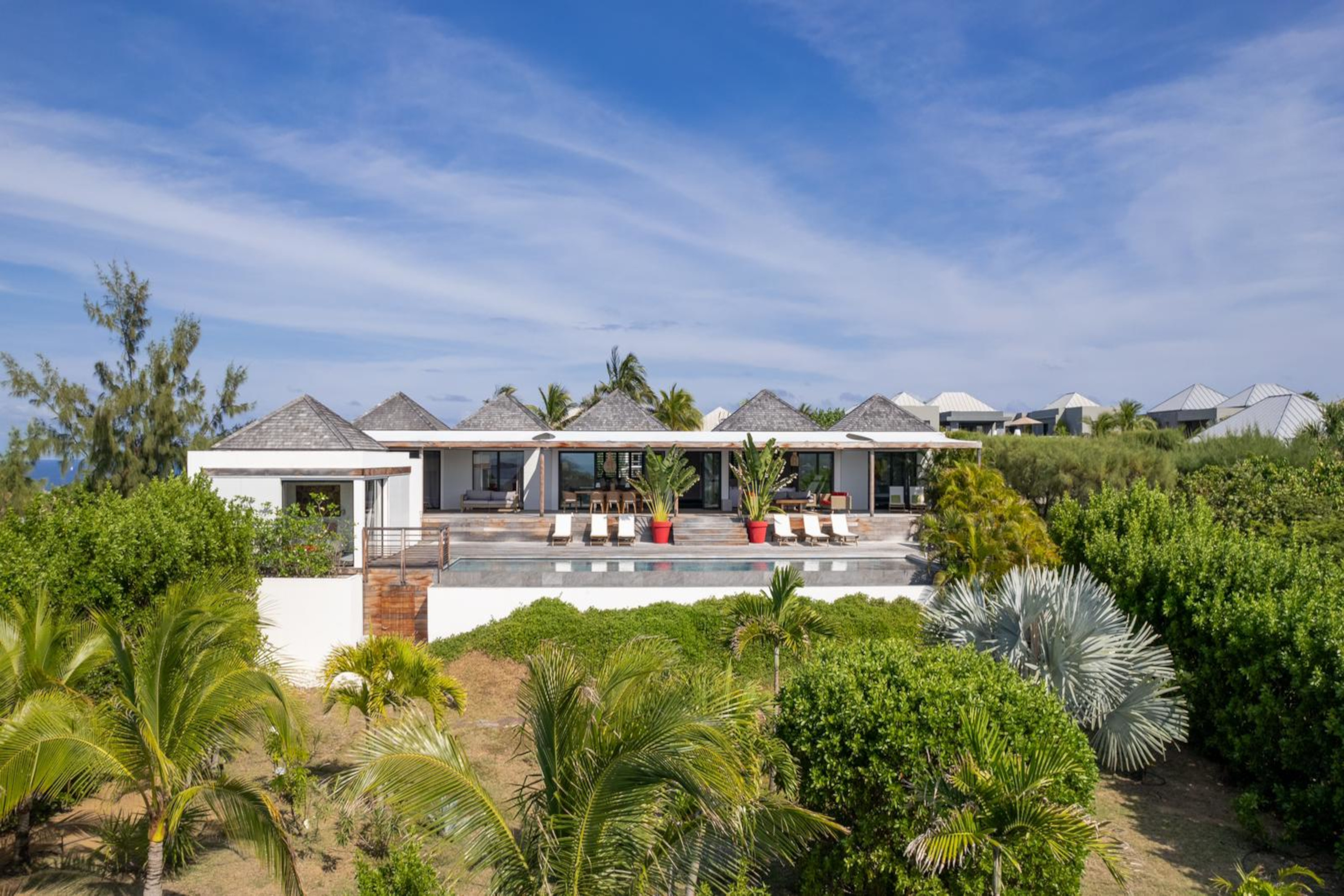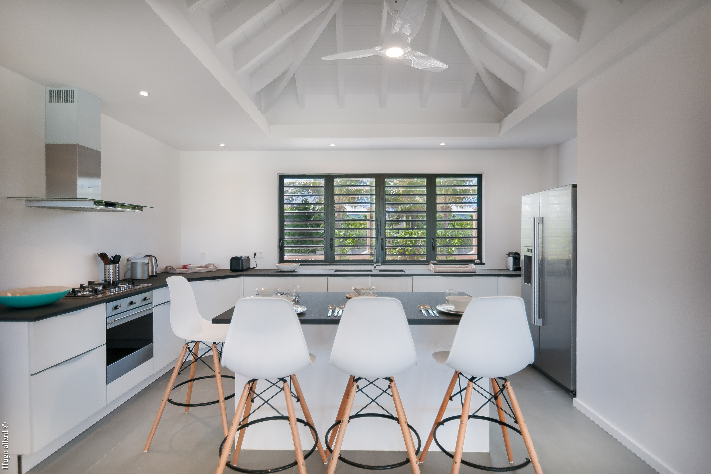 Welcome to Villa Cairn (villa code: WV CAI), a contemporary 4-bedroom villa in Petit Cul de Sac, St. Barts. Chic, elegant, and gracefully blending and complementing the surrounding landscapes, this island home is a comfortable base for a laid-back Caribbean getaway. The interiors of Villa Cairn are understated and elegant. Clean white walls and vaulted ceilings combine to create a space that’s rich in natural light, with high-end furnishings providing the comforts of home. Tasteful Aboriginal artworks on the walls add an earthy touch, ideally suited for the rugged hills in this corner of St. Barts. As part of the private Domaine Du Levant gated community, Villa Cairn enjoys sublime views over the Petit Cul de Sac. Facing to the west, the sunset views are also incredible. The azure waters and soft sands of the beach are 3 minutes away, while shops and restaurants are 10 minutes by car. The large main room with a high ceiling features a living room on one side, a dining room, and a modern open kitchen on the other side. At once sophisticated yet accessible, it’s a graceful spot to spend some relaxed downtime inside. The living room is furnished with modern couches and has satellite TV. The entire main room opens wide to the covered deck, letting you kick back and admire the views with the ocean breeze washing through the home. The high-end kitchen at Villa Cairn is sleek and modern, with a suite of appliances to help make cooking easy. WIMCO’s concierge service can even step in by arranging a private chef to pay a visit to your villa one evening, preparing a gourmet island feast for your family and friends. There’s an indoor dining room with seating for up to 8 guests, and a convivial place to gather over some great food. A second table sits on the covered terrace outside, encouraging long cocktail hours that turn into dinner and more drinks after the incredible sunset. Each air-conditioned bedroom at Villa Cairn has a king-sized bed, an ensuite bathroom with a shower, safe, screens, and U.S. satellite TV. The Aboriginal artworks hanging above each bed give the room a rustic touch, complementing the otherwise all-white décor. Stylish and low-key, these spaces are well-suited to getting a good night’s rest. There are two bedrooms located on either side of the main room. The third guest bedroom is accessed from the terrace, while the fourth bedroom is situated in a separate bungalow. A vast terrace stretches out the full length of Villa Cairn, offering ample shade and seating. A few steps descend to the sundeck, which surrounds the large, solar-heated pool with stairs and an alarm. You could easily spend a whole day here, slipping into the water between sunbathing sessions on the loungers. The outdoor lounge area is the ideal setting for sunset drinks, toasting to your island vacation as the fading afternoon sends hues of red, yellow, and gold across the hills on either side of Petit Cul de Sac. And for beach days, it’s only 3 minutes away to the quiet shores of the bay – or there’s the private beach a part of Domaine the Levant. During the December holidays, the villa rents at full occupancy rates regardless of how many bedrooms are used.Please fill out the form to begin your inquiry and we will connect you with a seasoned villa rental specialist.