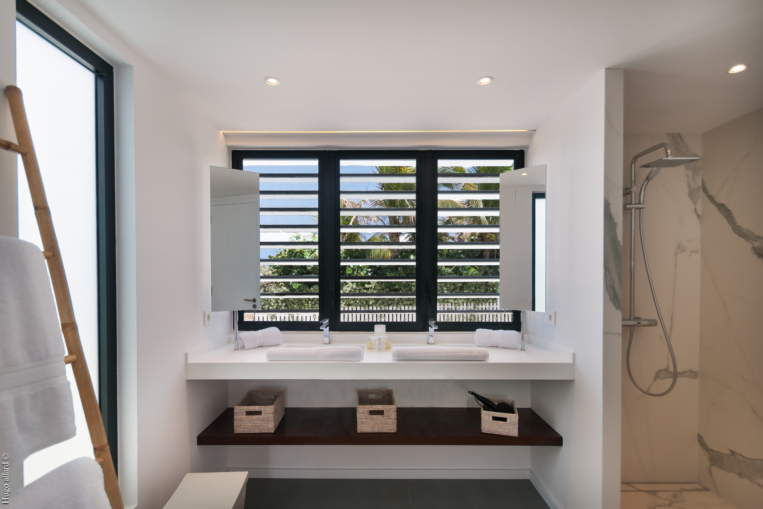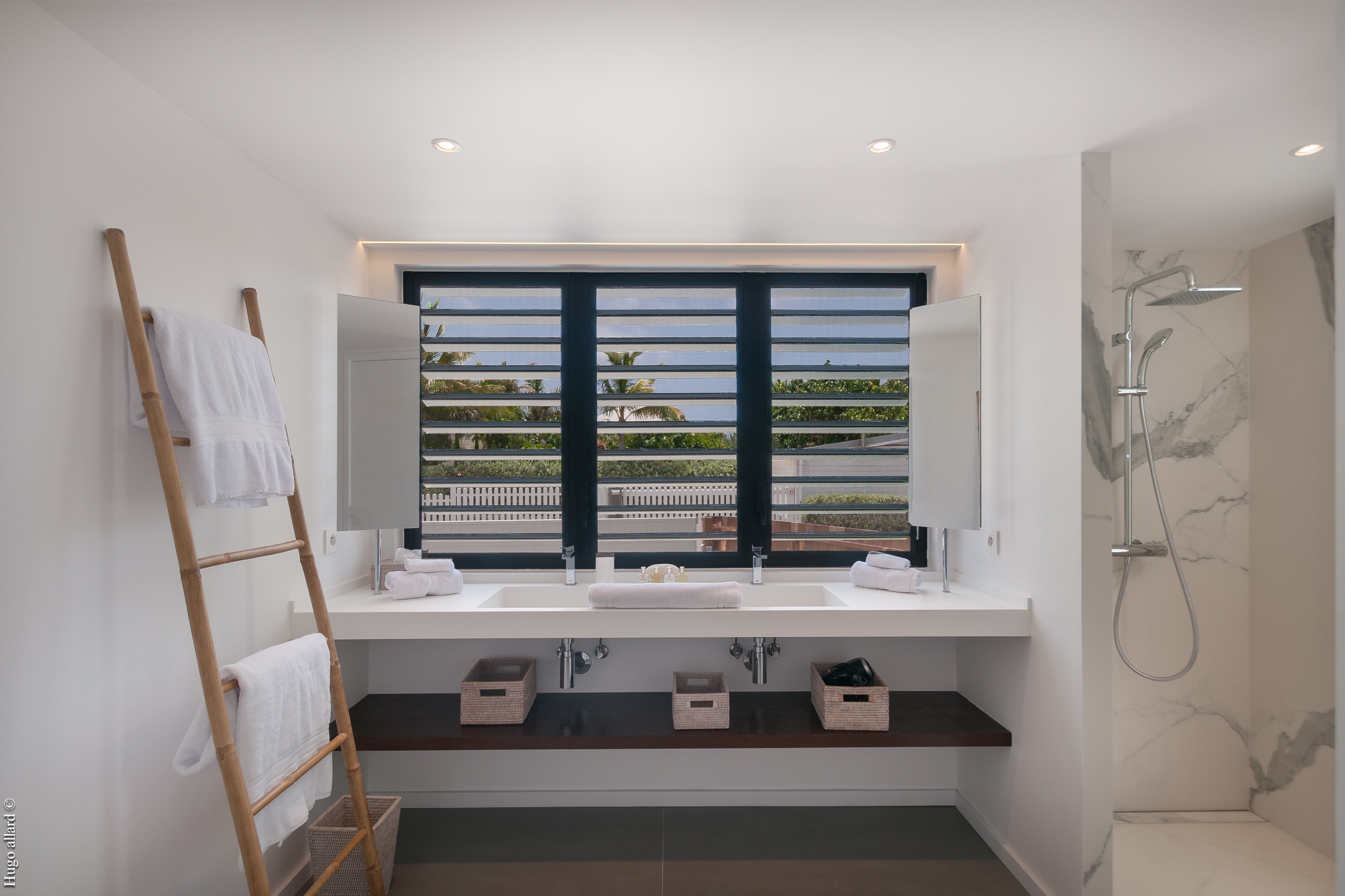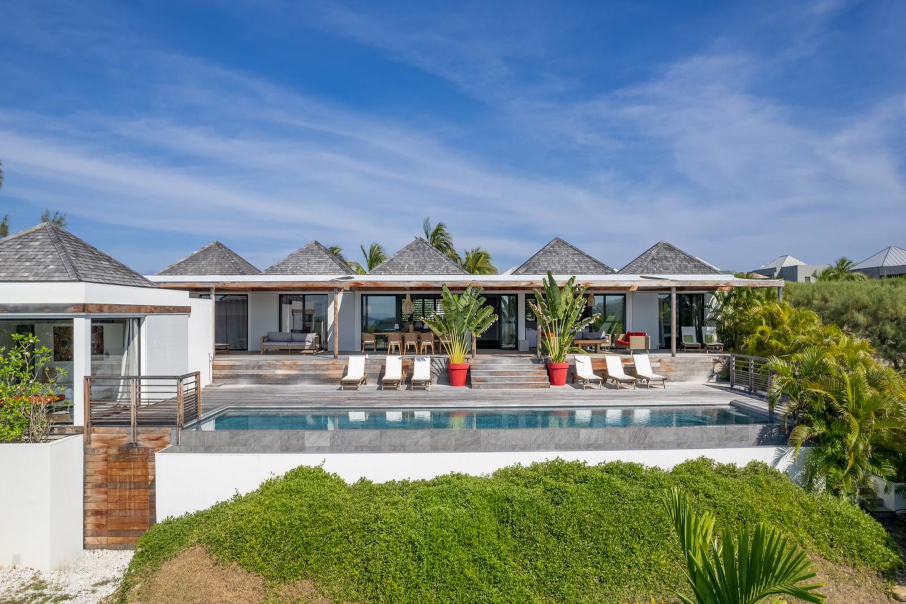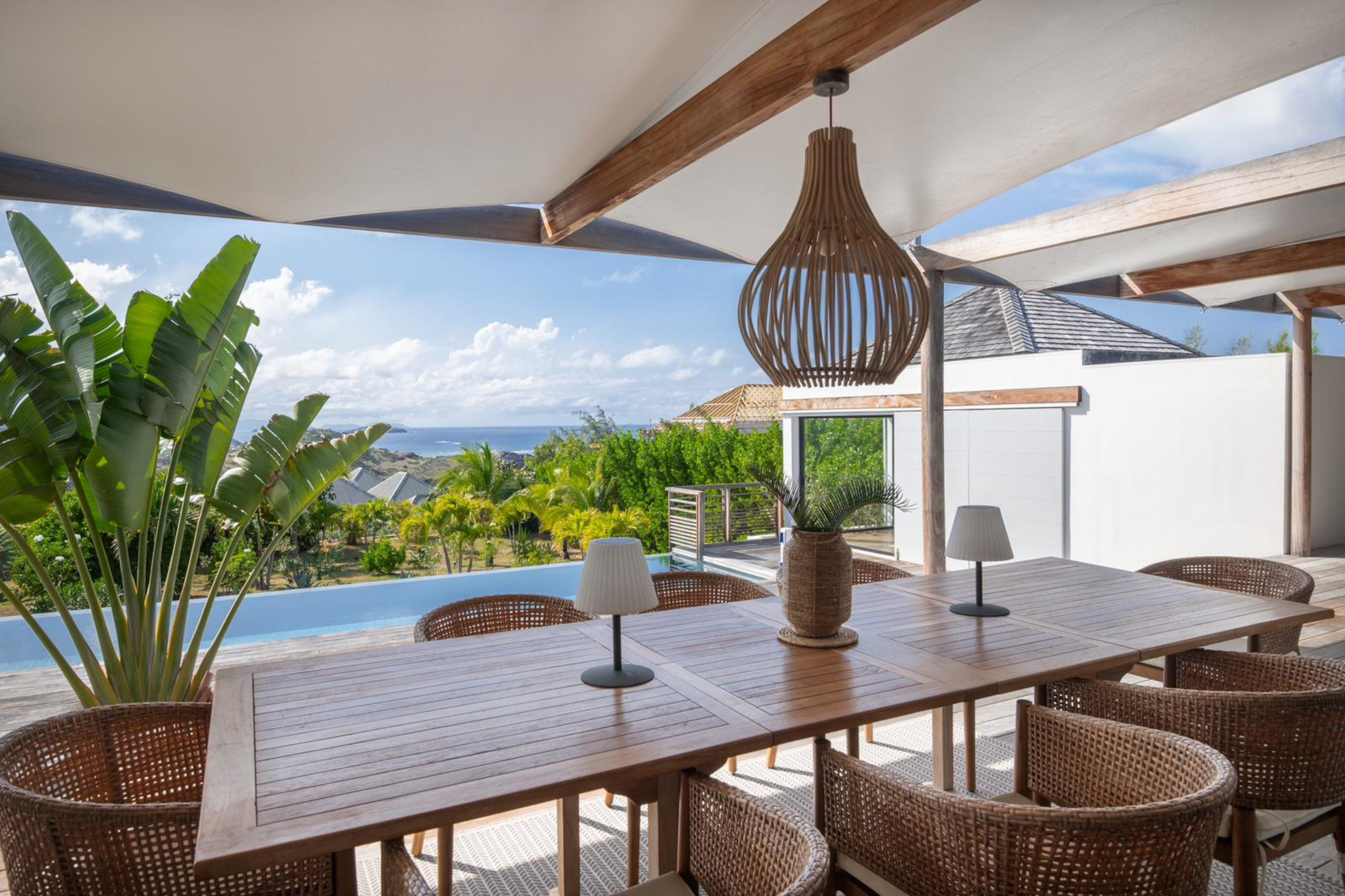 Welcome to Villa Cairn (villa code: WV CAI), a contemporary 4-bedroom villa in Petit Cul de Sac, St. Barts. Chic, elegant, and gracefully blending and complementing the surrounding landscapes, this island home is a comfortable base for a laid-back Caribbean getaway. The interiors of Villa Cairn are understated and elegant. Clean white walls and vaulted ceilings combine to create a space that’s rich in natural light, with high-end furnishings providing the comforts of home. Tasteful Aboriginal artworks on the walls add an earthy touch, ideally suited for the rugged hills in this corner of St. Barts. As part of the private Domaine Du Levant gated community, Villa Cairn enjoys sublime views over the Petit Cul de Sac. Facing to the west, the sunset views are also incredible. The azure waters and soft sands of the beach are 3 minutes away, while shops and restaurants are 10 minutes by car. The large main room with a high ceiling features a living room on one side, a dining room, and a modern open kitchen on the other side. At once sophisticated yet accessible, it’s a graceful spot to spend some relaxed downtime inside. The living room is furnished with modern couches and has satellite TV. The entire main room opens wide to the covered deck, letting you kick back and admire the views with the ocean breeze washing through the home. The high-end kitchen at Villa Cairn is sleek and modern, with a suite of appliances to help make cooking easy. WIMCO’s concierge service can even step in by arranging a private chef to pay a visit to your villa one evening, preparing a gourmet island feast for your family and friends. There’s an indoor dining room with seating for up to 8 guests, and a convivial place to gather over some great food. A second table sits on the covered terrace outside, encouraging long cocktail hours that turn into dinner and more drinks after the incredible sunset. Each air-conditioned bedroom at Villa Cairn has a king-sized bed, an ensuite bathroom with a shower, safe, screens, and U.S. satellite TV. The Aboriginal artworks hanging above each bed give the room a rustic touch, complementing the otherwise all-white décor. Stylish and low-key, these spaces are well-suited to getting a good night’s rest. There are two bedrooms located on either side of the main room. The third guest bedroom is accessed from the terrace, while the fourth bedroom is situated in a separate bungalow. A vast terrace stretches out the full length of Villa Cairn, offering ample shade and seating. A few steps descend to the sundeck, which surrounds the large, solar-heated pool with stairs and an alarm. You could easily spend a whole day here, slipping into the water between sunbathing sessions on the loungers. The outdoor lounge area is the ideal setting for sunset drinks, toasting to your island vacation as the fading afternoon sends hues of red, yellow, and gold across the hills on either side of Petit Cul de Sac. And for beach days, it’s only 3 minutes away to the quiet shores of the bay – or there’s the private beach a part of Domaine the Levant. During the December holidays, the villa rents at full occupancy rates regardless of how many bedrooms are used.Please fill out the form to begin your inquiry and we will connect you with a seasoned villa rental specialist.