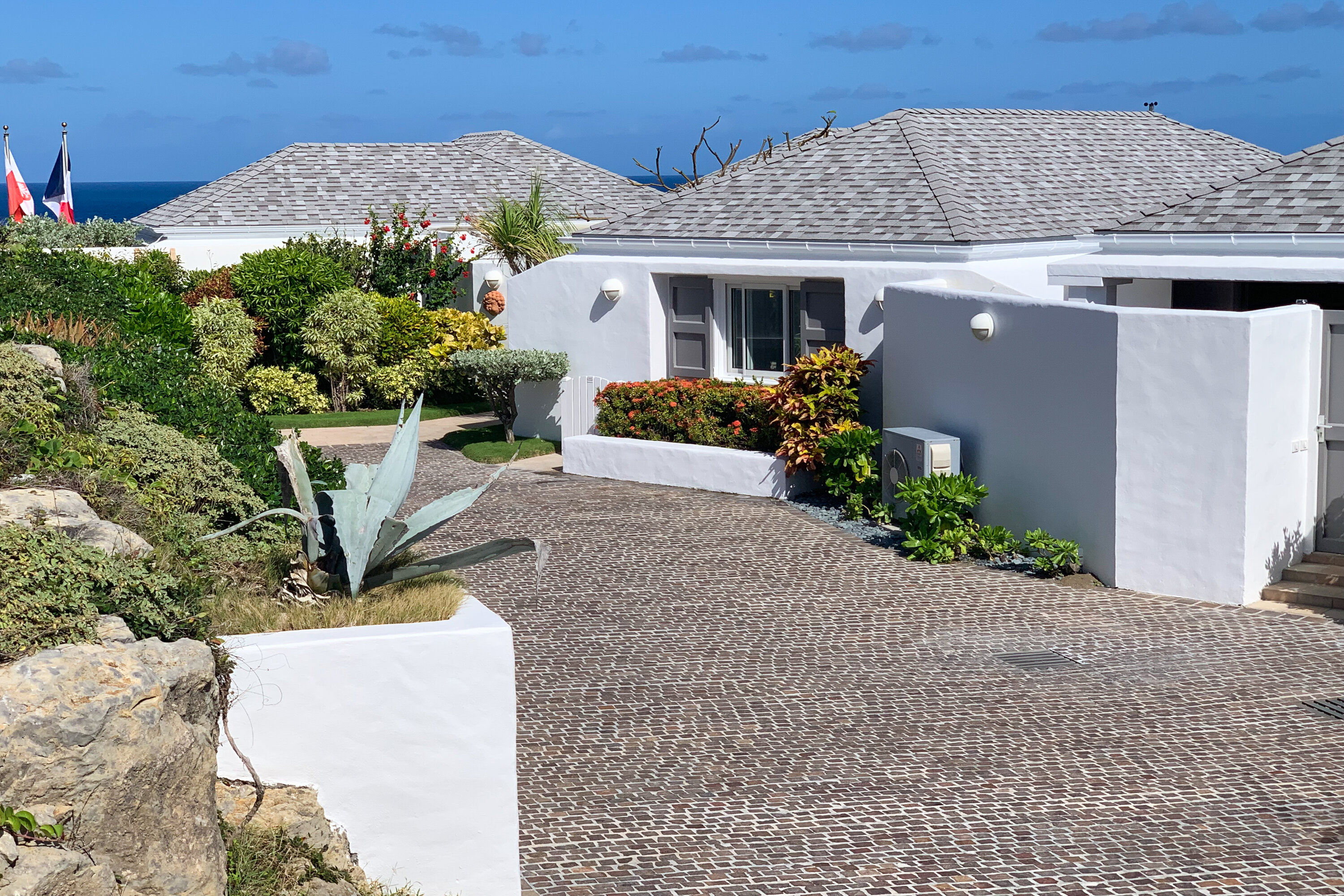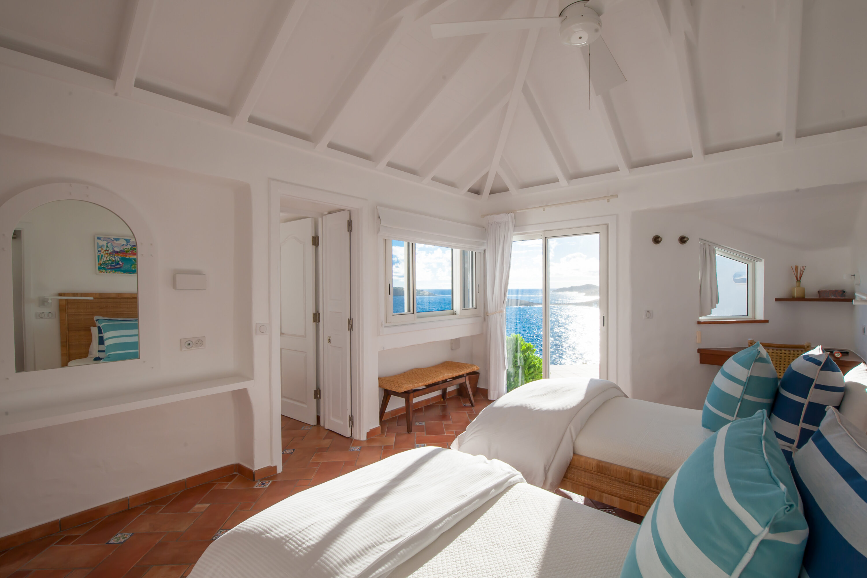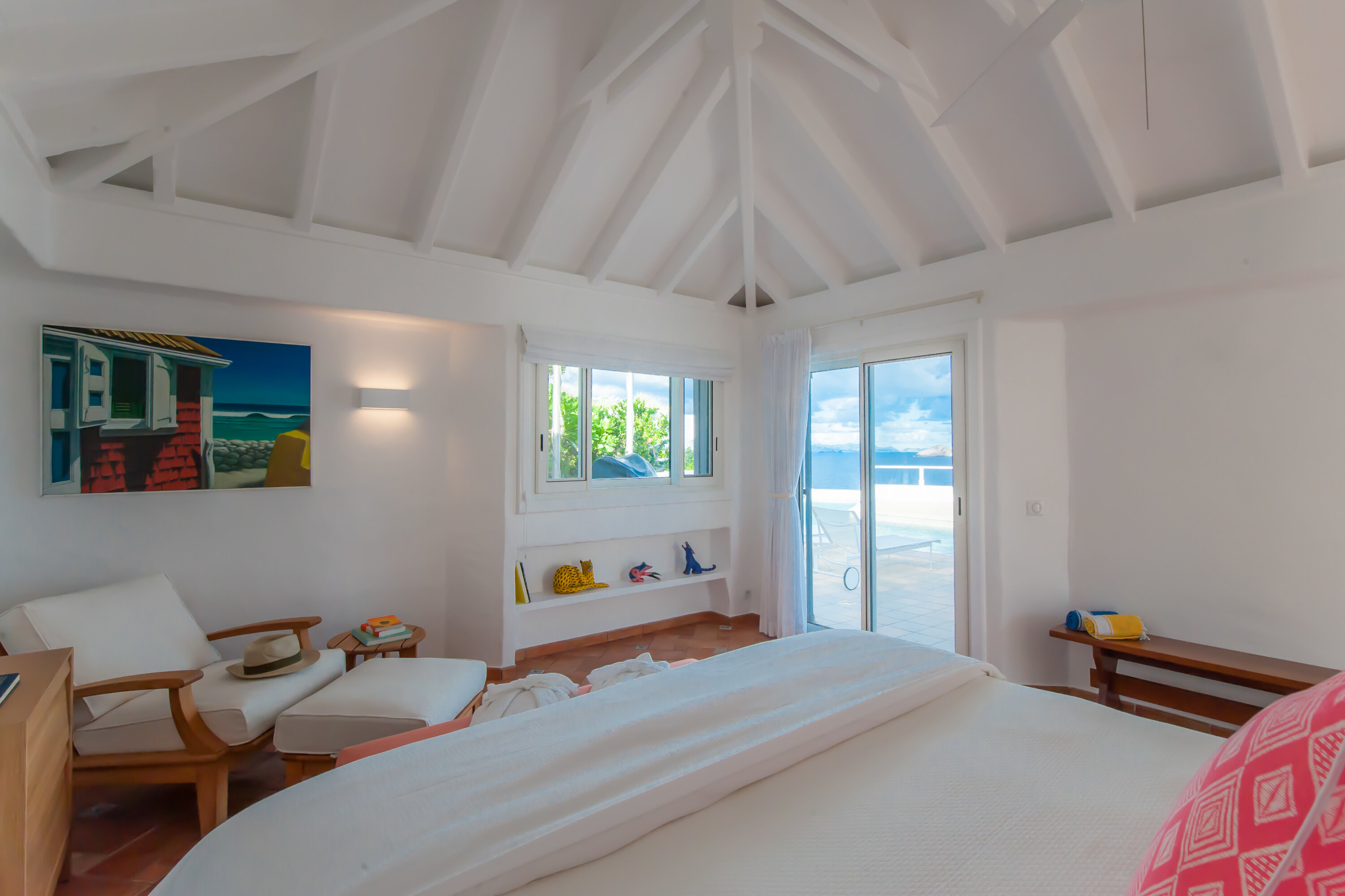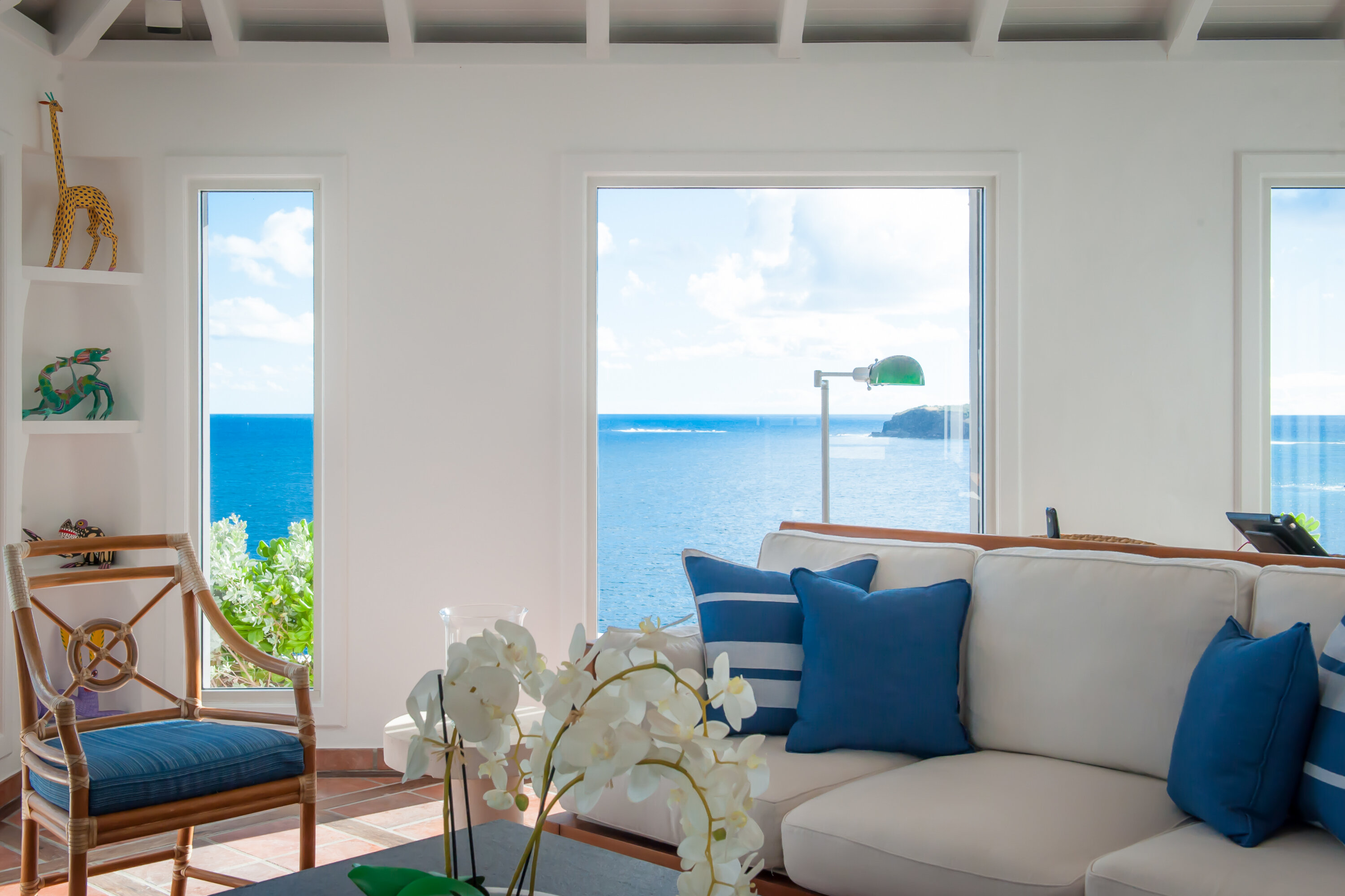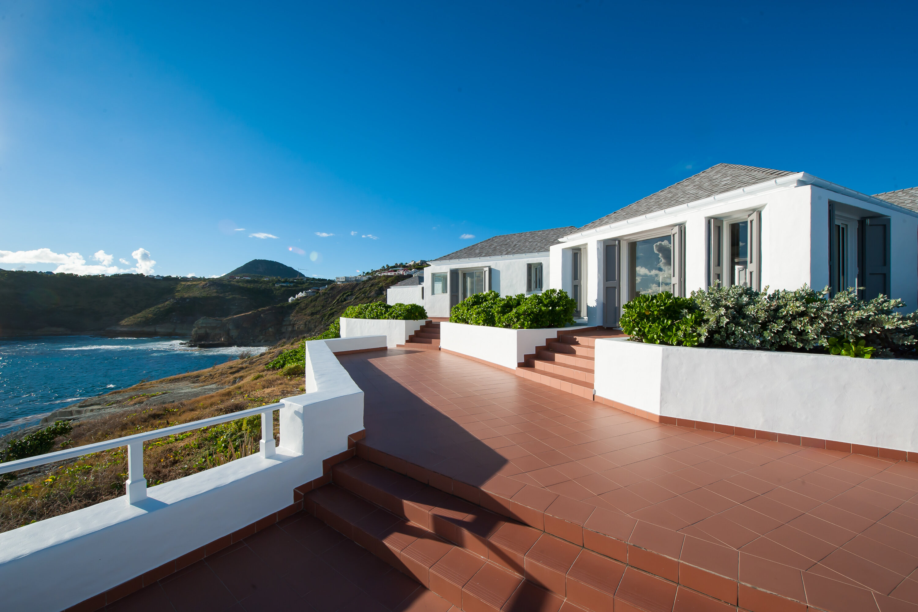 Welcome to Villa Cap au Vent, a recently renovated 4-bedroom home with all the modern conveniences expected of a luxury villa. Positioned at the tip of Pointe Milou on St. Barts, this property offers some of the most stunning views in the Caribbean. From its clifftop location, guests can enjoy 270-degree views over the ocean and the islands Île Toc Vers, Île Fregate, Île Bonhomme, and La Tortue in the foreground, and St Martin and Anguilla in the distance. Whether it’s an early morning sunrise, migrating whales, or a rosy gold sunset, Villa Cap au Vent has the best seat in the house. Within short driving distance you’ll find the golden sands of Lorient Beach or Marigot Beach, while restaurants and shopping in St-Jean are only 10 minutes away by car. Living Spaces: Cool and contemporary interiors are dazzling in white, with chic Caribbean style and décor. Vaulted ceilings, clean lines, and accents of ocean colors all create a relaxing oceanfront ambiance. The living room has a flat-screen Smart TV connected to a home theater Sonos sound system, ideal for movie nights. The screened windows keep the room light and airy, while blue trim blends with the ocean views. Kitchen and Dining Area: Villa Cap au Vent features a warm and inviting kitchen with everything you need to whip up gourmet meals during your stay. Our concierge can even organize grocery pre-stocking or delivery, catered meals, or arrange a private chef service for a special occasion. The pass-through breakfast bar is an excellent spot for your morning coffee or a casual lunch. More formal meals can be enjoyed at the dining table on the covered terrace outside, with seating for up to 12 guests. This is an excellent setting for drinking and dining while the island sunsets send blazes of gold across the sky. Bedrooms: There are 4 bedrooms at Villa Cap au Vent, each with air-conditioning, an ensuite bathroom, and luxurious Italian linens. Three of the bedrooms have king-sized beds, while the fourth has a pair of twin beds ideal for children. Screened windows let you forego the air-conditioning and let the natural ocean breezes lull you to sleep each evening. Outdoor Features: Outside, a grand covered terrace offers a protected spot to enjoy the cool island winds. Overstuffed chairs next to the dining table invite you to sink in with a cool drink and soak up the ocean views. Cap au Vent’s heated pool is steps away – relaxing in the water all day is easy. Reaching out towards the ocean, the infinity-edge makes you feel as if you’re floating above the waves. When it’s time to dry off, loungers line the water letting you bask in the Caribbean sun. Venture beyond the colorful gardens that surround Villa Cap au Vent and you’ll find plenty of natural beauty on St. Barts. Along the coast to the southwest is Lorient Beach, a calm and sheltered strip of sand. To the southeast is Marigot Beach, a quiet bay backed by a soothing coconut grove. Both are only 5 minutes away by car. Glamorous shops and restaurants in St Jean are 10 minutes away by car, while the capital of Gustavia is 20 minutes away. Amenities: A destination within itself, a stay at Villa Cap au Vent includes welcome treats upon arrival, nightly turndown service, personal laundry, continental breakfast, unlimited bottled water, and an open bar with premium liquors. There’s also high-speed Wi-Fi, Netflix, and U.S satellite TV. Villa Cap au Vent comes with house cleaning services six days a week (except on holidays). During the Thanksgiving holidays, the villa rents at full occupancy rates regardless of how many bedrooms are used.Please fill out the form to begin your inquiry and we will connect you with a seasoned villa rental specialist.