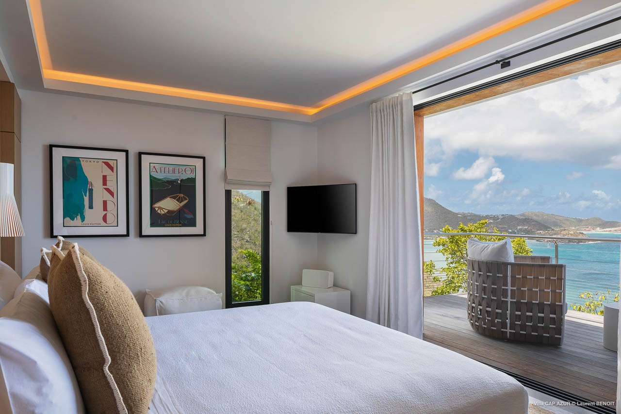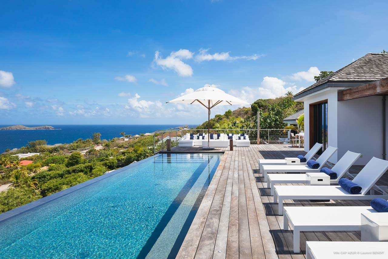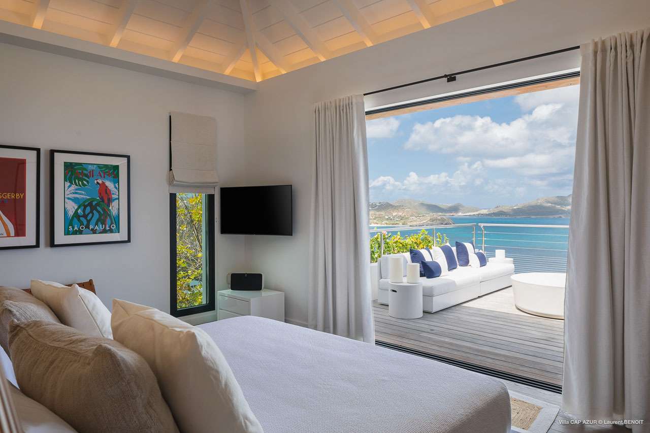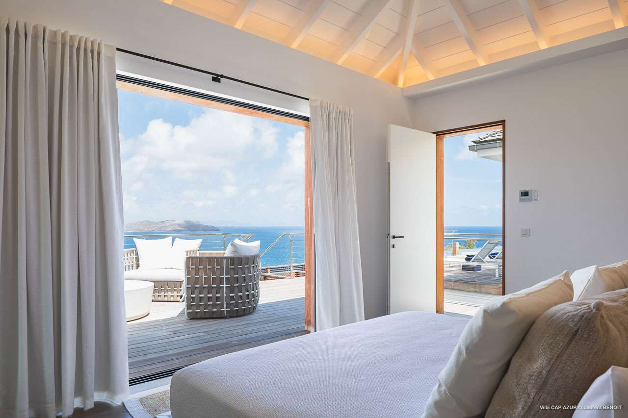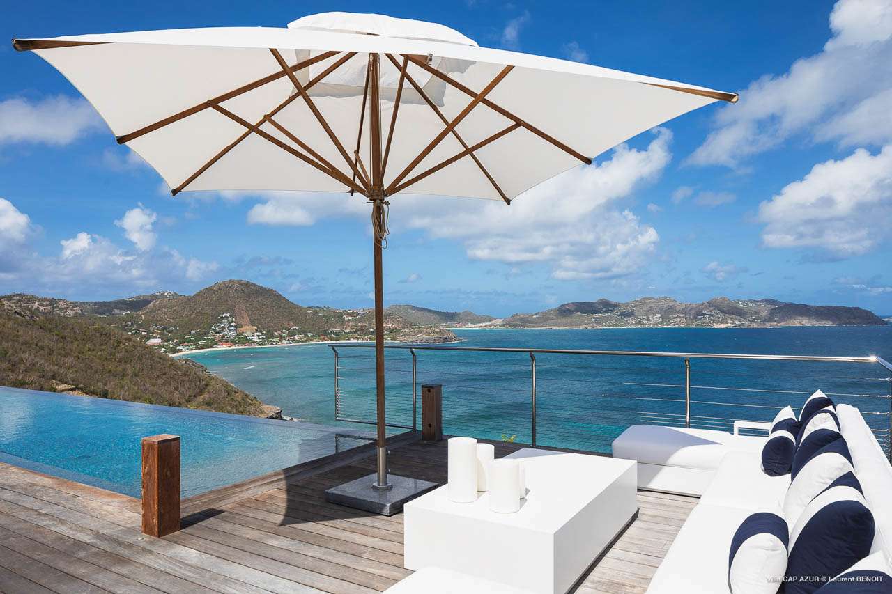 Villa Cap Azur, (villa code: WV CAA), is a newly-built, 5-bedroom villa with panoramic ocean and sunset views, high on the Pointe Milou hillside. Some villas have better views than others, and there are those that will make anyone who steps through the entrance and sees the views beyond, go “Wow!". Cap Azur is that villa. Situated high on the hillside above the Christopher hotel, and with no close neighbors, villa Cap Azur offers that breathtaking moment when you walk onto the terrace and see the panoramic ocean views, with the sun glistening in the heated infinity pool in front. The terraces are well-designed and have plenty of seating, lounging, and outdoor dining space. The terrace also flows seamlessly into the large living room with its oversized sectional that offers views from every seat, and is perfect for a group conversation out of the sun and, when needed, can be fully air-conditioned. The adjacent gourmet kitchen is fully equipped and has a large indoor dining area, which can also be air-conditioned. A separate, air-conditioned TV room completes the common spaces. The first bedroom is situated off the living and has U.S. satellite TV, a U.S. king-sized bed, a closet, and an ensuite bathroom with shower. A master bedroom is in a separate bungalow adjacent to the first, with a second master bedroom directly below, on the lower level. Both rooms have a U.S. king-sized bed, U.S. satellite and AppleTV, ample closet space, a private terrace, and an ensuite bathroom with shower. Another bedroom is also on the lower level, just across from the second master bedroom. This room is a bit smaller than the others but has two twin beds that can be made up as a European king-sized bed, U.S satellite and AppleTV, closets, and an ensuite bathroom with both a bathtub and shower. There is an additional master bedroom situated in a separate bungalow off the TV room. This spacious room comes with a private terrace, a U.S. king-sized bed, his-and-hers closets, U.S. satellite and AppleTV, and an ensuite bathroom with both an indoor and outdoor shower. This room is only available with a 5-bedroom rental. Villa Cap Azur is a great villa for couples vacationing together, but will also suit a family with teenagers. * Note - No Pets AllowedPlease fill out the form to begin your inquiry and we will connect you with a seasoned villa rental specialist.