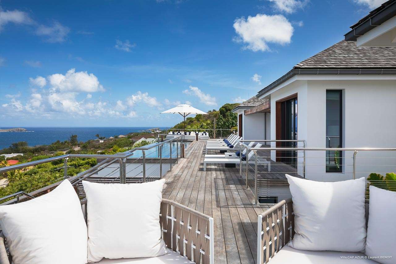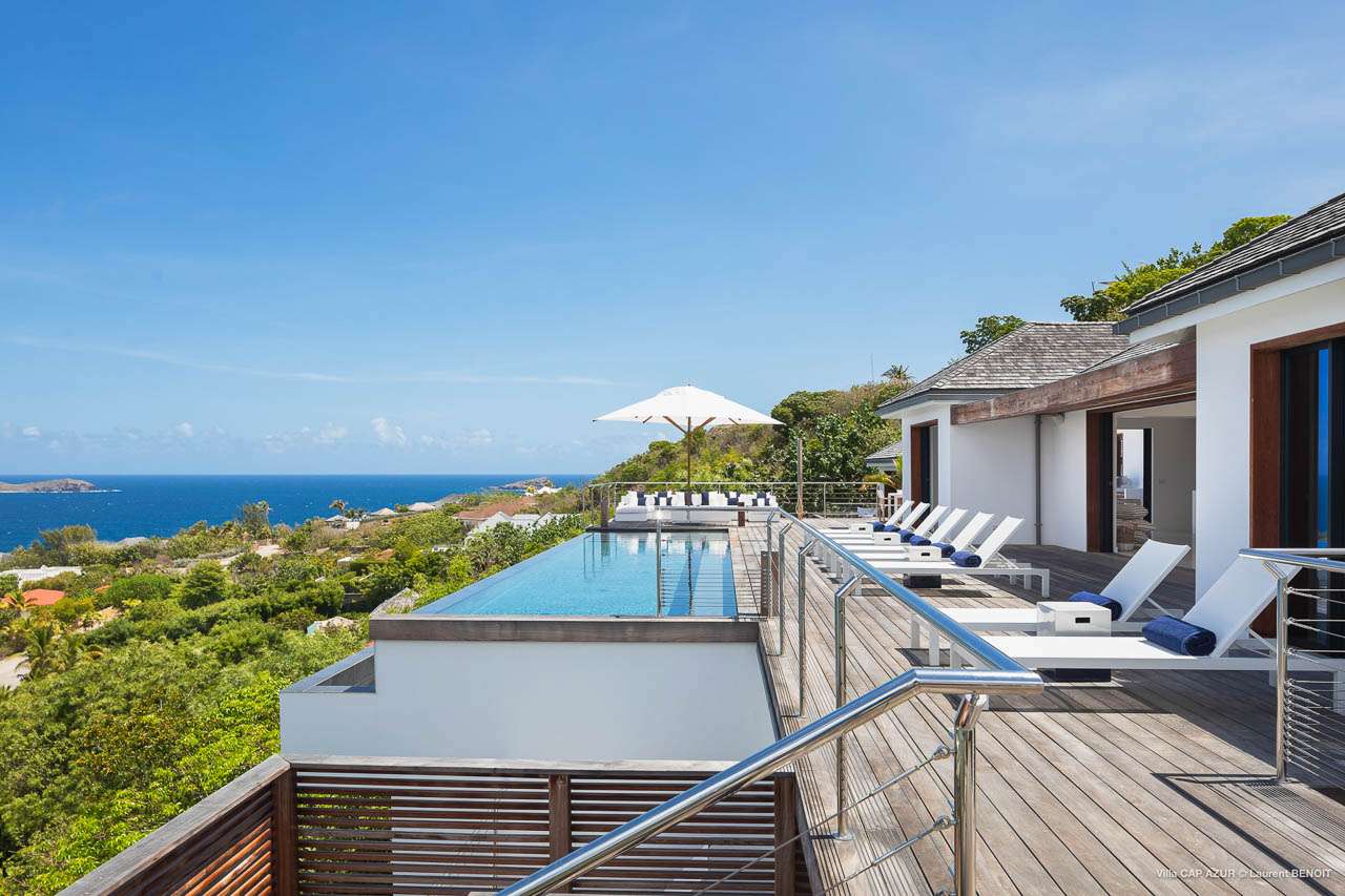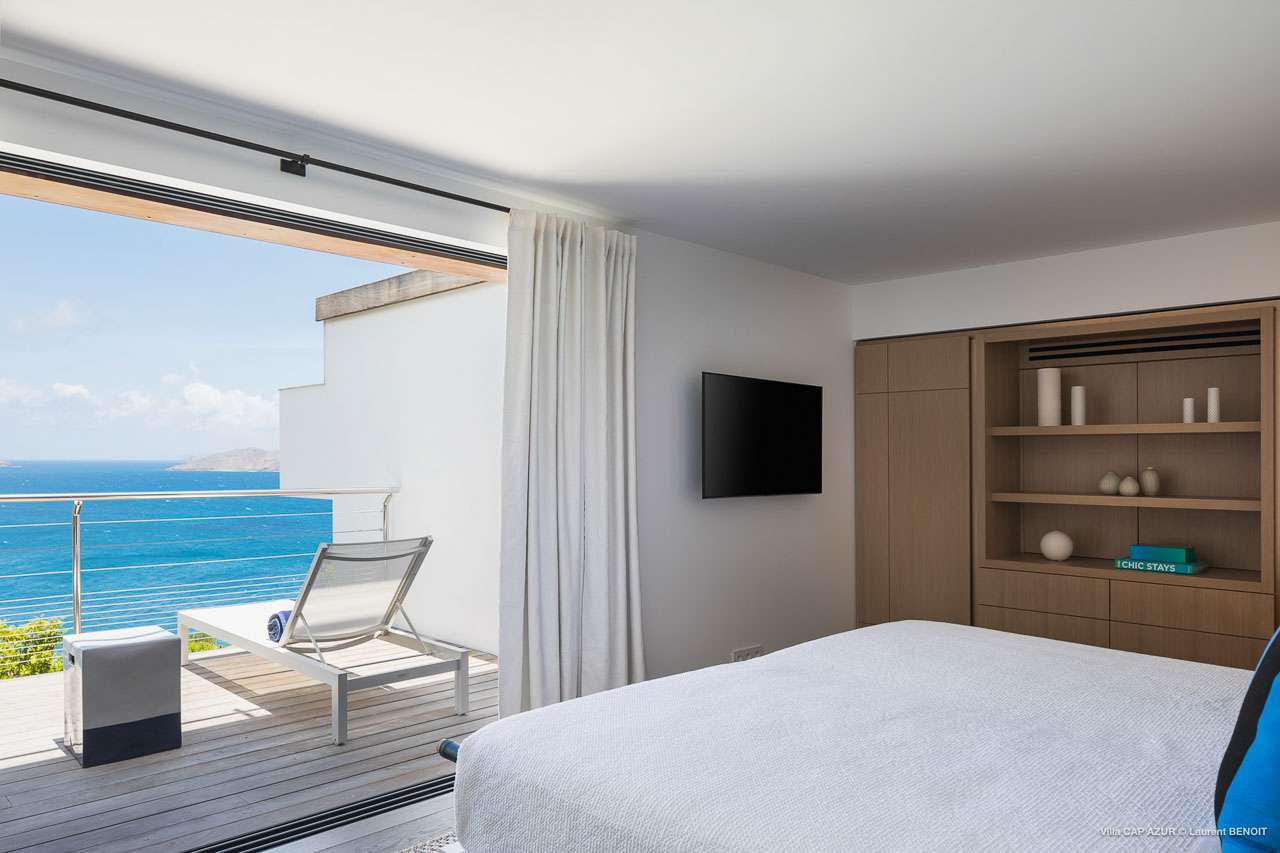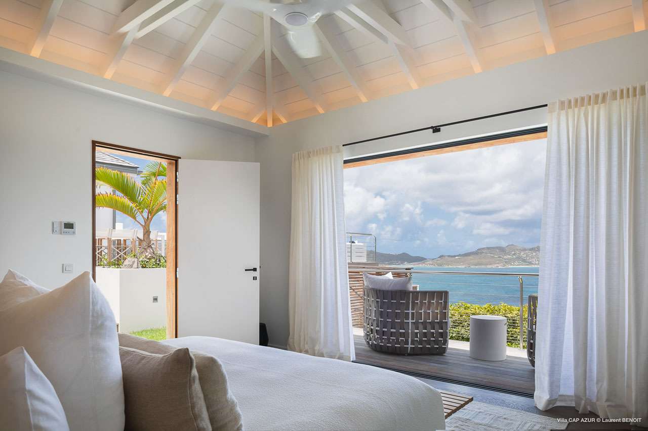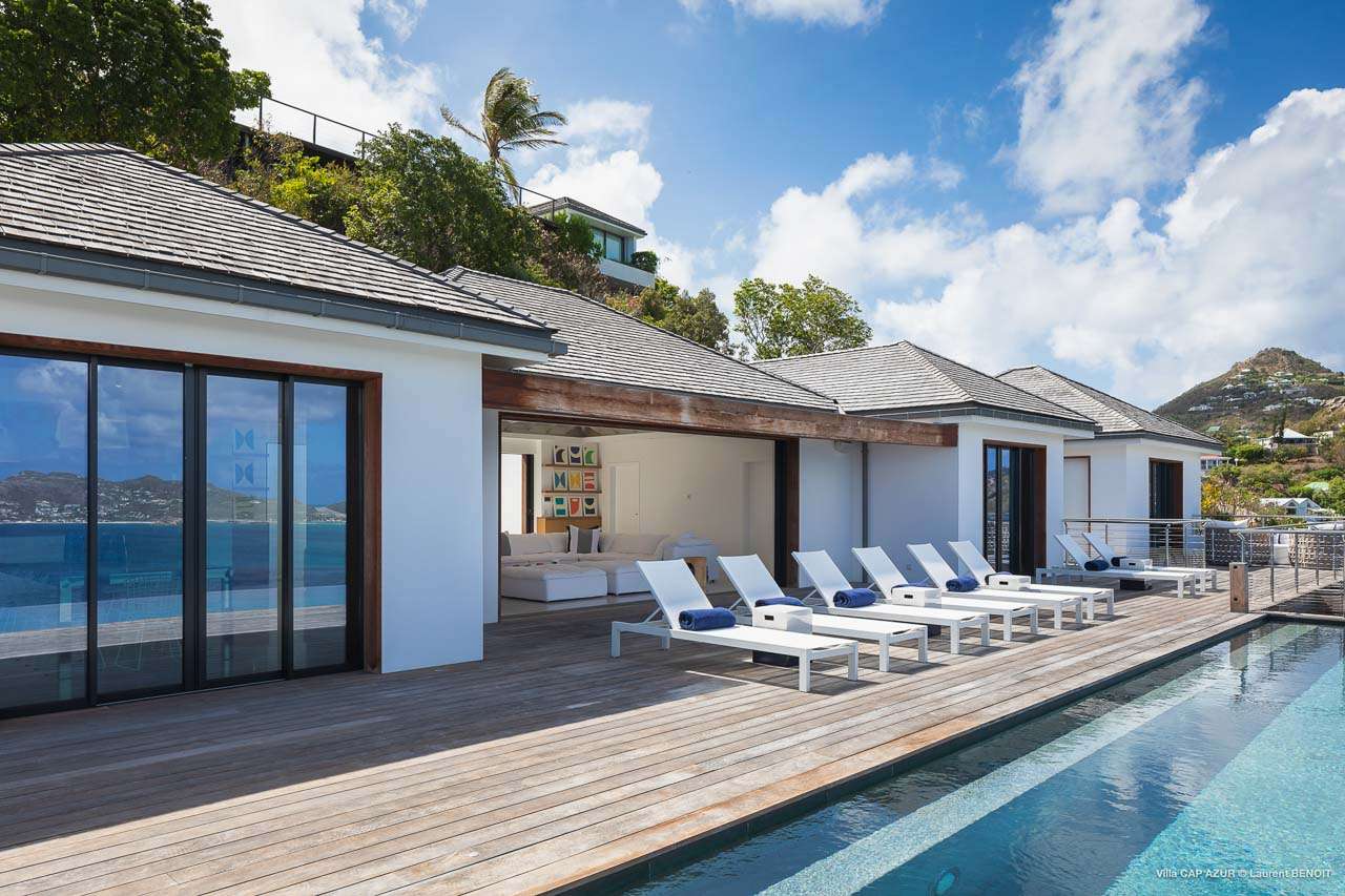 Villa Cap Azur, (villa code: WV CAA), is a newly-built, 5-bedroom villa with panoramic ocean and sunset views, high on the Pointe Milou hillside. Some villas have better views than others, and there are those that will make anyone who steps through the entrance and sees the views beyond, go “Wow!". Cap Azur is that villa. Situated high on the hillside above the Christopher hotel, and with no close neighbors, villa Cap Azur offers that breathtaking moment when you walk onto the terrace and see the panoramic ocean views, with the sun glistening in the heated infinity pool in front. The terraces are well-designed and have plenty of seating, lounging, and outdoor dining space. The terrace also flows seamlessly into the large living room with its oversized sectional that offers views from every seat, and is perfect for a group conversation out of the sun and, when needed, can be fully air-conditioned. The adjacent gourmet kitchen is fully equipped and has a large indoor dining area, which can also be air-conditioned. A separate, air-conditioned TV room completes the common spaces. The first bedroom is situated off the living and has U.S. satellite TV, a U.S. king-sized bed, a closet, and an ensuite bathroom with shower. A master bedroom is in a separate bungalow adjacent to the first, with a second master bedroom directly below, on the lower level. Both rooms have a U.S. king-sized bed, U.S. satellite and AppleTV, ample closet space, a private terrace, and an ensuite bathroom with shower. Another bedroom is also on the lower level, just across from the second master bedroom. This room is a bit smaller than the others but has two twin beds that can be made up as a European king-sized bed, U.S satellite and AppleTV, closets, and an ensuite bathroom with both a bathtub and shower. There is an additional master bedroom situated in a separate bungalow off the TV room. This spacious room comes with a private terrace, a U.S. king-sized bed, his-and-hers closets, U.S. satellite and AppleTV, and an ensuite bathroom with both an indoor and outdoor shower. This room is only available with a 5-bedroom rental. Villa Cap Azur is a great villa for couples vacationing together, but will also suit a family with teenagers. * Note - No Pets AllowedPlease fill out the form to begin your inquiry and we will connect you with a seasoned villa rental specialist.