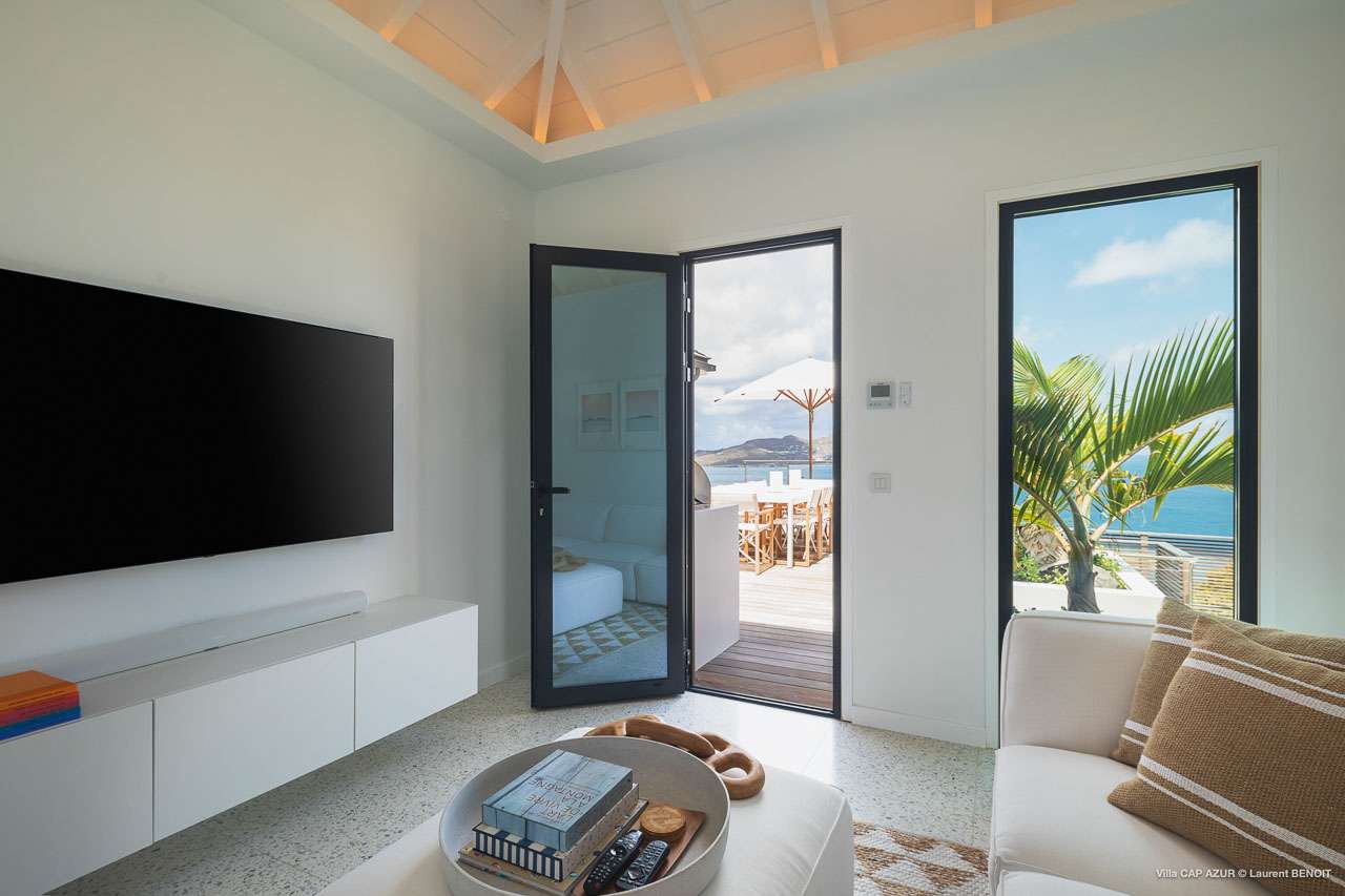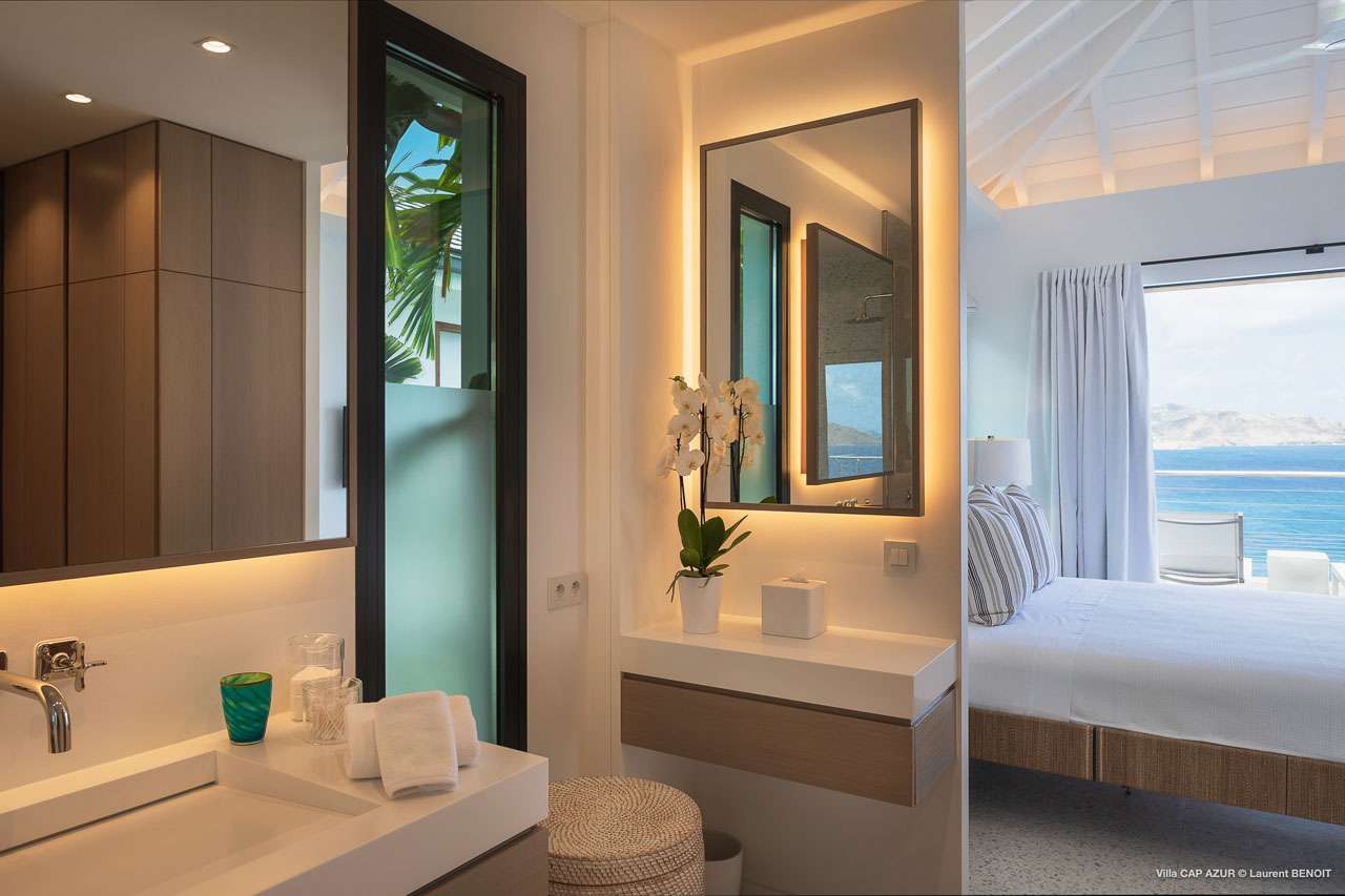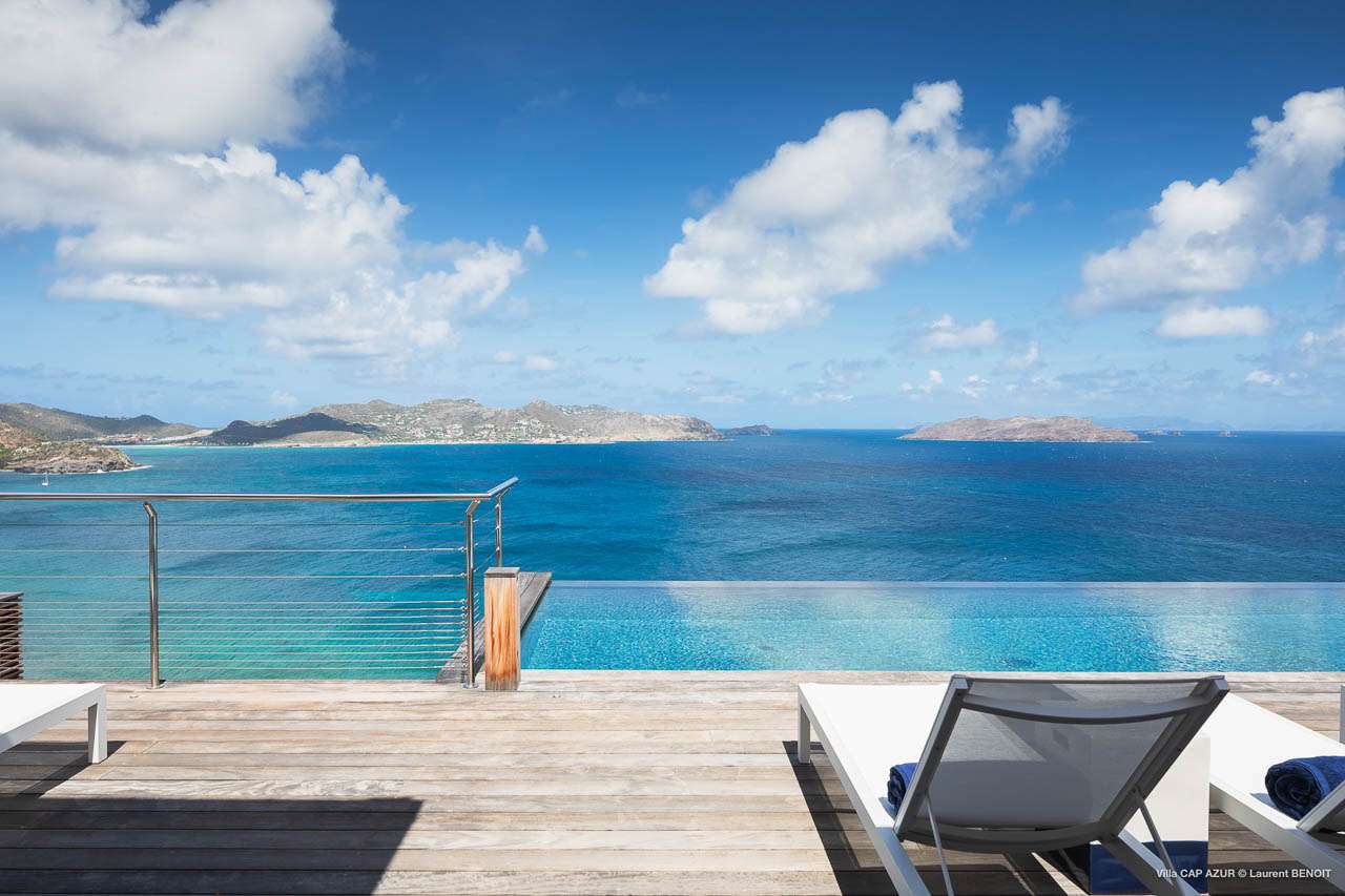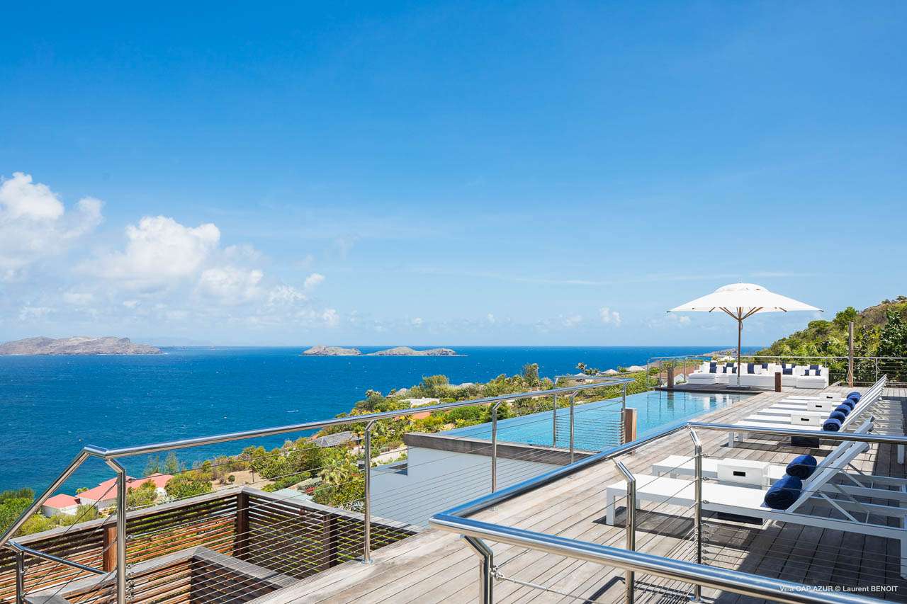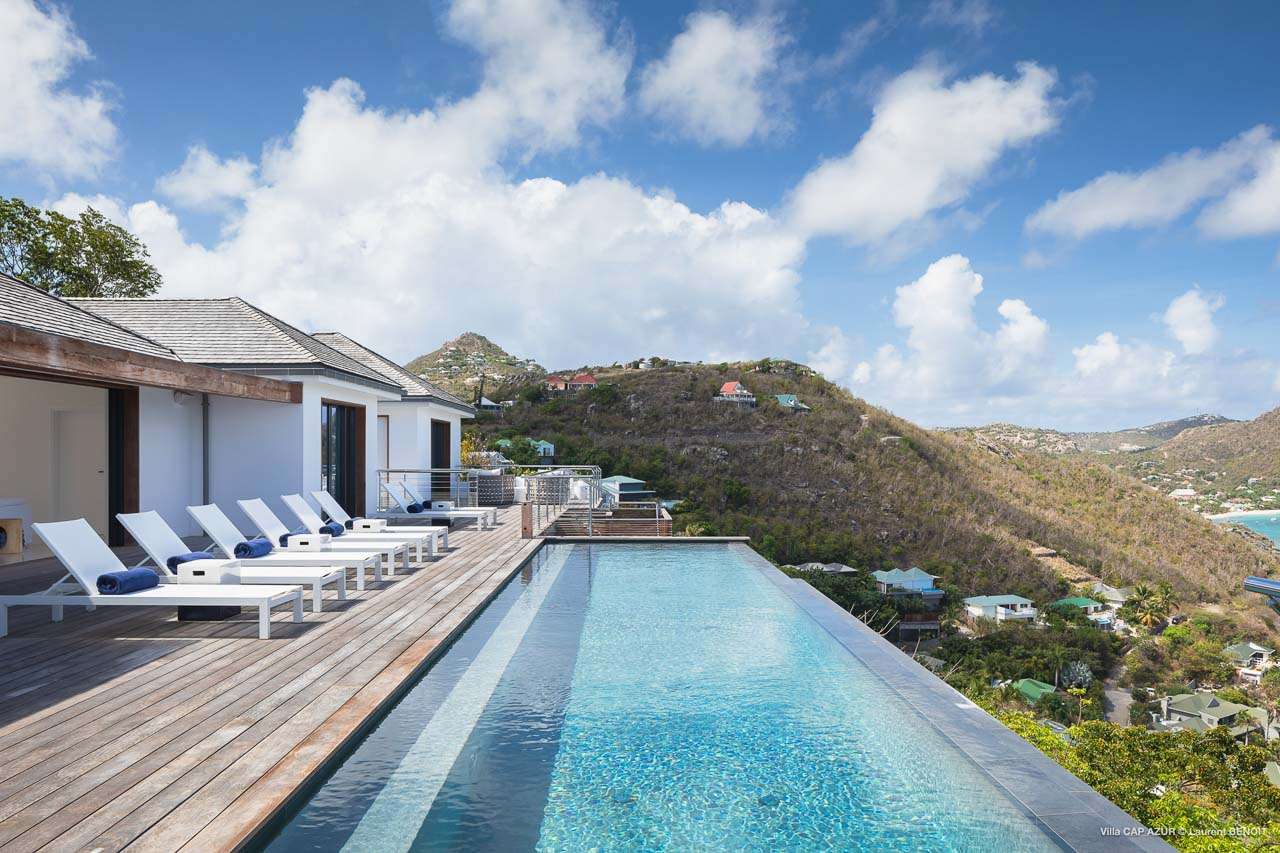 Villa Cap Azur, (villa code: WV CAA), is a newly-built, 5-bedroom villa with panoramic ocean and sunset views, high on the Pointe Milou hillside. Some villas have better views than others, and there are those that will make anyone who steps through the entrance and sees the views beyond, go “Wow!". Cap Azur is that villa. Situated high on the hillside above the Christopher hotel, and with no close neighbors, villa Cap Azur offers that breathtaking moment when you walk onto the terrace and see the panoramic ocean views, with the sun glistening in the heated infinity pool in front. The terraces are well-designed and have plenty of seating, lounging, and outdoor dining space. The terrace also flows seamlessly into the large living room with its oversized sectional that offers views from every seat, and is perfect for a group conversation out of the sun and, when needed, can be fully air-conditioned. The adjacent gourmet kitchen is fully equipped and has a large indoor dining area, which can also be air-conditioned. A separate, air-conditioned TV room completes the common spaces. The first bedroom is situated off the living and has U.S. satellite TV, a U.S. king-sized bed, a closet, and an ensuite bathroom with shower. A master bedroom is in a separate bungalow adjacent to the first, with a second master bedroom directly below, on the lower level. Both rooms have a U.S. king-sized bed, U.S. satellite and AppleTV, ample closet space, a private terrace, and an ensuite bathroom with shower. Another bedroom is also on the lower level, just across from the second master bedroom. This room is a bit smaller than the others but has two twin beds that can be made up as a European king-sized bed, U.S satellite and AppleTV, closets, and an ensuite bathroom with both a bathtub and shower. There is an additional master bedroom situated in a separate bungalow off the TV room. This spacious room comes with a private terrace, a U.S. king-sized bed, his-and-hers closets, U.S. satellite and AppleTV, and an ensuite bathroom with both an indoor and outdoor shower. This room is only available with a 5-bedroom rental. Villa Cap Azur is a great villa for couples vacationing together, but will also suit a family with teenagers. * Note - No Pets AllowedPlease fill out the form to begin your inquiry and we will connect you with a seasoned villa rental specialist.
