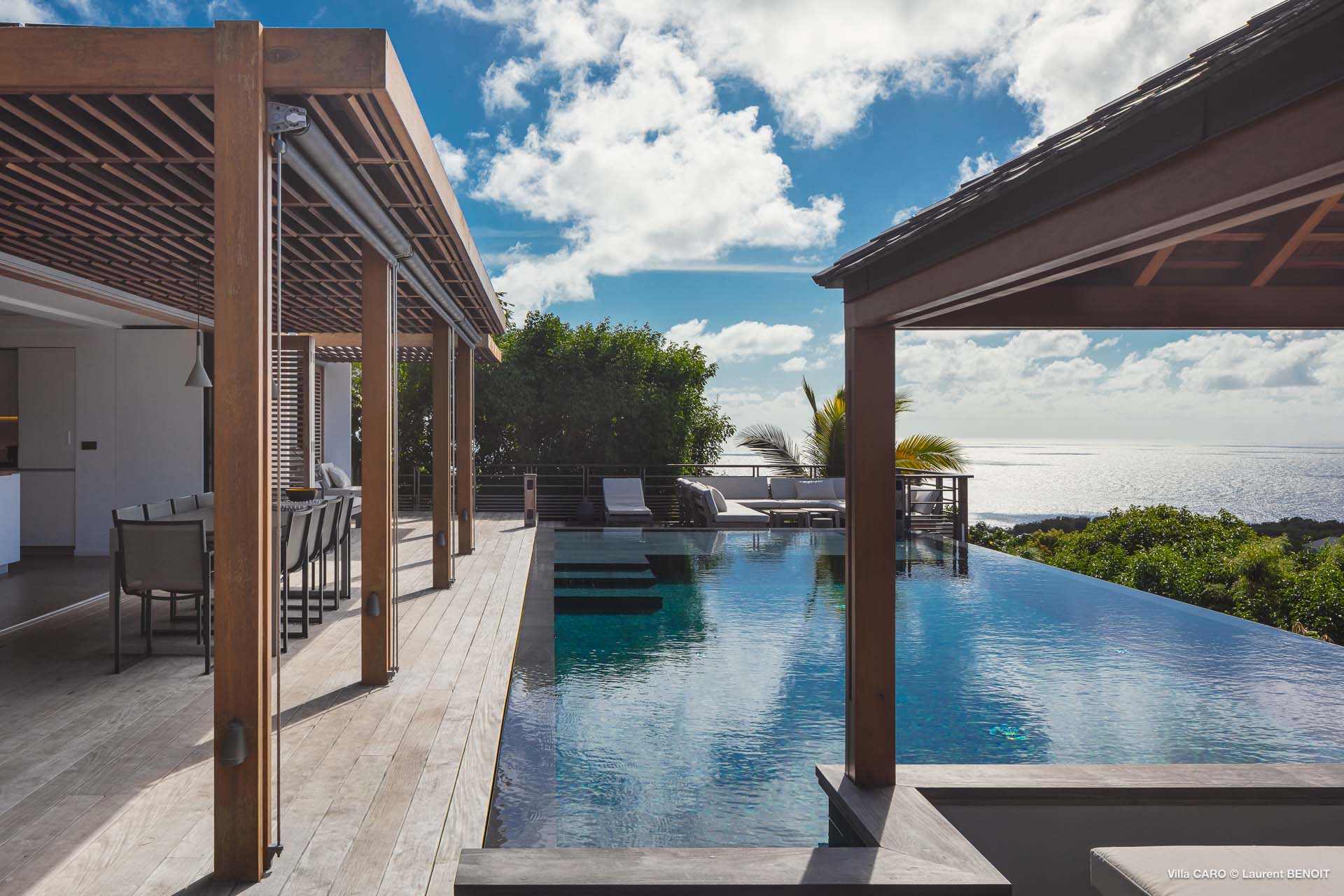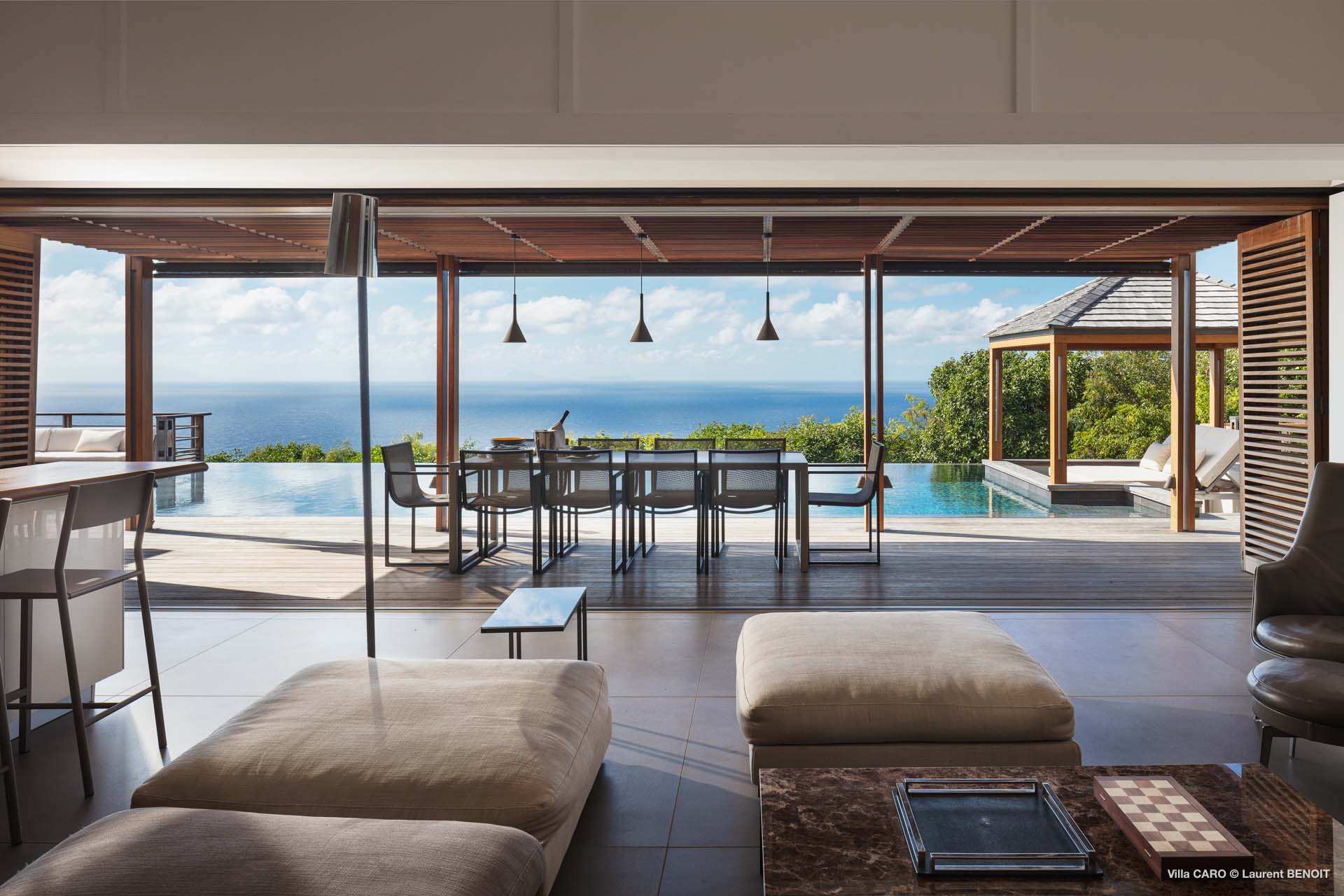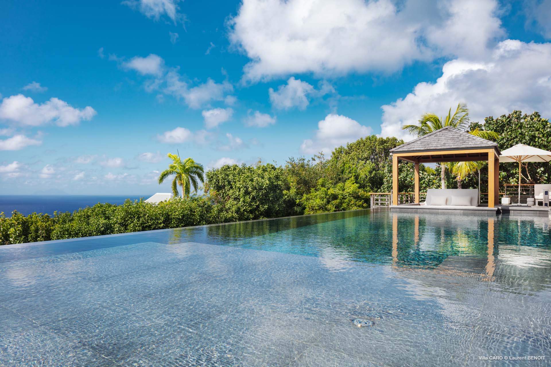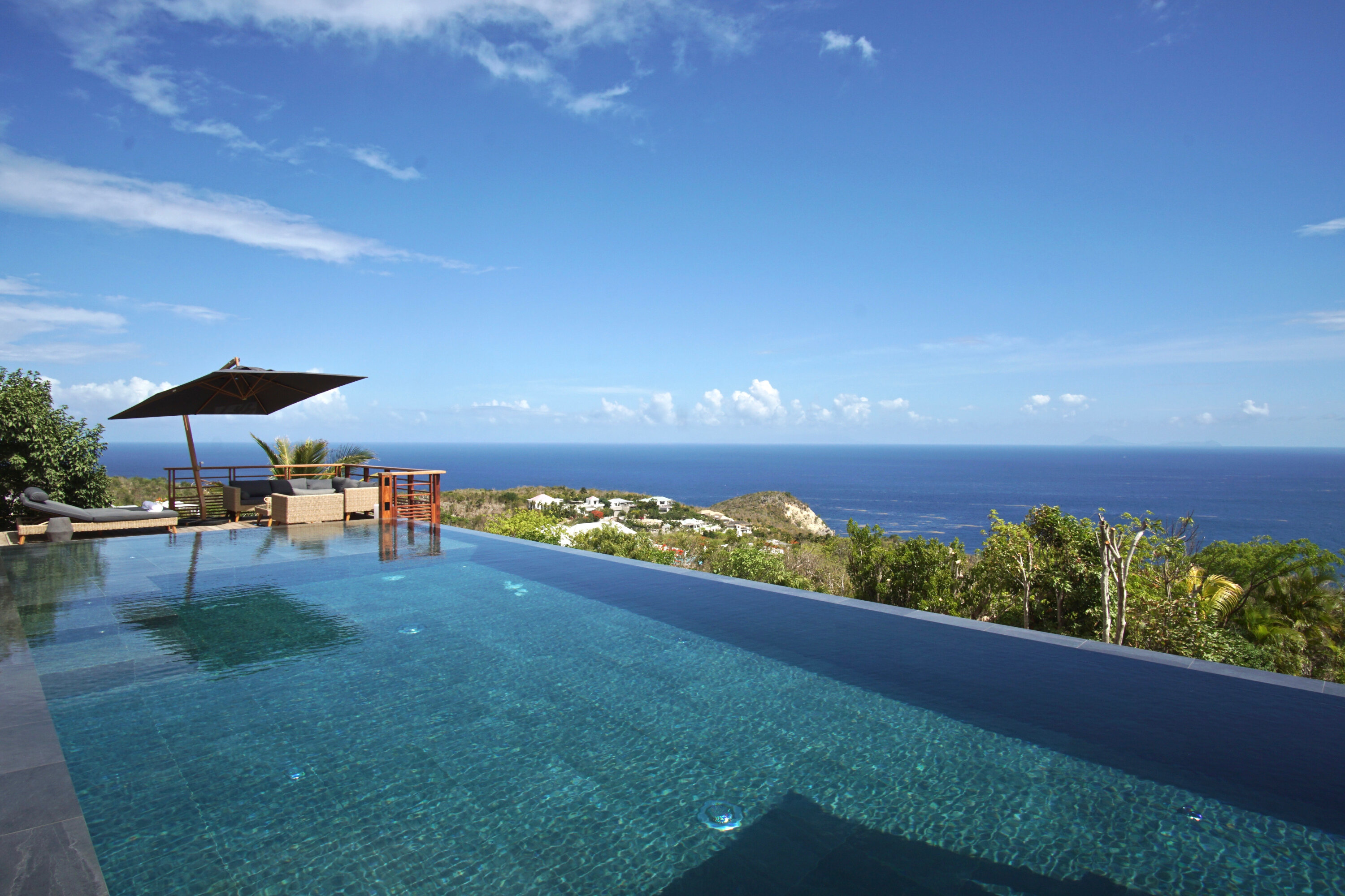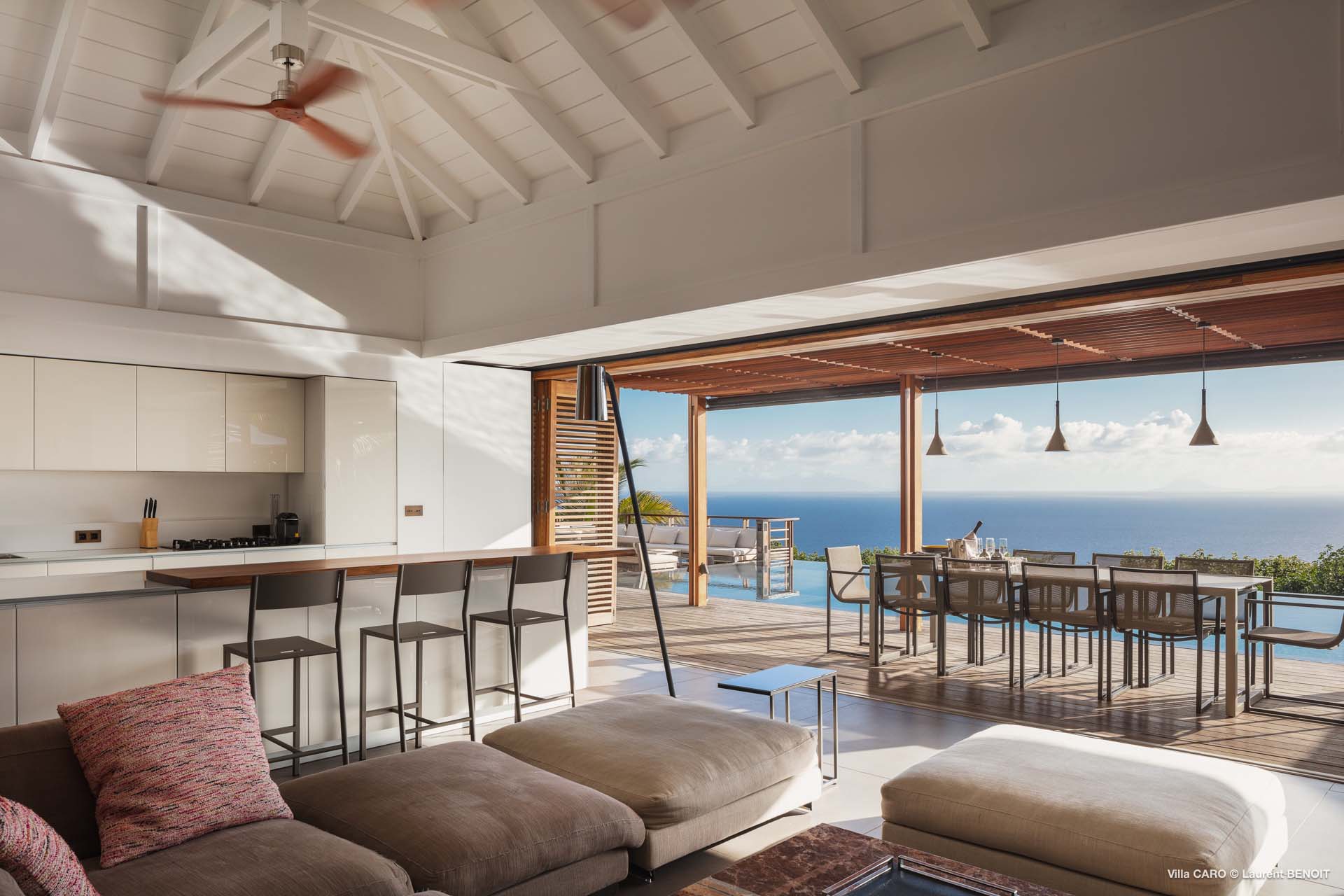 Welcome to Villa Caro (villa code: WV ARO), a newly-built 5-bedroom villa in Gouverneur, St. Barts. This modern Caribbean home enjoys outstanding panoramic views and is the height of sophistication and luxury on the island. An inviting blend of wooden paneling and natural light creates an elegant atmosphere inside Villa Caro, a spacious home that combines indoor and outdoor living spaces with ease. The clean and pared-back design keeps your gaze firmly transfixed on the natural beauty around you while high-end furnishings provide every comfort. Situated at the top of Gouverneur, Villa Caro is a short drive away from restaurants, bakeries, and grocery stores. Gouverneur Beach is 3 minutes down the hill. Gustavia, the capital, is also nearby, making this the ideal vacation villa for a St. Barts getaway. The central living area inside Villa Caro is all about functionality and style. The spacious room combines the living room, office, and kitchen, and can either be fully opened to the terrace and pool or closed off and air-conditioned. It’s all about easy living in the Caribbean, the simple luxuries of life. The living room is an idyllic spot to soak up the views and ocean breeze, relaxing on one of the inviting sofas. A flat-screen TV hangs on the wall, but it’s really the ocean panoramas that will draw your gaze. The beautiful wooden paneling in the back of the room discreetly hides the main entrance and sleek office space. Behind the living room is the kitchen, a warm and inviting spot to cook. Also hidden behind the wooden paneling is an auxiliary kitchen where they’ll work most of their magic. Breezy meals can be enjoyed on the covered terrace, directly in front of the living area and kitchen. With a sunset casting a rosy gold color across the sea and sky, you’ll have many a memorable meal here with family and friends. The bedrooms inside Villa Caro, each offer a simple yet luxurious space to relax, recharge, and unwind. All are similar in size and have ensuite bathrooms. To the left of the main room is the master suite, which also enjoys a full dressing area and a spacious shower with luxurious side jets. A U.S. king-sized bed is plush and comfortable. There are two guest bedrooms to the right side of the main room, each with his-and-her closets, king-sized beds, and ocean views. The final two bedrooms are at the back of the property, facing the idyllic tropical garden. These two rooms each have a pair of twin beds, that can be configured into a king. The outdoor living spaces at Villa Caro make you feel like you’re on top of the world. The views are breathtaking, with the rolling hills of St. Barts melting into the sparkling Caribbean Sea. Kicking back with a drink to take it all in is a great way to enjoy each evening. Speaking of relaxing, there are several fantastic areas to unwind outside. You could enjoy a meal in the sunken gazebo next to the pool, or host a cocktail hour on the couch in the far corner of the terrace. All this space surrounds the large, heated infinity pool, the ideal spot to enjoy the views breezes, and warm Caribbean sun. Villa Caro is an ideal villa for families as well as couples vacationing together and features a long list of amenities. There’s also a fitness room on the lower floor. During the December holidays, the villa rents at the full occupancy rate regardless of how many bedrooms are used.Please fill out the form to begin your inquiry and we will connect you with a seasoned villa rental specialist.