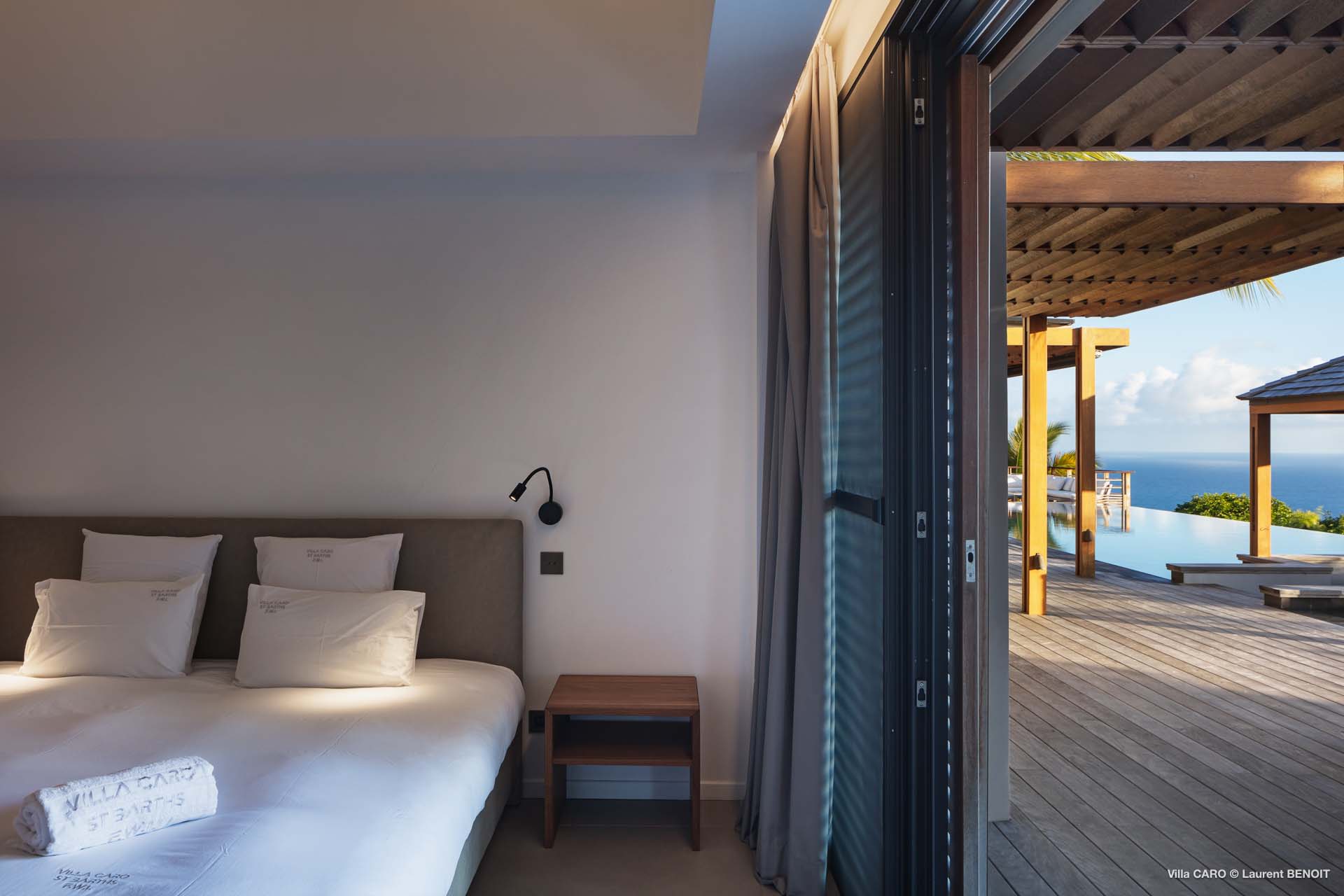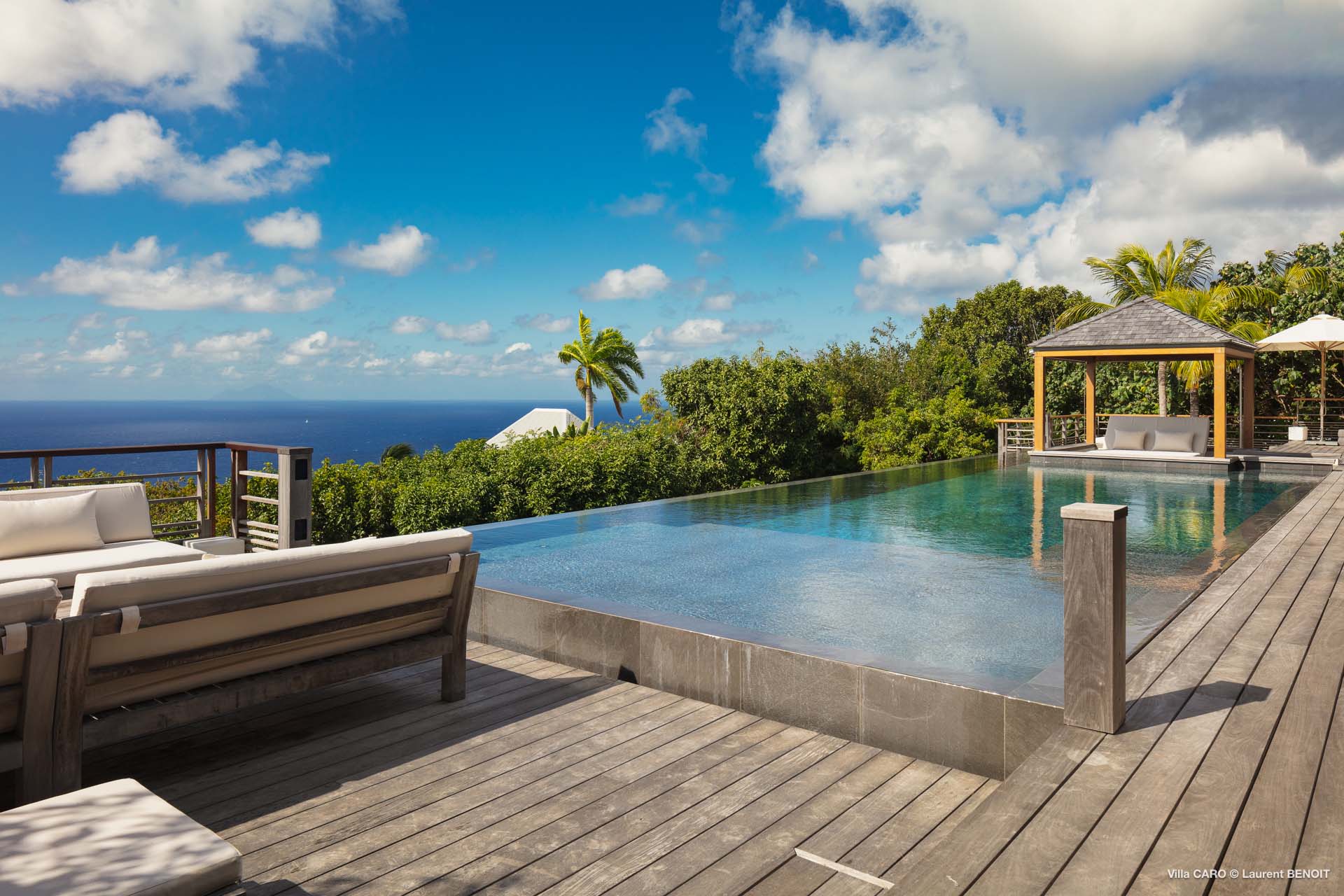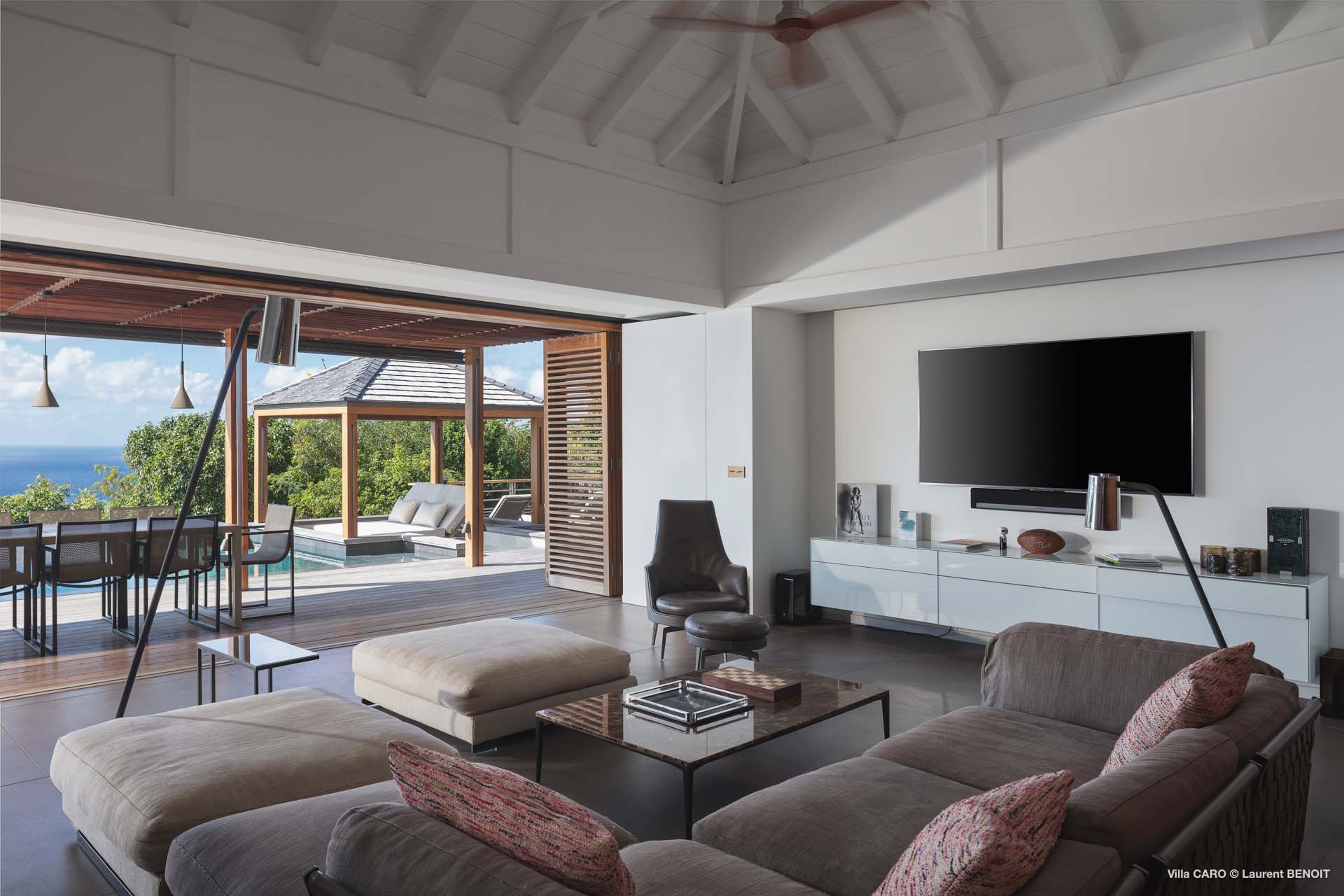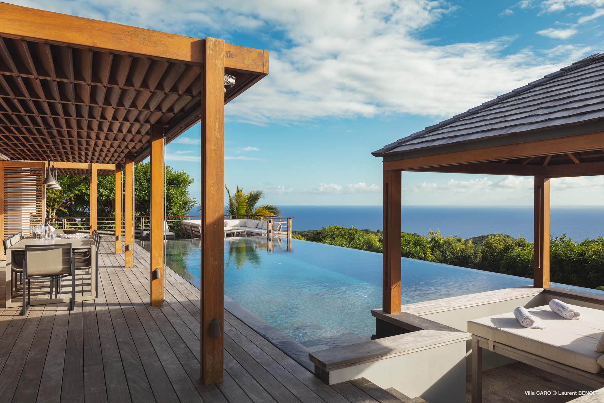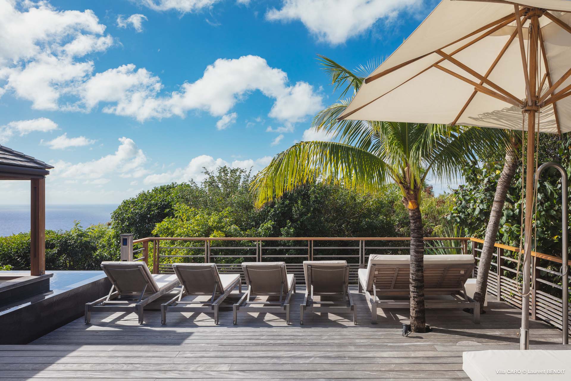 Welcome to Villa Caro (villa code: WV ARO), a newly-built 5-bedroom villa in Gouverneur, St. Barts. This modern Caribbean home enjoys outstanding panoramic views and is the height of sophistication and luxury on the island. An inviting blend of wooden paneling and natural light creates an elegant atmosphere inside Villa Caro, a spacious home that combines indoor and outdoor living spaces with ease. The clean and pared-back design keeps your gaze firmly transfixed on the natural beauty around you while high-end furnishings provide every comfort. Situated at the top of Gouverneur, Villa Caro is a short drive away from restaurants, bakeries, and grocery stores. Gouverneur Beach is 3 minutes down the hill. Gustavia, the capital, is also nearby, making this the ideal vacation villa for a St. Barts getaway. The central living area inside Villa Caro is all about functionality and style. The spacious room combines the living room, office, and kitchen, and can either be fully opened to the terrace and pool or closed off and air-conditioned. It’s all about easy living in the Caribbean, the simple luxuries of life. The living room is an idyllic spot to soak up the views and ocean breeze, relaxing on one of the inviting sofas. A flat-screen TV hangs on the wall, but it’s really the ocean panoramas that will draw your gaze. The beautiful wooden paneling in the back of the room discreetly hides the main entrance and sleek office space. Behind the living room is the kitchen, a warm and inviting spot to cook. Also hidden behind the wooden paneling is an auxiliary kitchen where they’ll work most of their magic. Breezy meals can be enjoyed on the covered terrace, directly in front of the living area and kitchen. With a sunset casting a rosy gold color across the sea and sky, you’ll have many a memorable meal here with family and friends. The bedrooms inside Villa Caro, each offer a simple yet luxurious space to relax, recharge, and unwind. All are similar in size and have ensuite bathrooms. To the left of the main room is the master suite, which also enjoys a full dressing area and a spacious shower with luxurious side jets. A U.S. king-sized bed is plush and comfortable. There are two guest bedrooms to the right side of the main room, each with his-and-her closets, king-sized beds, and ocean views. The final two bedrooms are at the back of the property, facing the idyllic tropical garden. These two rooms each have a pair of twin beds, that can be configured into a king. The outdoor living spaces at Villa Caro make you feel like you’re on top of the world. The views are breathtaking, with the rolling hills of St. Barts melting into the sparkling Caribbean Sea. Kicking back with a drink to take it all in is a great way to enjoy each evening. Speaking of relaxing, there are several fantastic areas to unwind outside. You could enjoy a meal in the sunken gazebo next to the pool, or host a cocktail hour on the couch in the far corner of the terrace. All this space surrounds the large, heated infinity pool, the ideal spot to enjoy the views breezes, and warm Caribbean sun. Villa Caro is an ideal villa for families as well as couples vacationing together and features a long list of amenities. There’s also a fitness room on the lower floor. During the December holidays, the villa rents at the full occupancy rate regardless of how many bedrooms are used.Please fill out the form to begin your inquiry and we will connect you with a seasoned villa rental specialist.