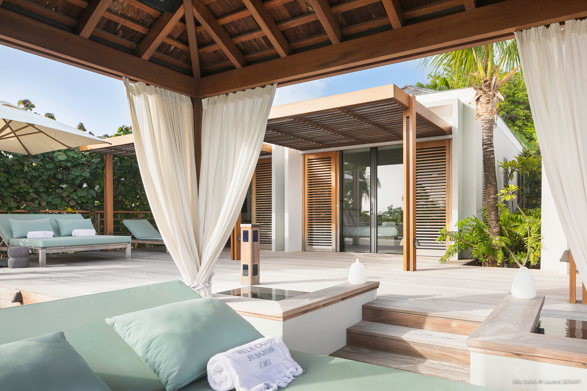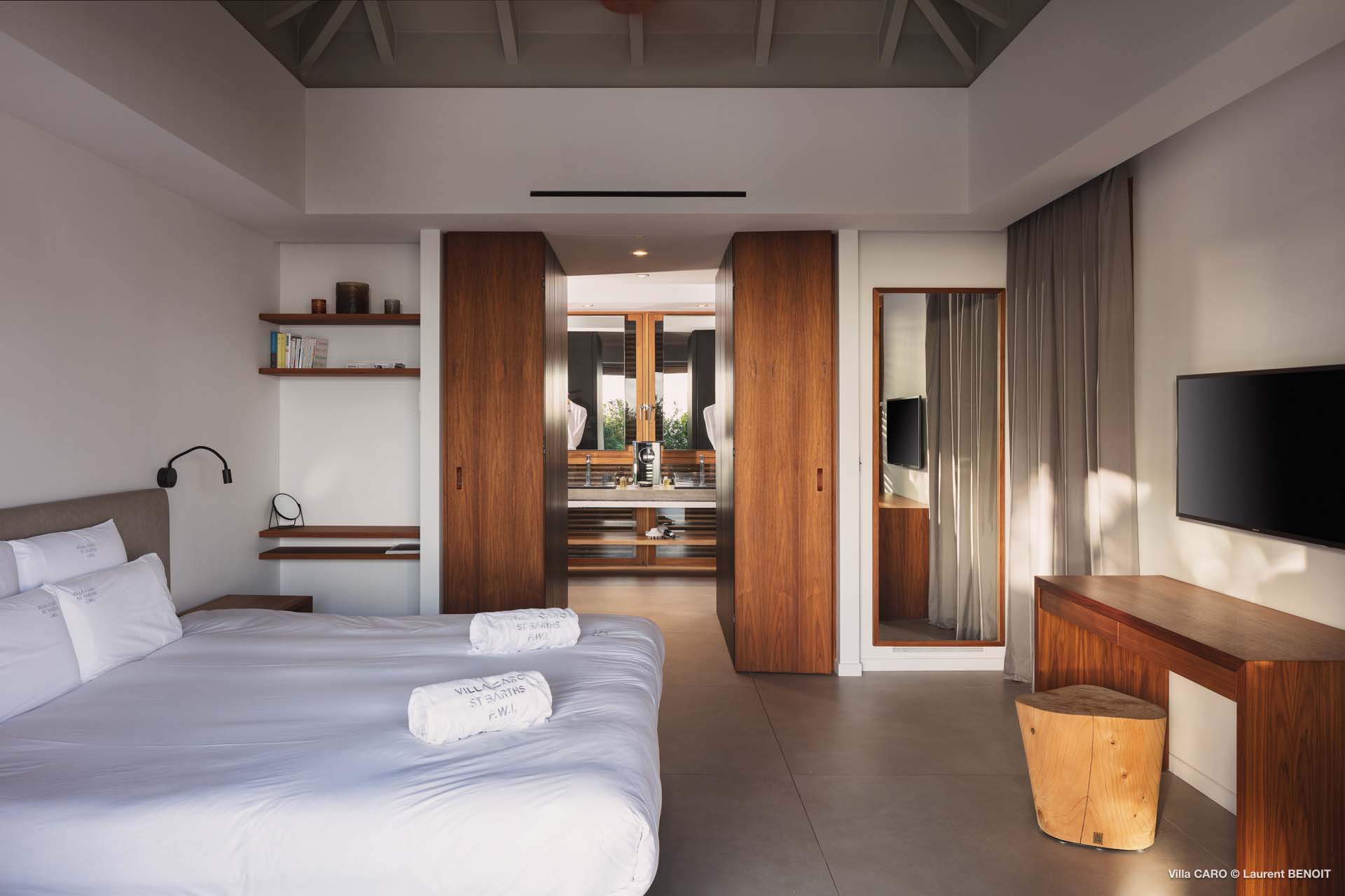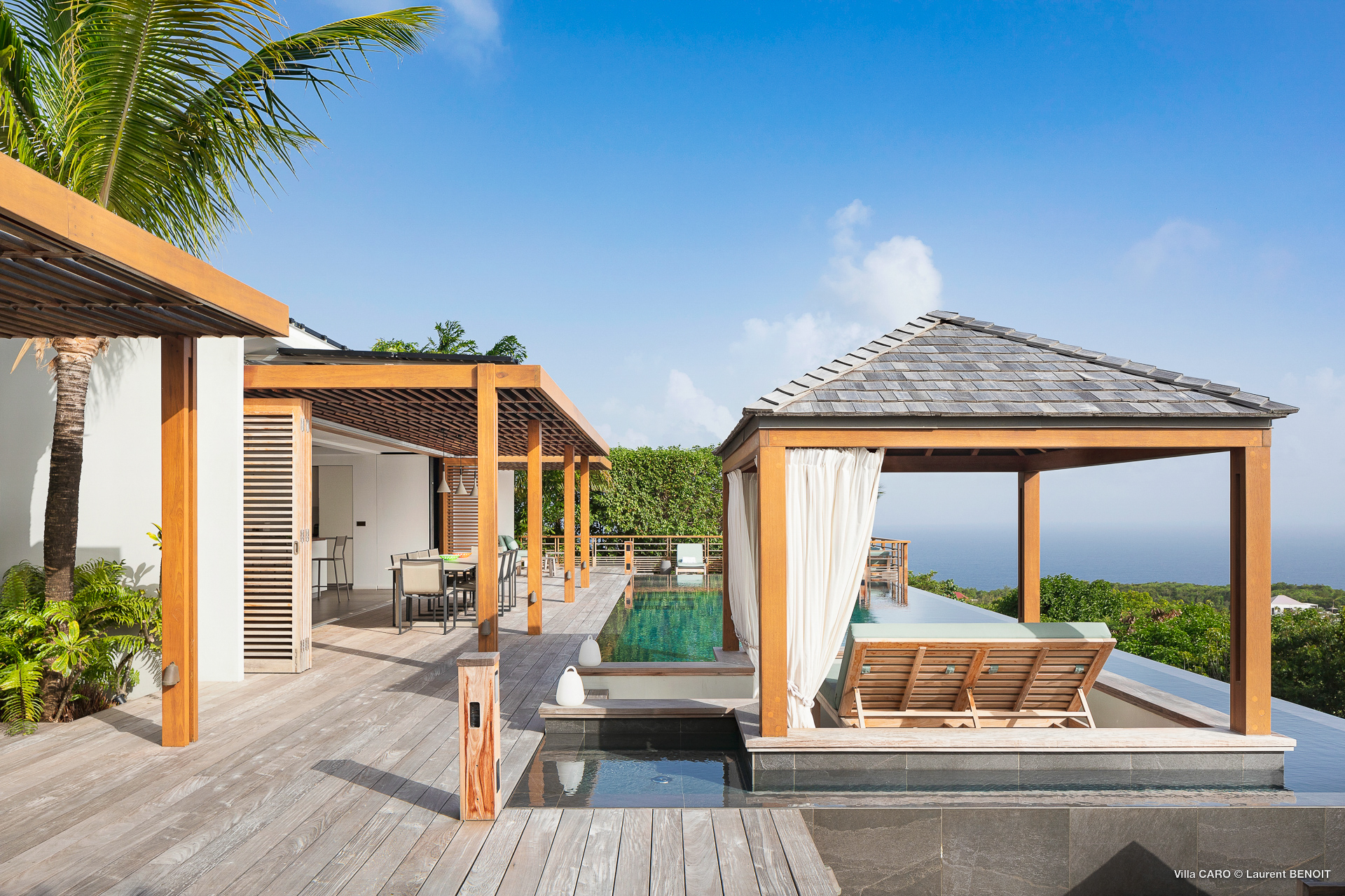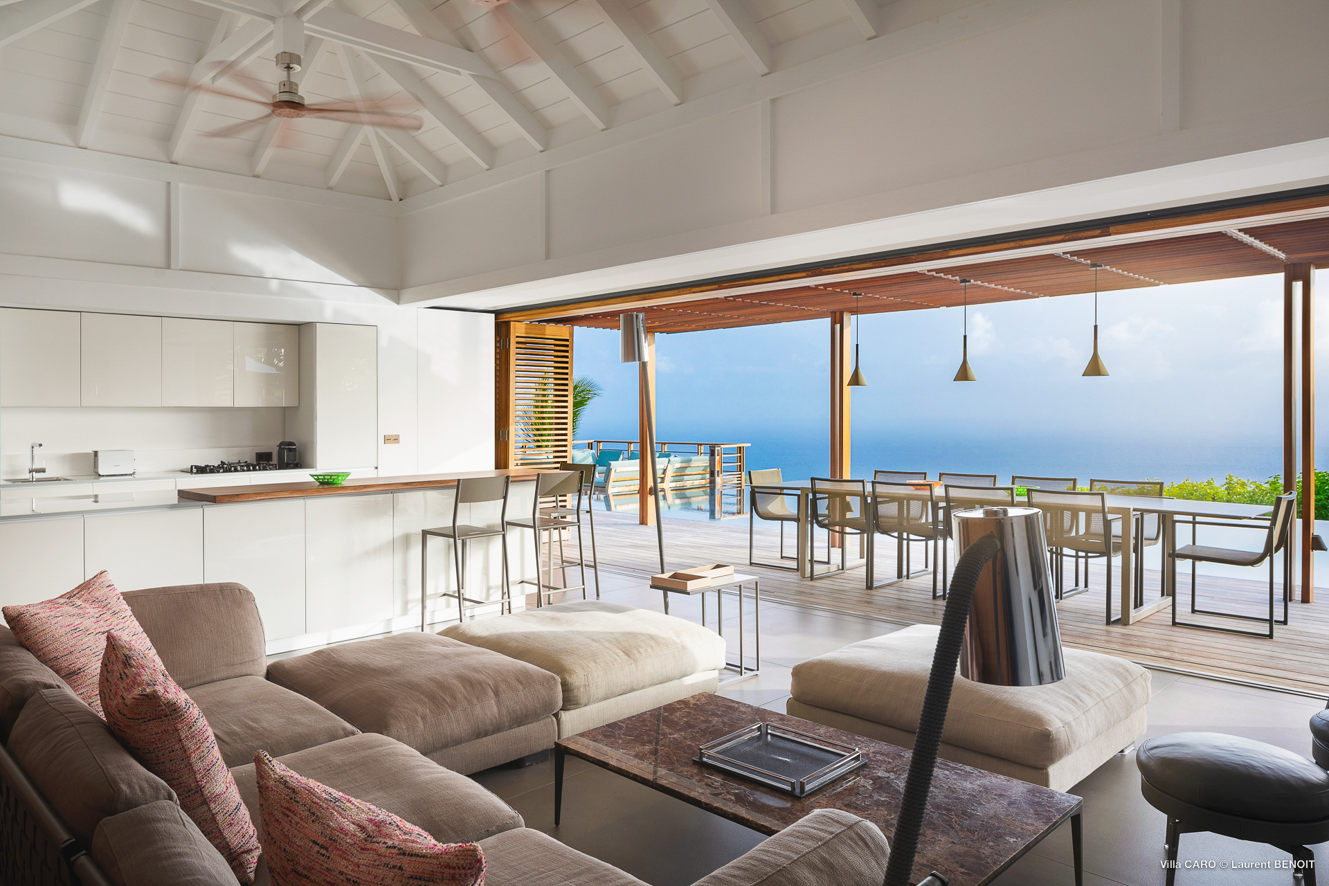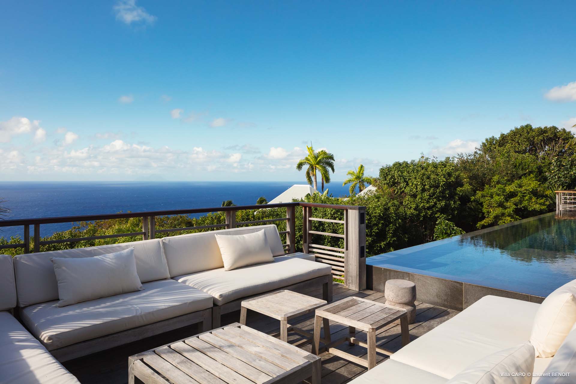 Welcome to Villa Caro (villa code: WV ARO), a newly-built 5-bedroom villa in Gouverneur, St. Barts. This modern Caribbean home enjoys outstanding panoramic views and is the height of sophistication and luxury on the island. An inviting blend of wooden paneling and natural light creates an elegant atmosphere inside Villa Caro, a spacious home that combines indoor and outdoor living spaces with ease. The clean and pared-back design keeps your gaze firmly transfixed on the natural beauty around you while high-end furnishings provide every comfort. Situated at the top of Gouverneur, Villa Caro is a short drive away from restaurants, bakeries, and grocery stores. Gouverneur Beach is 3 minutes down the hill. Gustavia, the capital, is also nearby, making this the ideal vacation villa for a St. Barts getaway. The central living area inside Villa Caro is all about functionality and style. The spacious room combines the living room, office, and kitchen, and can either be fully opened to the terrace and pool or closed off and air-conditioned. It’s all about easy living in the Caribbean, the simple luxuries of life. The living room is an idyllic spot to soak up the views and ocean breeze, relaxing on one of the inviting sofas. A flat-screen TV hangs on the wall, but it’s really the ocean panoramas that will draw your gaze. The beautiful wooden paneling in the back of the room discreetly hides the main entrance and sleek office space. Behind the living room is the kitchen, a warm and inviting spot to cook. Also hidden behind the wooden paneling is an auxiliary kitchen where they’ll work most of their magic. Breezy meals can be enjoyed on the covered terrace, directly in front of the living area and kitchen. With a sunset casting a rosy gold color across the sea and sky, you’ll have many a memorable meal here with family and friends. The bedrooms inside Villa Caro, each offer a simple yet luxurious space to relax, recharge, and unwind. All are similar in size and have ensuite bathrooms. To the left of the main room is the master suite, which also enjoys a full dressing area and a spacious shower with luxurious side jets. A U.S. king-sized bed is plush and comfortable. There are two guest bedrooms to the right side of the main room, each with his-and-her closets, king-sized beds, and ocean views. The final two bedrooms are at the back of the property, facing the idyllic tropical garden. These two rooms each have a pair of twin beds, that can be configured into a king. The outdoor living spaces at Villa Caro make you feel like you’re on top of the world. The views are breathtaking, with the rolling hills of St. Barts melting into the sparkling Caribbean Sea. Kicking back with a drink to take it all in is a great way to enjoy each evening. Speaking of relaxing, there are several fantastic areas to unwind outside. You could enjoy a meal in the sunken gazebo next to the pool, or host a cocktail hour on the couch in the far corner of the terrace. All this space surrounds the large, heated infinity pool, the ideal spot to enjoy the views breezes, and warm Caribbean sun. Villa Caro is an ideal villa for families as well as couples vacationing together and features a long list of amenities. There’s also a fitness room on the lower floor. During the December holidays, the villa rents at the full occupancy rate regardless of how many bedrooms are used.Please fill out the form to begin your inquiry and we will connect you with a seasoned villa rental specialist.