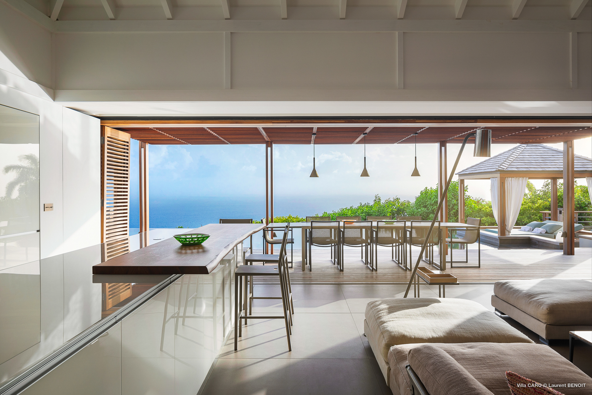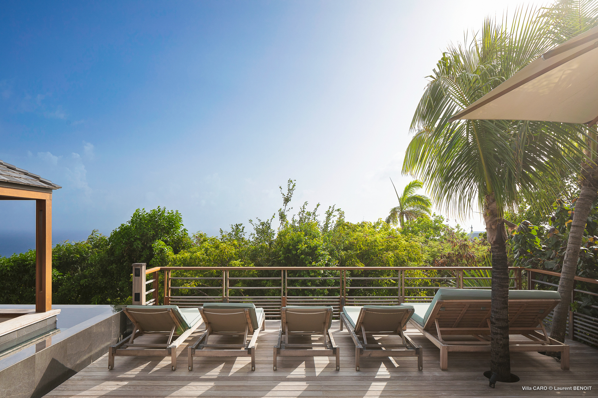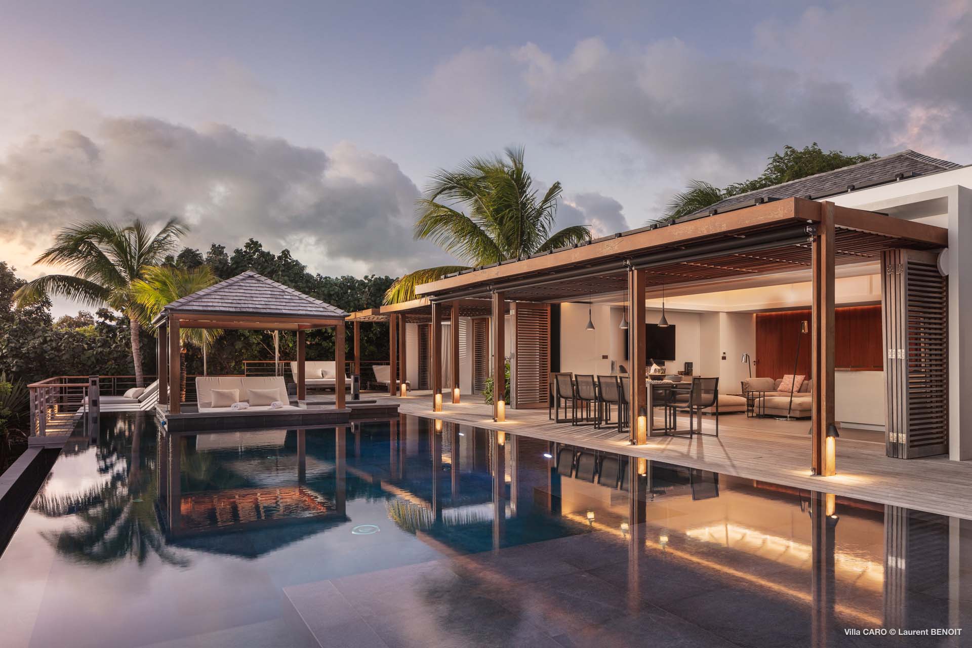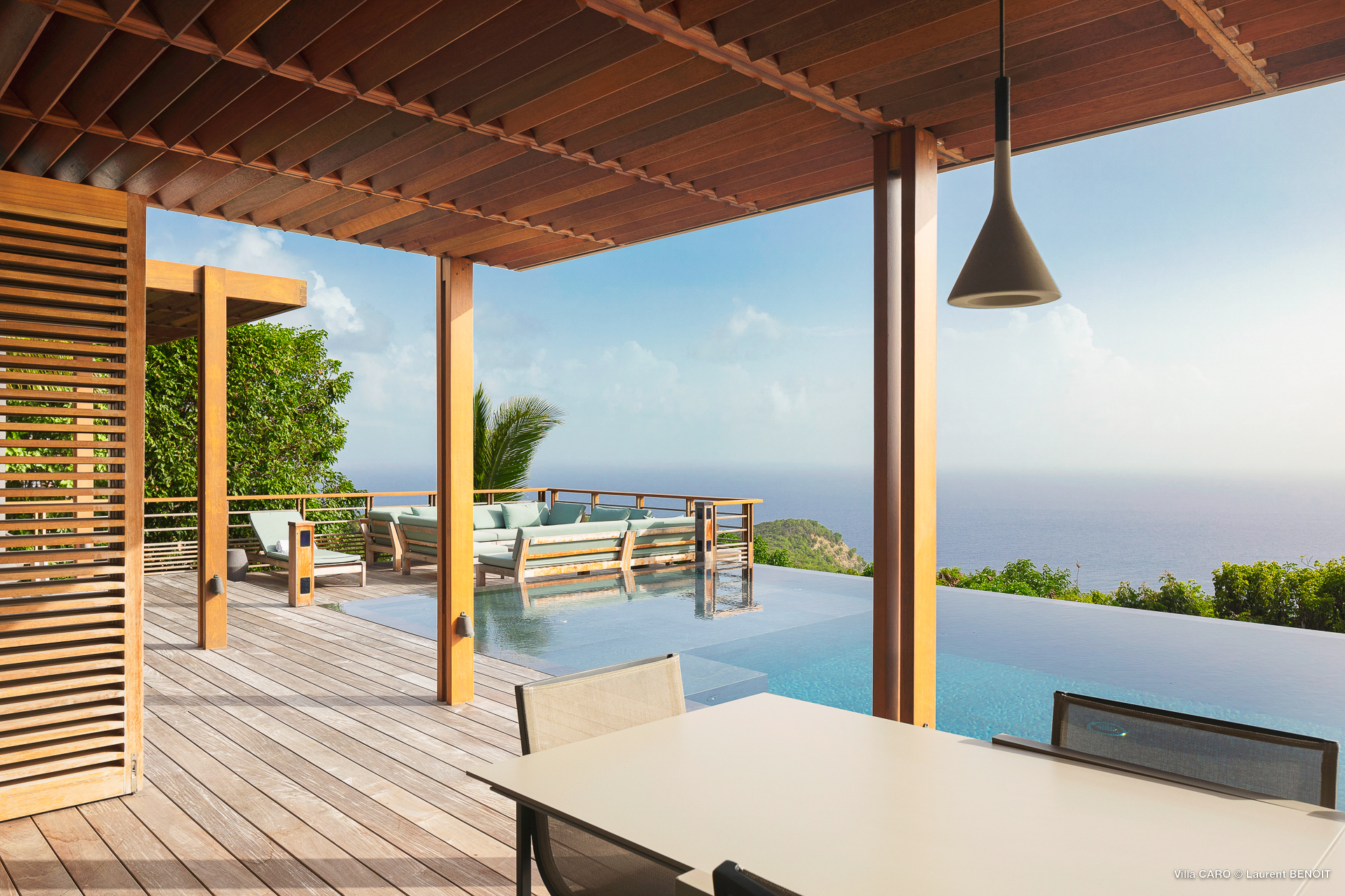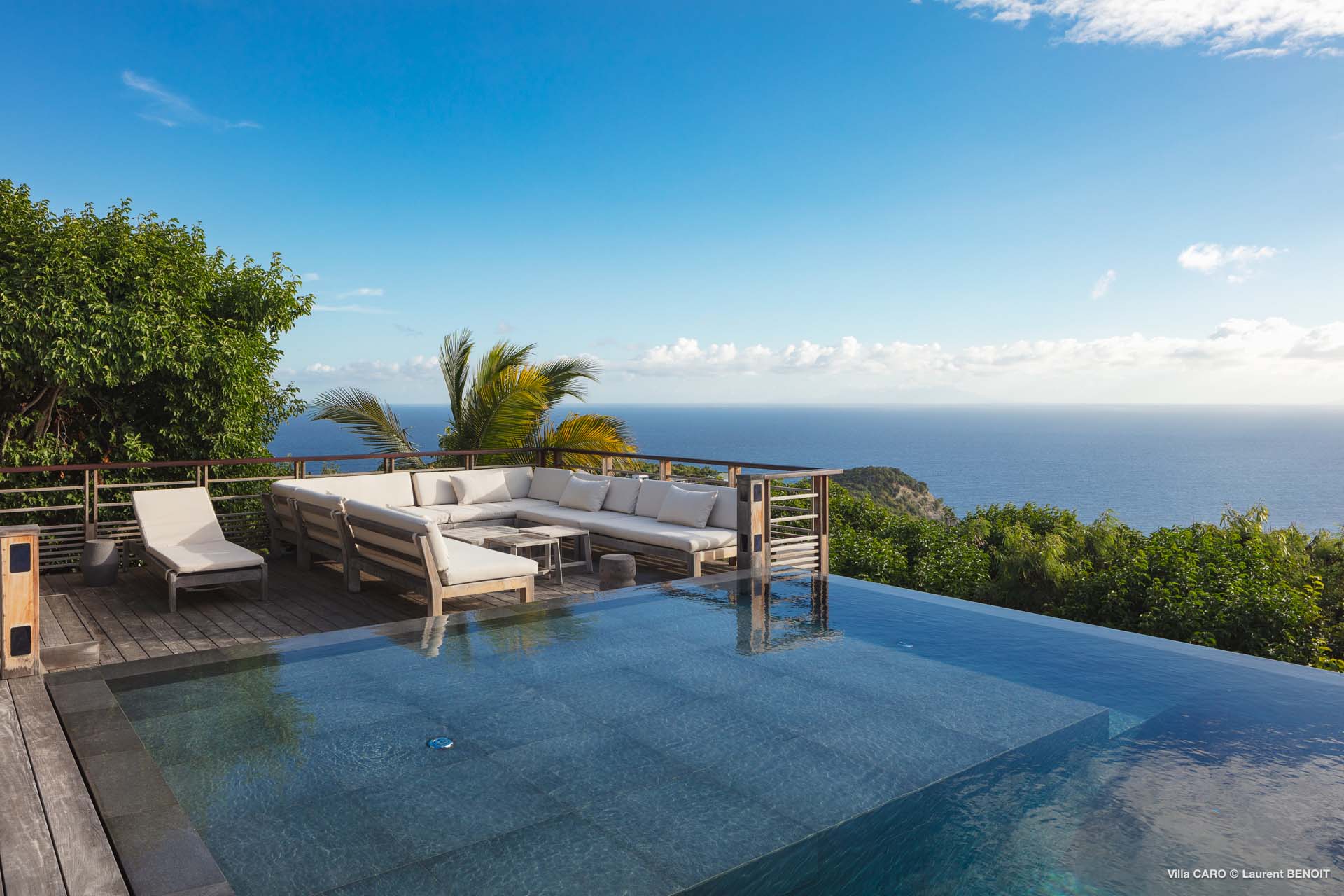 Welcome to Villa Caro (villa code: WV ARO), a newly-built 5-bedroom villa in Gouverneur, St. Barts. This modern Caribbean home enjoys outstanding panoramic views and is the height of sophistication and luxury on the island. An inviting blend of wooden paneling and natural light creates an elegant atmosphere inside Villa Caro, a spacious home that combines indoor and outdoor living spaces with ease. The clean and pared-back design keeps your gaze firmly transfixed on the natural beauty around you while high-end furnishings provide every comfort. Situated at the top of Gouverneur, Villa Caro is a short drive away from restaurants, bakeries, and grocery stores. Gouverneur Beach is 3 minutes down the hill. Gustavia, the capital, is also nearby, making this the ideal vacation villa for a St. Barts getaway. The central living area inside Villa Caro is all about functionality and style. The spacious room combines the living room, office, and kitchen, and can either be fully opened to the terrace and pool or closed off and air-conditioned. It’s all about easy living in the Caribbean, the simple luxuries of life. The living room is an idyllic spot to soak up the views and ocean breeze, relaxing on one of the inviting sofas. A flat-screen TV hangs on the wall, but it’s really the ocean panoramas that will draw your gaze. The beautiful wooden paneling in the back of the room discreetly hides the main entrance and sleek office space. Behind the living room is the kitchen, a warm and inviting spot to cook. Also hidden behind the wooden paneling is an auxiliary kitchen where they’ll work most of their magic. Breezy meals can be enjoyed on the covered terrace, directly in front of the living area and kitchen. With a sunset casting a rosy gold color across the sea and sky, you’ll have many a memorable meal here with family and friends. The bedrooms inside Villa Caro, each offer a simple yet luxurious space to relax, recharge, and unwind. All are similar in size and have ensuite bathrooms. To the left of the main room is the master suite, which also enjoys a full dressing area and a spacious shower with luxurious side jets. A U.S. king-sized bed is plush and comfortable. There are two guest bedrooms to the right side of the main room, each with his-and-her closets, king-sized beds, and ocean views. The final two bedrooms are at the back of the property, facing the idyllic tropical garden. These two rooms each have a pair of twin beds, that can be configured into a king. The outdoor living spaces at Villa Caro make you feel like you’re on top of the world. The views are breathtaking, with the rolling hills of St. Barts melting into the sparkling Caribbean Sea. Kicking back with a drink to take it all in is a great way to enjoy each evening. Speaking of relaxing, there are several fantastic areas to unwind outside. You could enjoy a meal in the sunken gazebo next to the pool, or host a cocktail hour on the couch in the far corner of the terrace. All this space surrounds the large, heated infinity pool, the ideal spot to enjoy the views breezes, and warm Caribbean sun. Villa Caro is an ideal villa for families as well as couples vacationing together and features a long list of amenities. There’s also a fitness room on the lower floor. During the December holidays, the villa rents at the full occupancy rate regardless of how many bedrooms are used.Please fill out the form to begin your inquiry and we will connect you with a seasoned villa rental specialist.