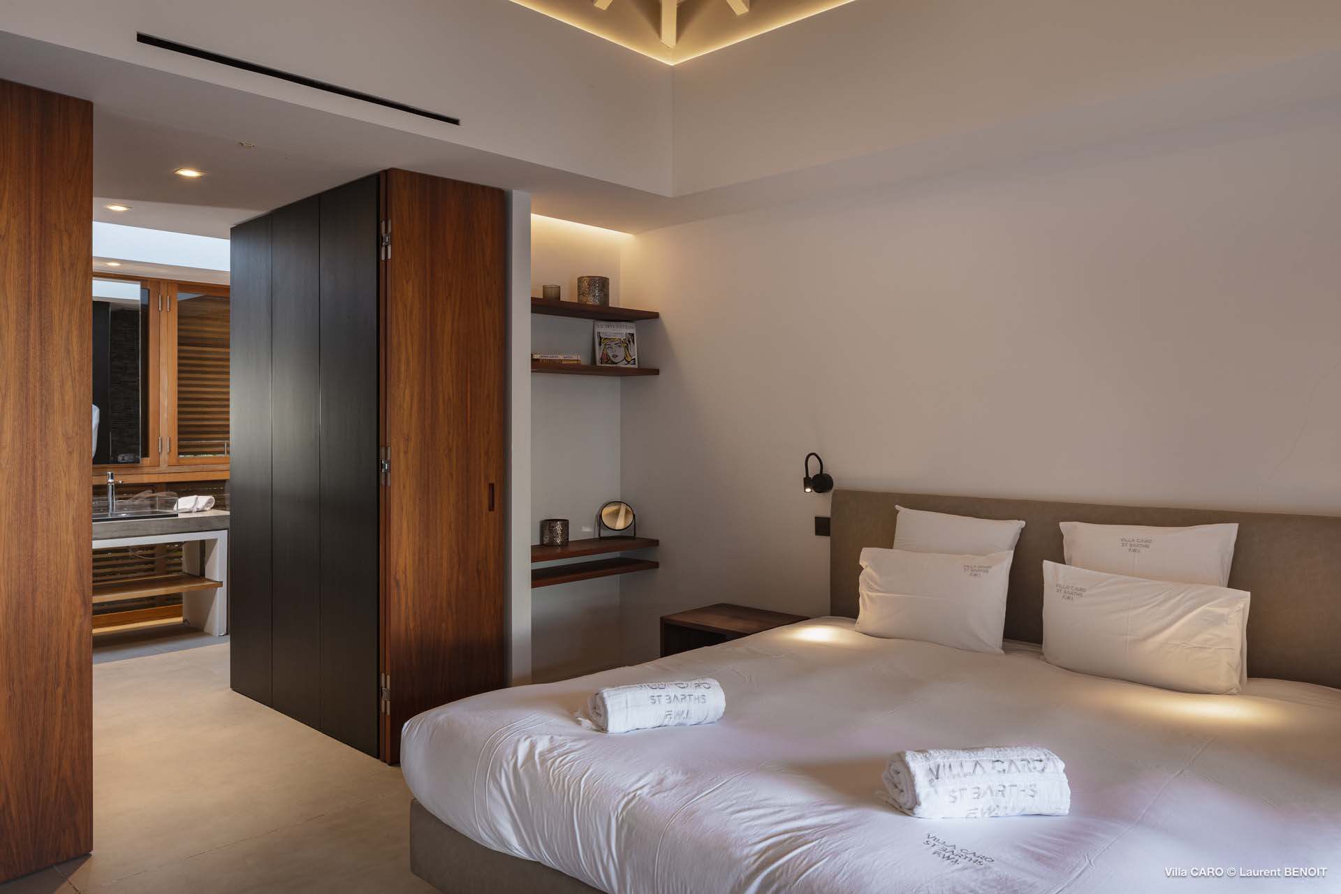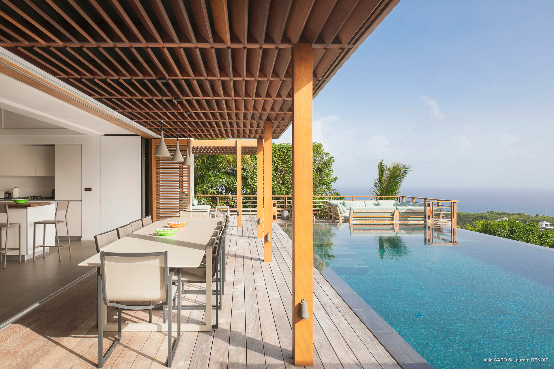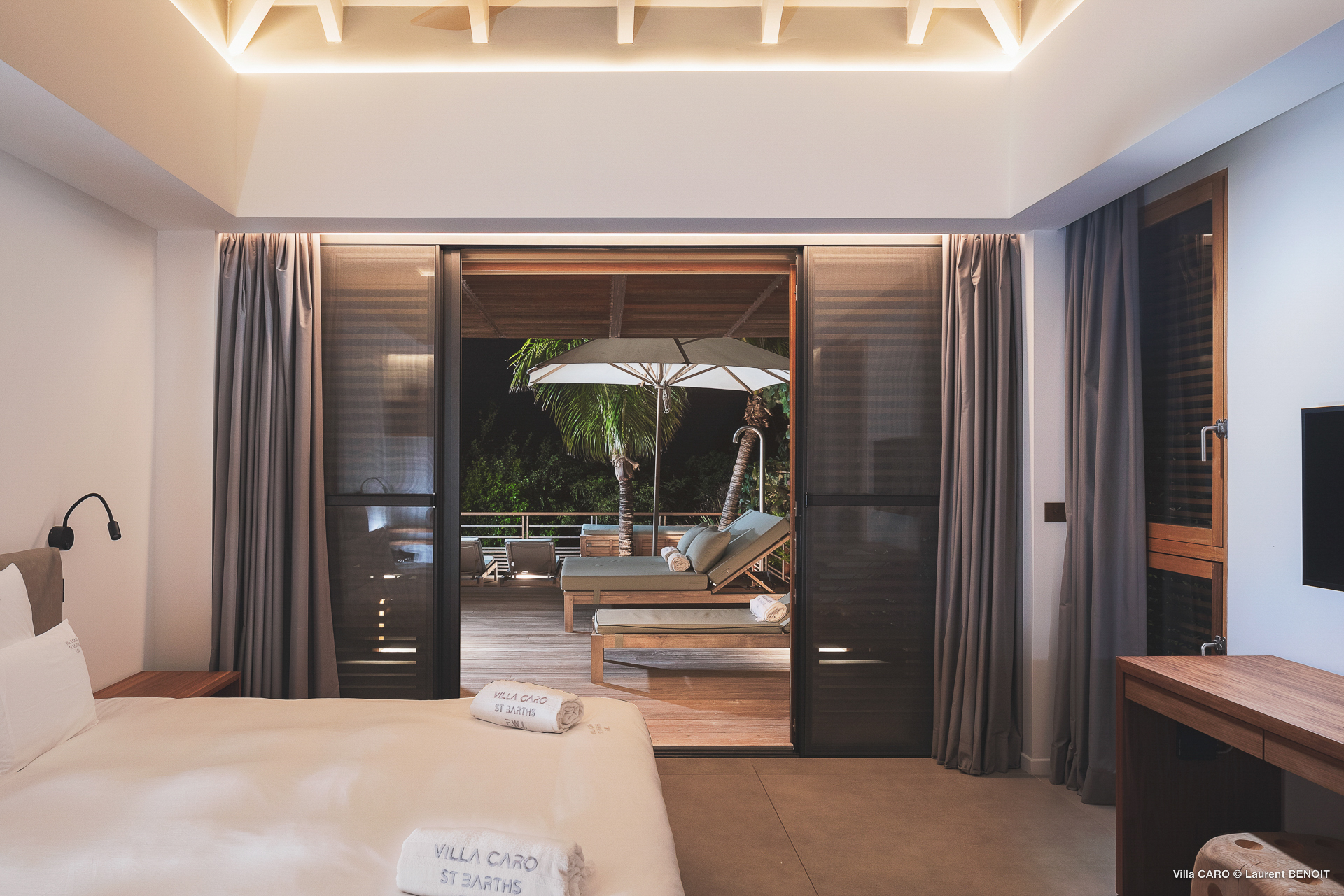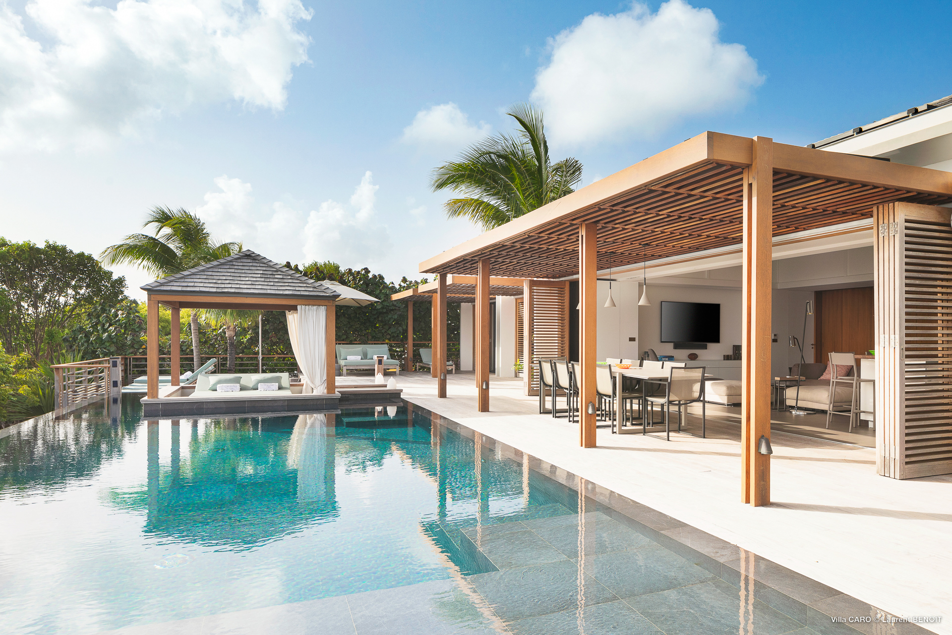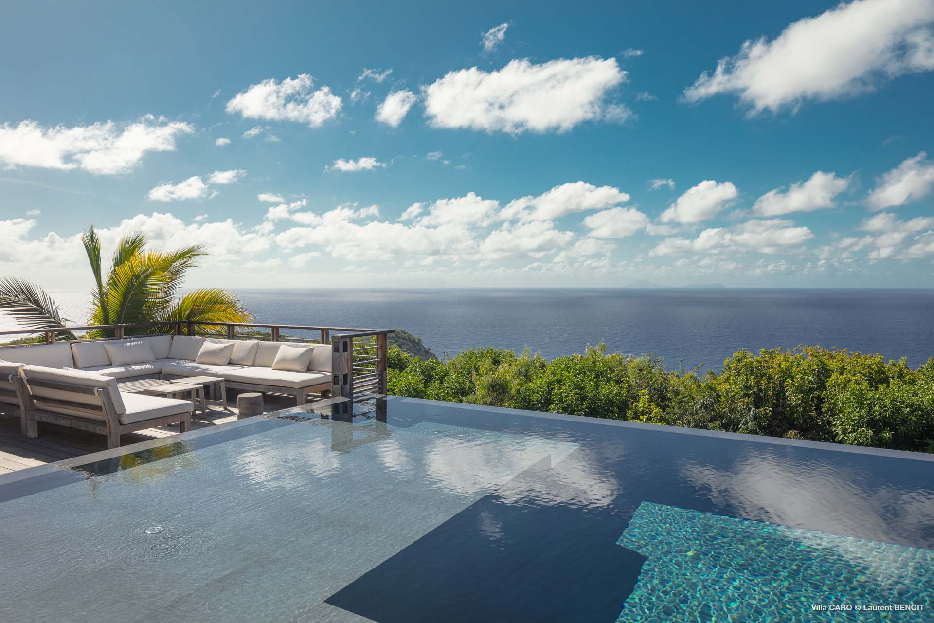 Welcome to Villa Caro (villa code: WV ARO), a newly-built 5-bedroom villa in Gouverneur, St. Barts. This modern Caribbean home enjoys outstanding panoramic views and is the height of sophistication and luxury on the island. An inviting blend of wooden paneling and natural light creates an elegant atmosphere inside Villa Caro, a spacious home that combines indoor and outdoor living spaces with ease. The clean and pared-back design keeps your gaze firmly transfixed on the natural beauty around you while high-end furnishings provide every comfort. Situated at the top of Gouverneur, Villa Caro is a short drive away from restaurants, bakeries, and grocery stores. Gouverneur Beach is 3 minutes down the hill. Gustavia, the capital, is also nearby, making this the ideal vacation villa for a St. Barts getaway. The central living area inside Villa Caro is all about functionality and style. The spacious room combines the living room, office, and kitchen, and can either be fully opened to the terrace and pool or closed off and air-conditioned. It’s all about easy living in the Caribbean, the simple luxuries of life. The living room is an idyllic spot to soak up the views and ocean breeze, relaxing on one of the inviting sofas. A flat-screen TV hangs on the wall, but it’s really the ocean panoramas that will draw your gaze. The beautiful wooden paneling in the back of the room discreetly hides the main entrance and sleek office space. Behind the living room is the kitchen, a warm and inviting spot to cook. Also hidden behind the wooden paneling is an auxiliary kitchen where they’ll work most of their magic. Breezy meals can be enjoyed on the covered terrace, directly in front of the living area and kitchen. With a sunset casting a rosy gold color across the sea and sky, you’ll have many a memorable meal here with family and friends. The bedrooms inside Villa Caro, each offer a simple yet luxurious space to relax, recharge, and unwind. All are similar in size and have ensuite bathrooms. To the left of the main room is the master suite, which also enjoys a full dressing area and a spacious shower with luxurious side jets. A U.S. king-sized bed is plush and comfortable. There are two guest bedrooms to the right side of the main room, each with his-and-her closets, king-sized beds, and ocean views. The final two bedrooms are at the back of the property, facing the idyllic tropical garden. These two rooms each have a pair of twin beds, that can be configured into a king. The outdoor living spaces at Villa Caro make you feel like you’re on top of the world. The views are breathtaking, with the rolling hills of St. Barts melting into the sparkling Caribbean Sea. Kicking back with a drink to take it all in is a great way to enjoy each evening. Speaking of relaxing, there are several fantastic areas to unwind outside. You could enjoy a meal in the sunken gazebo next to the pool, or host a cocktail hour on the couch in the far corner of the terrace. All this space surrounds the large, heated infinity pool, the ideal spot to enjoy the views breezes, and warm Caribbean sun. Villa Caro is an ideal villa for families as well as couples vacationing together and features a long list of amenities. There’s also a fitness room on the lower floor. During the December holidays, the villa rents at the full occupancy rate regardless of how many bedrooms are used.Please fill out the form to begin your inquiry and we will connect you with a seasoned villa rental specialist.