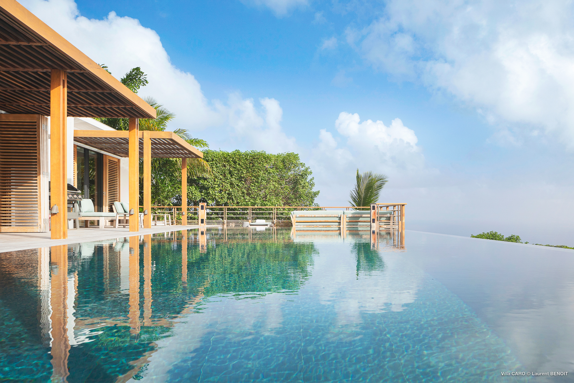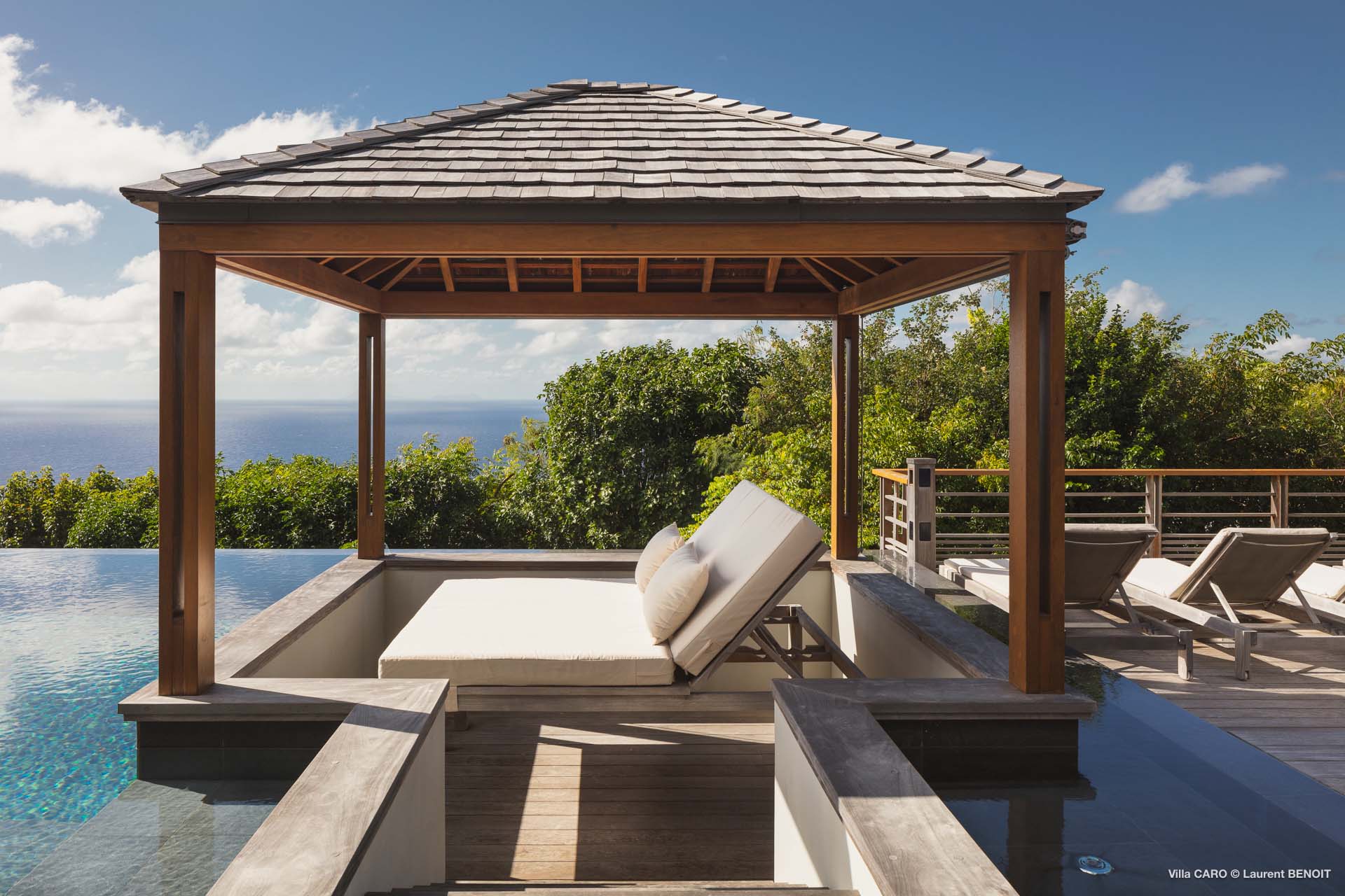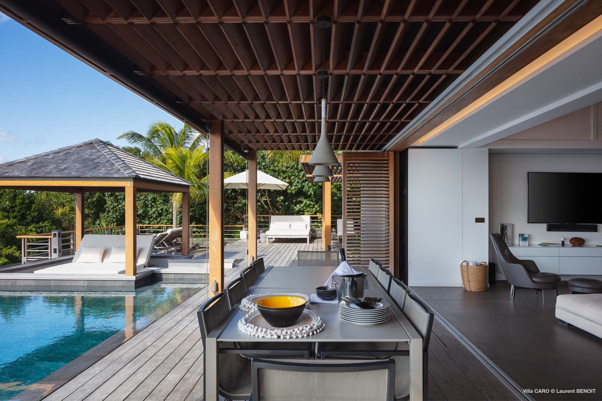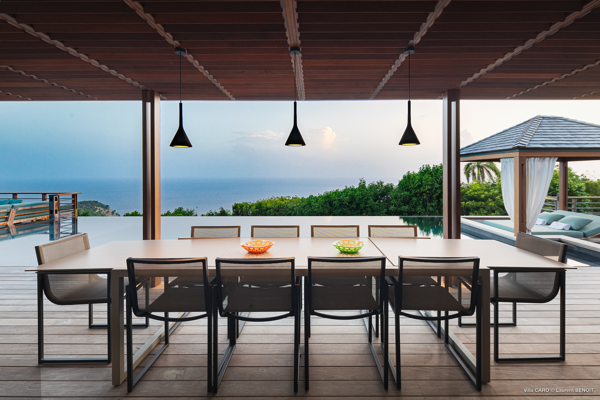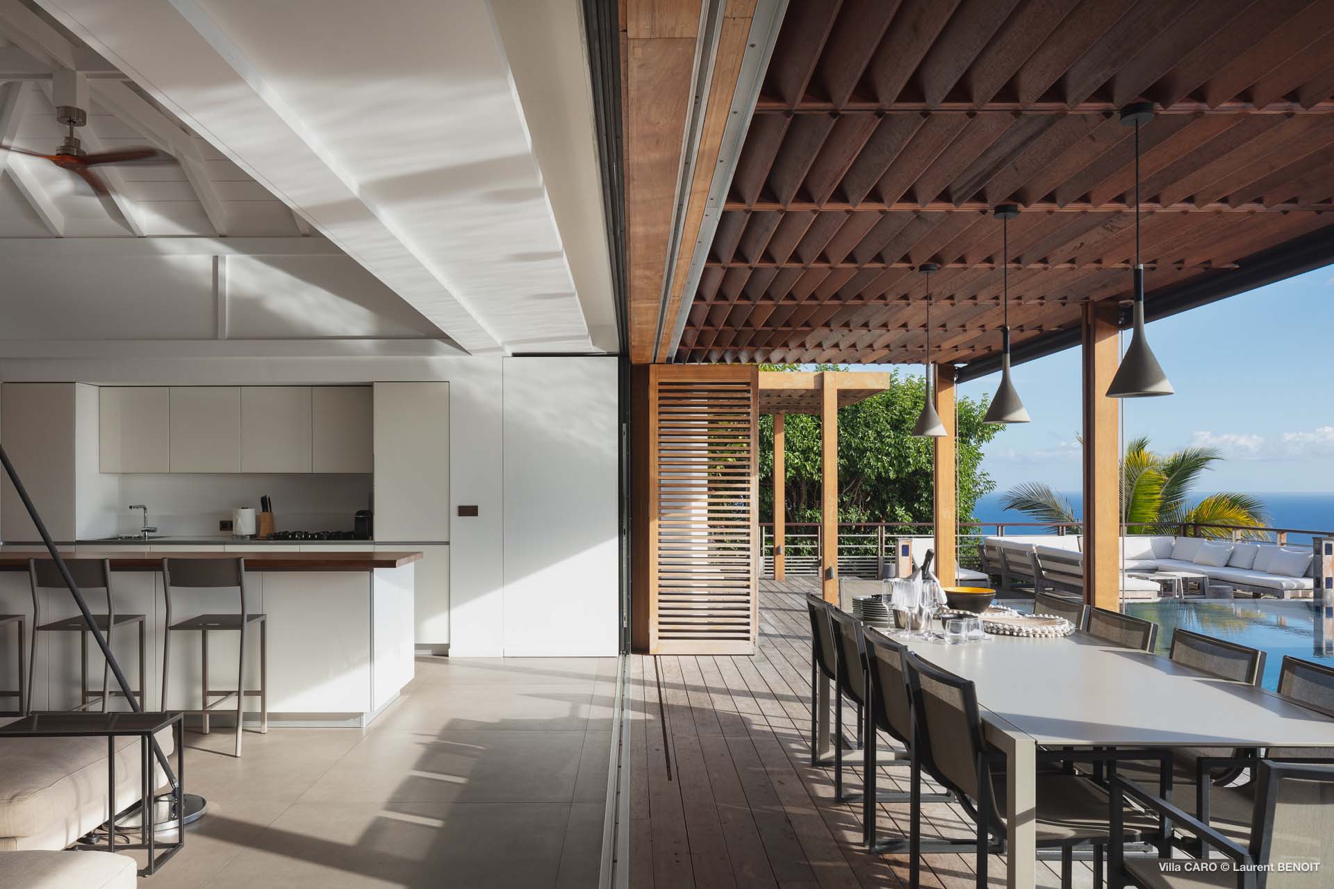 Welcome to Villa Caro (villa code: WV ARO), a newly-built 5-bedroom villa in Gouverneur, St. Barts. This modern Caribbean home enjoys outstanding panoramic views and is the height of sophistication and luxury on the island. An inviting blend of wooden paneling and natural light creates an elegant atmosphere inside Villa Caro, a spacious home that combines indoor and outdoor living spaces with ease. The clean and pared-back design keeps your gaze firmly transfixed on the natural beauty around you while high-end furnishings provide every comfort. Situated at the top of Gouverneur, Villa Caro is a short drive away from restaurants, bakeries, and grocery stores. Gouverneur Beach is 3 minutes down the hill. Gustavia, the capital, is also nearby, making this the ideal vacation villa for a St. Barts getaway. The central living area inside Villa Caro is all about functionality and style. The spacious room combines the living room, office, and kitchen, and can either be fully opened to the terrace and pool or closed off and air-conditioned. It’s all about easy living in the Caribbean, the simple luxuries of life. The living room is an idyllic spot to soak up the views and ocean breeze, relaxing on one of the inviting sofas. A flat-screen TV hangs on the wall, but it’s really the ocean panoramas that will draw your gaze. The beautiful wooden paneling in the back of the room discreetly hides the main entrance and sleek office space. Behind the living room is the kitchen, a warm and inviting spot to cook. Also hidden behind the wooden paneling is an auxiliary kitchen where they’ll work most of their magic. Breezy meals can be enjoyed on the covered terrace, directly in front of the living area and kitchen. With a sunset casting a rosy gold color across the sea and sky, you’ll have many a memorable meal here with family and friends. The bedrooms inside Villa Caro, each offer a simple yet luxurious space to relax, recharge, and unwind. All are similar in size and have ensuite bathrooms. To the left of the main room is the master suite, which also enjoys a full dressing area and a spacious shower with luxurious side jets. A U.S. king-sized bed is plush and comfortable. There are two guest bedrooms to the right side of the main room, each with his-and-her closets, king-sized beds, and ocean views. The final two bedrooms are at the back of the property, facing the idyllic tropical garden. These two rooms each have a pair of twin beds, that can be configured into a king. The outdoor living spaces at Villa Caro make you feel like you’re on top of the world. The views are breathtaking, with the rolling hills of St. Barts melting into the sparkling Caribbean Sea. Kicking back with a drink to take it all in is a great way to enjoy each evening. Speaking of relaxing, there are several fantastic areas to unwind outside. You could enjoy a meal in the sunken gazebo next to the pool, or host a cocktail hour on the couch in the far corner of the terrace. All this space surrounds the large, heated infinity pool, the ideal spot to enjoy the views breezes, and warm Caribbean sun. Villa Caro is an ideal villa for families as well as couples vacationing together and features a long list of amenities. There’s also a fitness room on the lower floor. During the December holidays, the villa rents at the full occupancy rate regardless of how many bedrooms are used.Please fill out the form to begin your inquiry and we will connect you with a seasoned villa rental specialist.