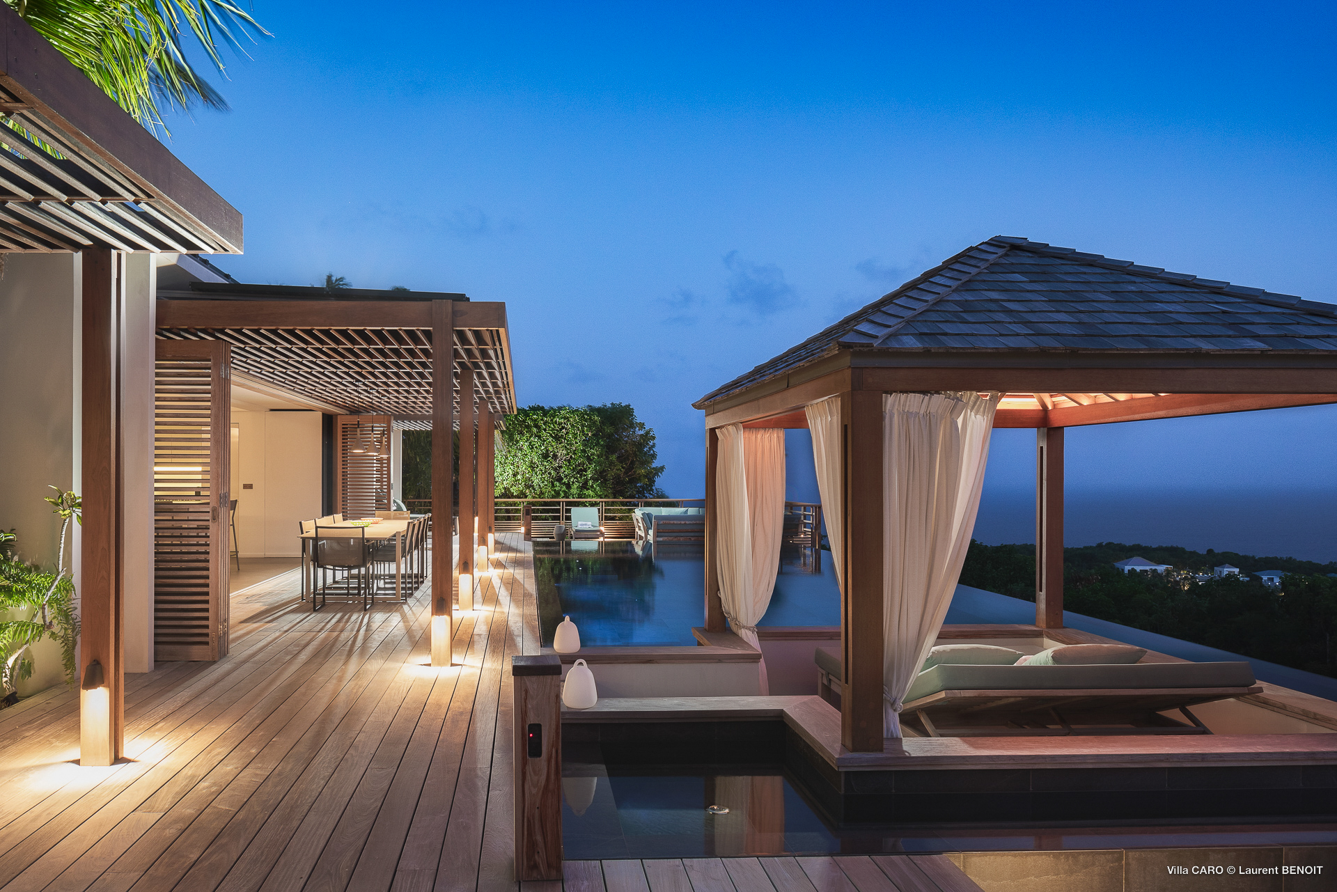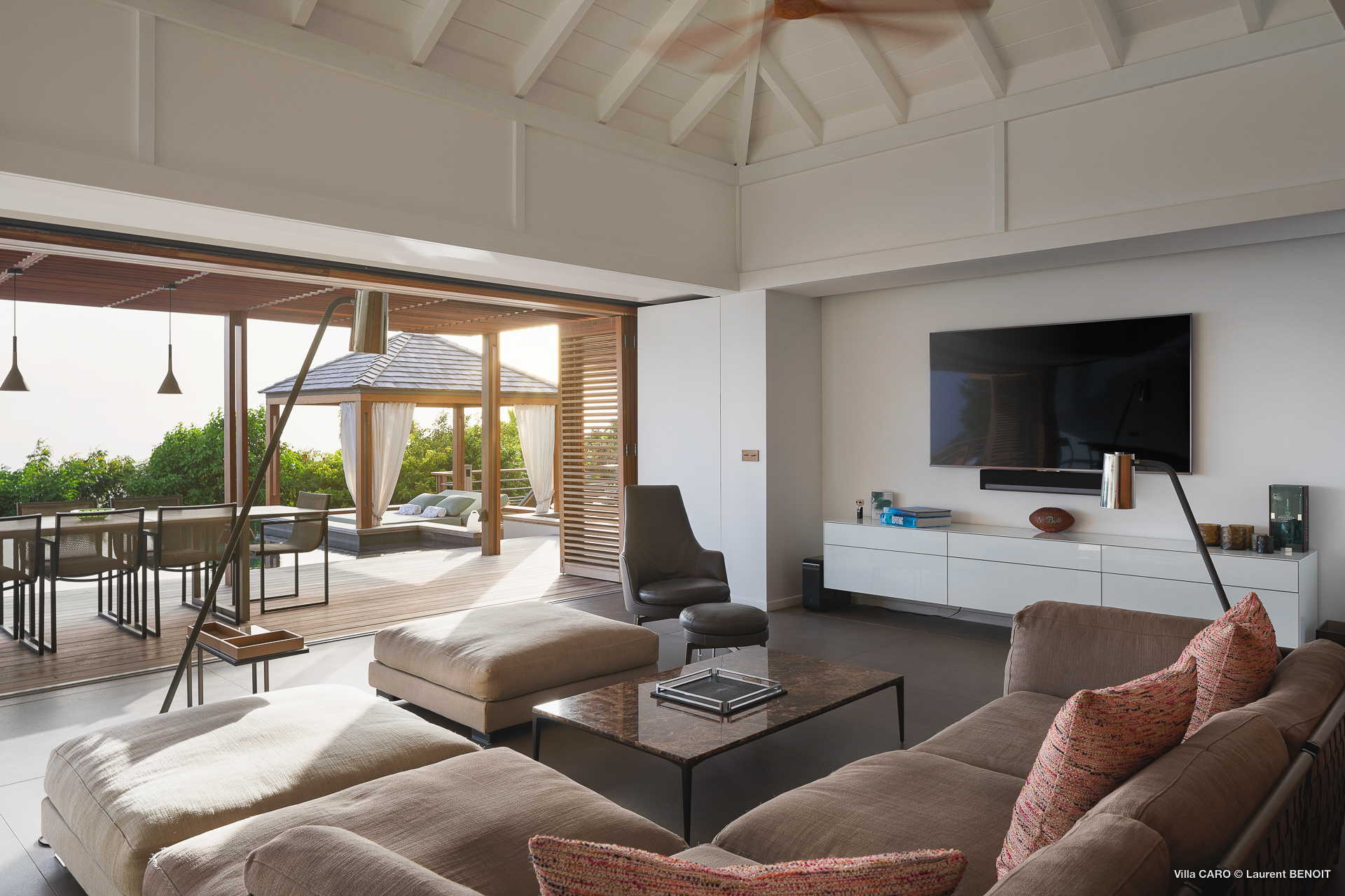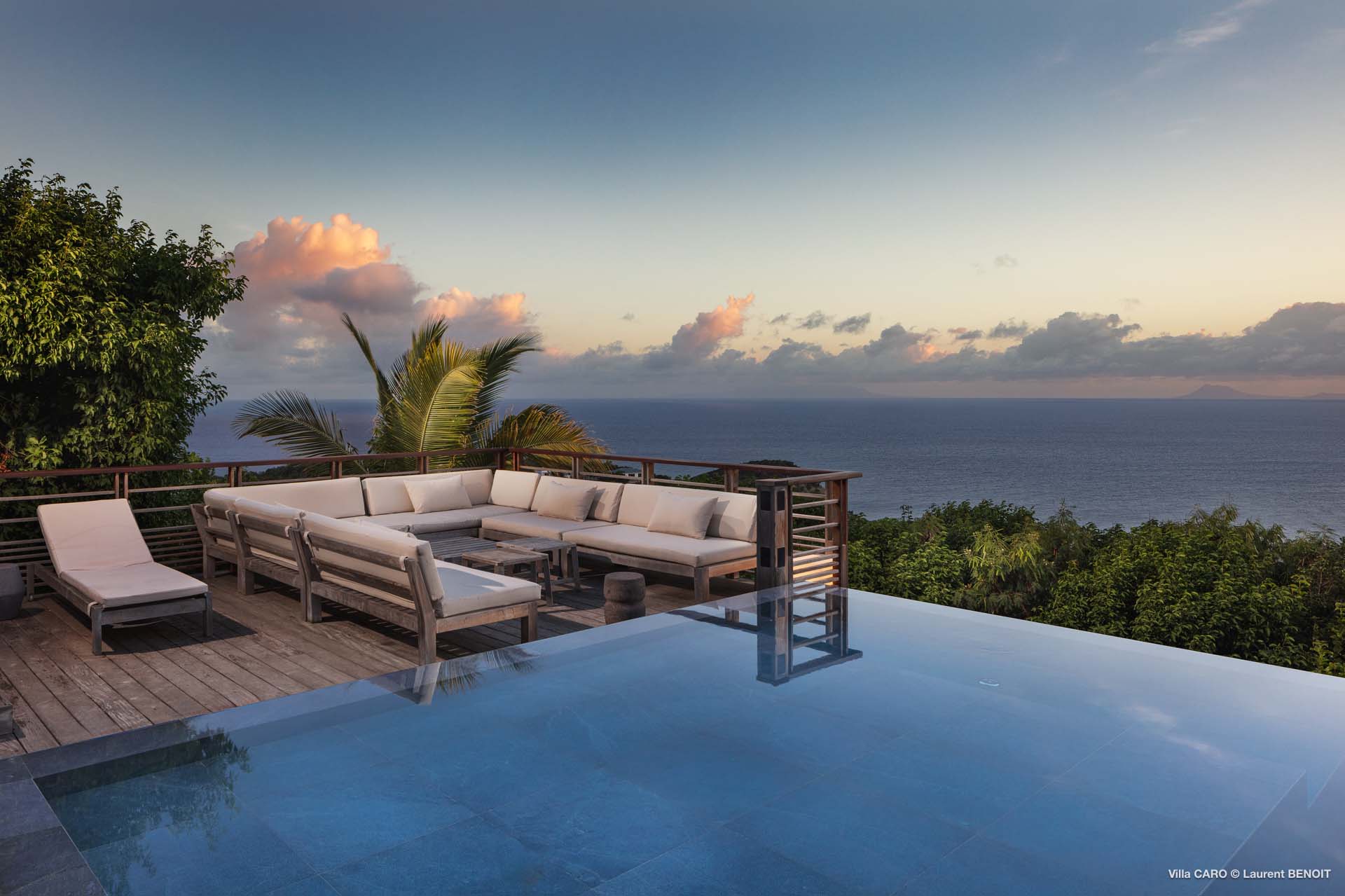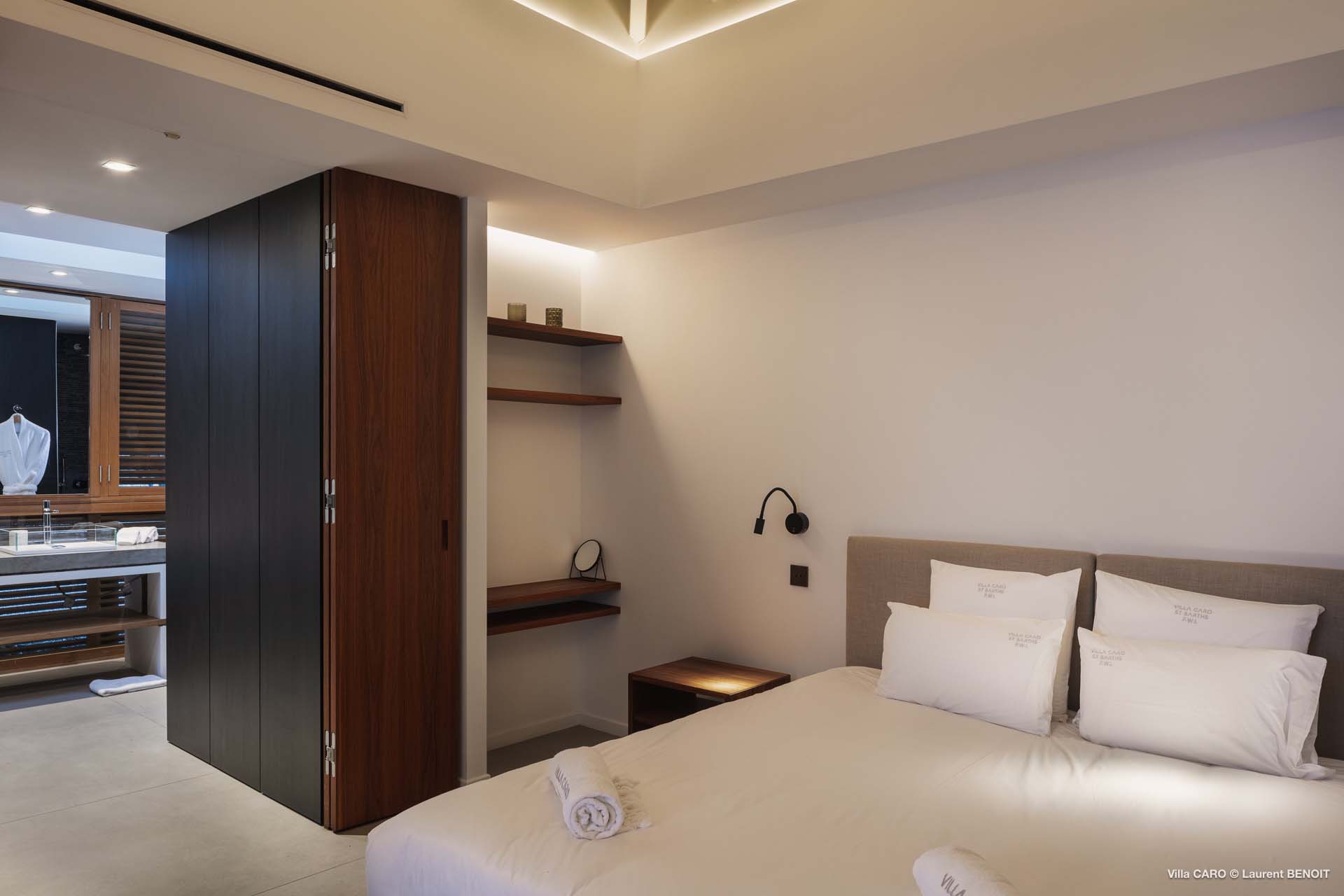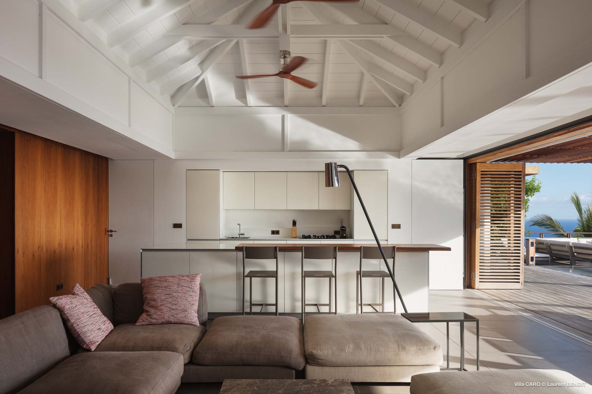 Welcome to Villa Caro (villa code: WV ARO), a newly-built 5-bedroom villa in Gouverneur, St. Barts. This modern Caribbean home enjoys outstanding panoramic views and is the height of sophistication and luxury on the island. An inviting blend of wooden paneling and natural light creates an elegant atmosphere inside Villa Caro, a spacious home that combines indoor and outdoor living spaces with ease. The clean and pared-back design keeps your gaze firmly transfixed on the natural beauty around you while high-end furnishings provide every comfort. Situated at the top of Gouverneur, Villa Caro is a short drive away from restaurants, bakeries, and grocery stores. Gouverneur Beach is 3 minutes down the hill. Gustavia, the capital, is also nearby, making this the ideal vacation villa for a St. Barts getaway. The central living area inside Villa Caro is all about functionality and style. The spacious room combines the living room, office, and kitchen, and can either be fully opened to the terrace and pool or closed off and air-conditioned. It’s all about easy living in the Caribbean, the simple luxuries of life. The living room is an idyllic spot to soak up the views and ocean breeze, relaxing on one of the inviting sofas. A flat-screen TV hangs on the wall, but it’s really the ocean panoramas that will draw your gaze. The beautiful wooden paneling in the back of the room discreetly hides the main entrance and sleek office space. Behind the living room is the kitchen, a warm and inviting spot to cook. Also hidden behind the wooden paneling is an auxiliary kitchen where they’ll work most of their magic. Breezy meals can be enjoyed on the covered terrace, directly in front of the living area and kitchen. With a sunset casting a rosy gold color across the sea and sky, you’ll have many a memorable meal here with family and friends. The bedrooms inside Villa Caro, each offer a simple yet luxurious space to relax, recharge, and unwind. All are similar in size and have ensuite bathrooms. To the left of the main room is the master suite, which also enjoys a full dressing area and a spacious shower with luxurious side jets. A U.S. king-sized bed is plush and comfortable. There are two guest bedrooms to the right side of the main room, each with his-and-her closets, king-sized beds, and ocean views. The final two bedrooms are at the back of the property, facing the idyllic tropical garden. These two rooms each have a pair of twin beds, that can be configured into a king. The outdoor living spaces at Villa Caro make you feel like you’re on top of the world. The views are breathtaking, with the rolling hills of St. Barts melting into the sparkling Caribbean Sea. Kicking back with a drink to take it all in is a great way to enjoy each evening. Speaking of relaxing, there are several fantastic areas to unwind outside. You could enjoy a meal in the sunken gazebo next to the pool, or host a cocktail hour on the couch in the far corner of the terrace. All this space surrounds the large, heated infinity pool, the ideal spot to enjoy the views breezes, and warm Caribbean sun. Villa Caro is an ideal villa for families as well as couples vacationing together and features a long list of amenities. There’s also a fitness room on the lower floor. During the December holidays, the villa rents at the full occupancy rate regardless of how many bedrooms are used.Please fill out the form to begin your inquiry and we will connect you with a seasoned villa rental specialist.