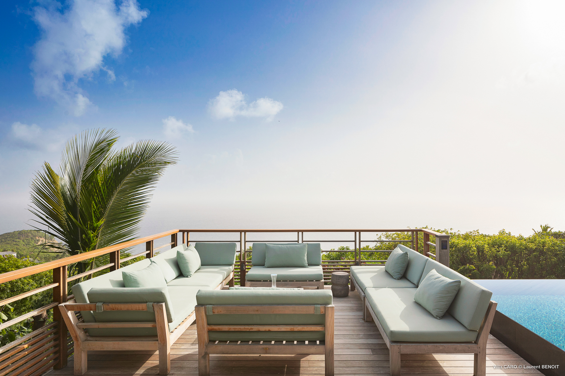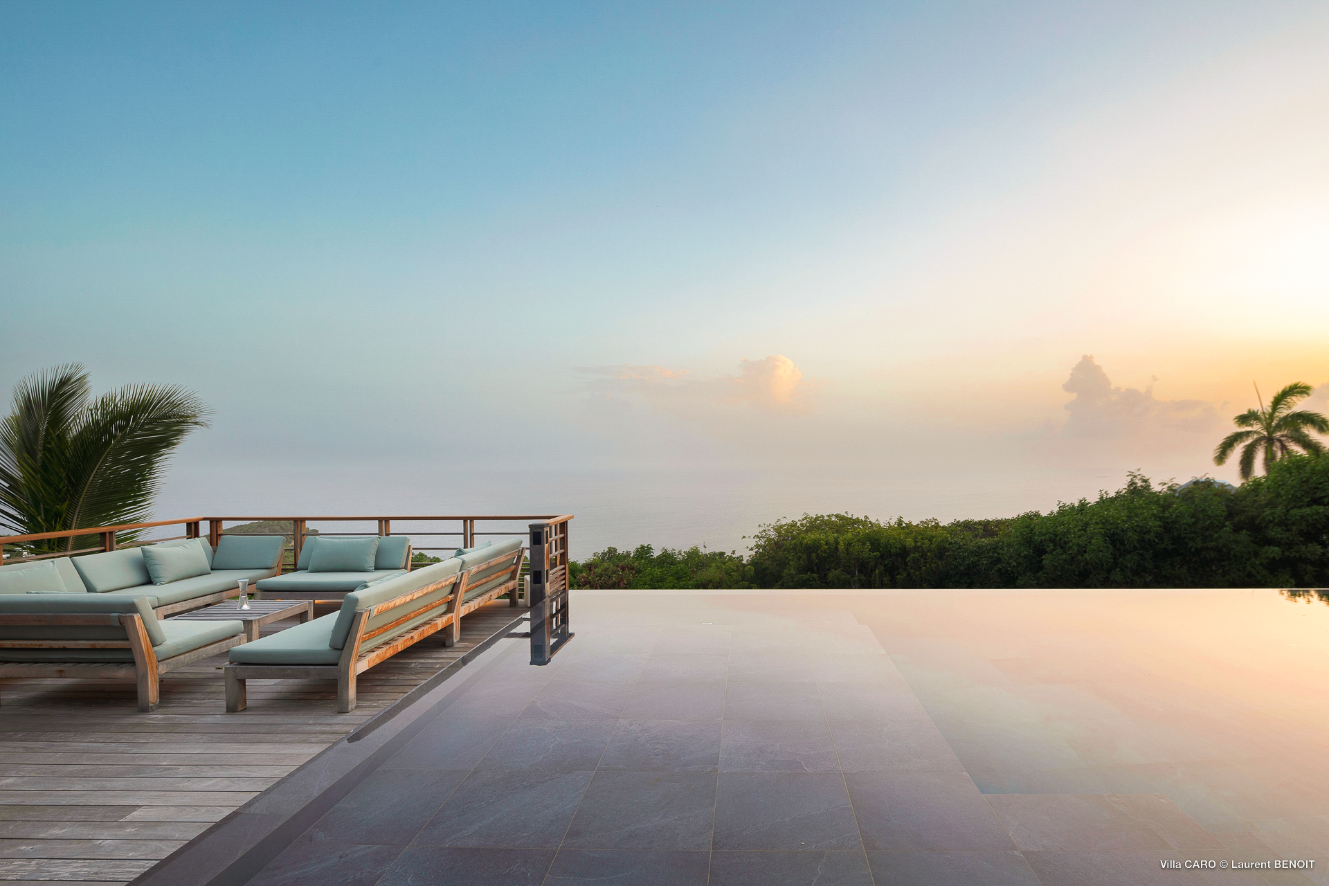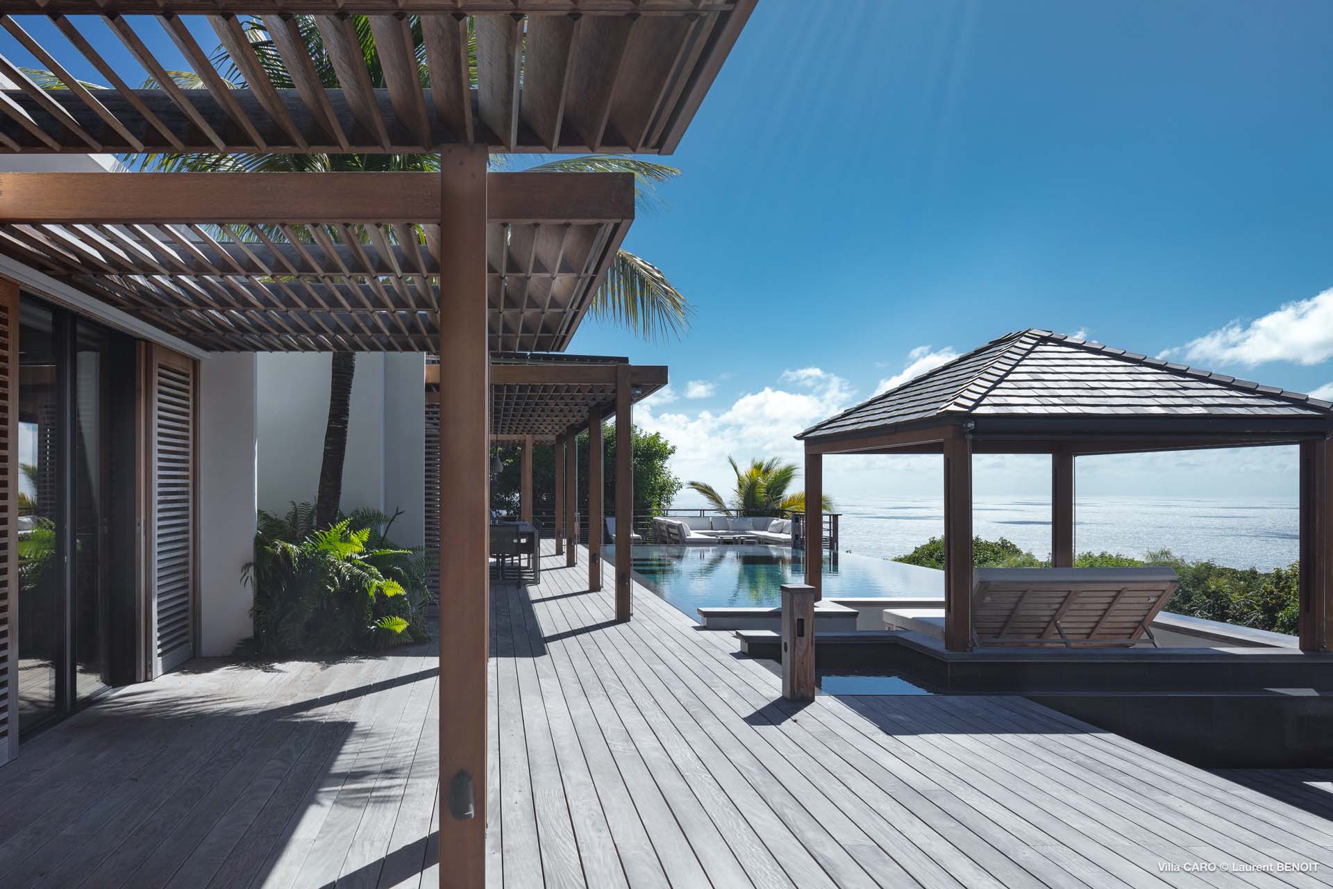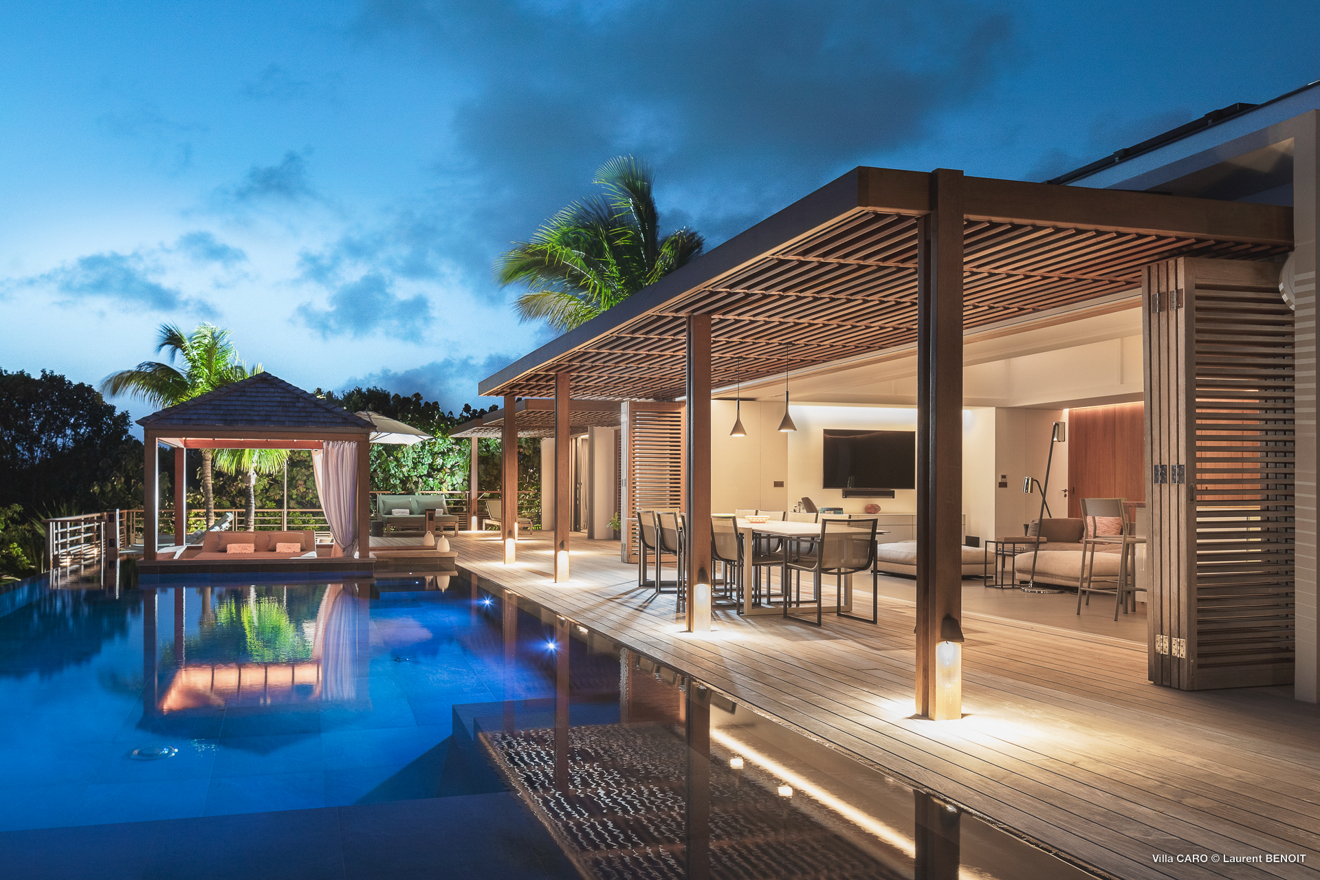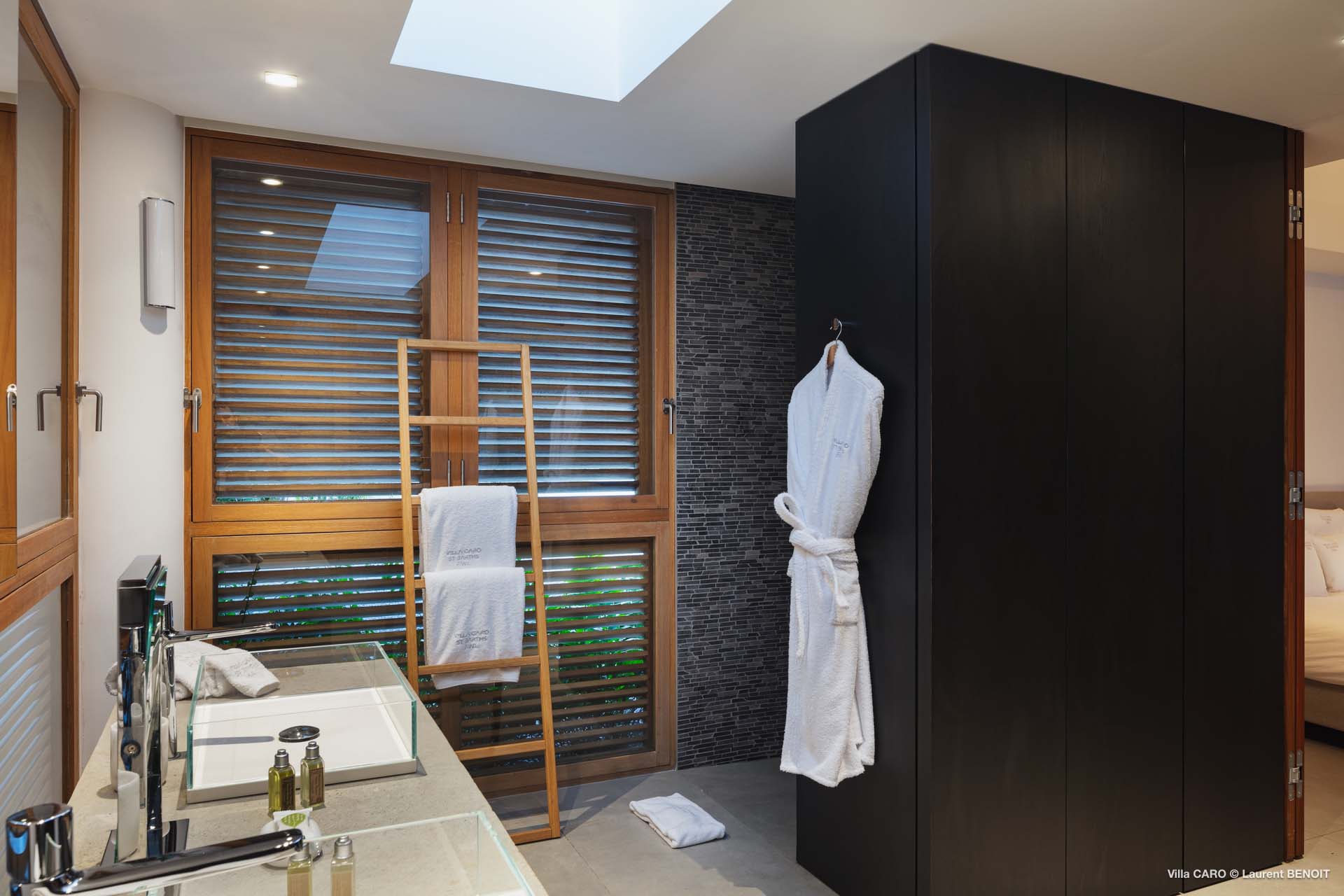 Welcome to Villa Caro (villa code: WV ARO), a newly-built 5-bedroom villa in Gouverneur, St. Barts. This modern Caribbean home enjoys outstanding panoramic views and is the height of sophistication and luxury on the island. An inviting blend of wooden paneling and natural light creates an elegant atmosphere inside Villa Caro, a spacious home that combines indoor and outdoor living spaces with ease. The clean and pared-back design keeps your gaze firmly transfixed on the natural beauty around you while high-end furnishings provide every comfort. Situated at the top of Gouverneur, Villa Caro is a short drive away from restaurants, bakeries, and grocery stores. Gouverneur Beach is 3 minutes down the hill. Gustavia, the capital, is also nearby, making this the ideal vacation villa for a St. Barts getaway. The central living area inside Villa Caro is all about functionality and style. The spacious room combines the living room, office, and kitchen, and can either be fully opened to the terrace and pool or closed off and air-conditioned. It’s all about easy living in the Caribbean, the simple luxuries of life. The living room is an idyllic spot to soak up the views and ocean breeze, relaxing on one of the inviting sofas. A flat-screen TV hangs on the wall, but it’s really the ocean panoramas that will draw your gaze. The beautiful wooden paneling in the back of the room discreetly hides the main entrance and sleek office space. Behind the living room is the kitchen, a warm and inviting spot to cook. Also hidden behind the wooden paneling is an auxiliary kitchen where they’ll work most of their magic. Breezy meals can be enjoyed on the covered terrace, directly in front of the living area and kitchen. With a sunset casting a rosy gold color across the sea and sky, you’ll have many a memorable meal here with family and friends. The bedrooms inside Villa Caro, each offer a simple yet luxurious space to relax, recharge, and unwind. All are similar in size and have ensuite bathrooms. To the left of the main room is the master suite, which also enjoys a full dressing area and a spacious shower with luxurious side jets. A U.S. king-sized bed is plush and comfortable. There are two guest bedrooms to the right side of the main room, each with his-and-her closets, king-sized beds, and ocean views. The final two bedrooms are at the back of the property, facing the idyllic tropical garden. These two rooms each have a pair of twin beds, that can be configured into a king. The outdoor living spaces at Villa Caro make you feel like you’re on top of the world. The views are breathtaking, with the rolling hills of St. Barts melting into the sparkling Caribbean Sea. Kicking back with a drink to take it all in is a great way to enjoy each evening. Speaking of relaxing, there are several fantastic areas to unwind outside. You could enjoy a meal in the sunken gazebo next to the pool, or host a cocktail hour on the couch in the far corner of the terrace. All this space surrounds the large, heated infinity pool, the ideal spot to enjoy the views breezes, and warm Caribbean sun. Villa Caro is an ideal villa for families as well as couples vacationing together and features a long list of amenities. There’s also a fitness room on the lower floor. During the December holidays, the villa rents at the full occupancy rate regardless of how many bedrooms are used.Please fill out the form to begin your inquiry and we will connect you with a seasoned villa rental specialist.