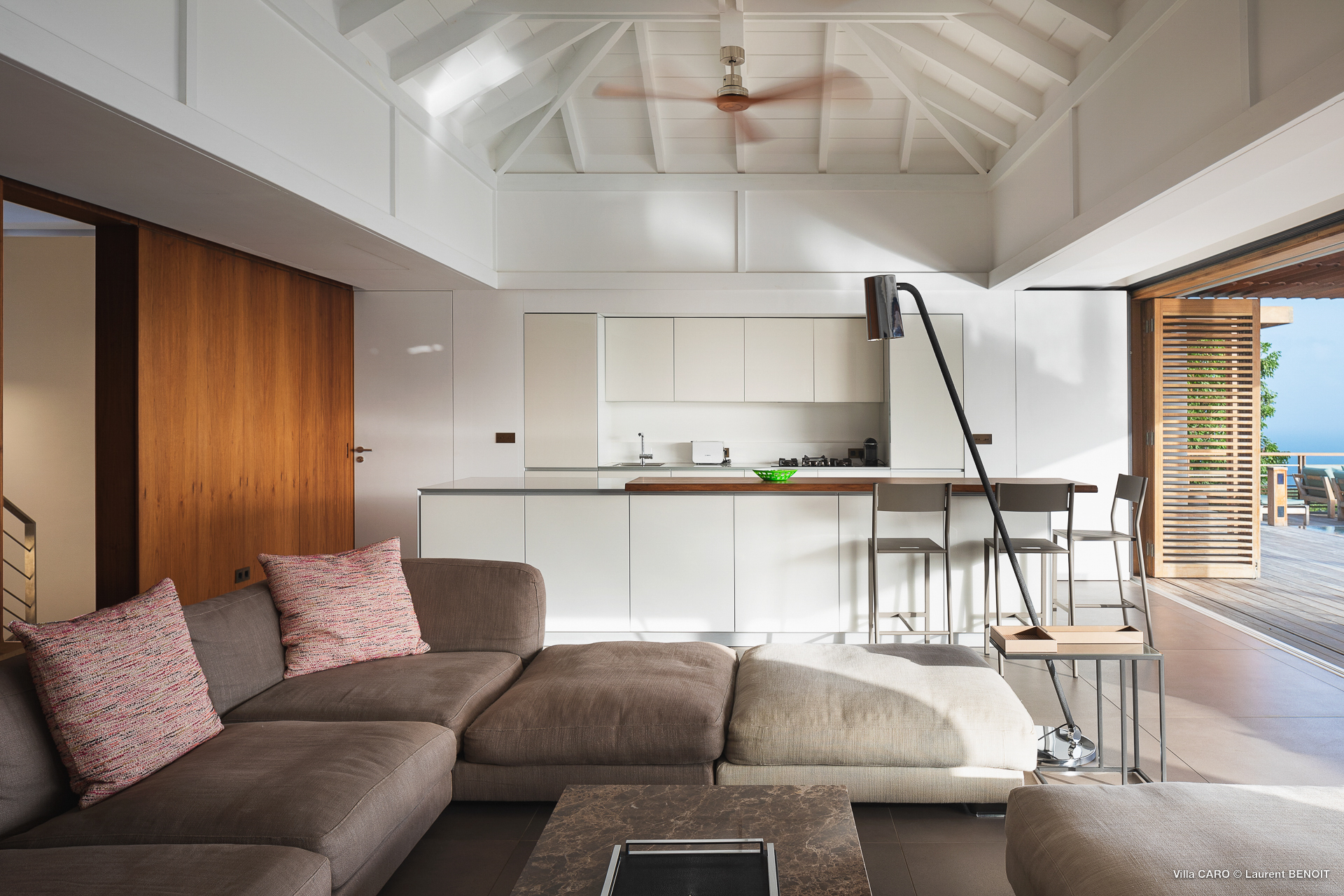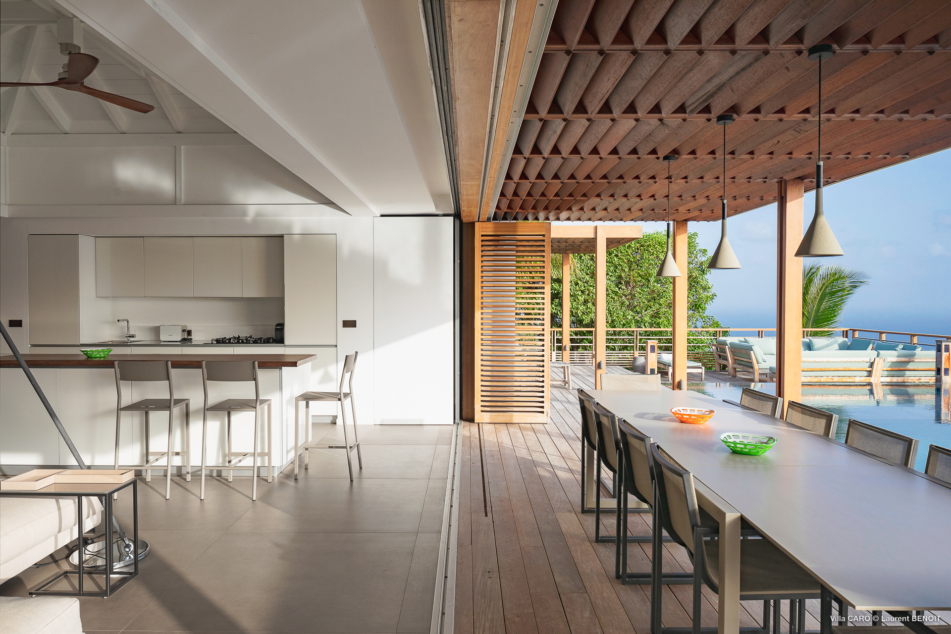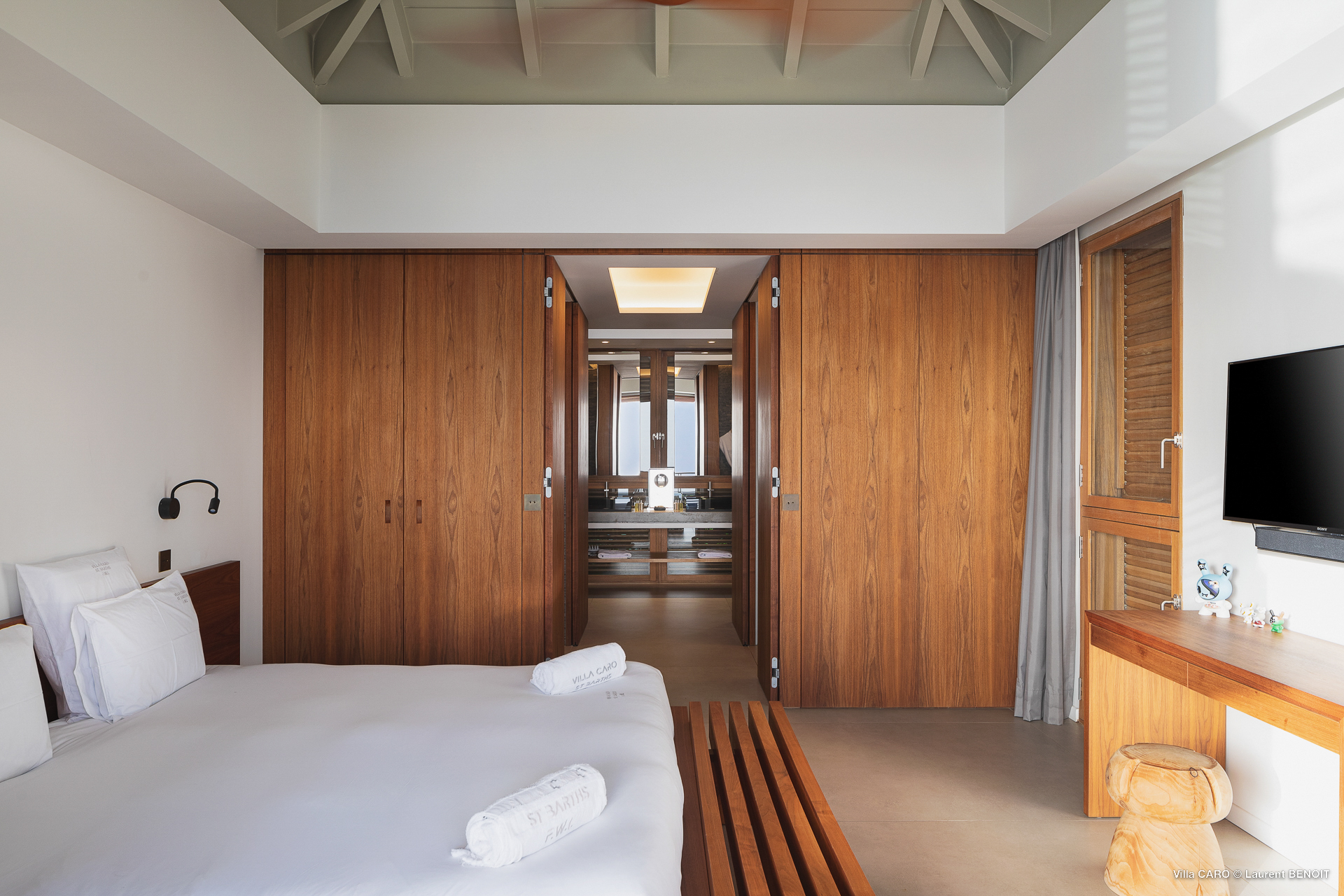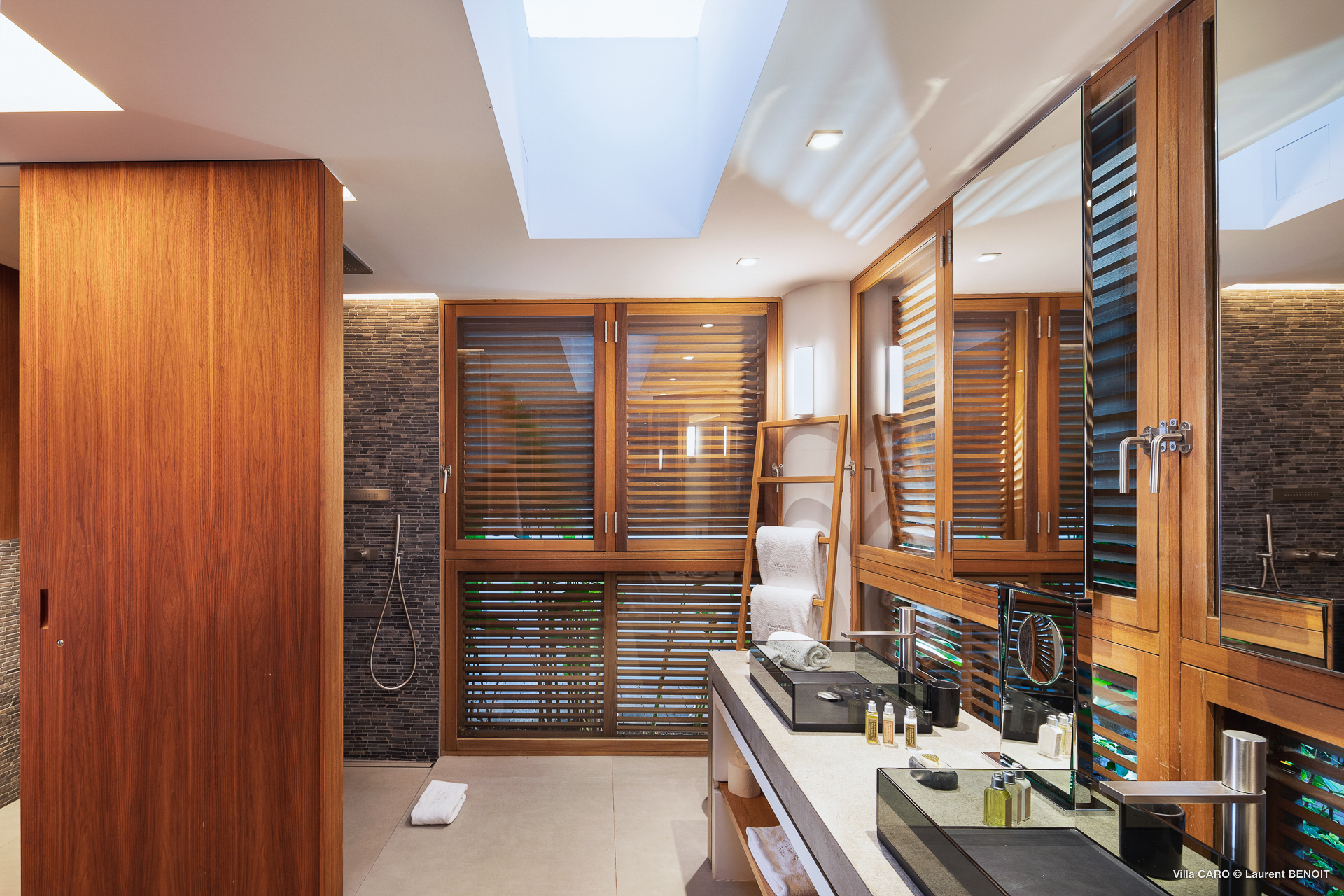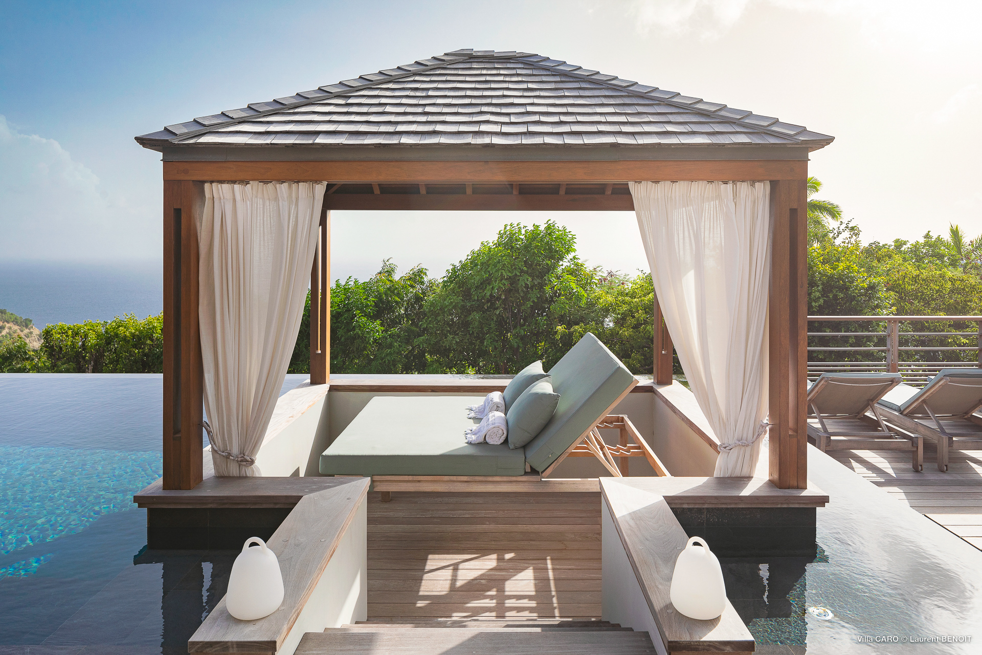 Welcome to Villa Caro (villa code: WV ARO), a newly-built 5-bedroom villa in Gouverneur, St. Barts. This modern Caribbean home enjoys outstanding panoramic views and is the height of sophistication and luxury on the island. An inviting blend of wooden paneling and natural light creates an elegant atmosphere inside Villa Caro, a spacious home that combines indoor and outdoor living spaces with ease. The clean and pared-back design keeps your gaze firmly transfixed on the natural beauty around you while high-end furnishings provide every comfort. Situated at the top of Gouverneur, Villa Caro is a short drive away from restaurants, bakeries, and grocery stores. Gouverneur Beach is 3 minutes down the hill. Gustavia, the capital, is also nearby, making this the ideal vacation villa for a St. Barts getaway. The central living area inside Villa Caro is all about functionality and style. The spacious room combines the living room, office, and kitchen, and can either be fully opened to the terrace and pool or closed off and air-conditioned. It’s all about easy living in the Caribbean, the simple luxuries of life. The living room is an idyllic spot to soak up the views and ocean breeze, relaxing on one of the inviting sofas. A flat-screen TV hangs on the wall, but it’s really the ocean panoramas that will draw your gaze. The beautiful wooden paneling in the back of the room discreetly hides the main entrance and sleek office space. Behind the living room is the kitchen, a warm and inviting spot to cook. Also hidden behind the wooden paneling is an auxiliary kitchen where they’ll work most of their magic. Breezy meals can be enjoyed on the covered terrace, directly in front of the living area and kitchen. With a sunset casting a rosy gold color across the sea and sky, you’ll have many a memorable meal here with family and friends. The bedrooms inside Villa Caro, each offer a simple yet luxurious space to relax, recharge, and unwind. All are similar in size and have ensuite bathrooms. To the left of the main room is the master suite, which also enjoys a full dressing area and a spacious shower with luxurious side jets. A U.S. king-sized bed is plush and comfortable. There are two guest bedrooms to the right side of the main room, each with his-and-her closets, king-sized beds, and ocean views. The final two bedrooms are at the back of the property, facing the idyllic tropical garden. These two rooms each have a pair of twin beds, that can be configured into a king. The outdoor living spaces at Villa Caro make you feel like you’re on top of the world. The views are breathtaking, with the rolling hills of St. Barts melting into the sparkling Caribbean Sea. Kicking back with a drink to take it all in is a great way to enjoy each evening. Speaking of relaxing, there are several fantastic areas to unwind outside. You could enjoy a meal in the sunken gazebo next to the pool, or host a cocktail hour on the couch in the far corner of the terrace. All this space surrounds the large, heated infinity pool, the ideal spot to enjoy the views breezes, and warm Caribbean sun. Villa Caro is an ideal villa for families as well as couples vacationing together and features a long list of amenities. There’s also a fitness room on the lower floor. During the December holidays, the villa rents at the full occupancy rate regardless of how many bedrooms are used.Please fill out the form to begin your inquiry and we will connect you with a seasoned villa rental specialist.