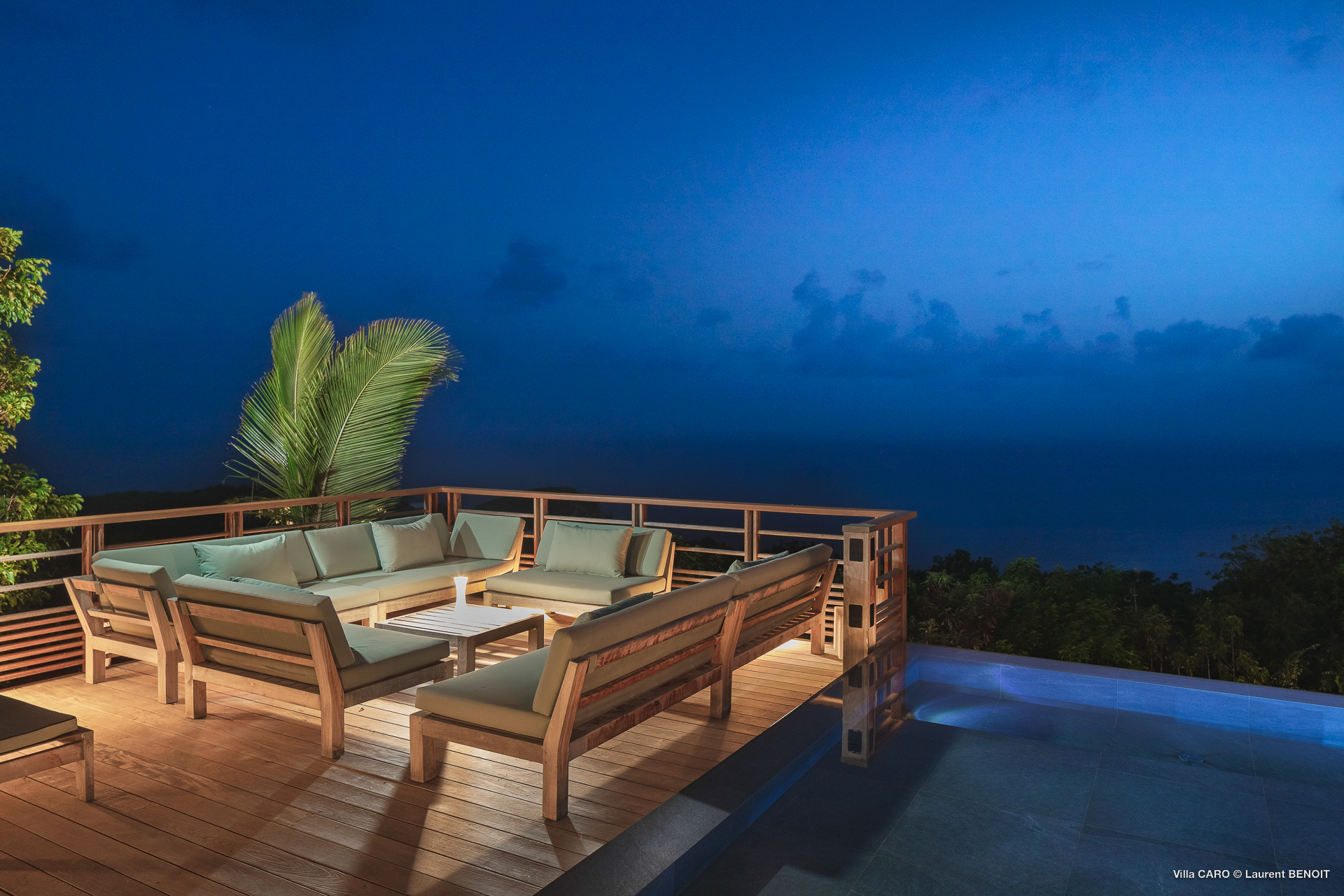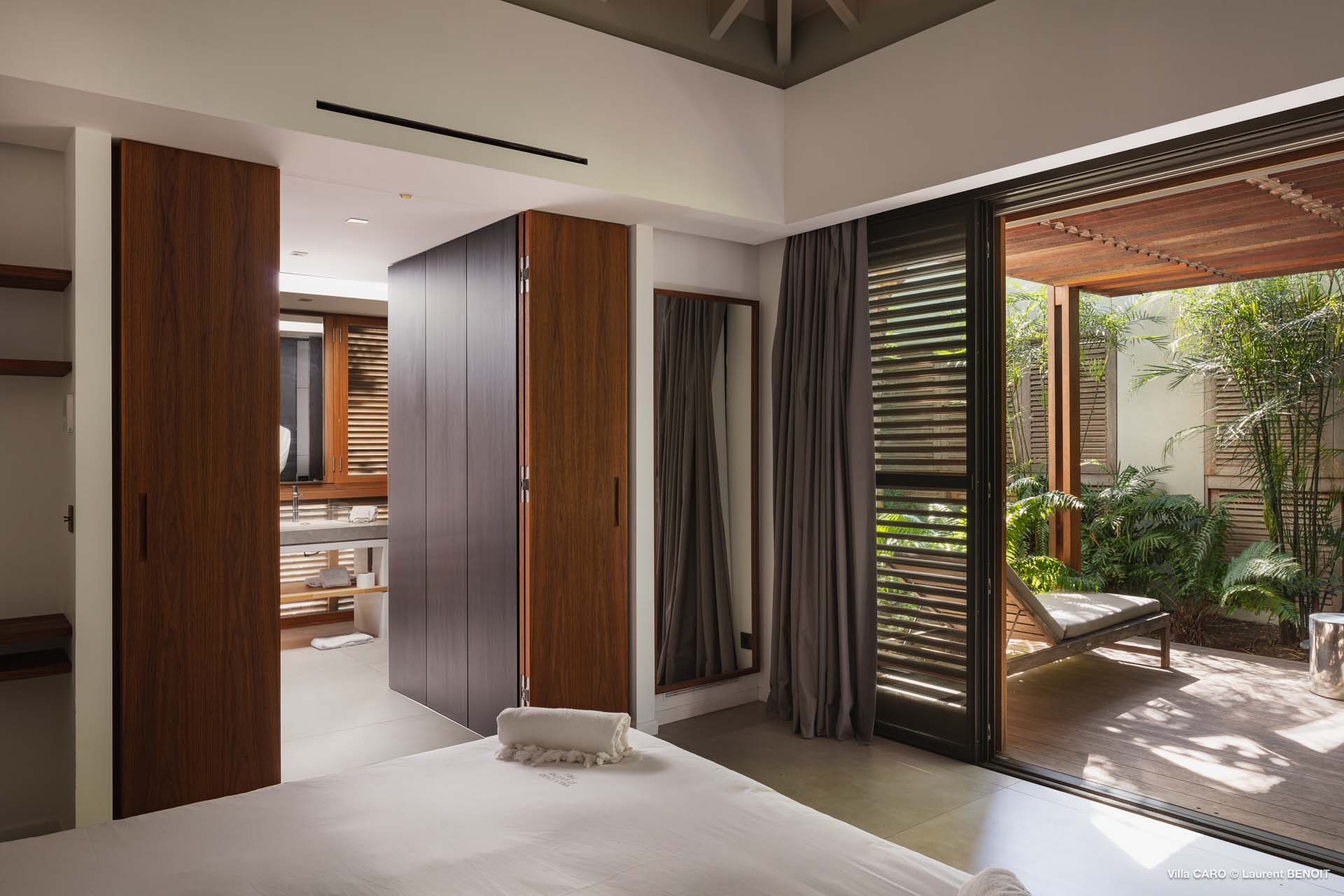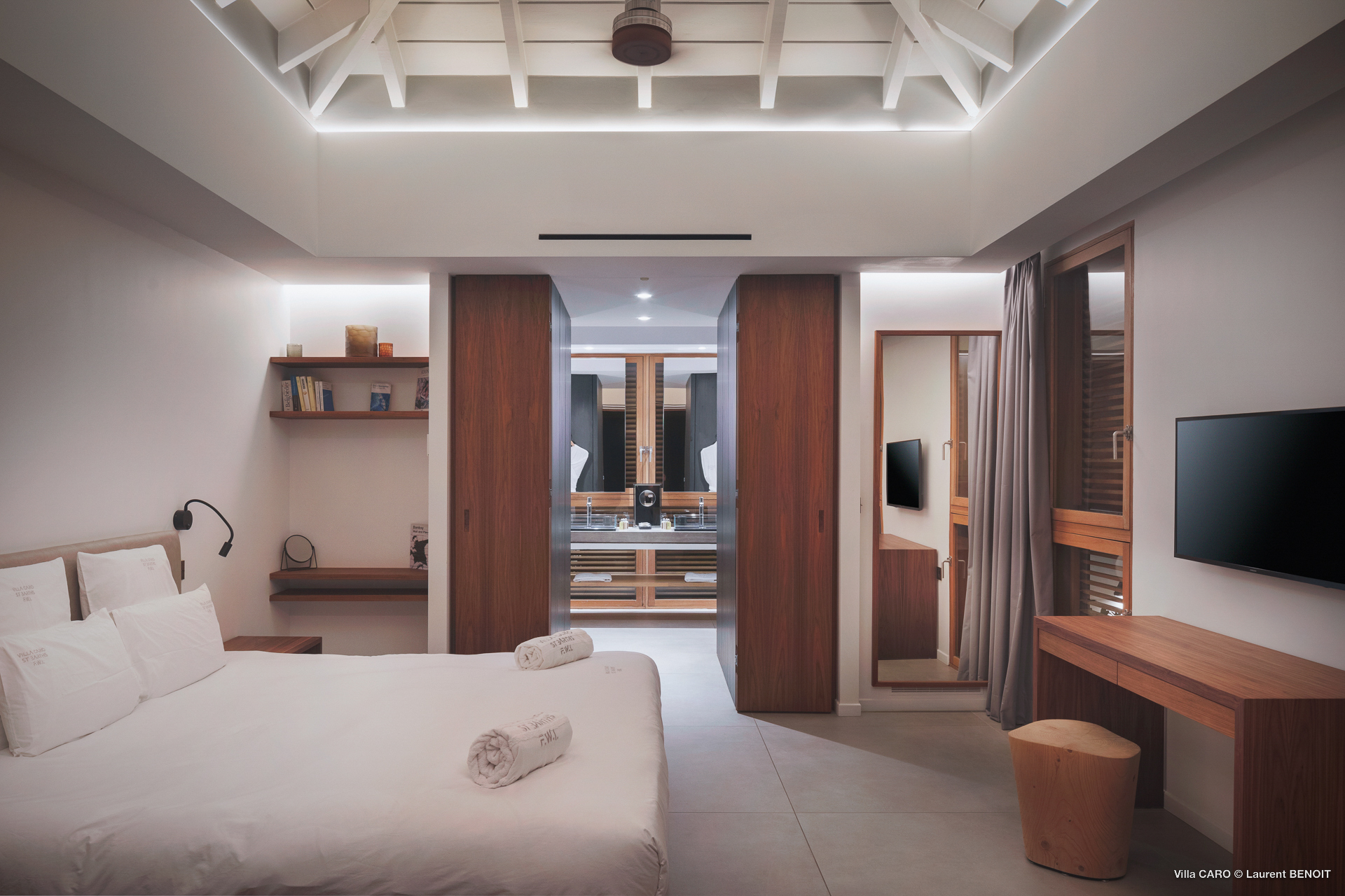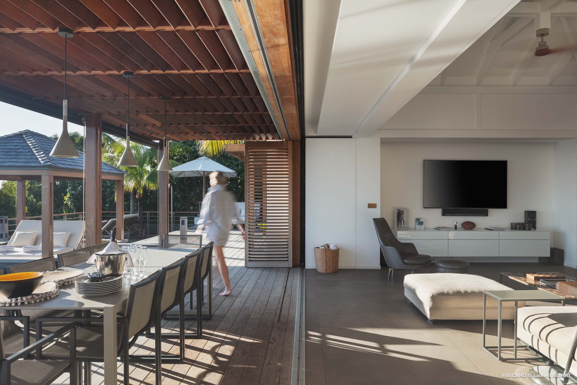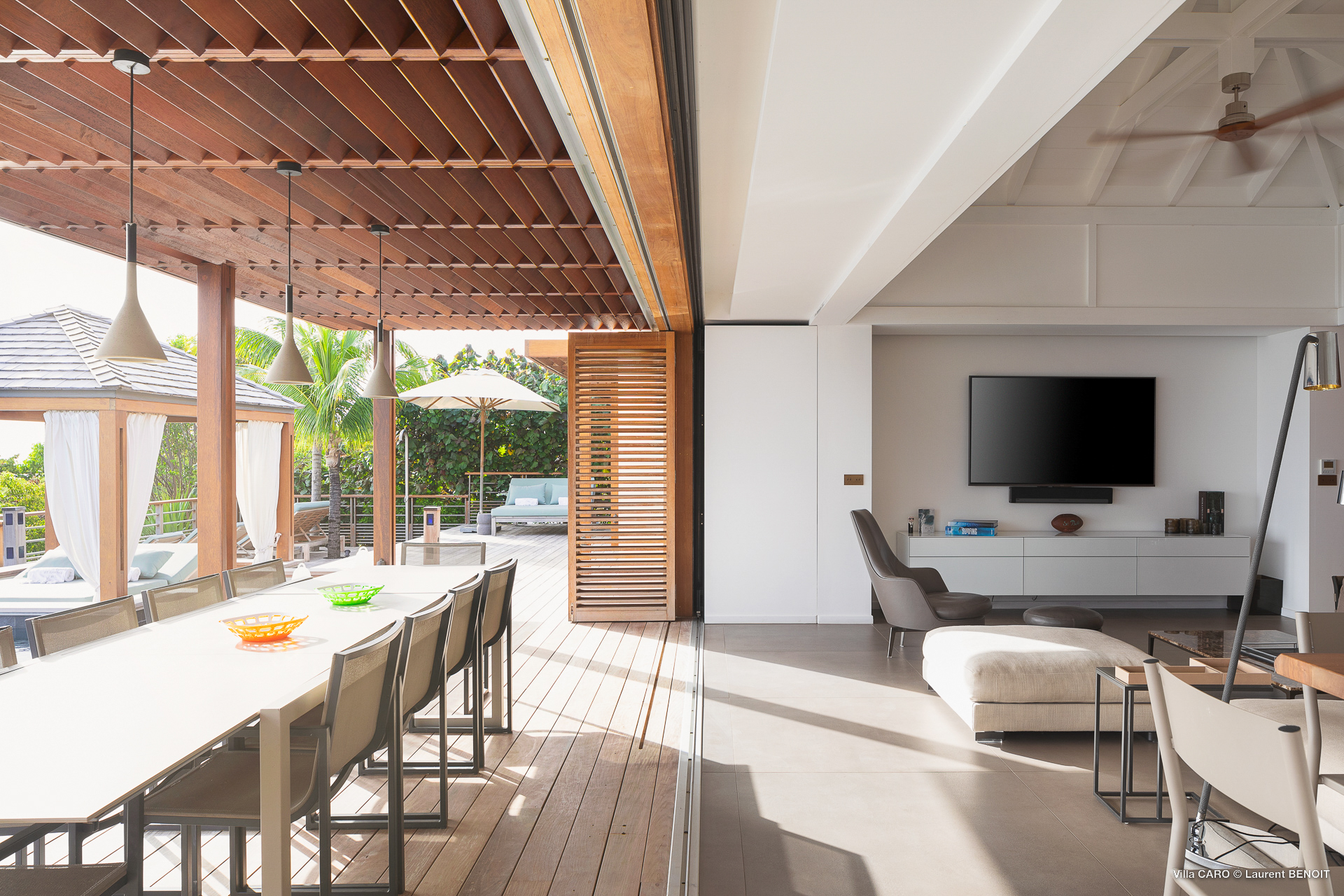Welcome to Villa Caro (villa code: WV ARO), a newly-built 5-bedroom villa in Gouverneur, St. Barts. This modern Caribbean home enjoys outstanding panoramic views and is the height of sophistication and luxury on the island. An inviting blend of wooden paneling and natural light creates an elegant atmosphere inside Villa Caro, a spacious home that combines indoor and outdoor living spaces with ease. The clean and pared-back design keeps your gaze firmly transfixed on the natural beauty around you while high-end furnishings provide every comfort. Situated at the top of Gouverneur, Villa Caro is a short drive away from restaurants, bakeries, and grocery stores. Gouverneur Beach is 3 minutes down the hill. Gustavia, the capital, is also nearby, making this the ideal vacation villa for a St. Barts getaway. The central living area inside Villa Caro is all about functionality and style. The spacious room combines the living room, office, and kitchen, and can either be fully opened to the terrace and pool or closed off and air-conditioned. It’s all about easy living in the Caribbean, the simple luxuries of life. The living room is an idyllic spot to soak up the views and ocean breeze, relaxing on one of the inviting sofas. A flat-screen TV hangs on the wall, but it’s really the ocean panoramas that will draw your gaze. The beautiful wooden paneling in the back of the room discreetly hides the main entrance and sleek office space. Behind the living room is the kitchen, a warm and inviting spot to cook. Also hidden behind the wooden paneling is an auxiliary kitchen where they’ll work most of their magic. Breezy meals can be enjoyed on the covered terrace, directly in front of the living area and kitchen. With a sunset casting a rosy gold color across the sea and sky, you’ll have many a memorable meal here with family and friends. The bedrooms inside Villa Caro, each offer a simple yet luxurious space to relax, recharge, and unwind. All are similar in size and have ensuite bathrooms. To the left of the main room is the master suite, which also enjoys a full dressing area and a spacious shower with luxurious side jets. A U.S. king-sized bed is plush and comfortable. There are two guest bedrooms to the right side of the main room, each with his-and-her closets, king-sized beds, and ocean views. The final two bedrooms are at the back of the property, facing the idyllic tropical garden. These two rooms each have a pair of twin beds, that can be configured into a king. The outdoor living spaces at Villa Caro make you feel like you’re on top of the world. The views are breathtaking, with the rolling hills of St. Barts melting into the sparkling Caribbean Sea. Kicking back with a drink to take it all in is a great way to enjoy each evening. Speaking of relaxing, there are several fantastic areas to unwind outside. You could enjoy a meal in the sunken gazebo next to the pool, or host a cocktail hour on the couch in the far corner of the terrace. All this space surrounds the large, heated infinity pool, the ideal spot to enjoy the views breezes, and warm Caribbean sun. Villa Caro is an ideal villa for families as well as couples vacationing together and features a long list of amenities. There’s also a fitness room on the lower floor. During the December holidays, the villa rents at the full occupancy rate regardless of how many bedrooms are used.Please fill out the form to begin your inquiry and we will connect you with a seasoned villa rental specialist.