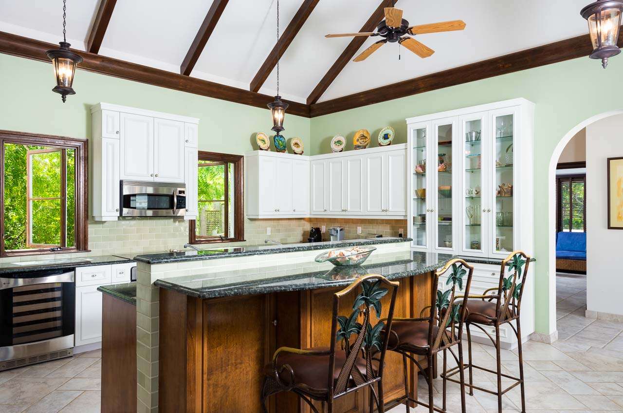 A small breakfast bar is a good spot for a morning coffee, while the indoor dining room table is magnificent for more formal dinner parties. If you prefer alfresco meals, there are also two tables outside, letting you enjoy a gourmet meal in the warm island air.