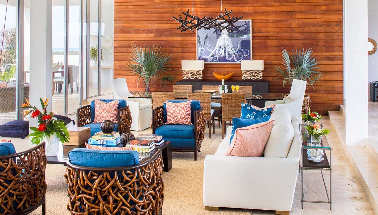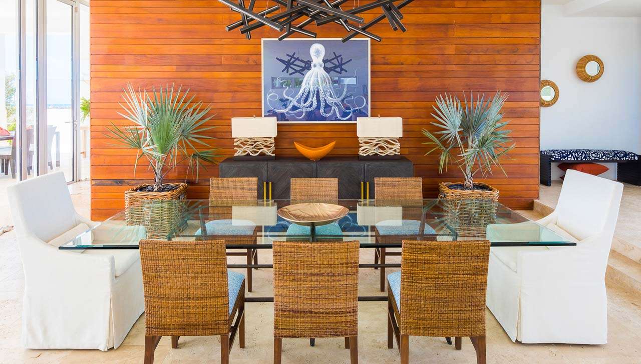 The elegant sitting area in the center is a fantastic spot to sink in and enjoy the ocean views. Glass doors open wide to the pool terrace, washing the space in the cool island breeze. For something cozier, why not pop on a movie and sink into the lounge in front of the TV?