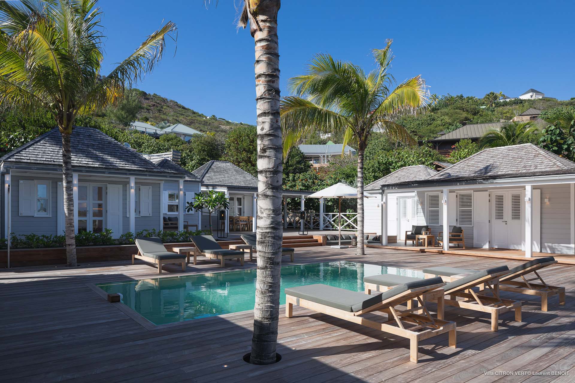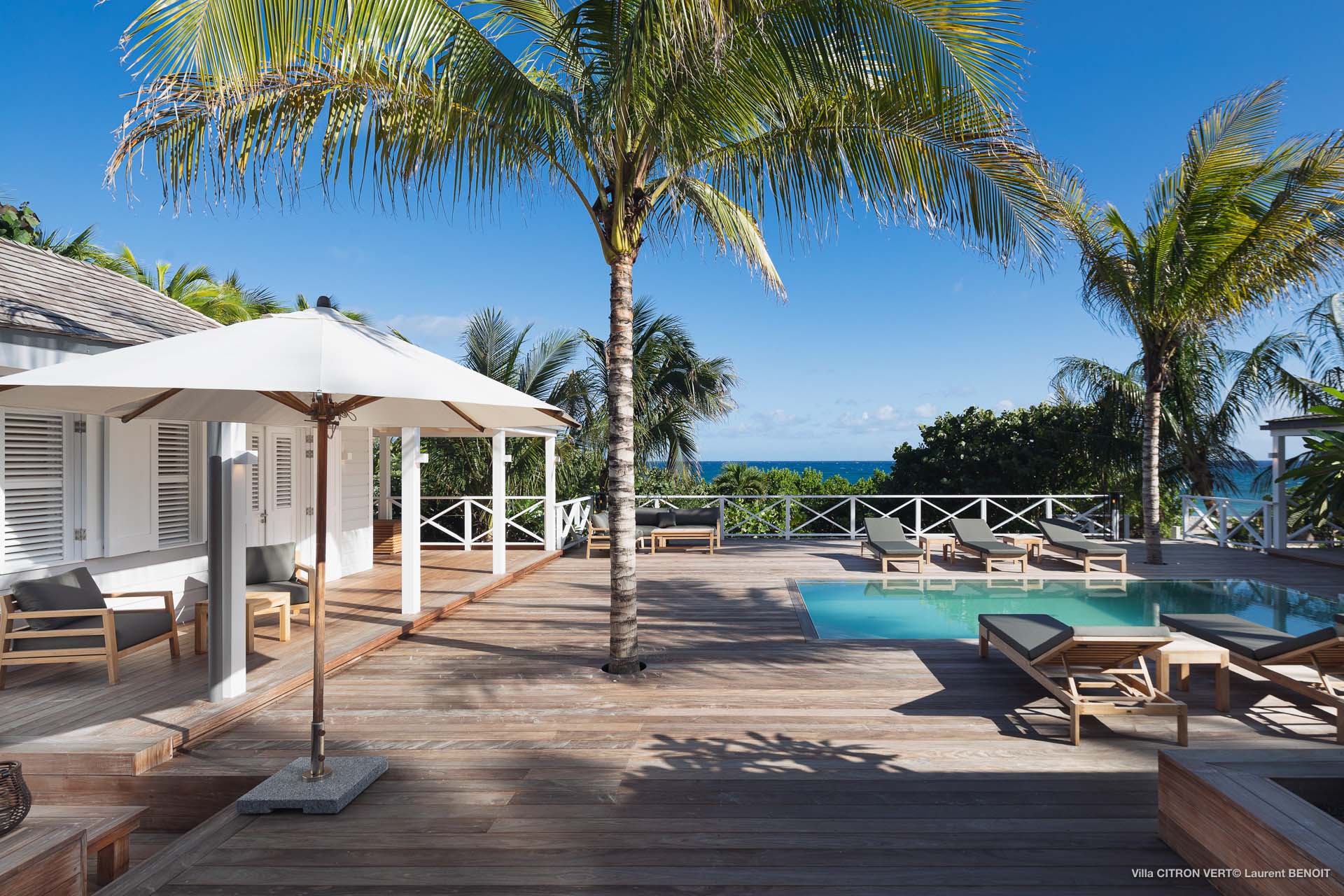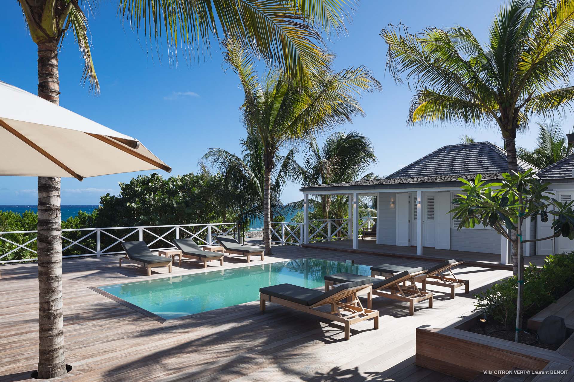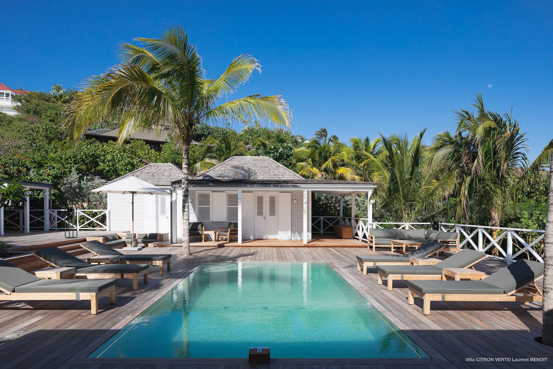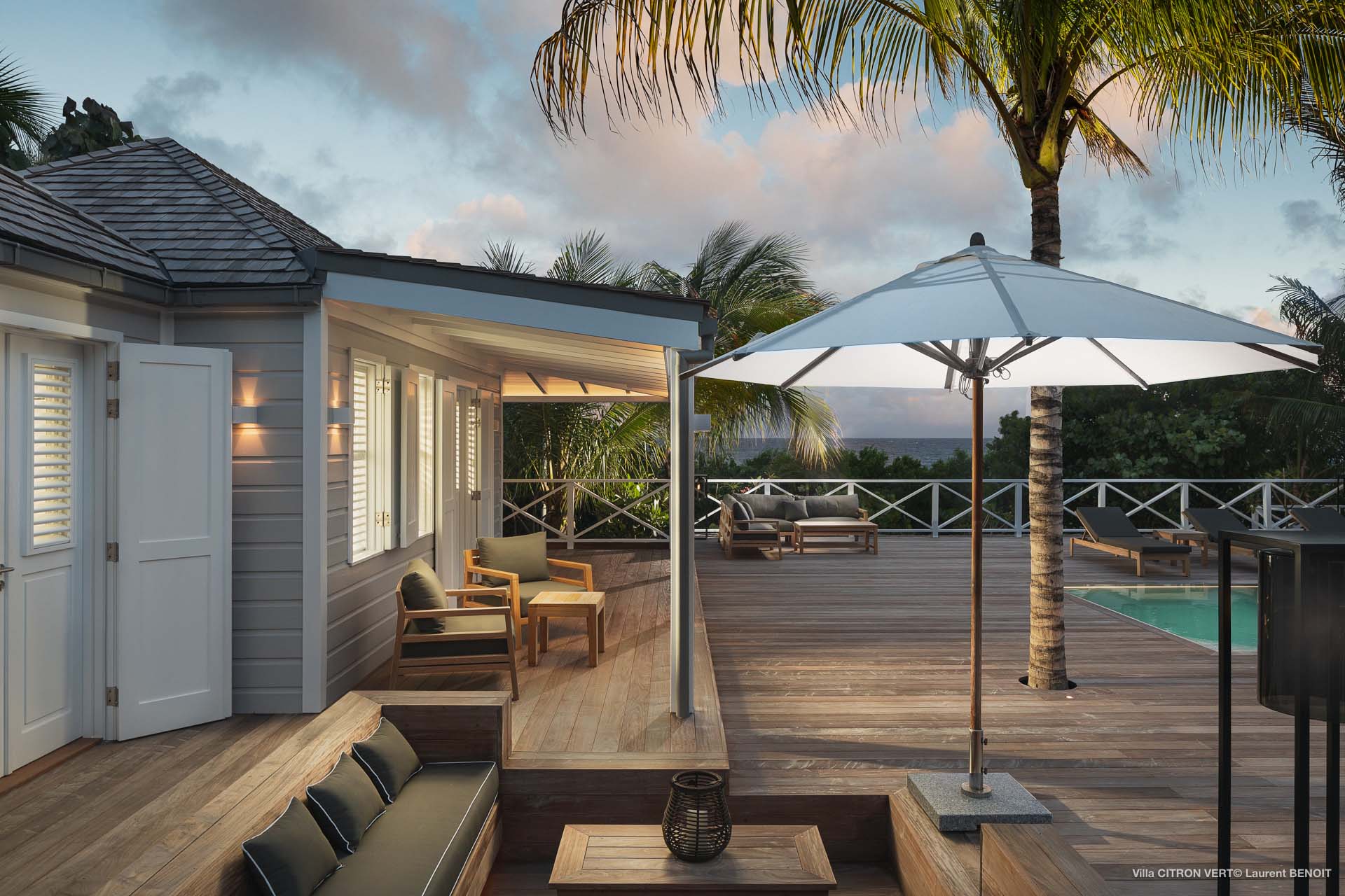 Villa Citron Vert (villa code: WV CIT) is a 3-bedroom situated across from the ocean, and a short walk from the Toiny beach club. It’s composed of several cozy cottages in front of a large sundeck with a sunken pool and pretty ocean views. There’s ample seating in both sun and shade, as well as a dining area with outdoor kitchen and grill. On the higher part of the deck is a small cottage with an air-conditioned living room, which can also serve as an office space. Adjacent, is a small, but cozy open kitchen. The two master bedrooms are on either side of the pool in separate cottages, while a guest room is situated next to the kitchen. All rooms come with a Euro king-sized bed, ensuite bathrooms with shower, his-and-hers closets, U.S. satellite and AppleTV. Villa Citron Vert is a great choice for a family vacation, but can also suit couples vacationing together.Please fill out the form to begin your inquiry and we will connect you with a seasoned villa rental specialist.