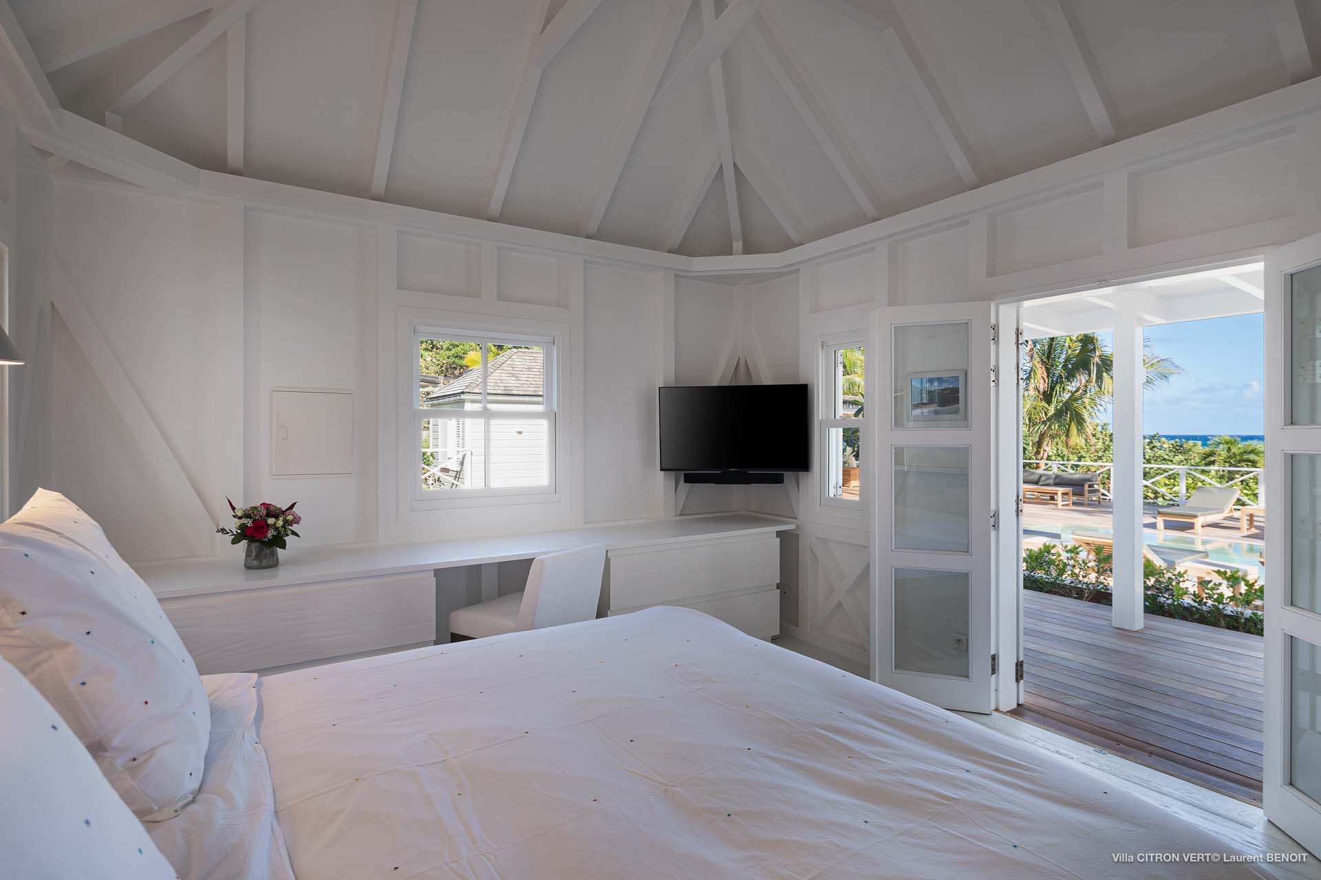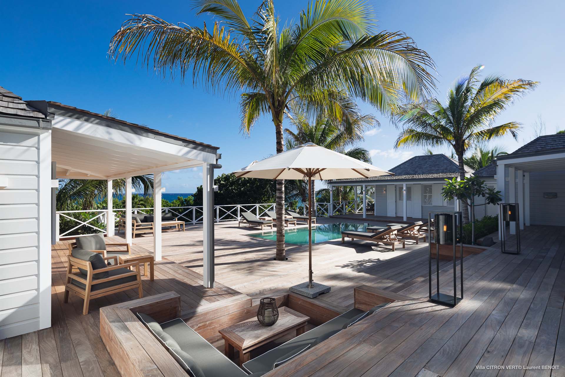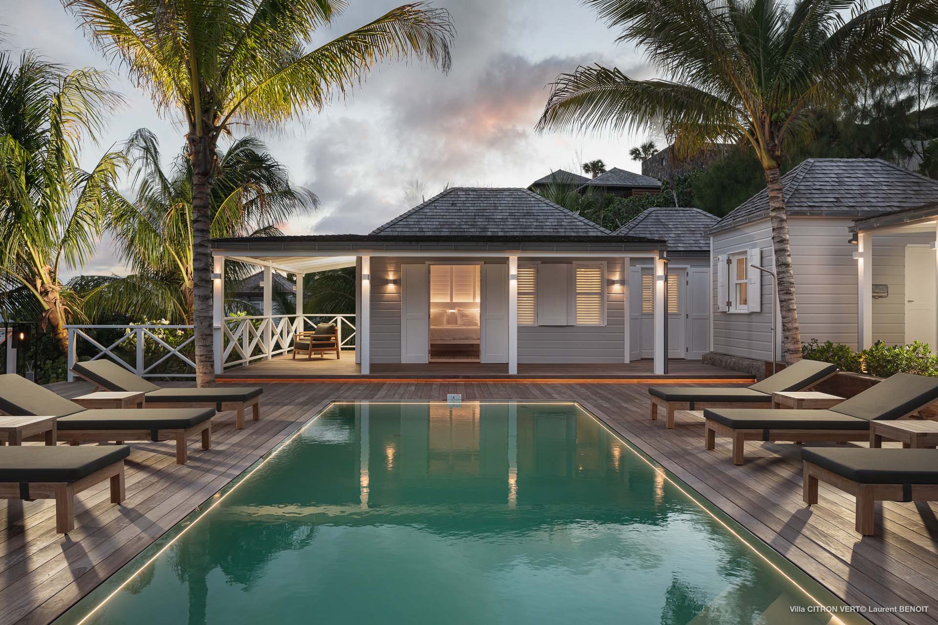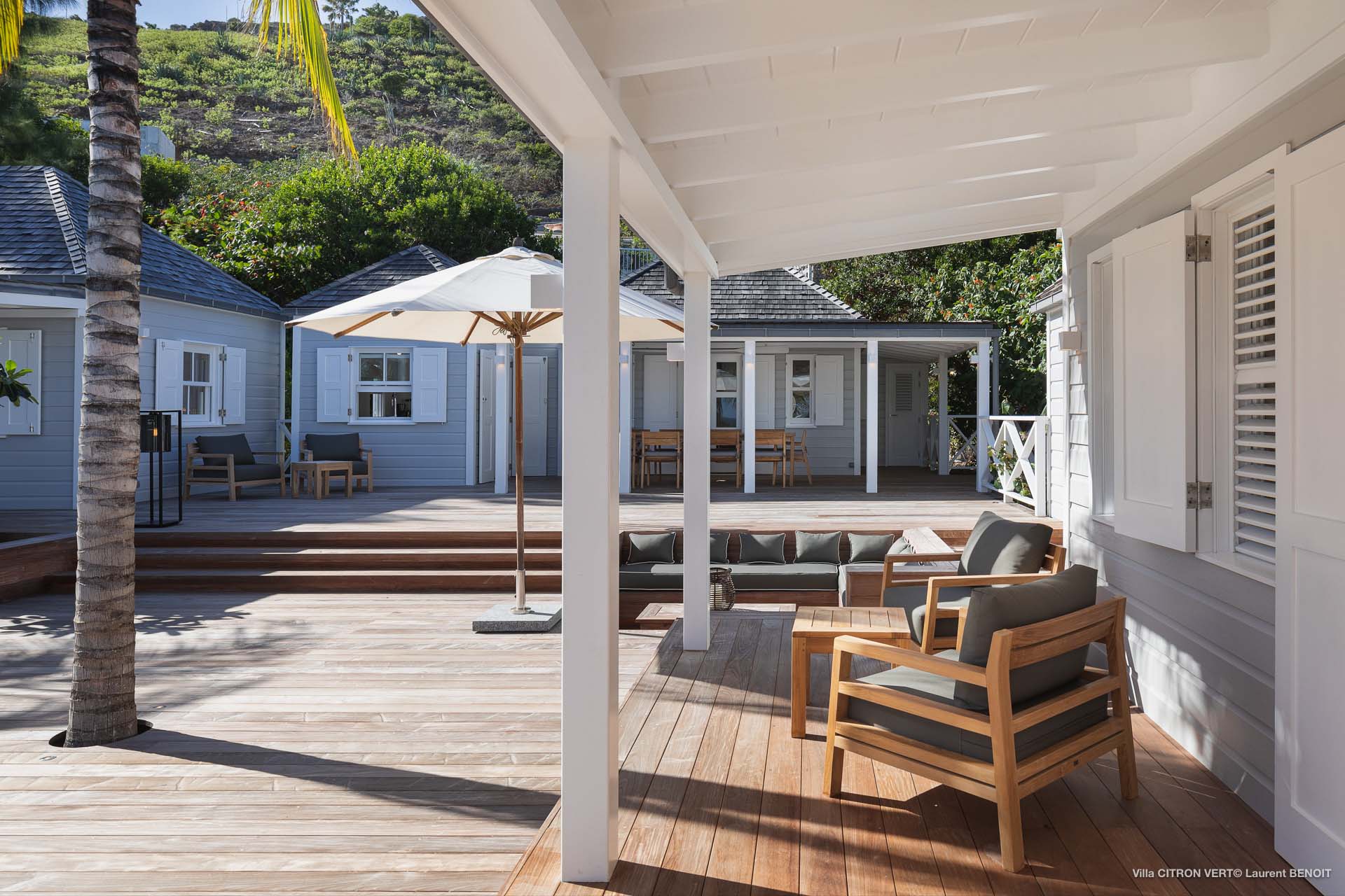 Villa Citron Vert (villa code: WV CIT) is a 3-bedroom situated across from the ocean, and a short walk from the Toiny beach club. It’s composed of several cozy cottages in front of a large sundeck with a sunken pool and pretty ocean views. There’s ample seating in both sun and shade, as well as a dining area with outdoor kitchen and grill. On the higher part of the deck is a small cottage with an air-conditioned living room, which can also serve as an office space. Adjacent, is a small, but cozy open kitchen. The two master bedrooms are on either side of the pool in separate cottages, while a guest room is situated next to the kitchen. All rooms come with a Euro king-sized bed, ensuite bathrooms with shower, his-and-hers closets, U.S. satellite and AppleTV. Villa Citron Vert is a great choice for a family vacation, but can also suit couples vacationing together.Please fill out the form to begin your inquiry and we will connect you with a seasoned villa rental specialist.