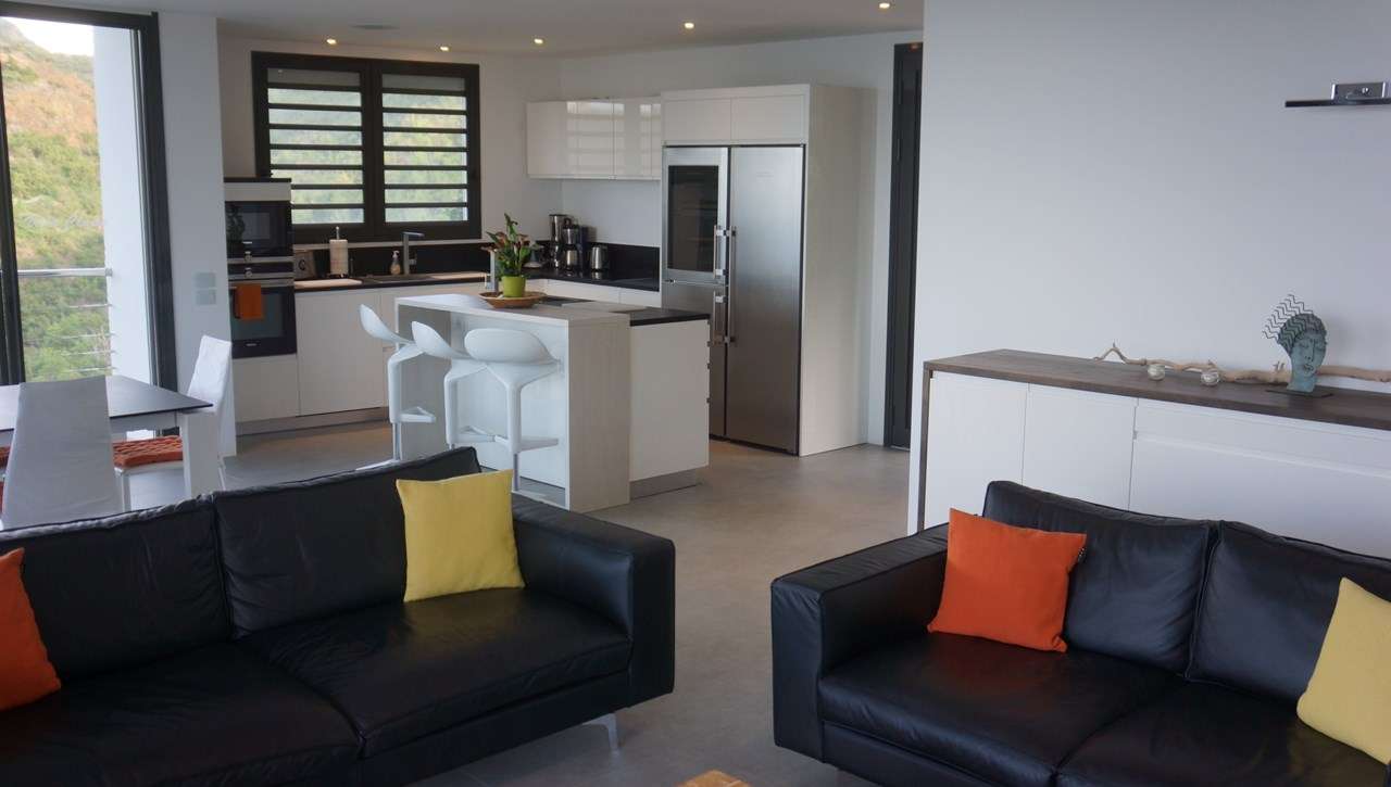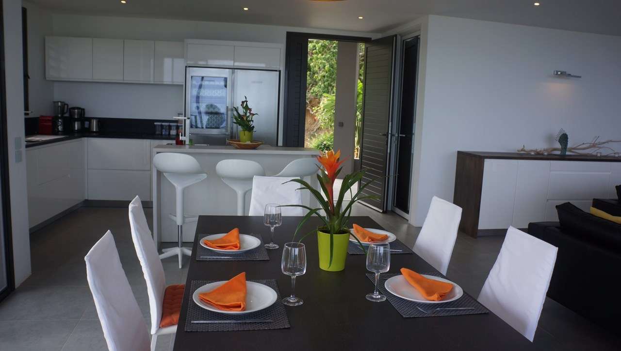 The modern interiors of Villa Claire are laid-back and cool, offering the simple luxuries necessary for a relaxing stay in St. Barts. The main room combines the living area, dining table, and kitchen.