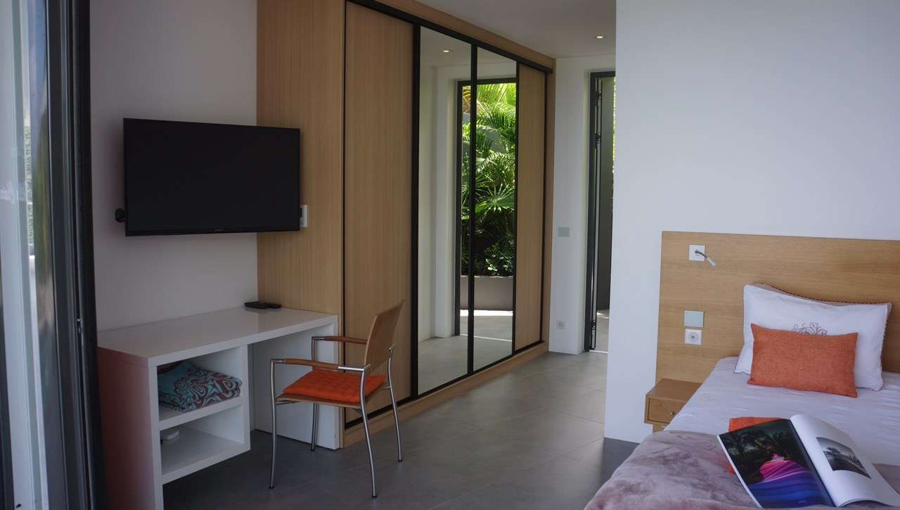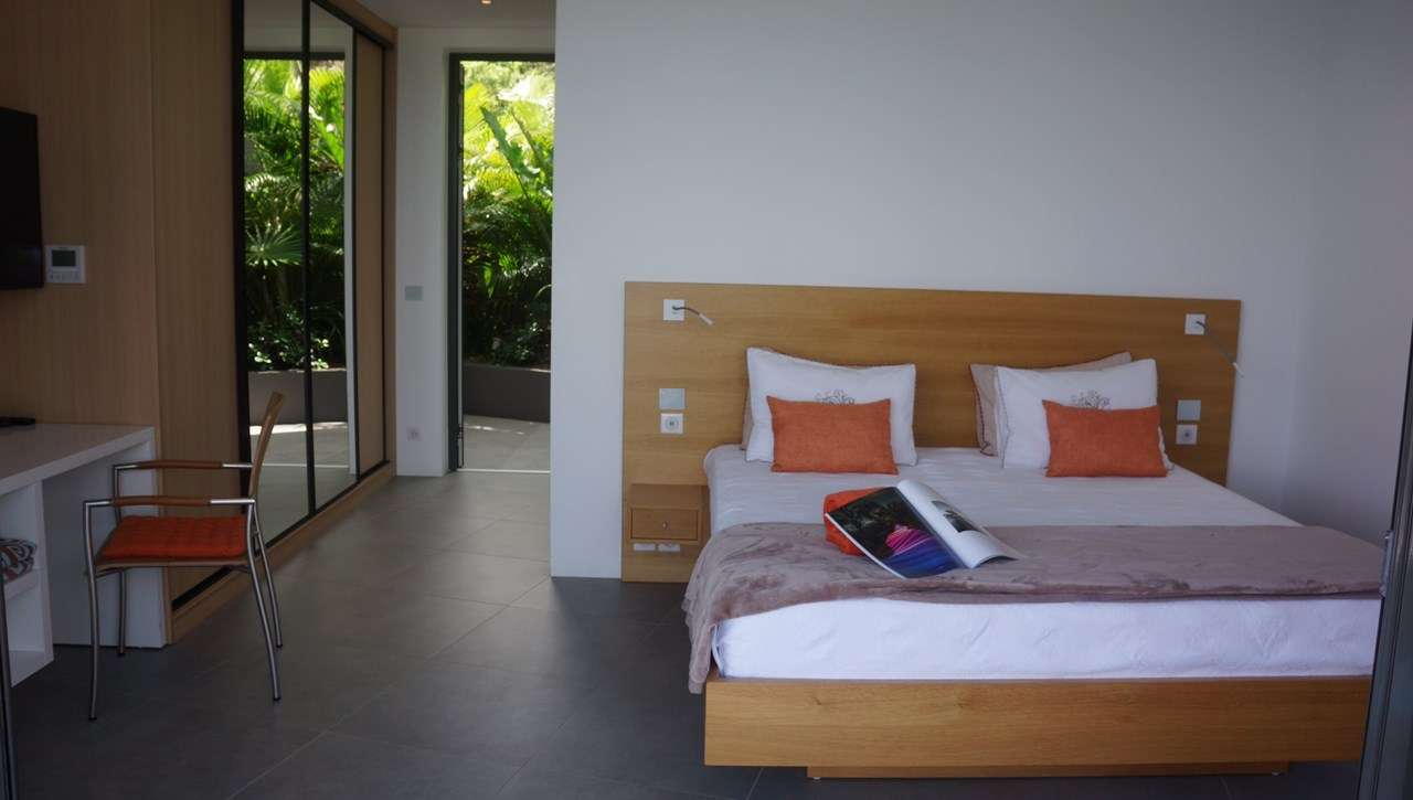 In the living room, a pair of sleek black sofas provide a wonderful spot to unwind, letting the relaxing pace of St. Barts slip over you. Behind, floor-to-ceiling windows open to the view, inviting in the cooling sea breezes at all times of the day.