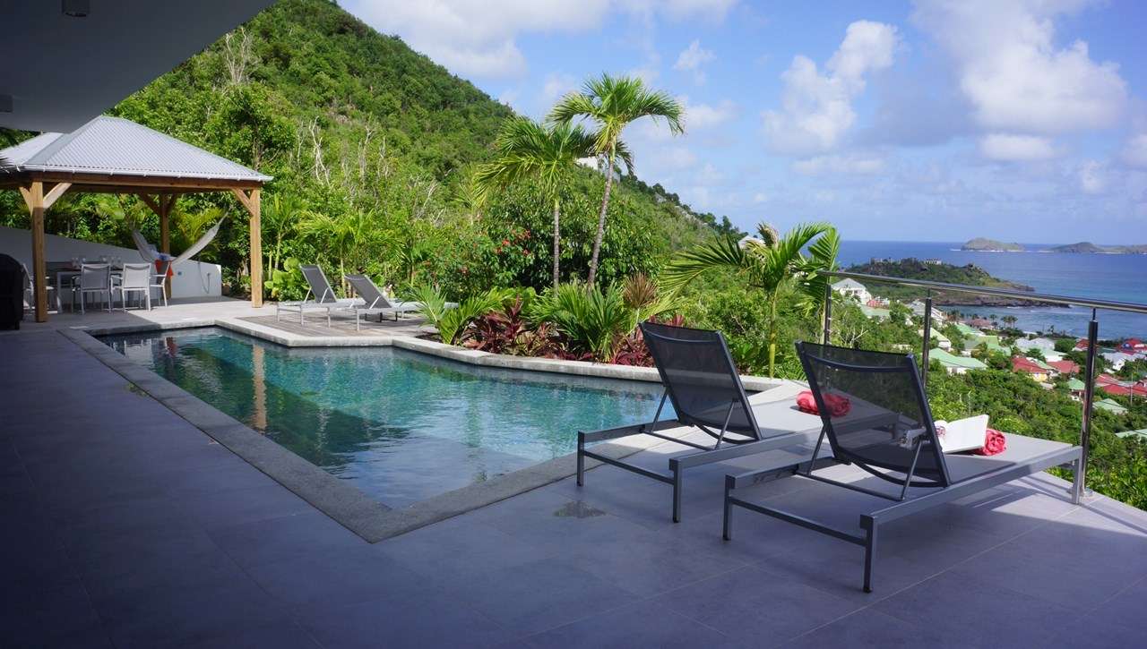 A terrace with several sitting areas wraps around the exterior of Villa Claire, coaxing you outside to enjoy extraordinary views over Lorient. Verdant green hills and crystalline Caribbean waters make this a dreamy place to spend a day chilling out, sipping on a cool drink, sunbathing, or enjoying quality time with family and friends.