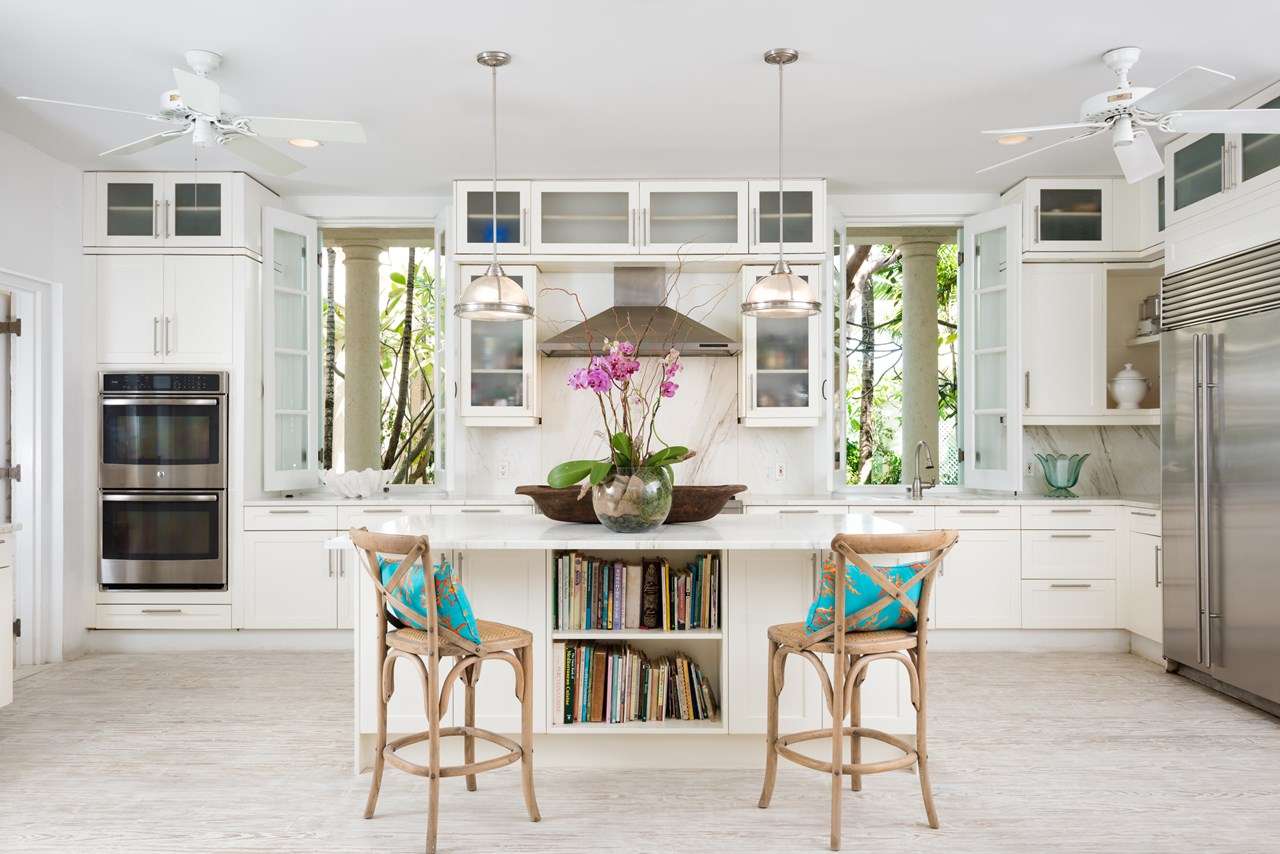 Freshly renovated living spaces are comfortable, lavish, and relaxing. White-washed walls reflect a bounty of natural light flowing in through French doors and shuttered windows. Splashes of colorful artwork, cushions, and decor help bring each space to life.