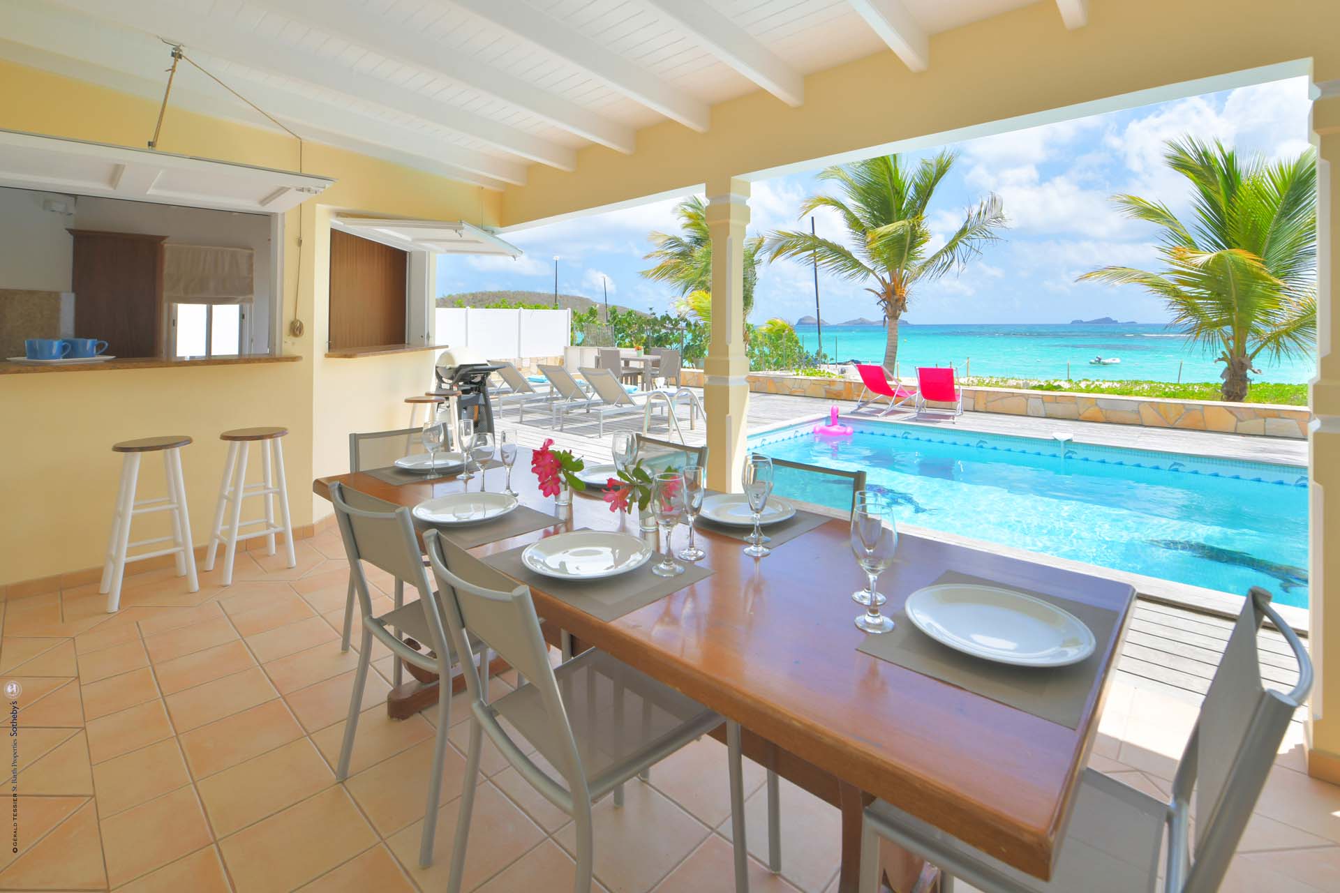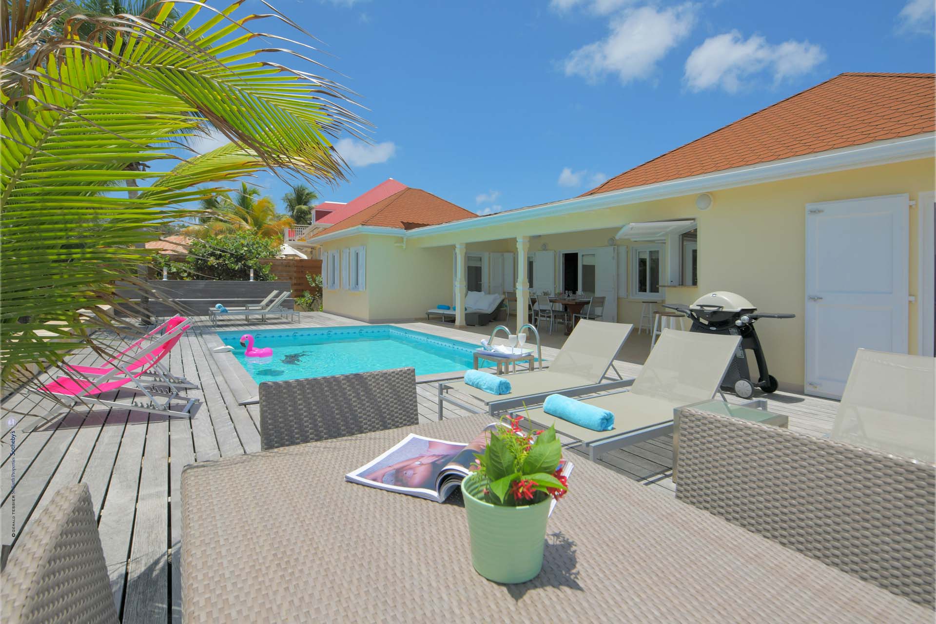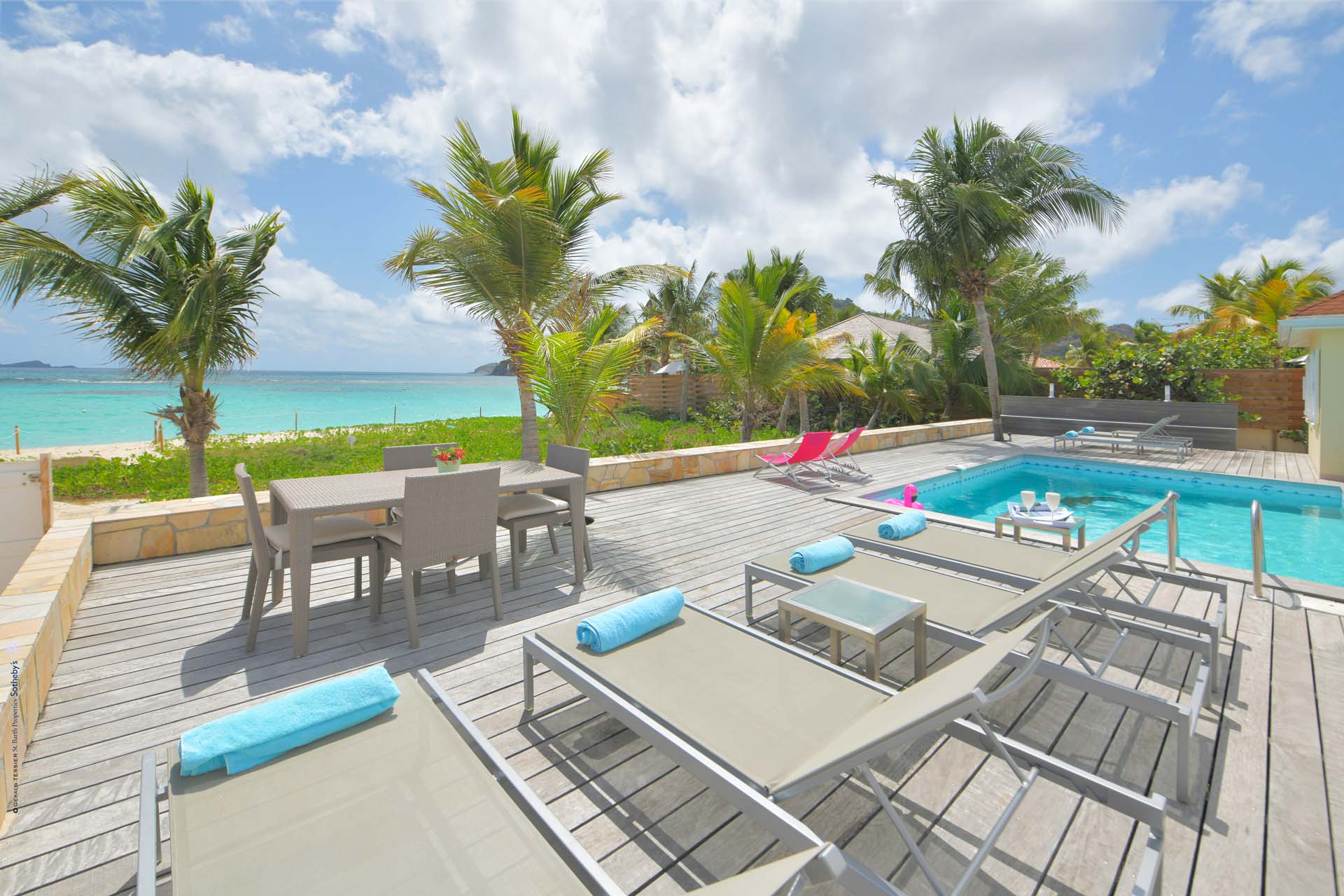 Barefoot, cottage-y casual Villa Crystal Dream sits right on sexy St. Jean Beach. It’s a beach-lovers fantasy come true. An air- conditioned comfortable living room sits adjacent to an open air compact kitchen, facing a spacious deck with a covered area for dining and relaxing. The kitchen has a pass-through that does double-duty as a pool bar. Guests can float toes up in the delightful pool or have their toes in that warm blue water in seconds. No flip-flops needed. A typical day includes an early morning run on the beach, followed by a swim, coffee, and French pastries, and then settling in on a poolside chaise to read, gaze, or people-watch, libation in hand. Care to eat in? A latticed area on the deck has a BBQ, Plancha, and a sink takes care of that. There are three (king) bedrooms and two full baths. The St. Jean location means proximity to Lil' Rock Beach restaurant and bar next door, Pearl Beach restaurant a few steps down the beach, as well as the village’s restaurants and boutiques. Crystal Dream is the ideal villa for those who want to be on the beach and in the middle of “the action”.Please fill out the form to begin your inquiry and we will connect you with a seasoned villa rental specialist.