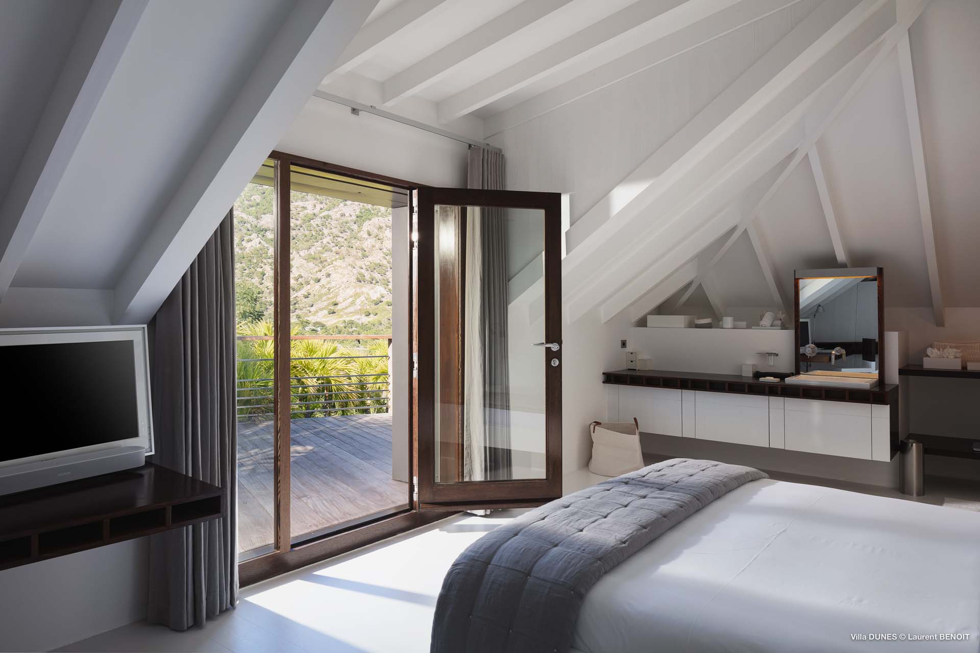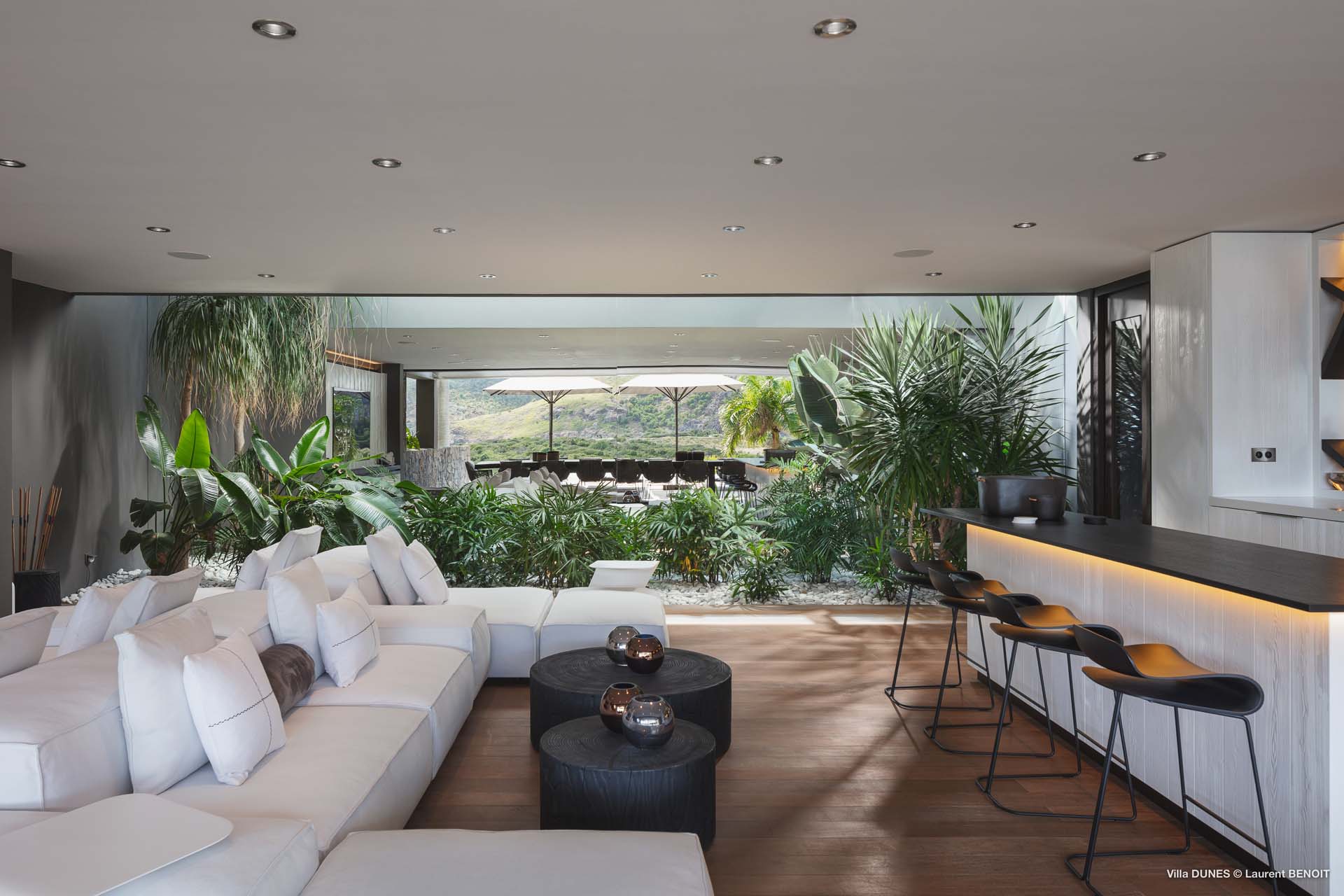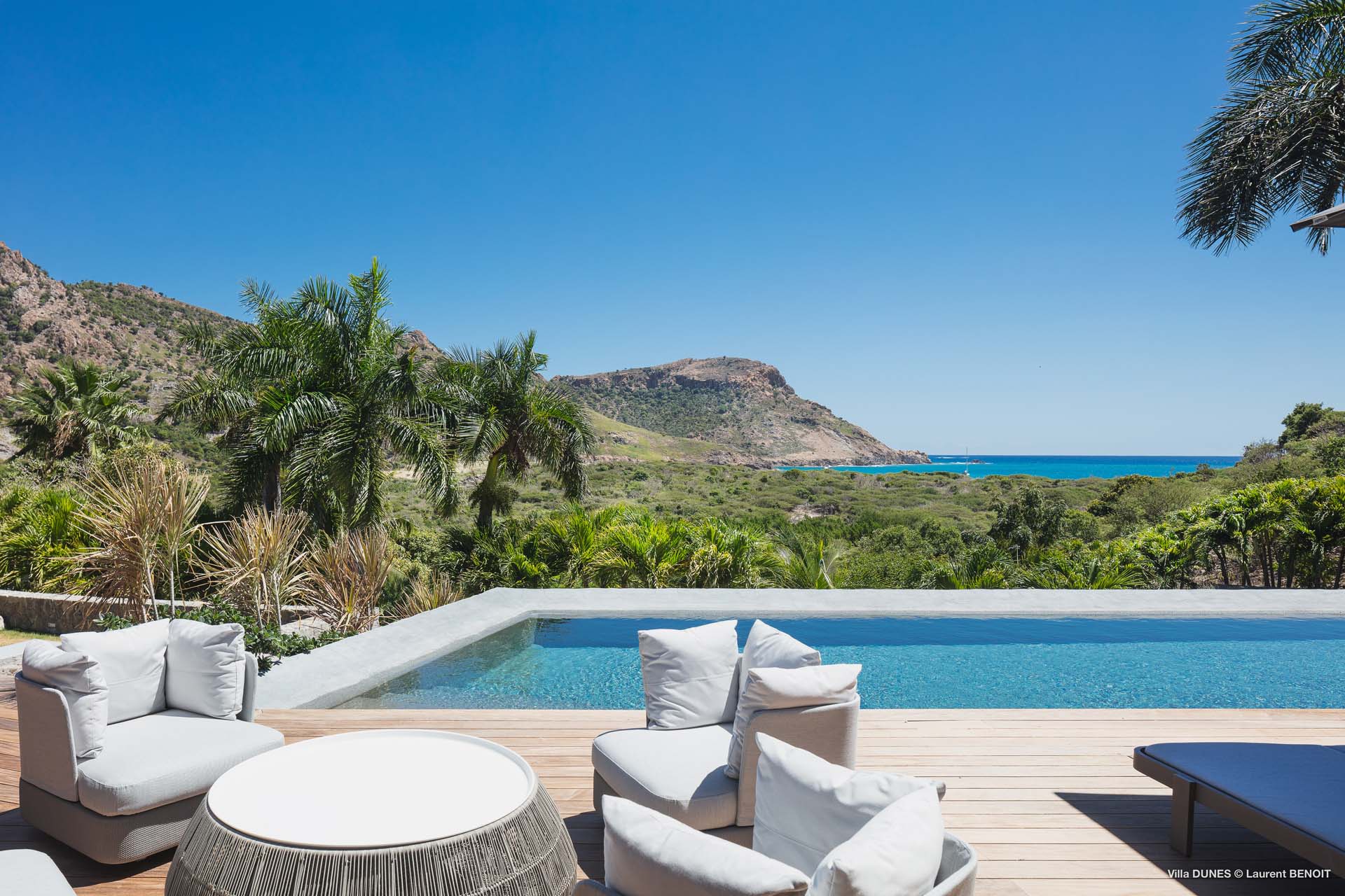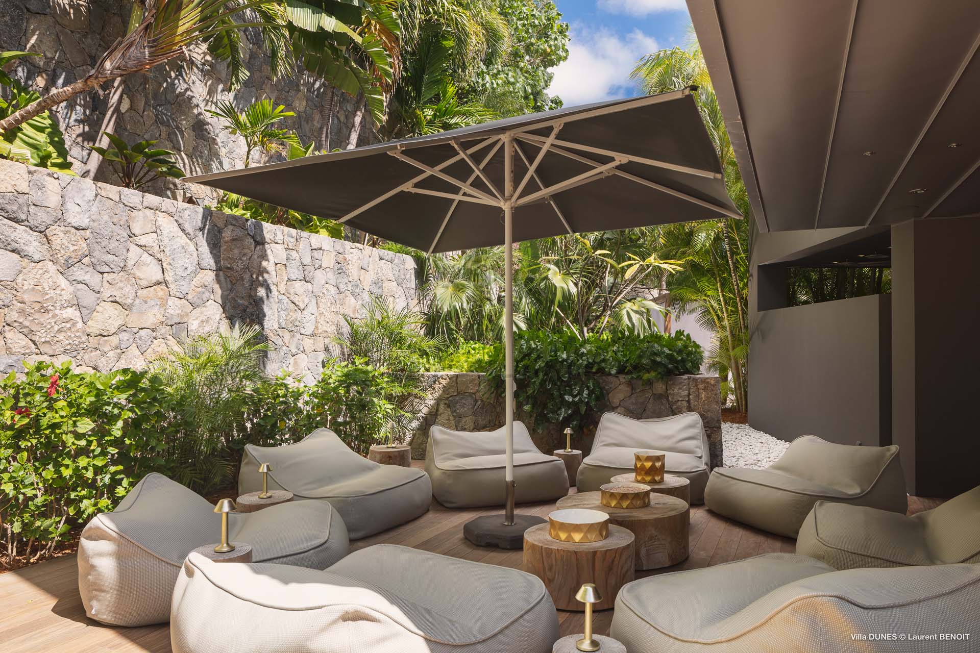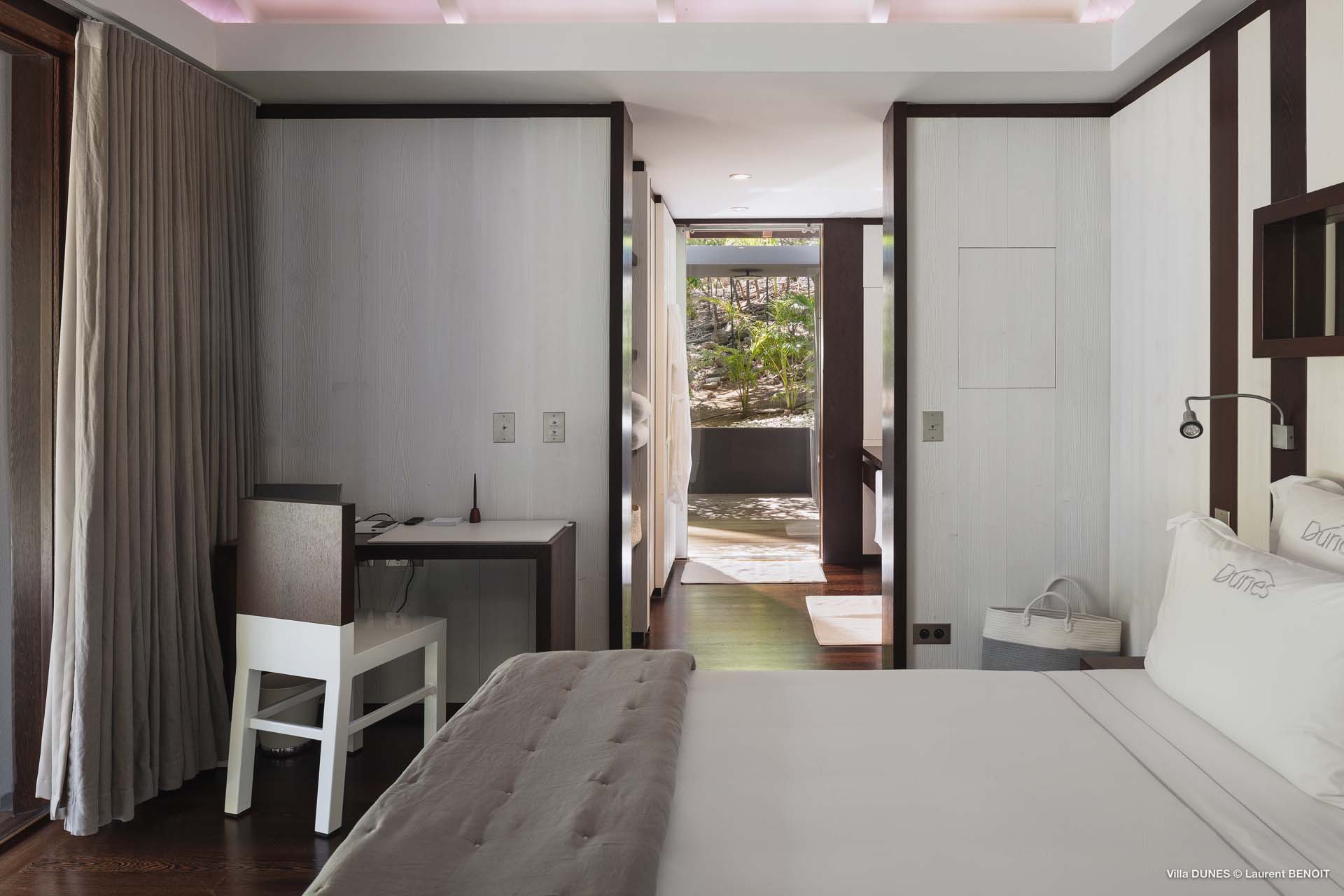 Outdoors, Villa Dunes truly shines. Two heated lap pools are surrounded by sun loungers, wooden and grass decks, and lush tropical gardens. An inner courtyard with casual beanbag seating, a massage area, and verdant bougainvillea-filled landscapes complete the experience. A short walk leads to the soft sands of Saline Beach, one of St. Barts’ most pristine and secluded shores.