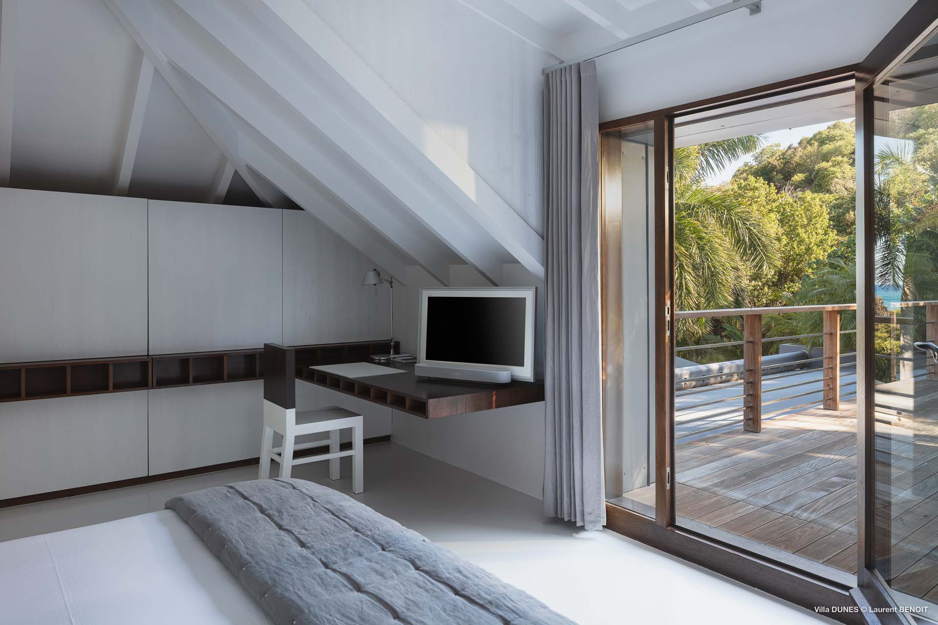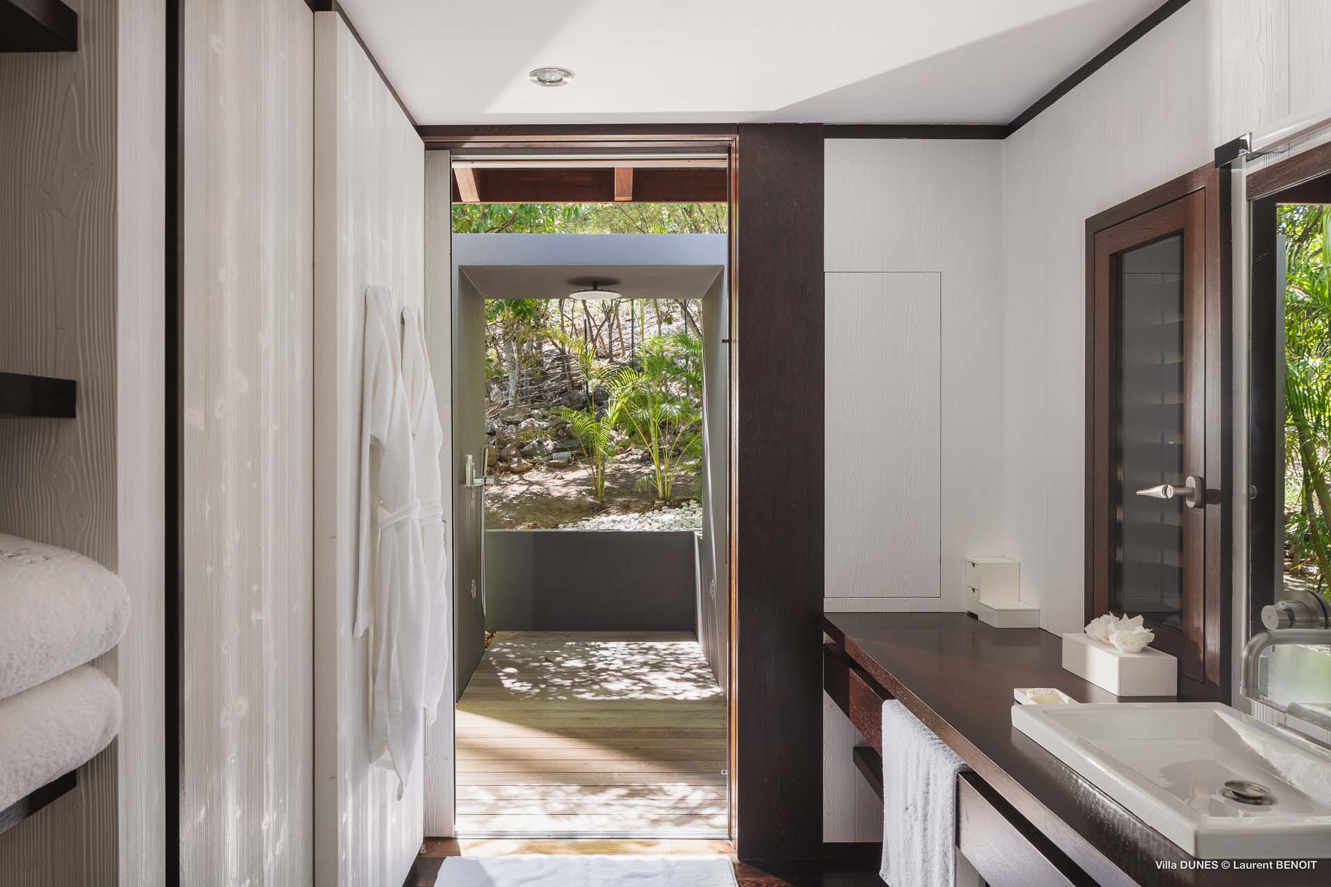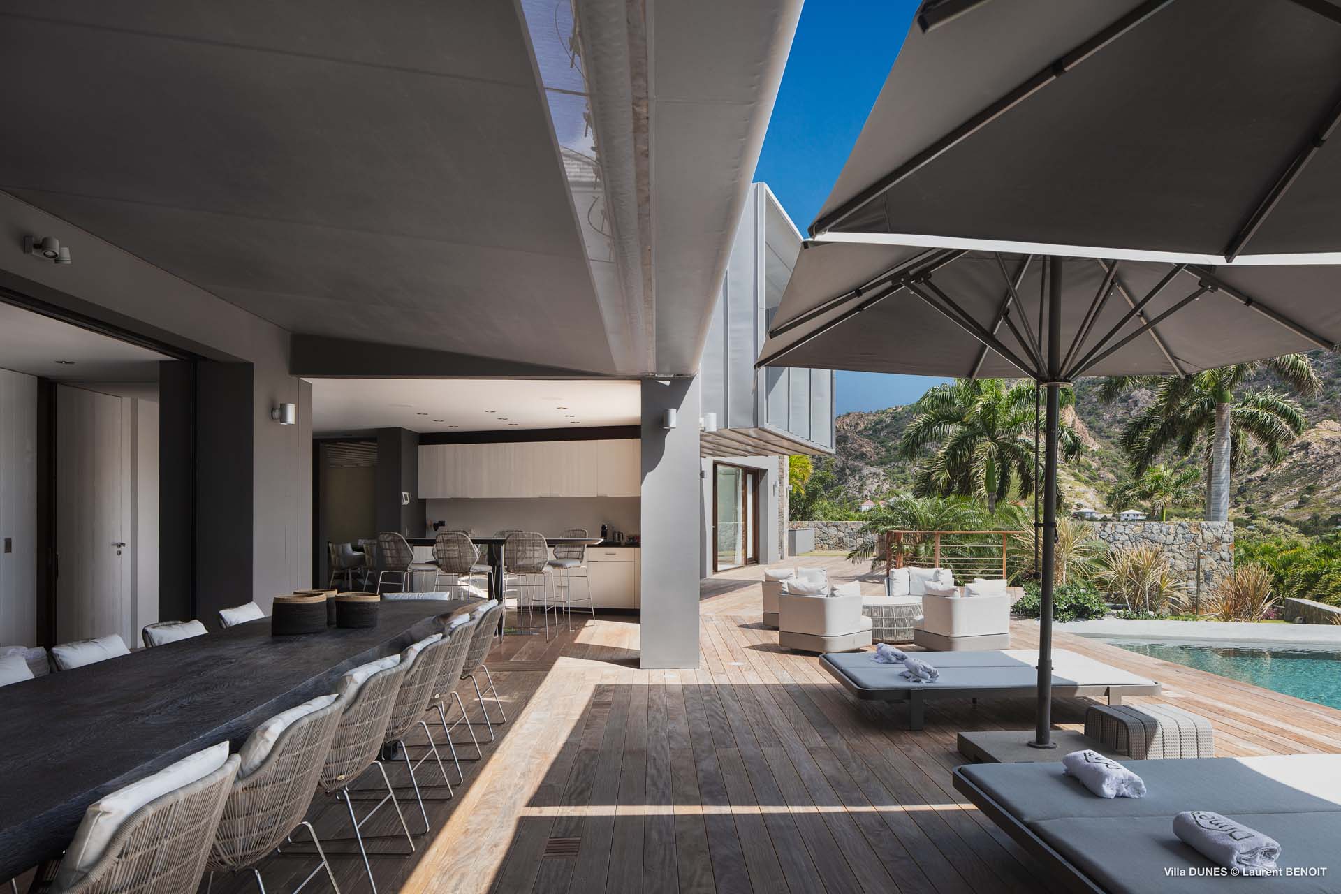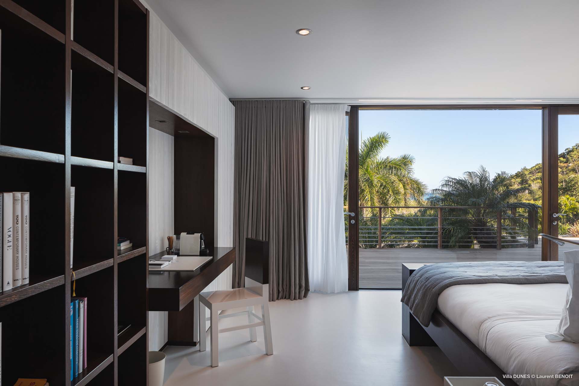 Outdoors, Villa Dunes truly shines. Two heated lap pools are surrounded by sun loungers, wooden and grass decks, and lush tropical gardens. An inner courtyard with casual beanbag seating, a massage area, and verdant bougainvillea-filled landscapes complete the experience. A short walk leads to the soft sands of Saline Beach, one of St. Barts’ most pristine and secluded shores.