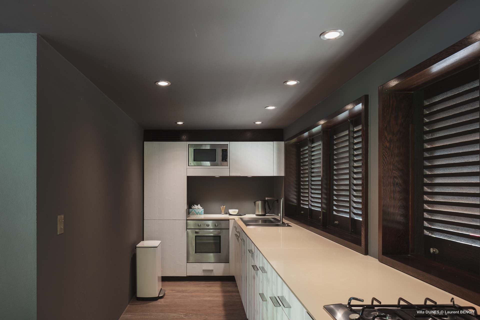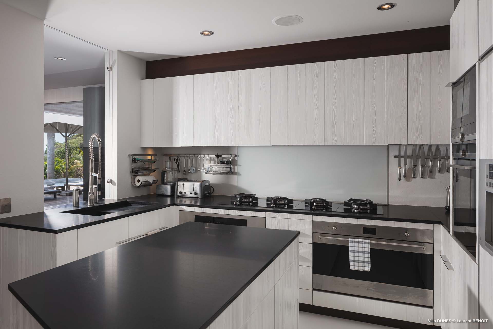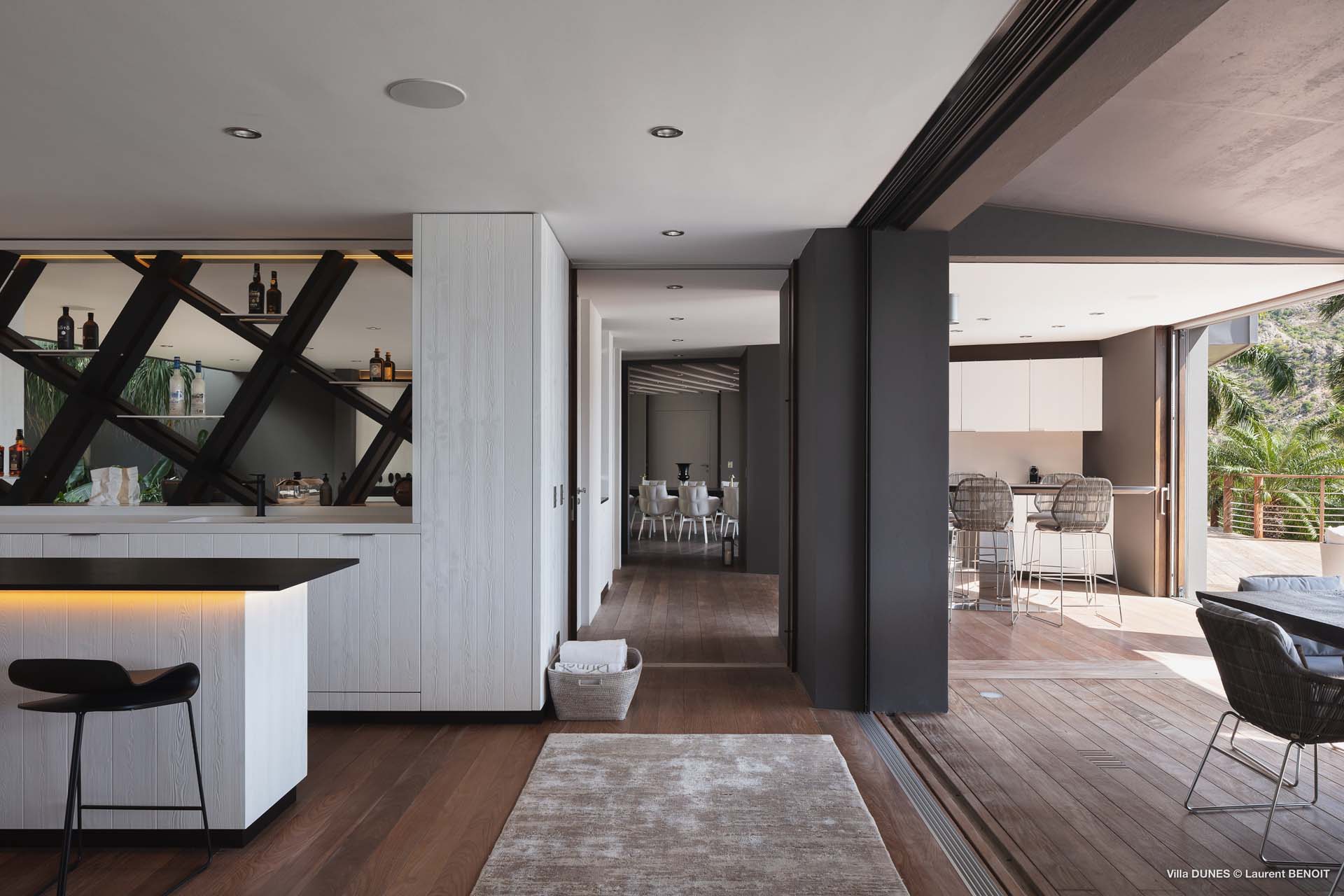 Spanning 16,000 sq. ft. of living and outdoor spaces, Villa Dunes blends sleek, contemporary interiors with plush, inviting furnishings. The main residence features expansive living areas, two kitchens (including one designed for a private chef), and a dining room seating 12, all opening seamlessly onto terraces with breathtaking ocean vistas.