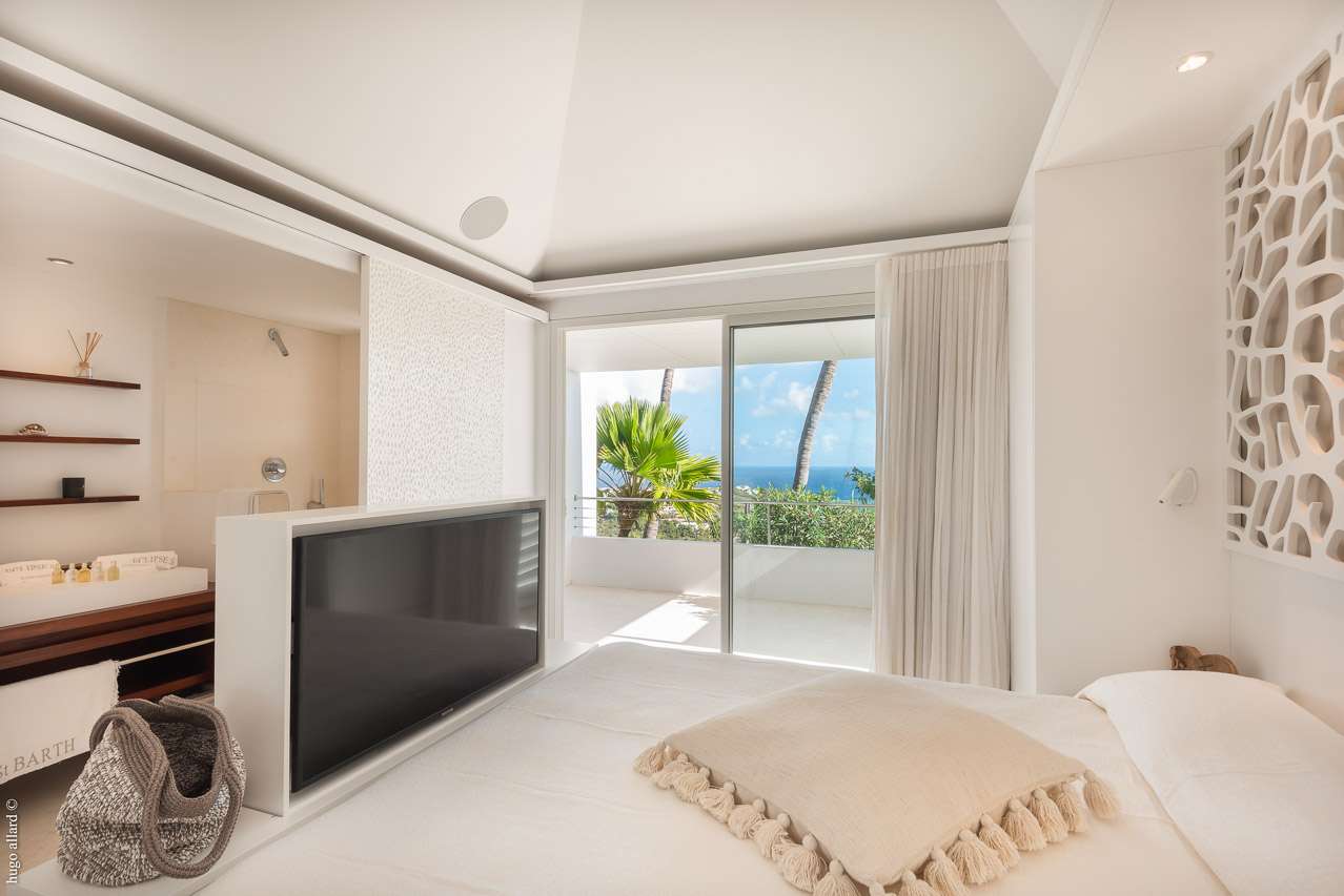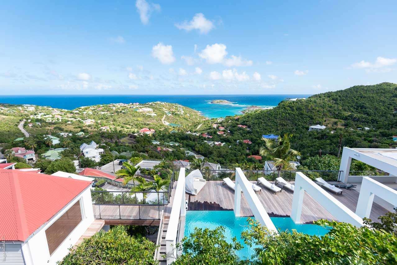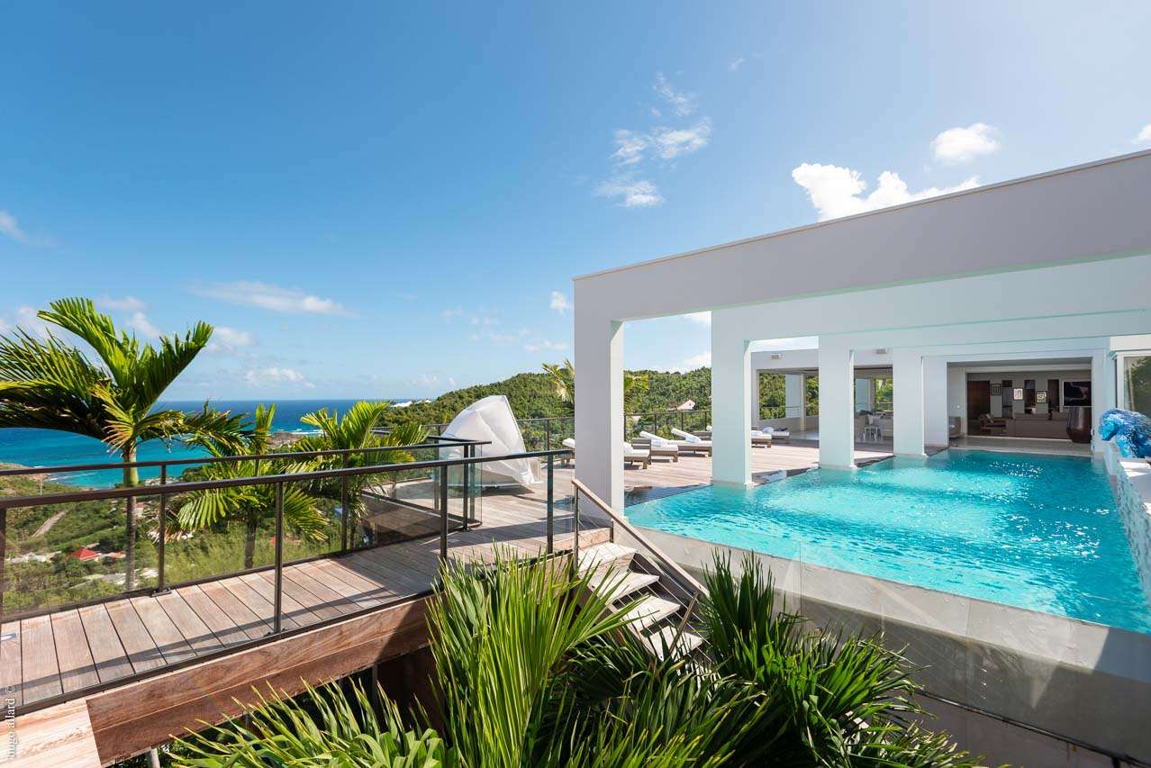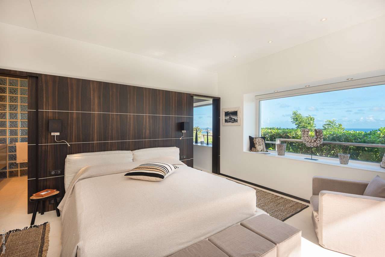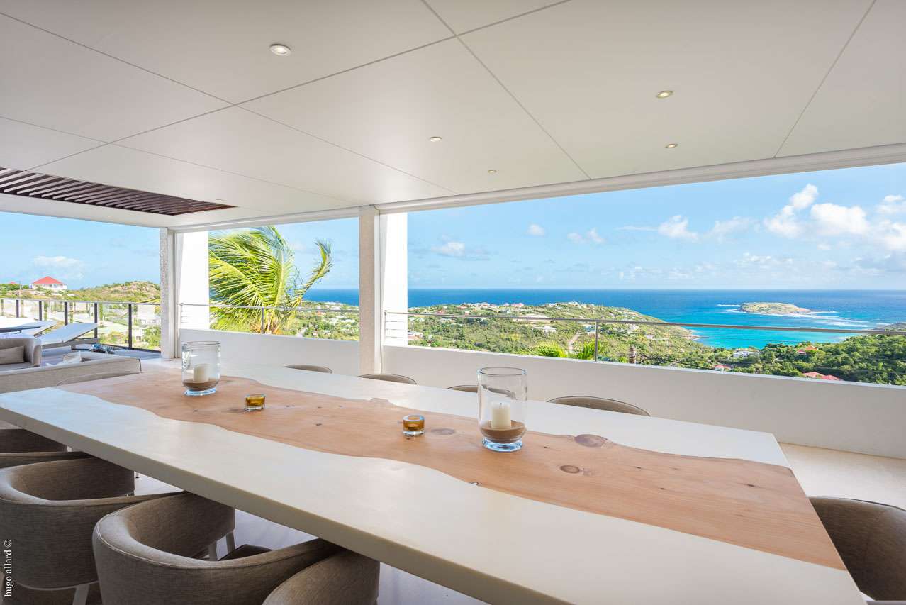 Welcome to Villa Eclipse (villa code: WV ECL), an impeccable 6-bedroom villa in Camaruche, St. Barts. This serene villa enjoys sprawling views over the countryside and ocean a short drive from the beach and shops. Clear-cut straight lines and angles in Villa Eclipse’s design make a strong impression, as does the use of natural materials on the inside. The style is a harmonious mix of traditional island style with contemporary updates, with warm earthy tones and several different shades of wood. With a perch above the bay of St. Jean, the ocean views from Villa Eclipse are incredible. A short drive down the hill brings you to the shops, restaurants, and the stunning beach at St. Jean. More drinking and dining options are in Gustavia, a short 10-minute drive away. The entrance into Villa Eclipse brings you into the courtyard, an alfresco space that opens into the main great room of the property. Bright, airy, and open on several sides, you’ll love the island breeze washing through the combined living room, dining area, and kitchen. Large, elegant beige sofas provide comfort and style to the living room. It’s a great spot to relax and unwind, gazing out at the ocean views with a drink in hand or settling in for a lazy afternoon nap. A large wall-mounted TV also lets you kick back with a movie or two. Nearby, the high-end kitchen at Villa Eclipse makes cooking a breeze. Beautiful wooden cabinetry contrasts with the stainless-steel appliances, creating a stylish and elegant feel to the space. For a night off, our concierge is happy to arrange a private chef for an evening. The open plan design then flows into the large dining room, a beautiful space that’s open to the view. The large table is an idyllic setting for meals with family and friends, enjoying some good conversation and a bottle of wine while the evening descends across the island. There are 6 spacious bedrooms inside Villa Eclipse, peaceful spaces with a minimalist style. Wooden accents in the furnishings continue the island atmosphere in the home. The master bedroom is off the pool and features elegant dark wooden floors, a sitting area, a dressing room, and a very large bathroom. Two more bedrooms are at the villa’s courtyard entrance, identical in style and décor except in color scheme. Both rooms have sliding glass doors that lead onto the terrace with views. The fourth bedroom is beyond the pool in a traditional St. Barth's "case”, with a mahogany four-poster king-sized bed and mosquito netting. A wooden stairway leads to another large bedroom on the lower level with a cactus garden. This spacious bedroom has its own sitting room and is adjoined by the well-equipped gym. The sixth bedroom is in an independent studio underneath the main villa and has its own sitting room, ensuite bathroom, and two twin beds that can be pushed together for a Euro king. The incredible views over the rolling hills of St. Barts, the sparkling Caribbean, and offshore islands will draw your gaze at every turn. Those views are magnified from the outdoor terrace, an expansive area that wraps around the entirety of Villa Eclipse. Covered areas blend with indoor living spaces, offering even more lounge space and shady areas for relaxing. At the heart of the outdoor terrace is the large swimming pool, featuring striking arches built over the water that creates small areas of shade in the water as well. Loungers are scattered across the terrace for sunbathing.Please fill out the form to begin your inquiry and we will connect you with a seasoned villa rental specialist.