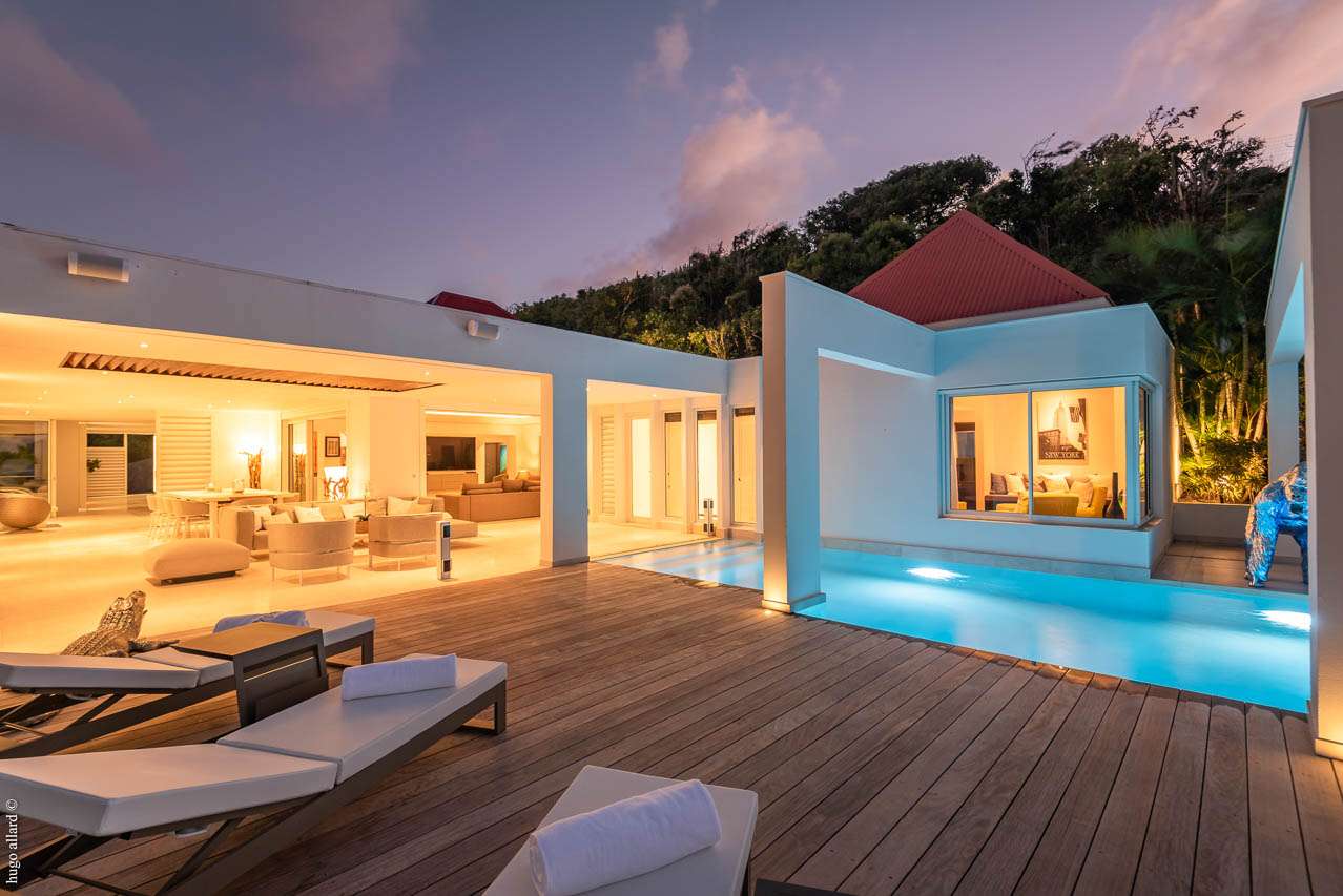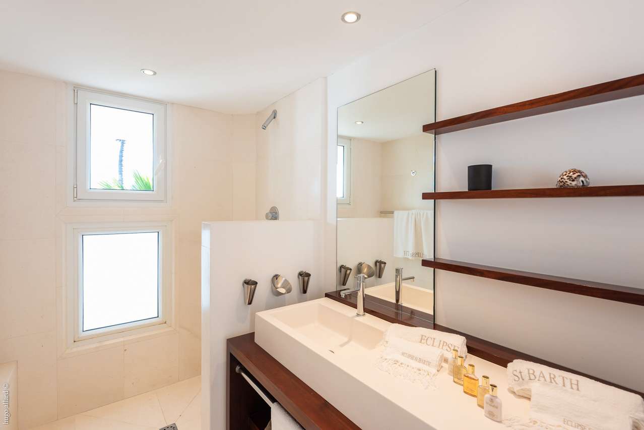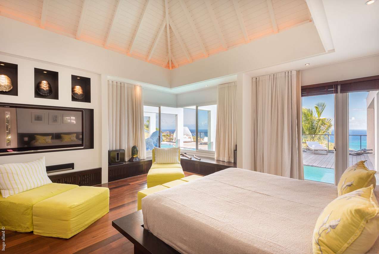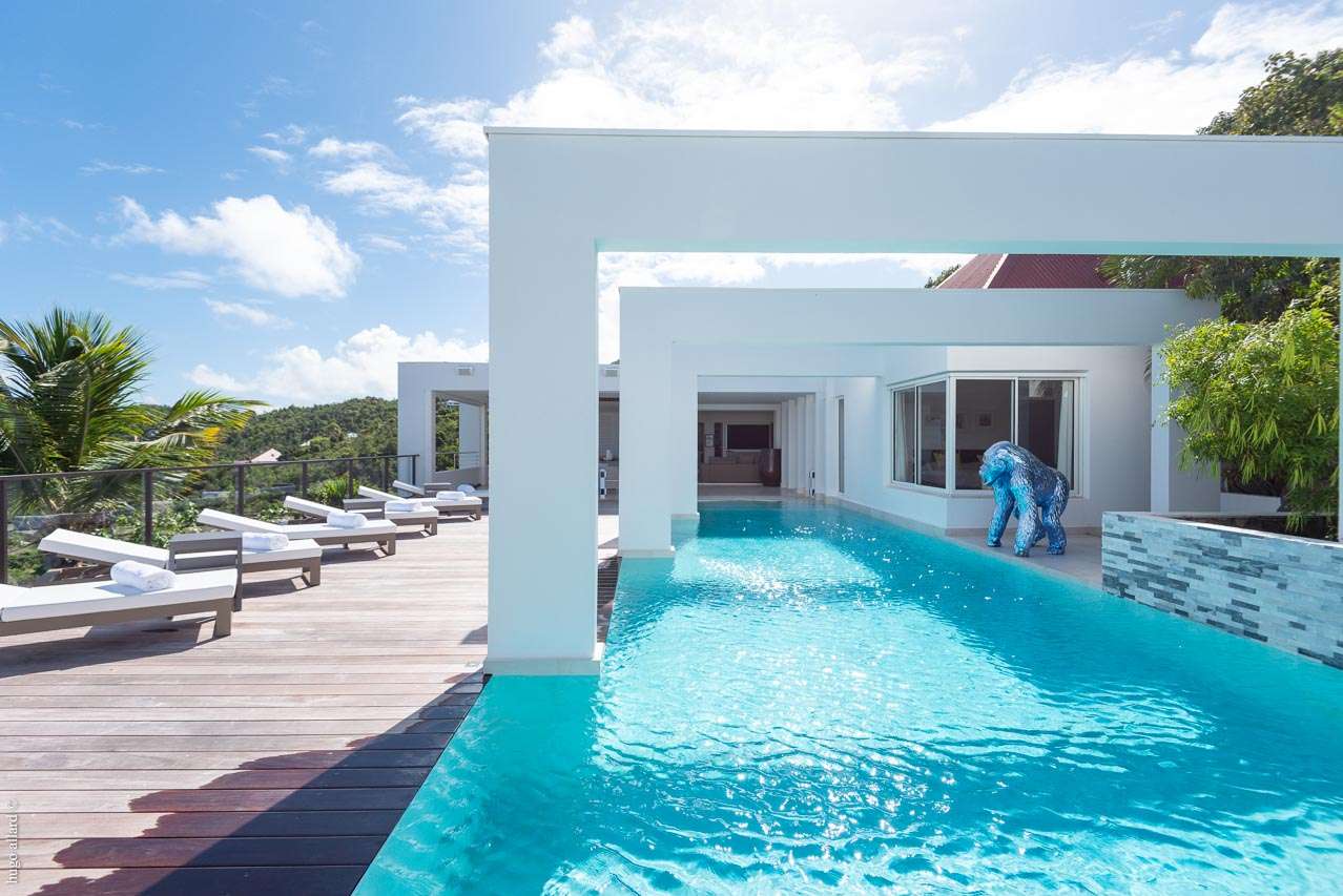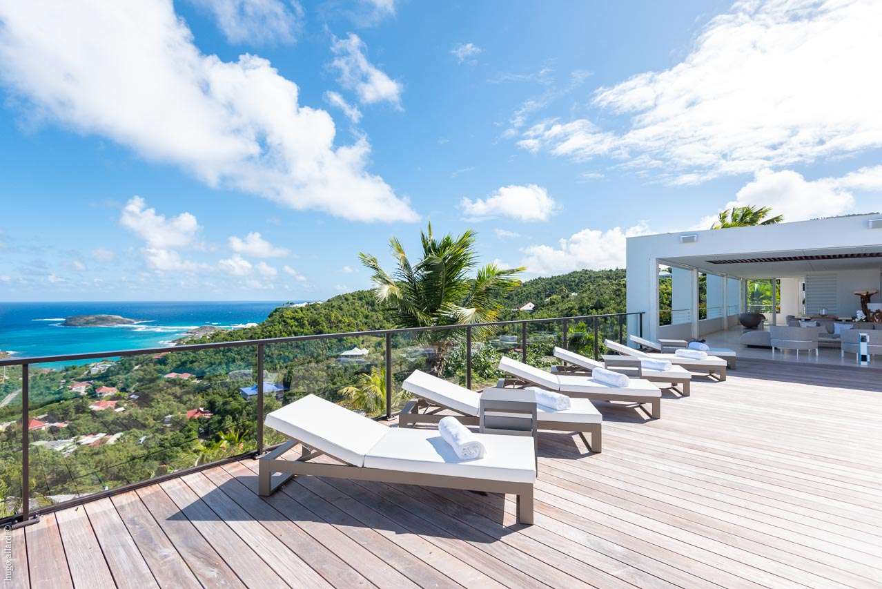 Welcome to Villa Eclipse (villa code: WV ECL), an impeccable 6-bedroom villa in Camaruche, St. Barts. This serene villa enjoys sprawling views over the countryside and ocean a short drive from the beach and shops. Clear-cut straight lines and angles in Villa Eclipse’s design make a strong impression, as does the use of natural materials on the inside. The style is a harmonious mix of traditional island style with contemporary updates, with warm earthy tones and several different shades of wood. With a perch above the bay of St. Jean, the ocean views from Villa Eclipse are incredible. A short drive down the hill brings you to the shops, restaurants, and the stunning beach at St. Jean. More drinking and dining options are in Gustavia, a short 10-minute drive away. The entrance into Villa Eclipse brings you into the courtyard, an alfresco space that opens into the main great room of the property. Bright, airy, and open on several sides, you’ll love the island breeze washing through the combined living room, dining area, and kitchen. Large, elegant beige sofas provide comfort and style to the living room. It’s a great spot to relax and unwind, gazing out at the ocean views with a drink in hand or settling in for a lazy afternoon nap. A large wall-mounted TV also lets you kick back with a movie or two. Nearby, the high-end kitchen at Villa Eclipse makes cooking a breeze. Beautiful wooden cabinetry contrasts with the stainless-steel appliances, creating a stylish and elegant feel to the space. For a night off, our concierge is happy to arrange a private chef for an evening. The open plan design then flows into the large dining room, a beautiful space that’s open to the view. The large table is an idyllic setting for meals with family and friends, enjoying some good conversation and a bottle of wine while the evening descends across the island. There are 6 spacious bedrooms inside Villa Eclipse, peaceful spaces with a minimalist style. Wooden accents in the furnishings continue the island atmosphere in the home. The master bedroom is off the pool and features elegant dark wooden floors, a sitting area, a dressing room, and a very large bathroom. Two more bedrooms are at the villa’s courtyard entrance, identical in style and décor except in color scheme. Both rooms have sliding glass doors that lead onto the terrace with views. The fourth bedroom is beyond the pool in a traditional St. Barth's "case”, with a mahogany four-poster king-sized bed and mosquito netting. A wooden stairway leads to another large bedroom on the lower level with a cactus garden. This spacious bedroom has its own sitting room and is adjoined by the well-equipped gym. The sixth bedroom is in an independent studio underneath the main villa and has its own sitting room, ensuite bathroom, and two twin beds that can be pushed together for a Euro king. The incredible views over the rolling hills of St. Barts, the sparkling Caribbean, and offshore islands will draw your gaze at every turn. Those views are magnified from the outdoor terrace, an expansive area that wraps around the entirety of Villa Eclipse. Covered areas blend with indoor living spaces, offering even more lounge space and shady areas for relaxing. At the heart of the outdoor terrace is the large swimming pool, featuring striking arches built over the water that creates small areas of shade in the water as well. Loungers are scattered across the terrace for sunbathing.Please fill out the form to begin your inquiry and we will connect you with a seasoned villa rental specialist.