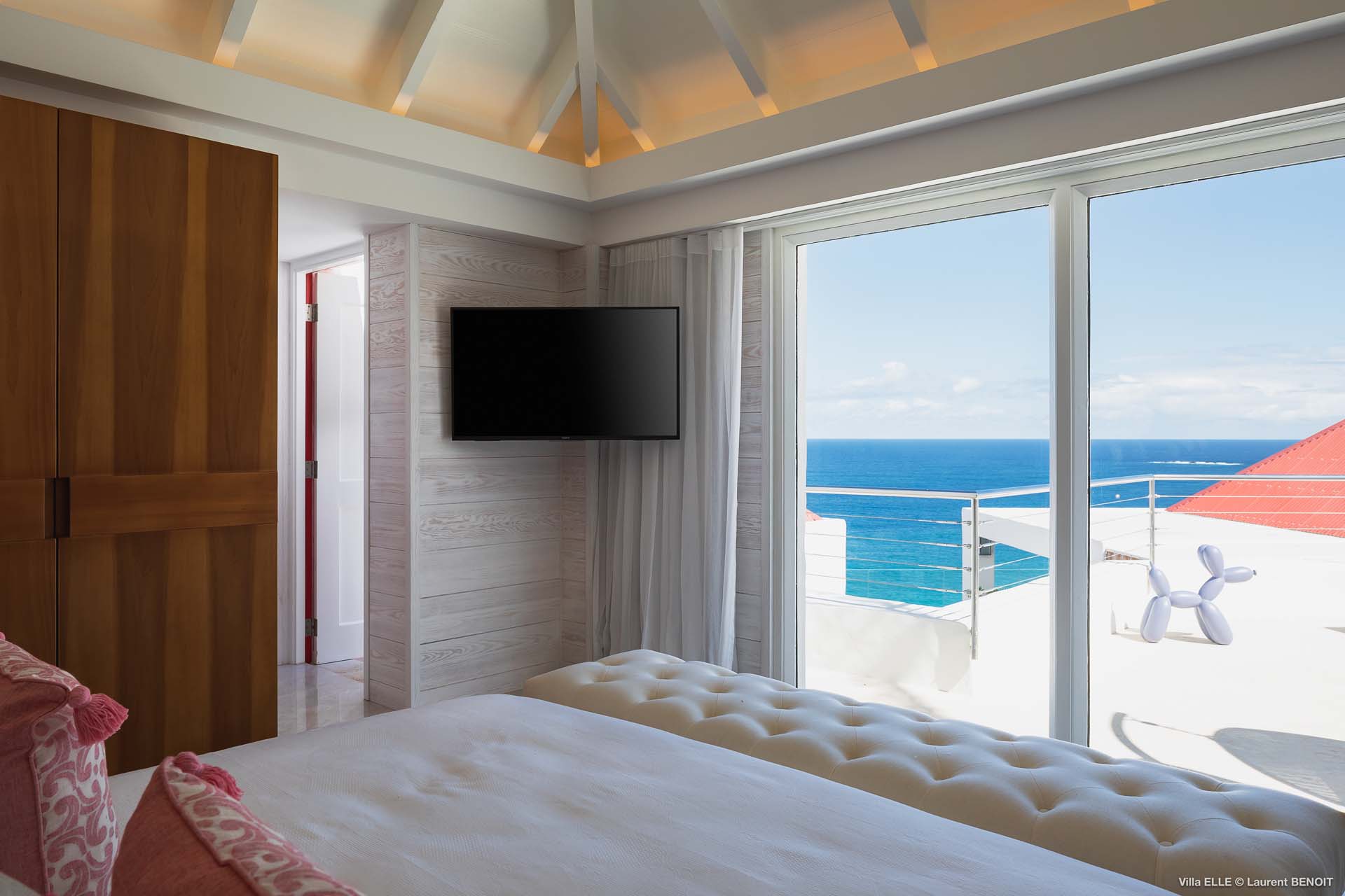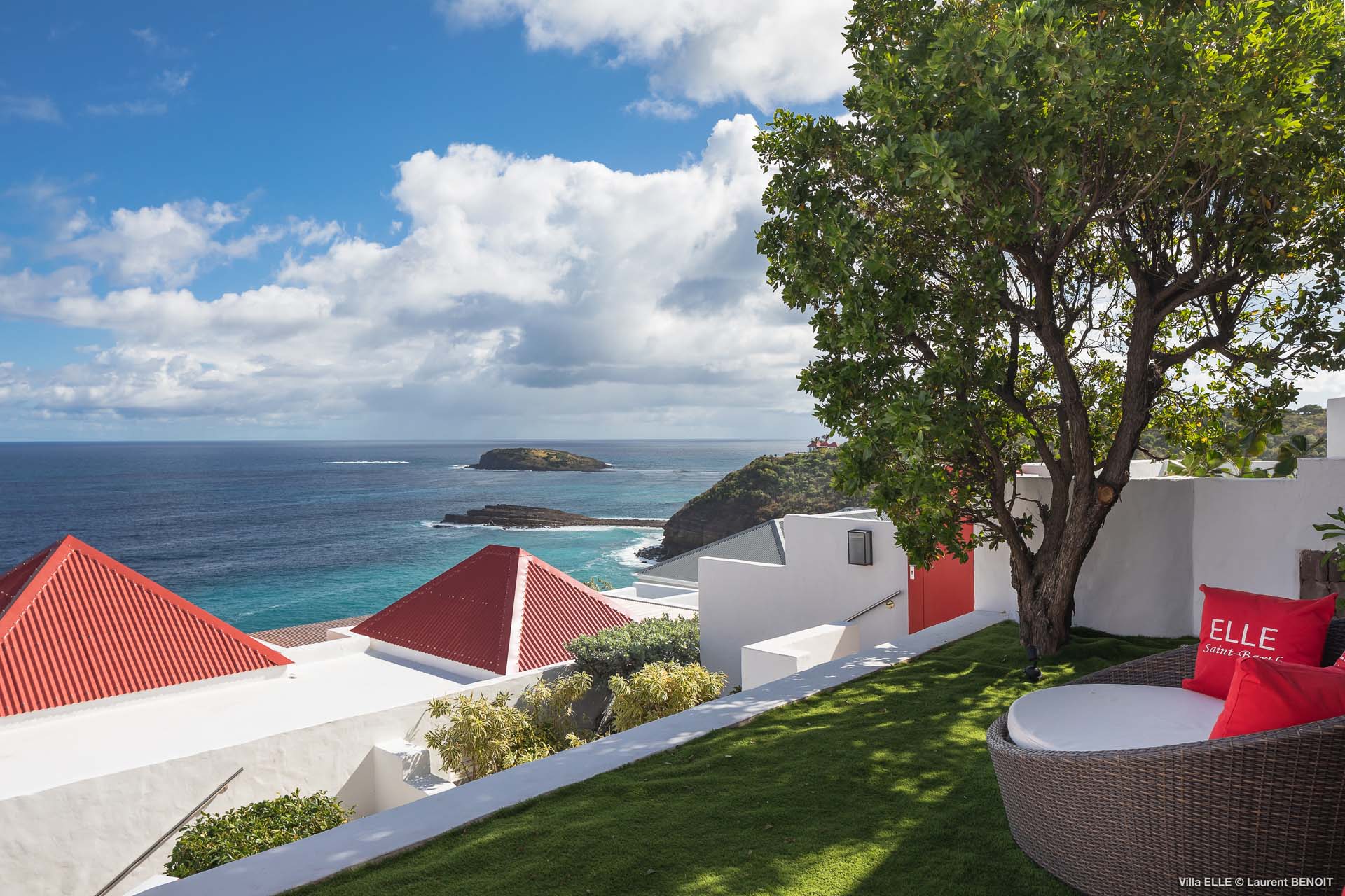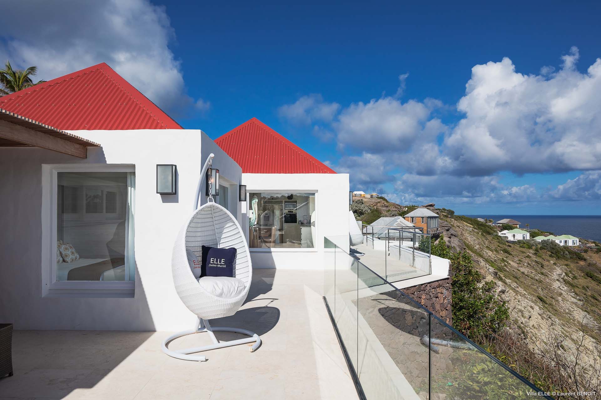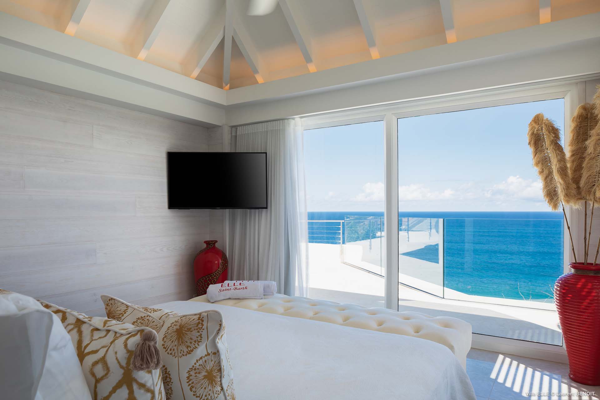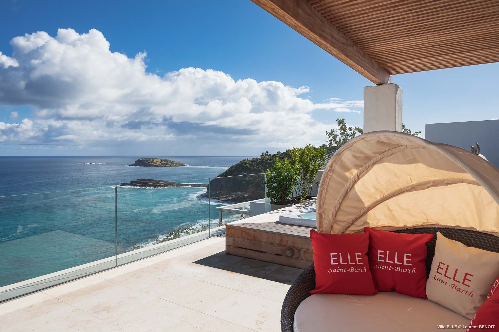 Villa Elle is a spacious, 4-bedroom villa situated in Pointe Milou with great amenities and incredible ocean views. Perched on the cliffs on the north eastern side of Pointe Milou, Villa Elle benefits from all day sun and truly stunning panoramic ocean views. The villa feels like a cocoon, a safe harbor, where guests can shut out the world and almost feel like being alone on a deserted island. Several seating areas are scattered around the property, both in shade and sun, with the main outdoor gathering space situated underneath a gazebo in between the kitchen and the living room, close to the heated pool. For some extra relaxation, or a late afternoon cocktail, a heated jacuzzi is located in the corner of the front terrace. The villa was designed to offer ample opportunity to spend time outside and enjoy the views, even on the windier days, thanks to the glass fencing. The kitchen is a large and bright space in a separate pavilion that can be fully air-conditioned, with the fully-equipped, gourmet kitchen on one side, and a dining area on the other. Across from the kitchen is the air-conditioned living room, with 3 comfortable sofas and a fully stocked entertainment center, and which connects with the well-equipped fitness. All bedrooms are equally equipped and offer gorgeous ocean views. On either side of the main level are two master bungalows, each has a spacious room with a European king-sized bed, U.S. and French satellite as well as Apple TV, his-and-hers closets, and an ensuite bathroom with shower and an outdoor shower. One level above is a third master bedroom and a slightly smaller room, which has the same amenities as all others: a European king-sized bed, U.S. and French satellite and Apple TV, his-and-hers closets, and ensuite bathroom with shower. Tucked in the back, in between the upper bedrooms, is a massage room with a heated table, and a full home theater. Villa Elle is a perfect family villa, but will also suit couples vacationing together.Please fill out the form to begin your inquiry and we will connect you with a seasoned villa rental specialist.