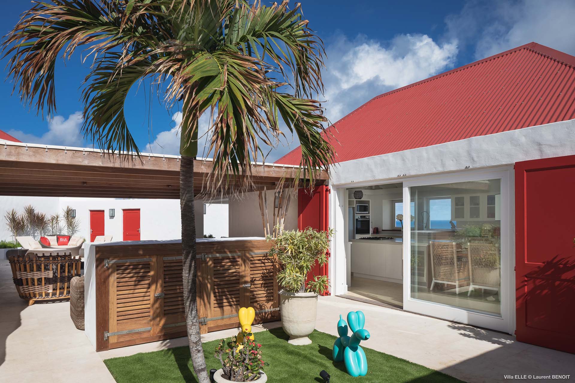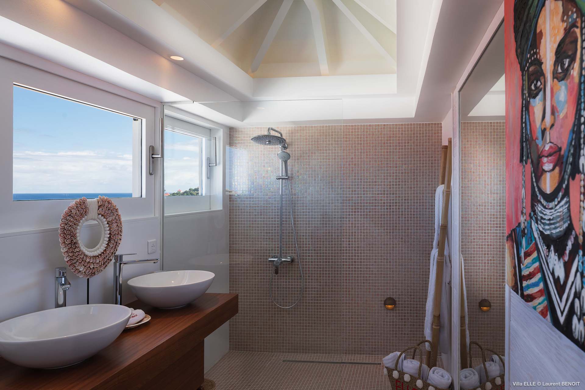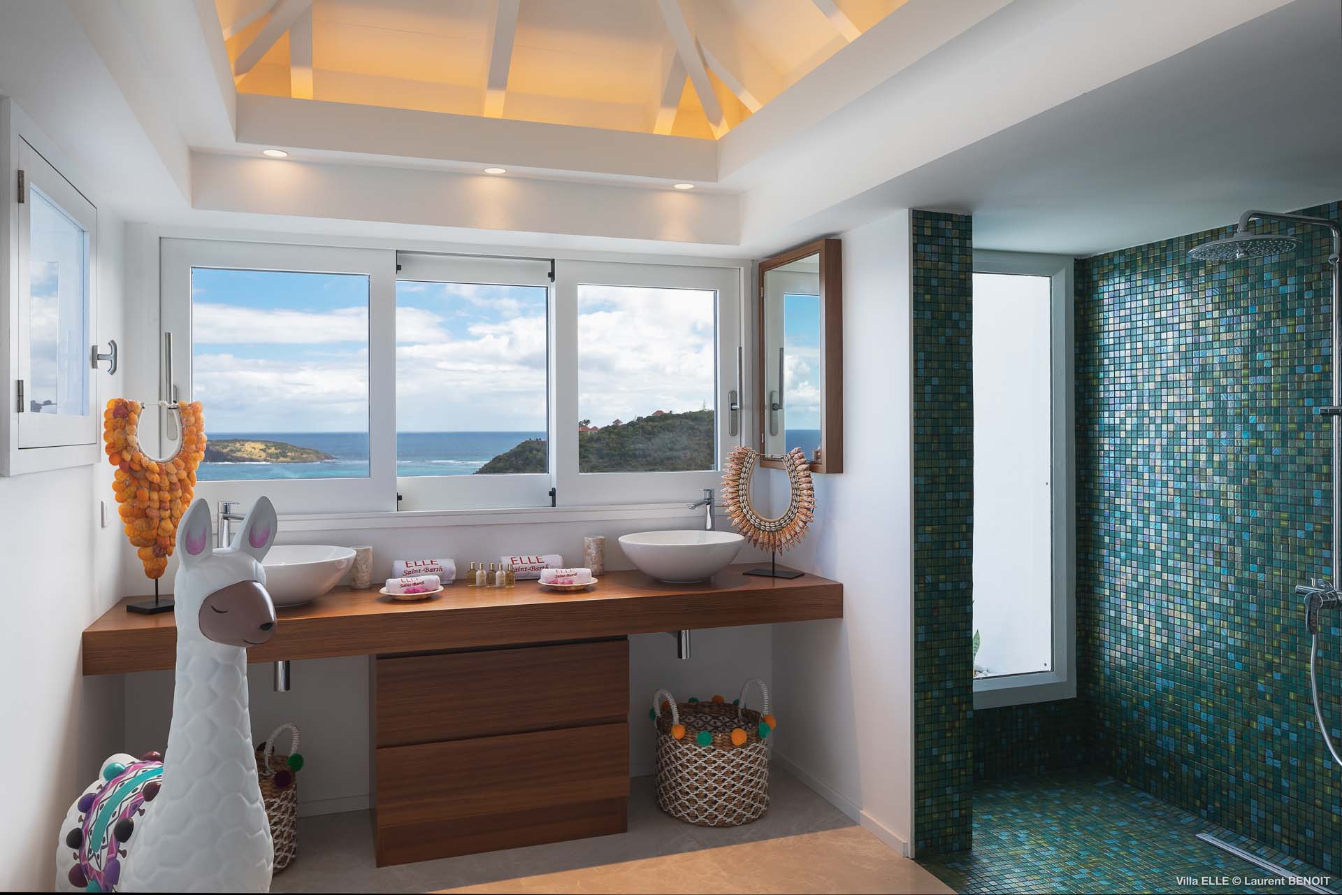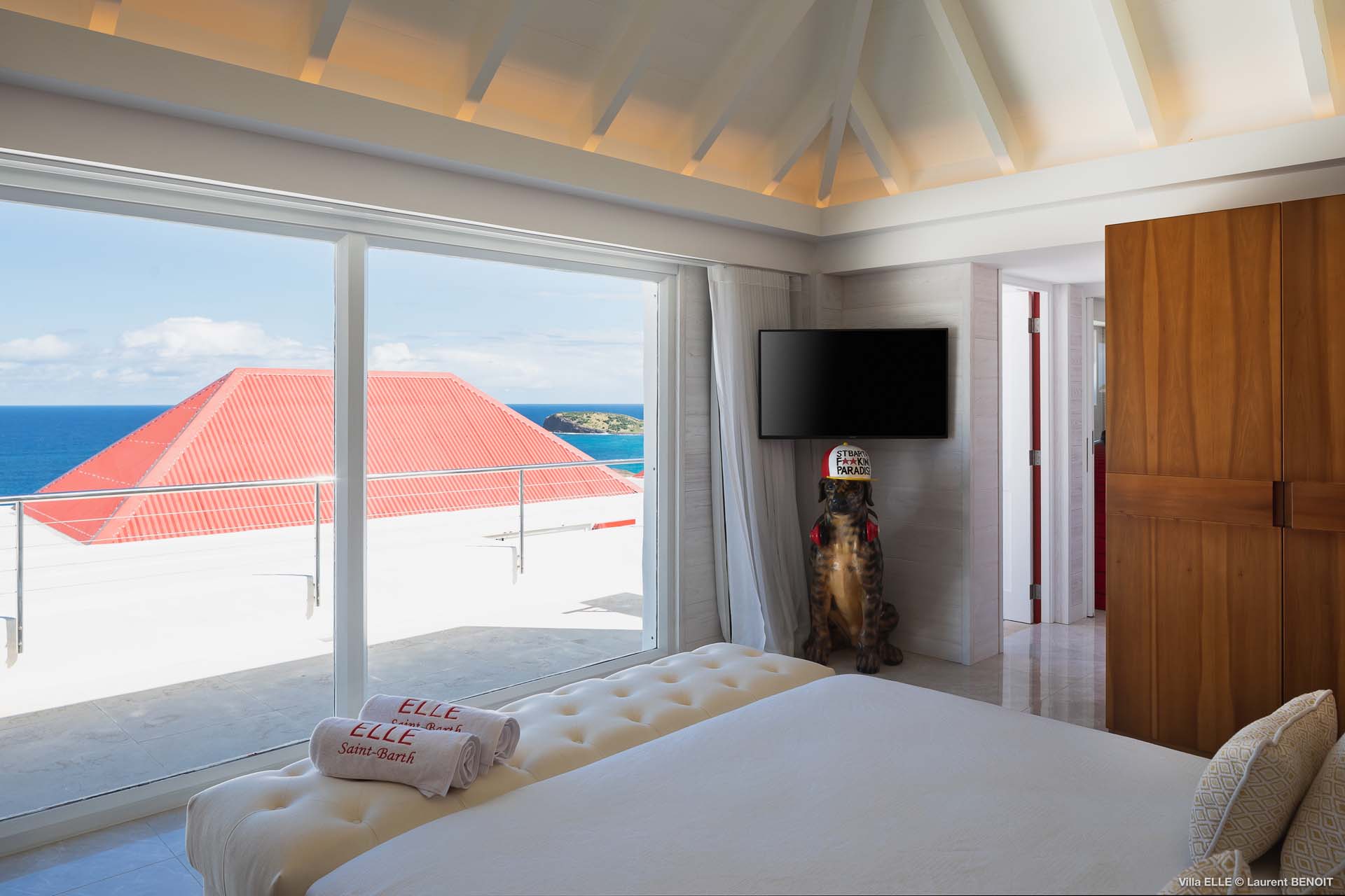 Villa Elle is a spacious, 4-bedroom villa situated in Pointe Milou with great amenities and incredible ocean views. Perched on the cliffs on the north eastern side of Pointe Milou, Villa Elle benefits from all day sun and truly stunning panoramic ocean views. The villa feels like a cocoon, a safe harbor, where guests can shut out the world and almost feel like being alone on a deserted island. Several seating areas are scattered around the property, both in shade and sun, with the main outdoor gathering space situated underneath a gazebo in between the kitchen and the living room, close to the heated pool. For some extra relaxation, or a late afternoon cocktail, a heated jacuzzi is located in the corner of the front terrace. The villa was designed to offer ample opportunity to spend time outside and enjoy the views, even on the windier days, thanks to the glass fencing. The kitchen is a large and bright space in a separate pavilion that can be fully air-conditioned, with the fully-equipped, gourmet kitchen on one side, and a dining area on the other. Across from the kitchen is the air-conditioned living room, with 3 comfortable sofas and a fully stocked entertainment center, and which connects with the well-equipped fitness. All bedrooms are equally equipped and offer gorgeous ocean views. On either side of the main level are two master bungalows, each has a spacious room with a European king-sized bed, U.S. and French satellite as well as Apple TV, his-and-hers closets, and an ensuite bathroom with shower and an outdoor shower. One level above is a third master bedroom and a slightly smaller room, which has the same amenities as all others: a European king-sized bed, U.S. and French satellite and Apple TV, his-and-hers closets, and ensuite bathroom with shower. Tucked in the back, in between the upper bedrooms, is a massage room with a heated table, and a full home theater. Villa Elle is a perfect family villa, but will also suit couples vacationing together.Please fill out the form to begin your inquiry and we will connect you with a seasoned villa rental specialist.