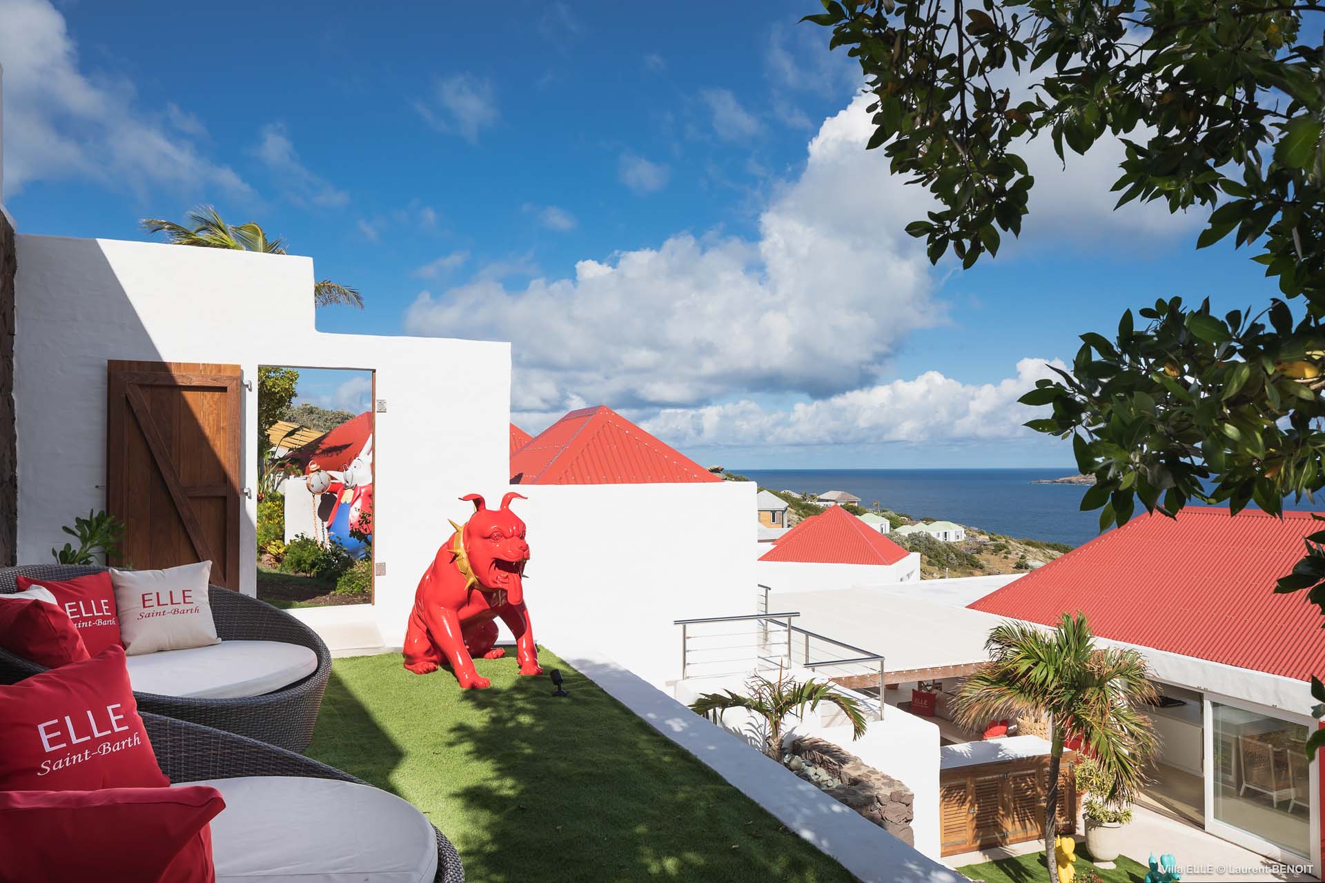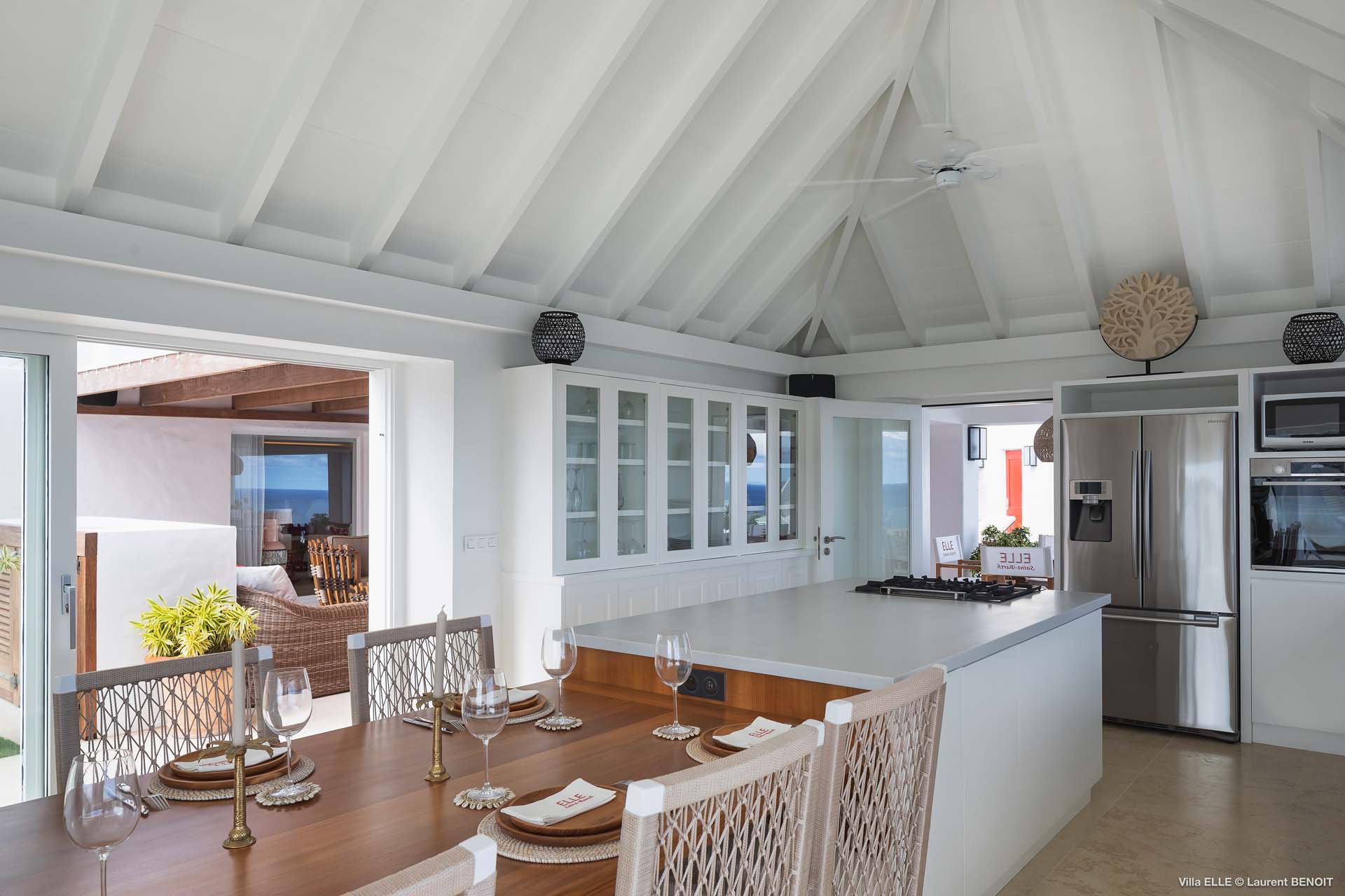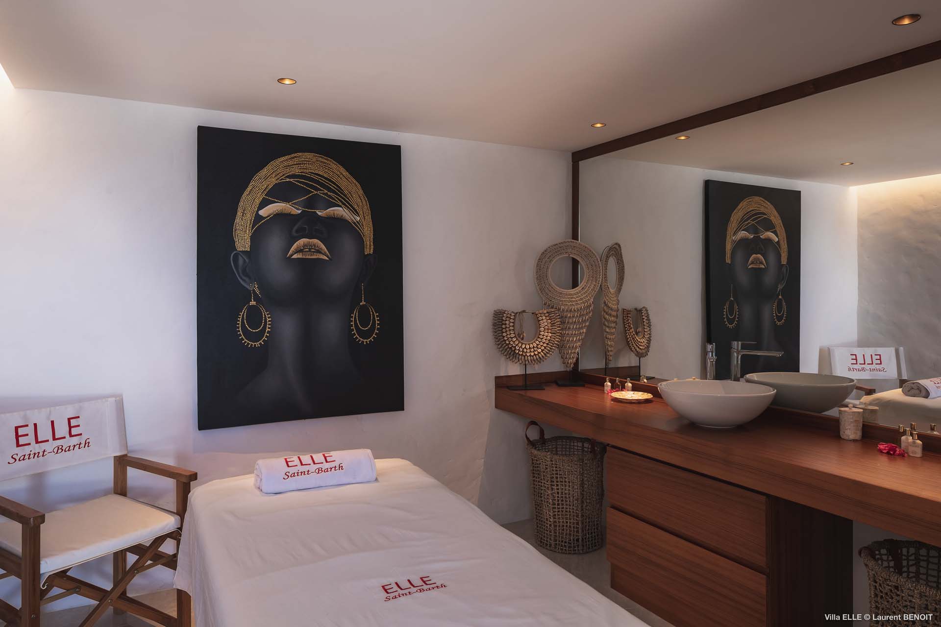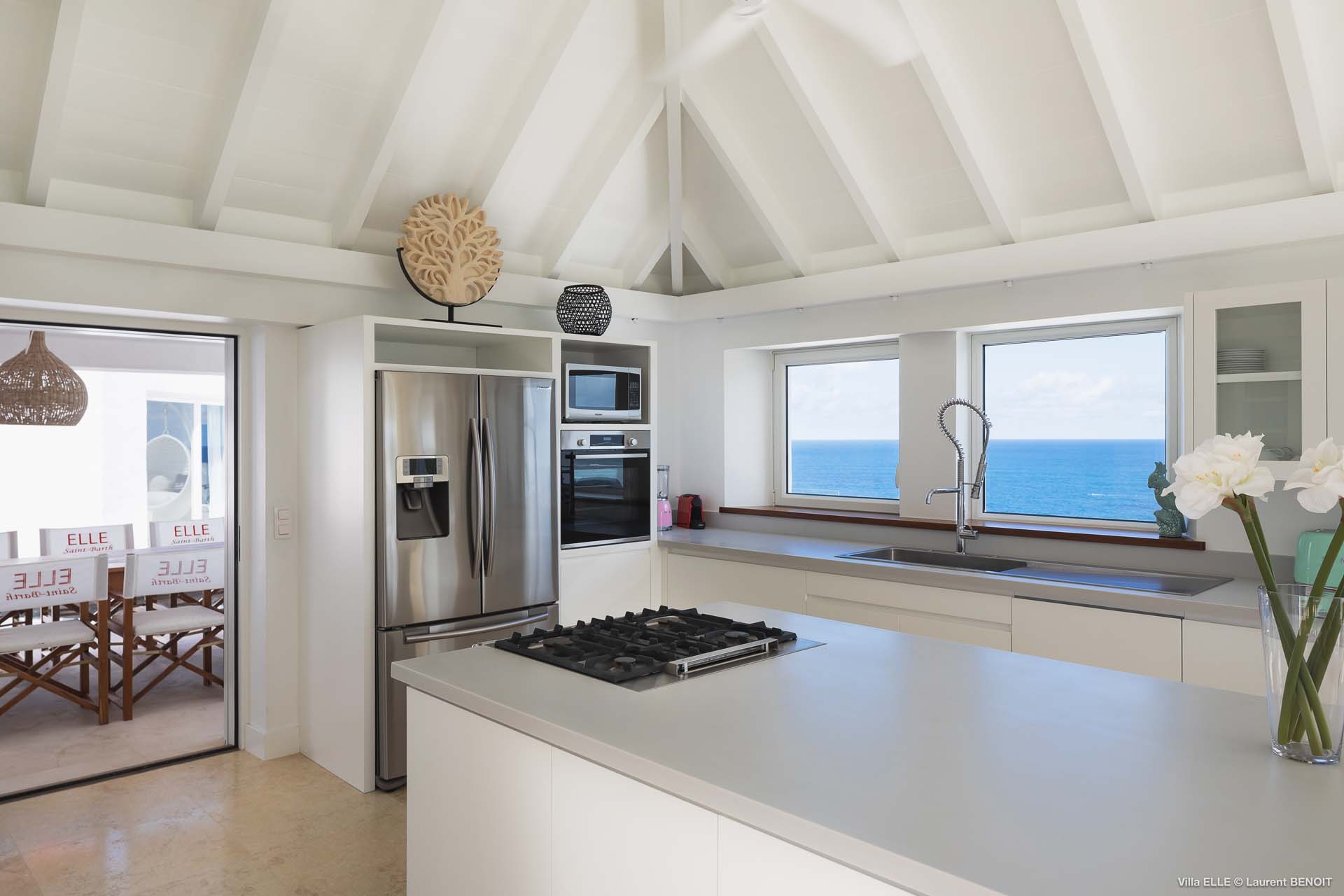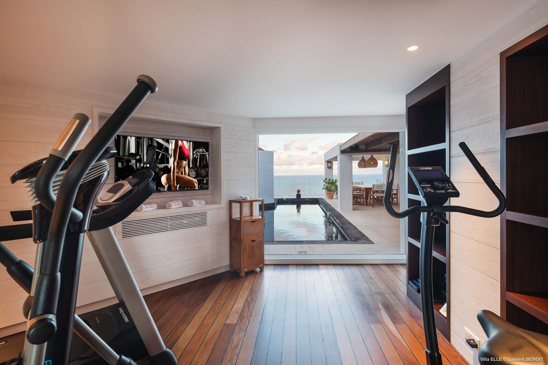 Villa Elle is a spacious, 4-bedroom villa situated in Pointe Milou with great amenities and incredible ocean views. Perched on the cliffs on the north eastern side of Pointe Milou, Villa Elle benefits from all day sun and truly stunning panoramic ocean views. The villa feels like a cocoon, a safe harbor, where guests can shut out the world and almost feel like being alone on a deserted island. Several seating areas are scattered around the property, both in shade and sun, with the main outdoor gathering space situated underneath a gazebo in between the kitchen and the living room, close to the heated pool. For some extra relaxation, or a late afternoon cocktail, a heated jacuzzi is located in the corner of the front terrace. The villa was designed to offer ample opportunity to spend time outside and enjoy the views, even on the windier days, thanks to the glass fencing. The kitchen is a large and bright space in a separate pavilion that can be fully air-conditioned, with the fully-equipped, gourmet kitchen on one side, and a dining area on the other. Across from the kitchen is the air-conditioned living room, with 3 comfortable sofas and a fully stocked entertainment center, and which connects with the well-equipped fitness. All bedrooms are equally equipped and offer gorgeous ocean views. On either side of the main level are two master bungalows, each has a spacious room with a European king-sized bed, U.S. and French satellite as well as Apple TV, his-and-hers closets, and an ensuite bathroom with shower and an outdoor shower. One level above is a third master bedroom and a slightly smaller room, which has the same amenities as all others: a European king-sized bed, U.S. and French satellite and Apple TV, his-and-hers closets, and ensuite bathroom with shower. Tucked in the back, in between the upper bedrooms, is a massage room with a heated table, and a full home theater. Villa Elle is a perfect family villa, but will also suit couples vacationing together.Please fill out the form to begin your inquiry and we will connect you with a seasoned villa rental specialist.