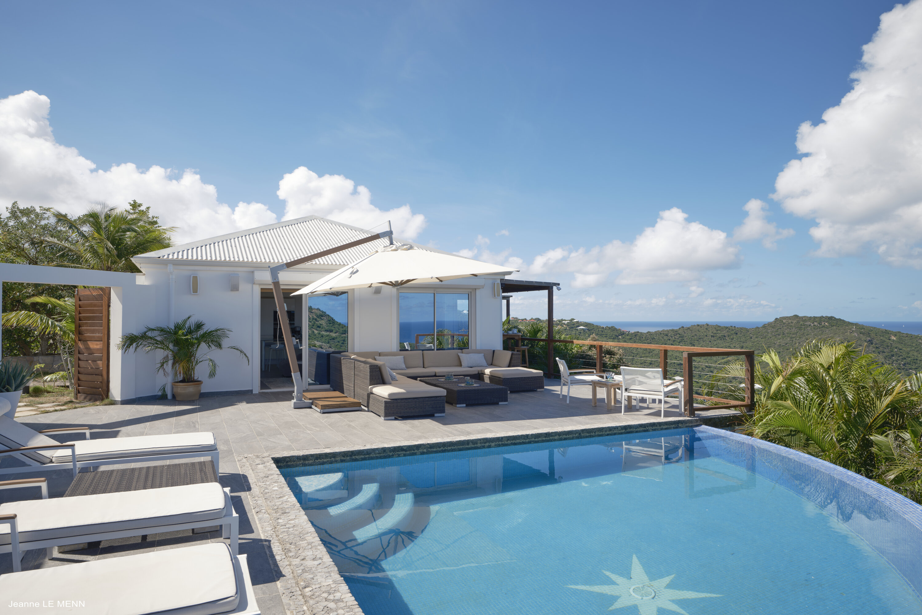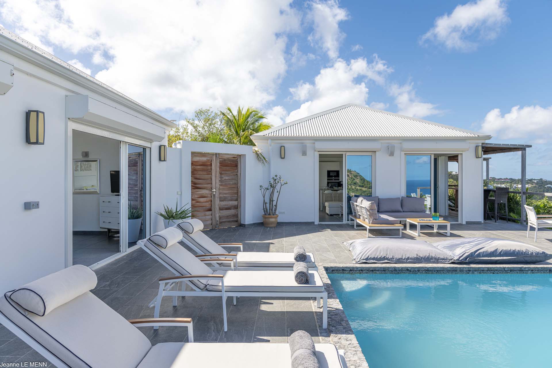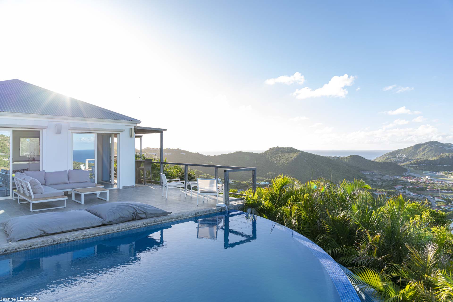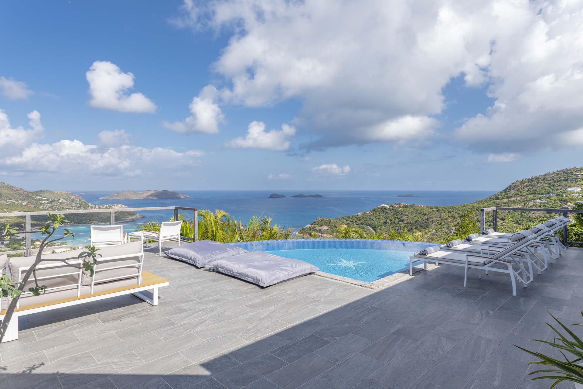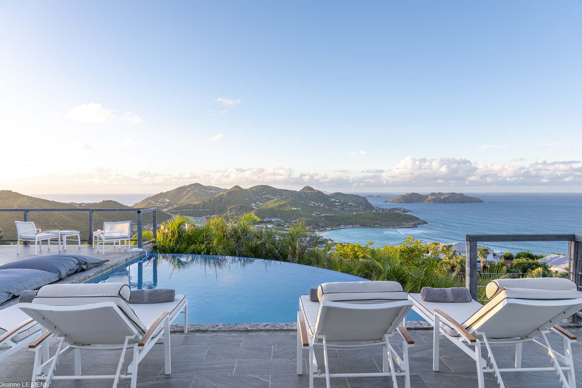Poised high on the St. Jean hillside, this two bedroom deluxe villa offers privacy and a spectacular view of St. Jean Beach and the bustling little airport’s arrivals and departures in the distance. The entrance is graced with a lily pond, and the main house includes airy living spaces with contemporary décor in an all-white palette. A well-equipped kitchen, an adjoining dining area, and a guest bath are all in the main house as well. Two of the bedrooms (king platform beds) are in an adjacent pavilion and are identical in size. They feature en suite baths with double vanities and vessel sinks, access to the pool terrace and a fabulous view. The 3rd en suite bedroom, also with an ocean view, has a deck, and is privately situated on the lower levelThe focal point of the sunny terrace is a delightful infinity pool, heated in winter and chlorine-free; there are loads of outdoor living-and-relaxing spaces, including a covered dining terrace and a gazebo. Villa Ellede also features a fitness room. Techno amenities include U.S. Satellite, Wifi, and surround sound. Romantic enough for honeymooners, it would also be a great choice for vacationing friends.Please fill out the form to begin your inquiry and we will connect you with a seasoned villa rental specialist.