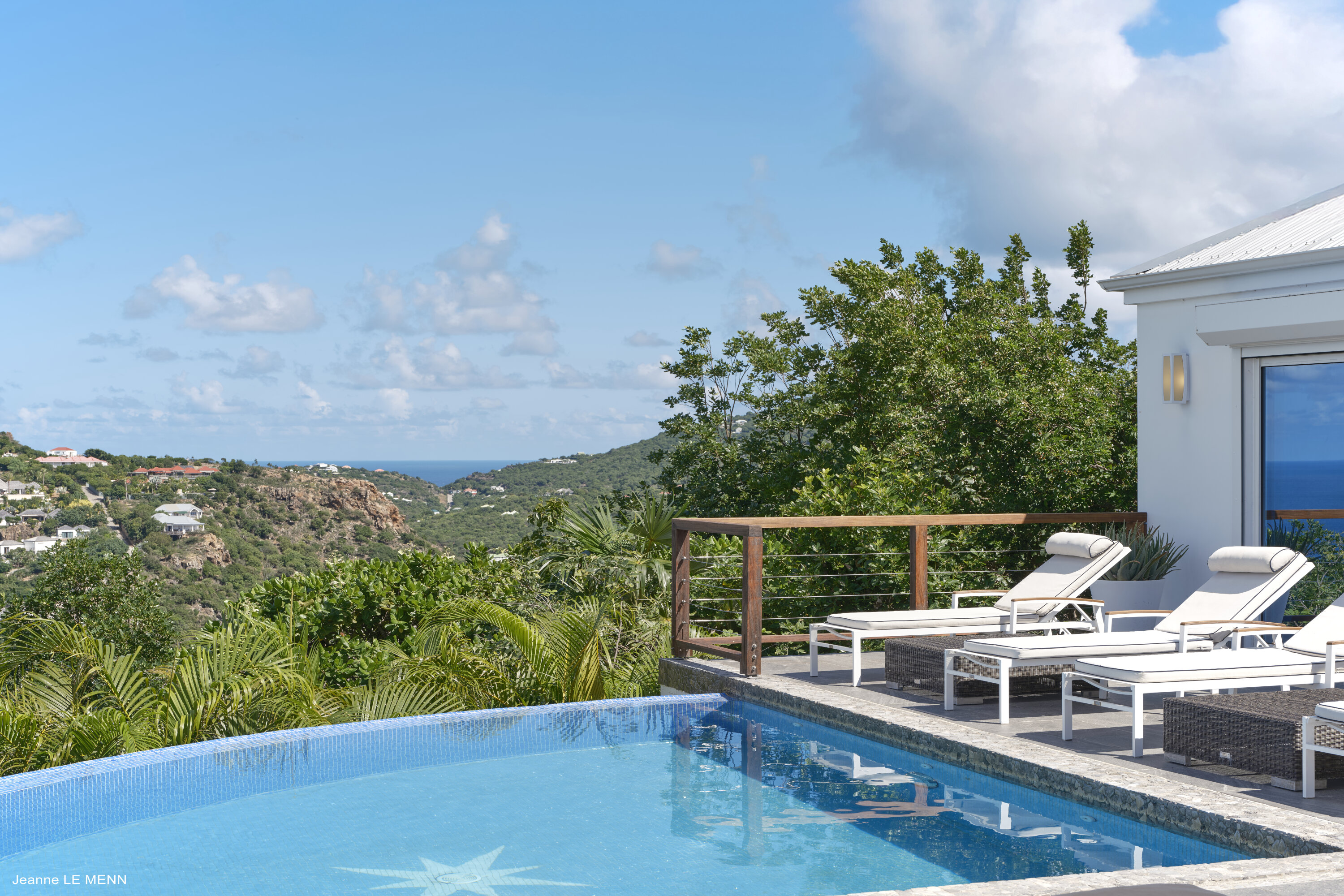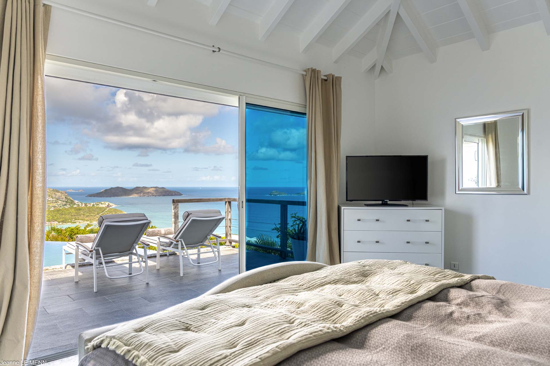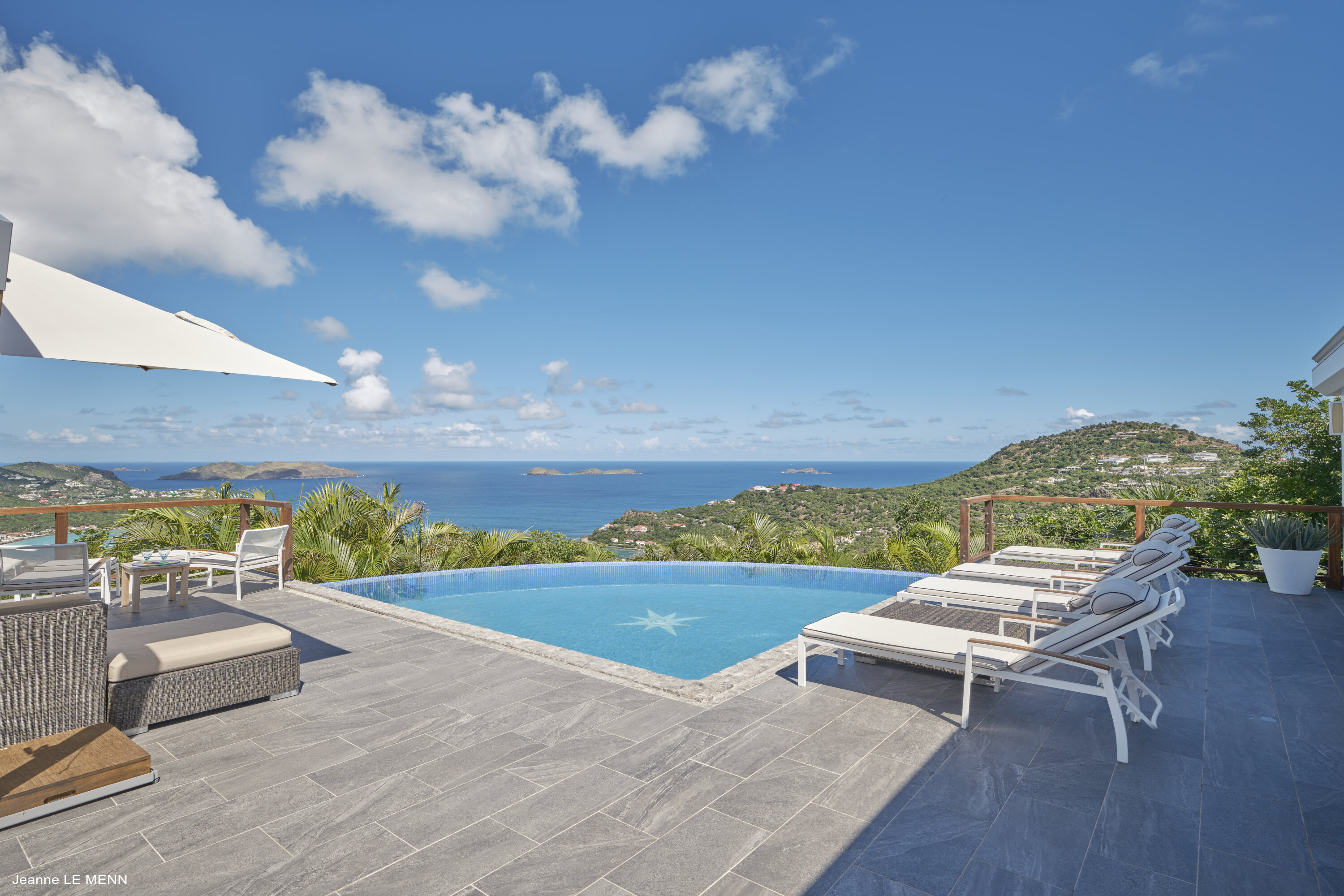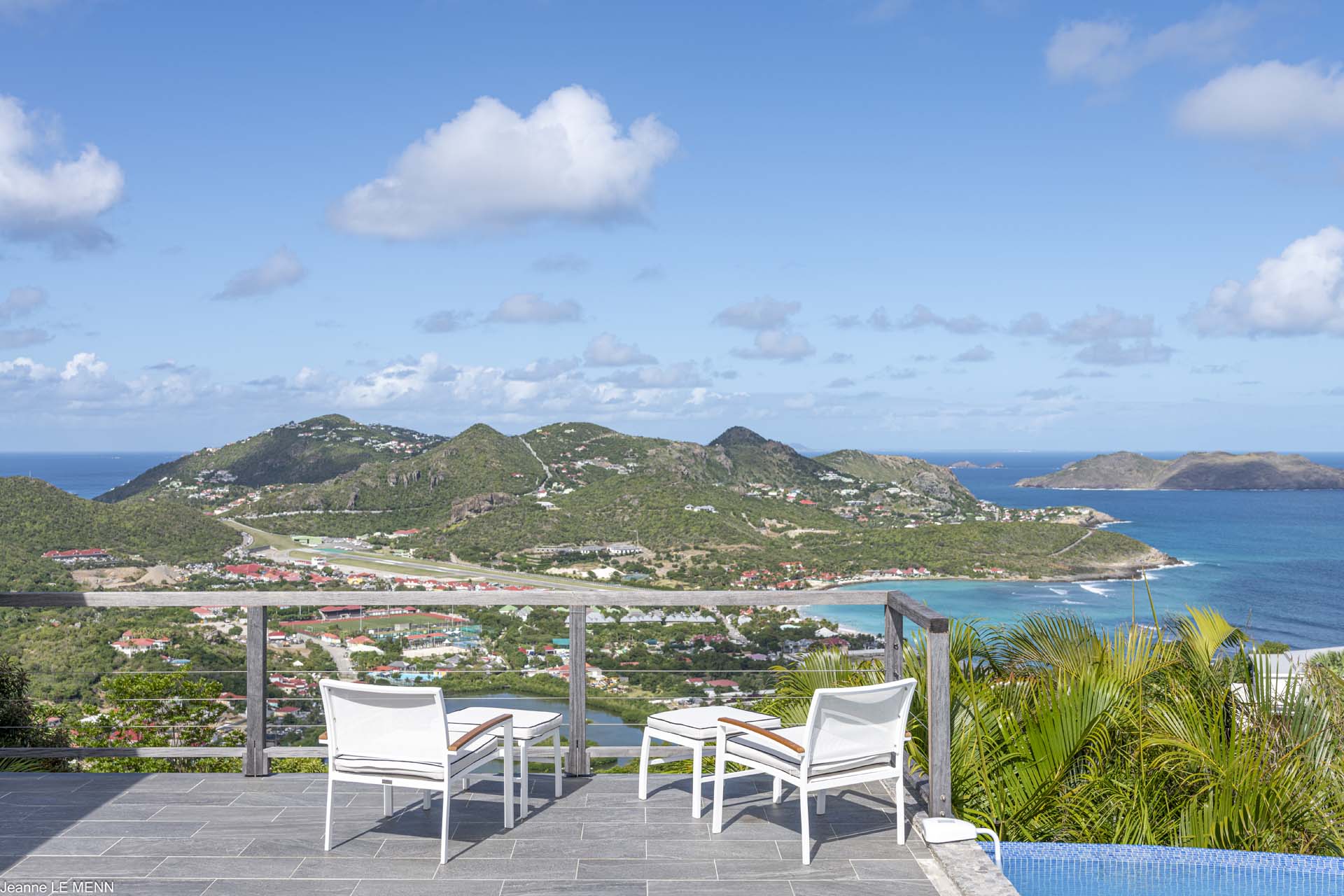 Poised high on the St. Jean hillside, this two bedroom deluxe villa offers privacy and a spectacular view of St. Jean Beach and the bustling little airport’s arrivals and departures in the distance. The entrance is graced with a lily pond, and the main house includes airy living spaces with contemporary décor in an all-white palette. A well-equipped kitchen, an adjoining dining area, and a guest bath are all in the main house as well. Two of the bedrooms (king platform beds) are in an adjacent pavilion and are identical in size. They feature en suite baths with double vanities and vessel sinks, access to the pool terrace and a fabulous view. The 3rd en suite bedroom, also with an ocean view, has a deck, and is privately situated on the lower levelThe focal point of the sunny terrace is a delightful infinity pool, heated in winter and chlorine-free; there are loads of outdoor living-and-relaxing spaces, including a covered dining terrace and a gazebo. Villa Ellede also features a fitness room. Techno amenities include U.S. Satellite, Wifi, and surround sound. Romantic enough for honeymooners, it would also be a great choice for vacationing friends.Please fill out the form to begin your inquiry and we will connect you with a seasoned villa rental specialist.
