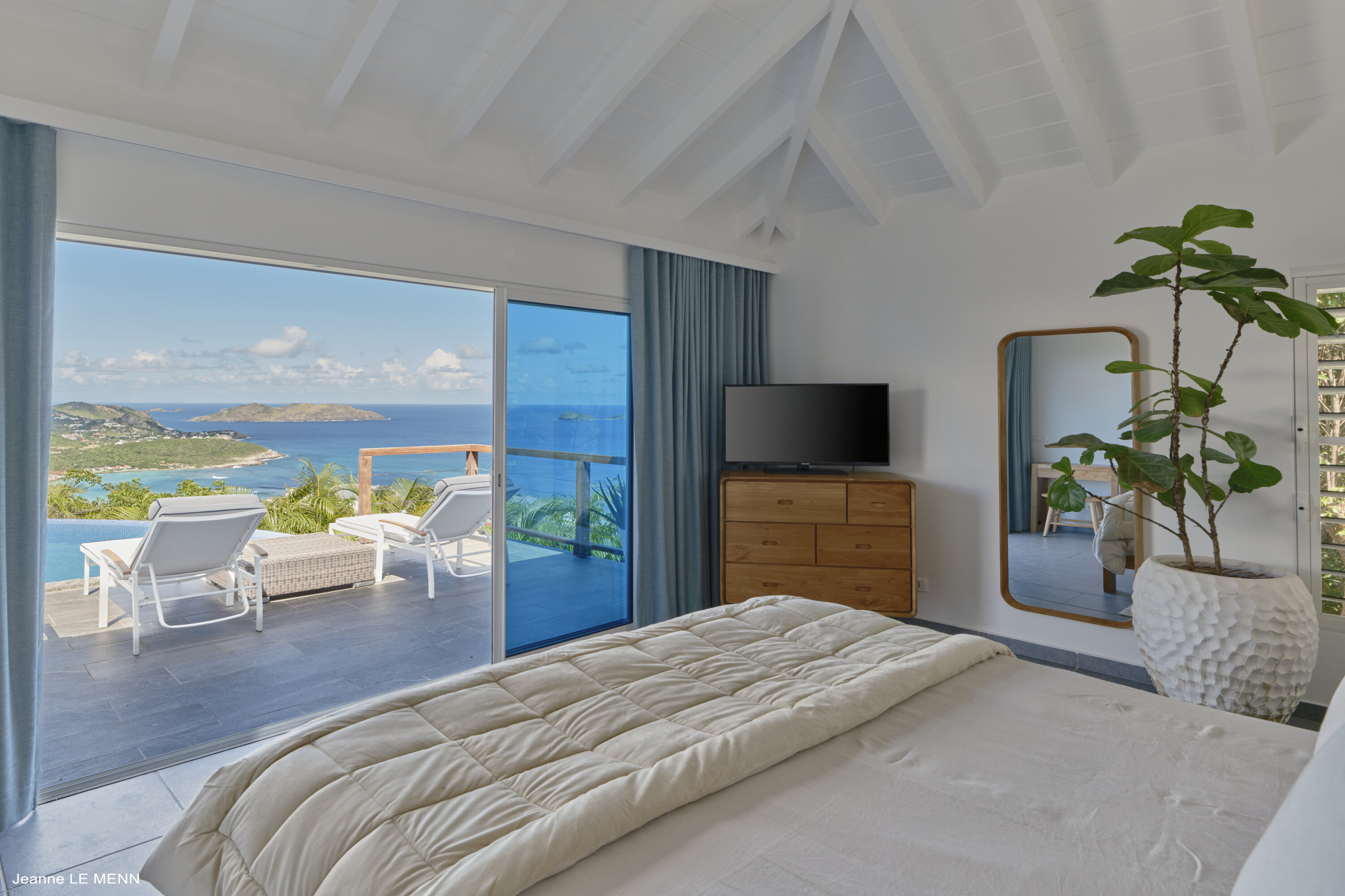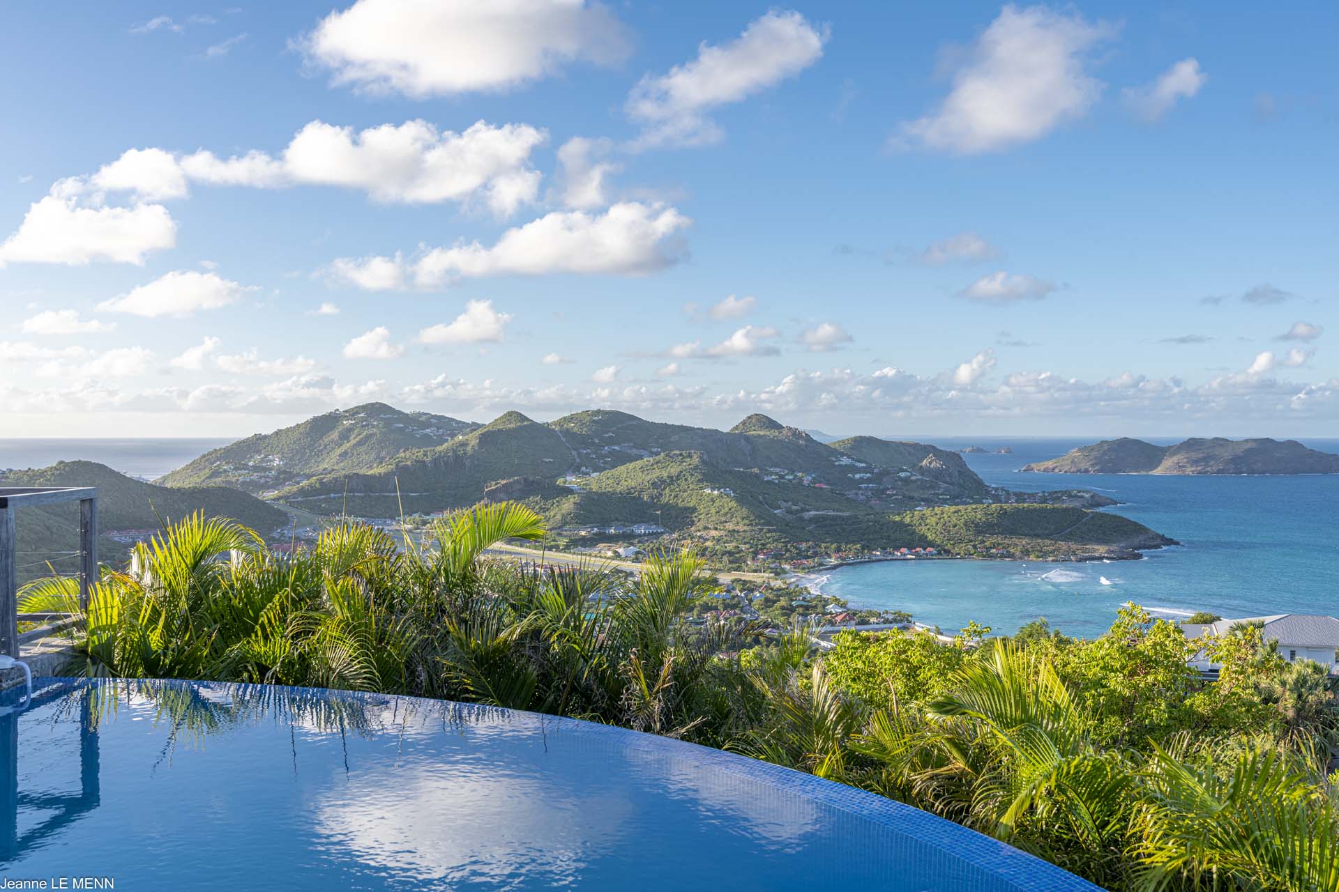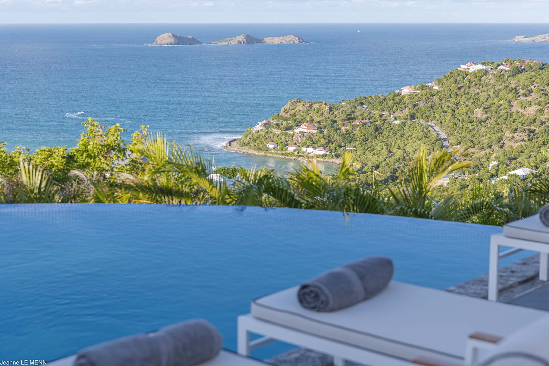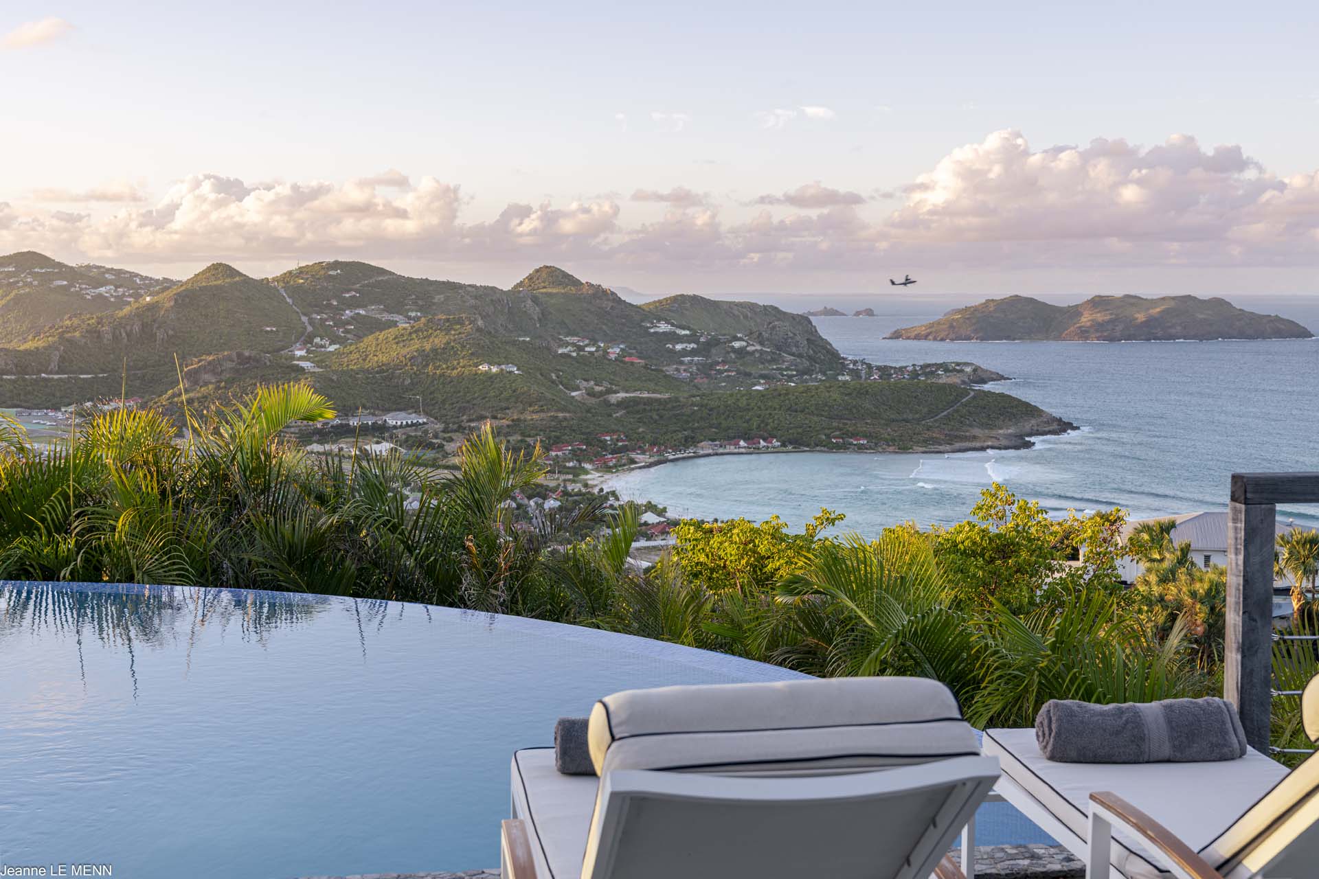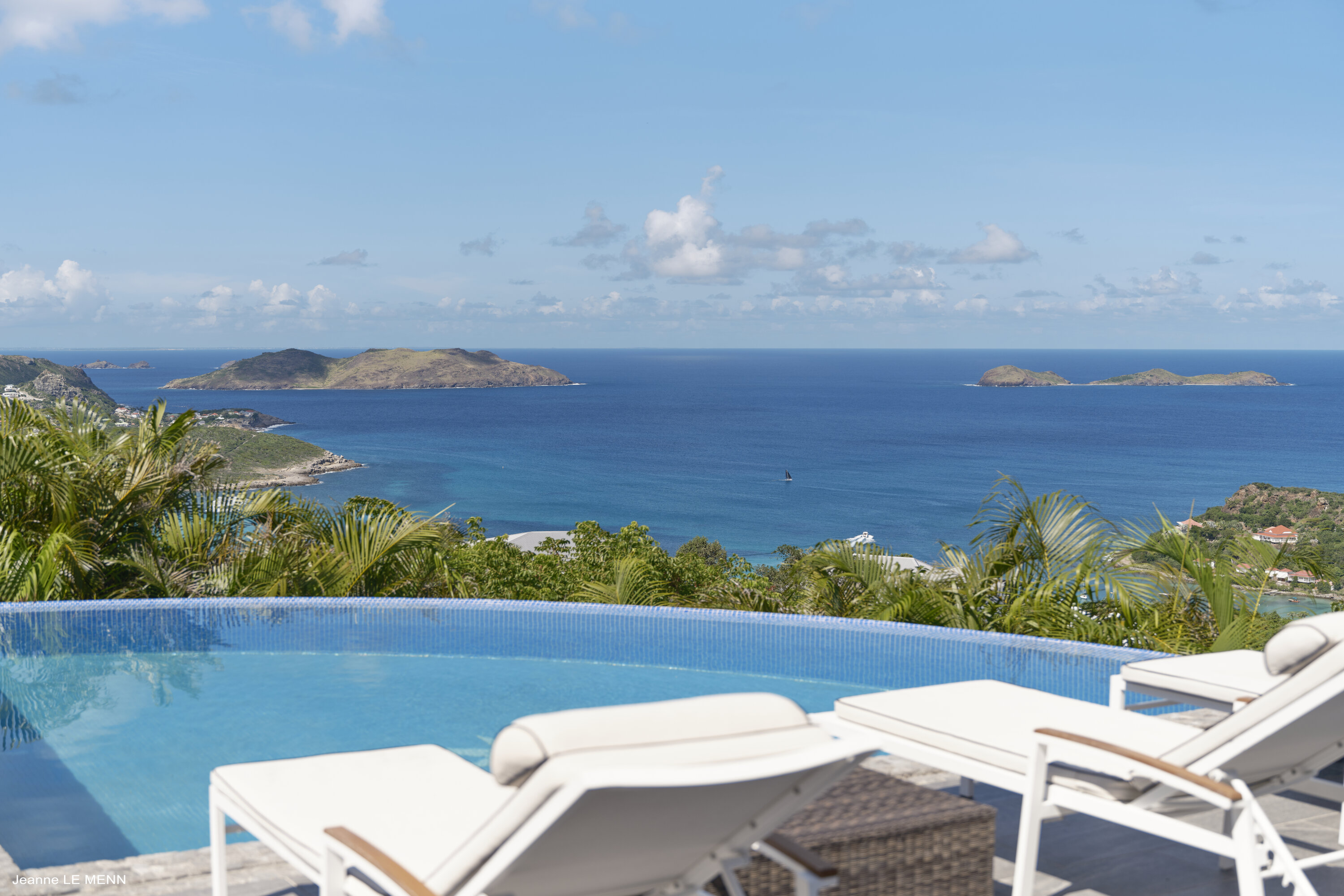 Poised high on the St. Jean hillside, this two bedroom deluxe villa offers privacy and a spectacular view of St. Jean Beach and the bustling little airport’s arrivals and departures in the distance. The entrance is graced with a lily pond, and the main house includes airy living spaces with contemporary décor in an all-white palette. A well-equipped kitchen, an adjoining dining area, and a guest bath are all in the main house as well. Two of the bedrooms (king platform beds) are in an adjacent pavilion and are identical in size. They feature en suite baths with double vanities and vessel sinks, access to the pool terrace and a fabulous view. The 3rd en suite bedroom, also with an ocean view, has a deck, and is privately situated on the lower levelThe focal point of the sunny terrace is a delightful infinity pool, heated in winter and chlorine-free; there are loads of outdoor living-and-relaxing spaces, including a covered dining terrace and a gazebo. Villa Ellede also features a fitness room. Techno amenities include U.S. Satellite, Wifi, and surround sound. Romantic enough for honeymooners, it would also be a great choice for vacationing friends.Please fill out the form to begin your inquiry and we will connect you with a seasoned villa rental specialist.