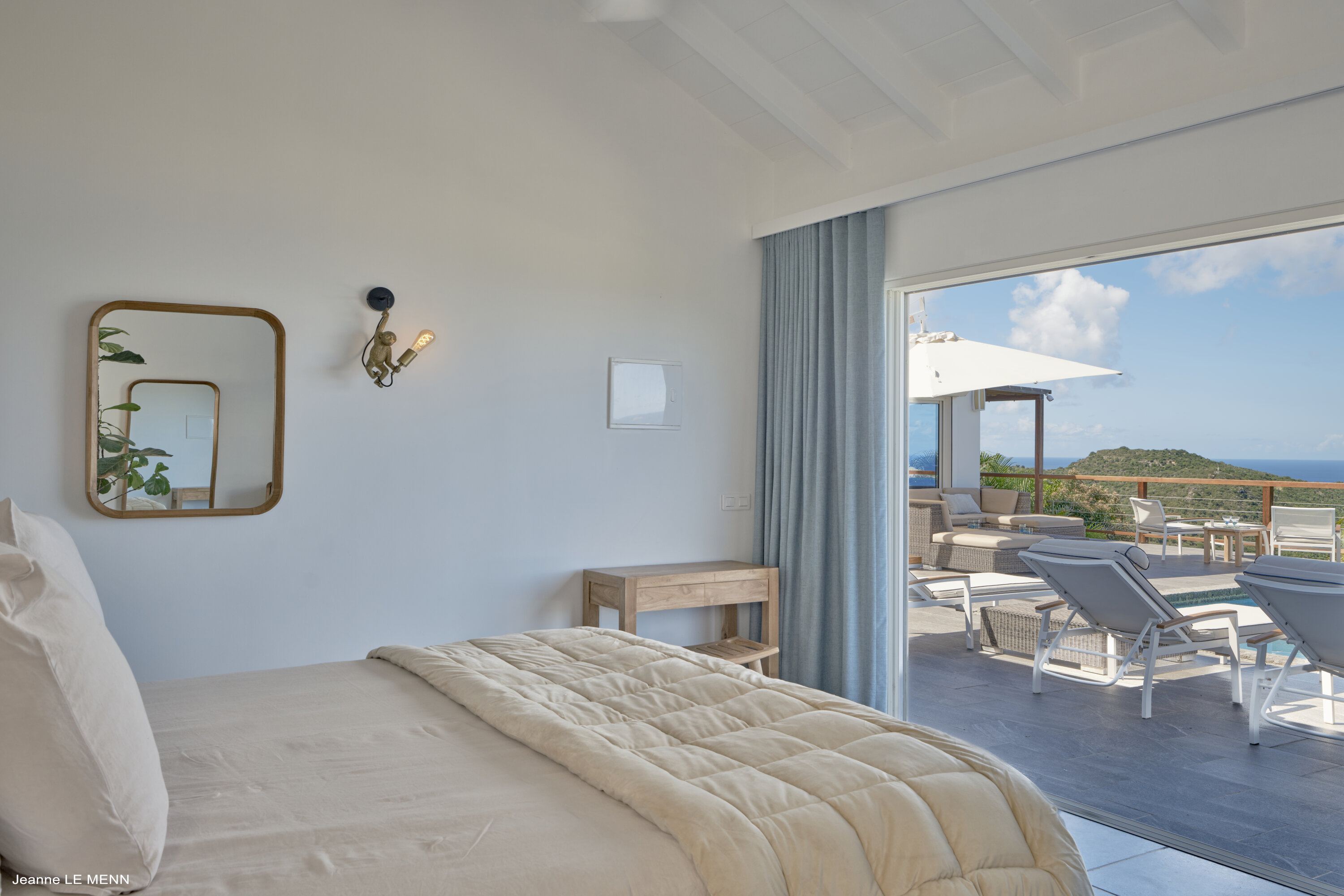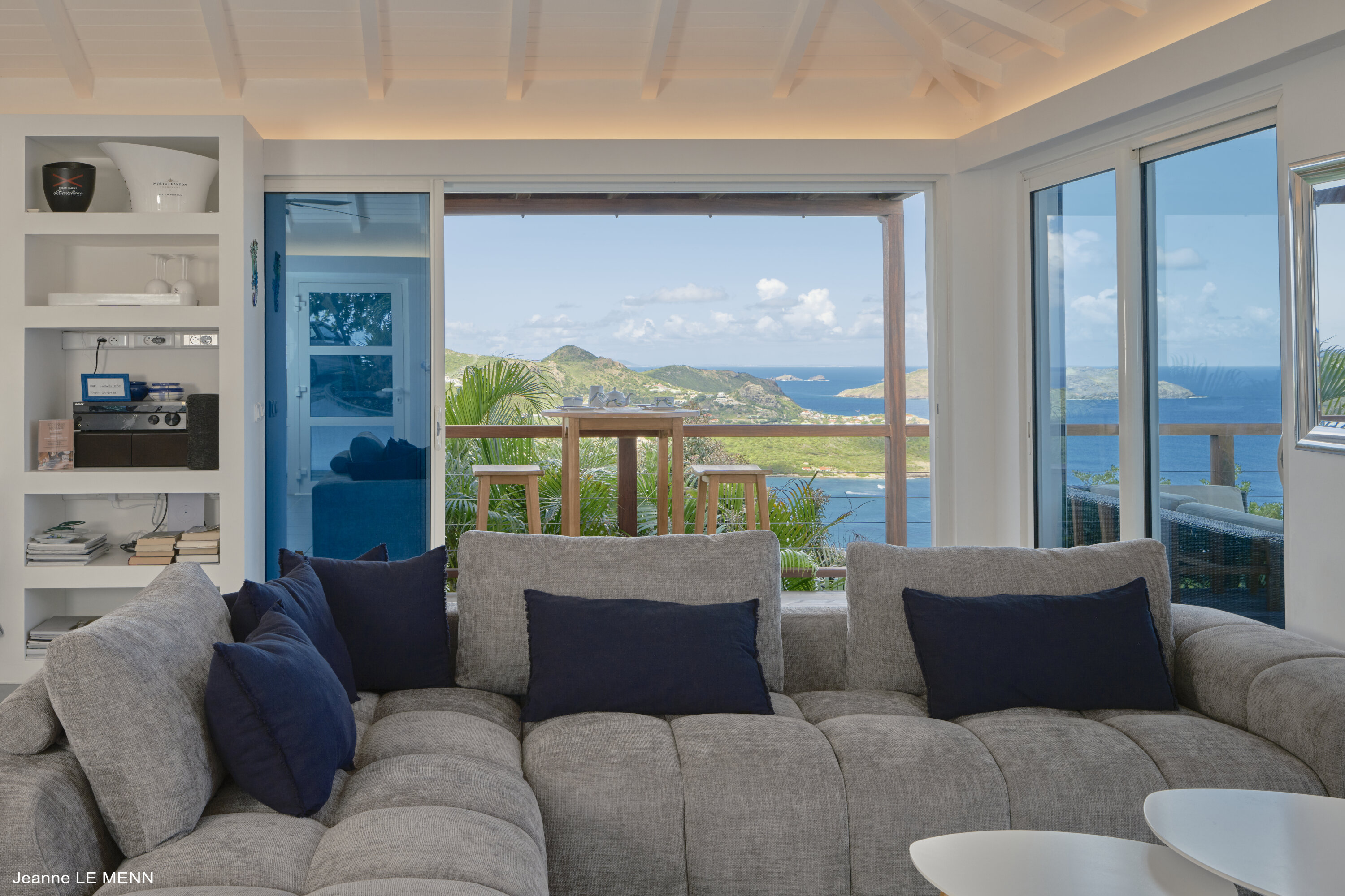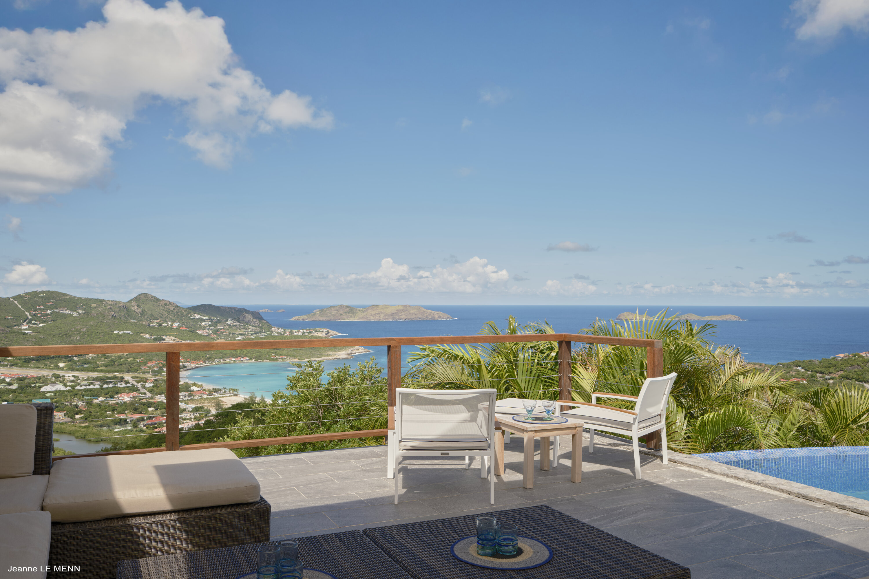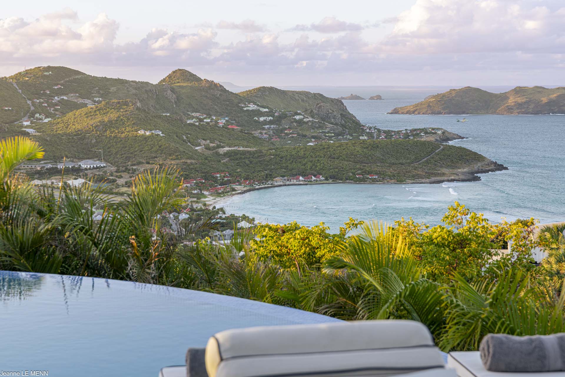 Poised high on the St. Jean hillside, this two bedroom deluxe villa offers privacy and a spectacular view of St. Jean Beach and the bustling little airport’s arrivals and departures in the distance. The entrance is graced with a lily pond, and the main house includes airy living spaces with contemporary décor in an all-white palette. A well-equipped kitchen, an adjoining dining area, and a guest bath are all in the main house as well. Two of the bedrooms (king platform beds) are in an adjacent pavilion and are identical in size. They feature en suite baths with double vanities and vessel sinks, access to the pool terrace and a fabulous view. The 3rd en suite bedroom, also with an ocean view, has a deck, and is privately situated on the lower levelThe focal point of the sunny terrace is a delightful infinity pool, heated in winter and chlorine-free; there are loads of outdoor living-and-relaxing spaces, including a covered dining terrace and a gazebo. Villa Ellede also features a fitness room. Techno amenities include U.S. Satellite, Wifi, and surround sound. Romantic enough for honeymooners, it would also be a great choice for vacationing friends.Please fill out the form to begin your inquiry and we will connect you with a seasoned villa rental specialist.