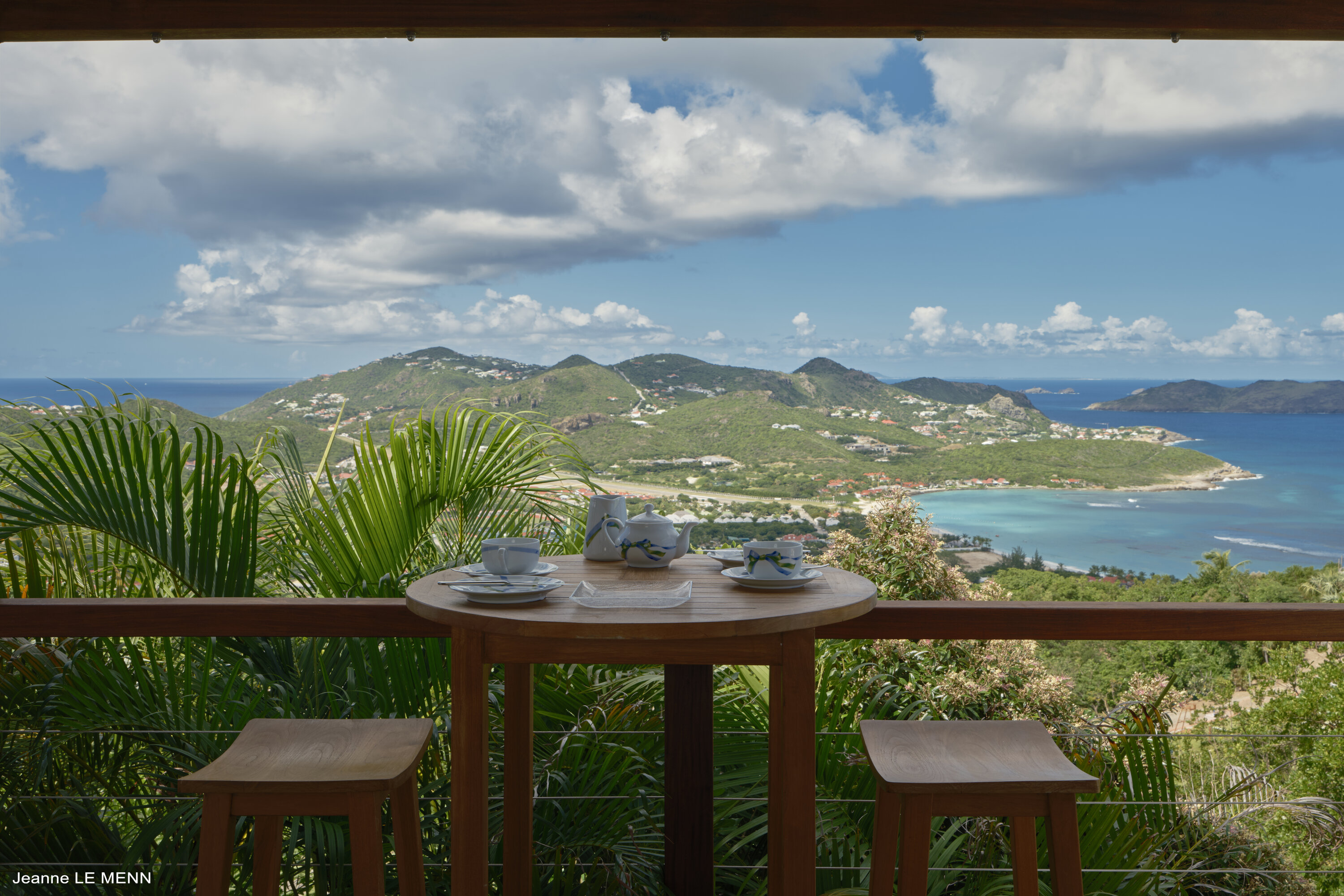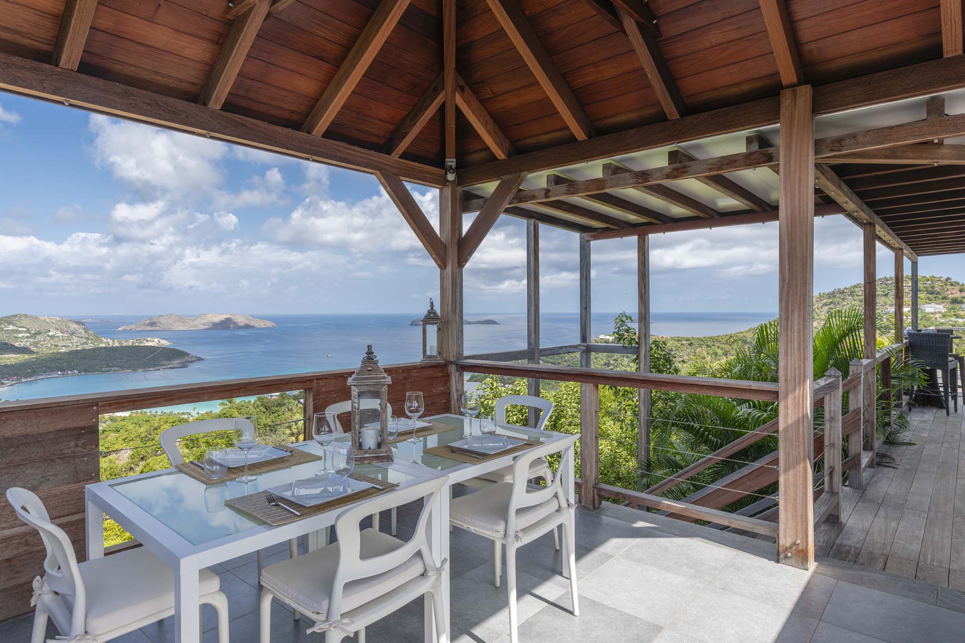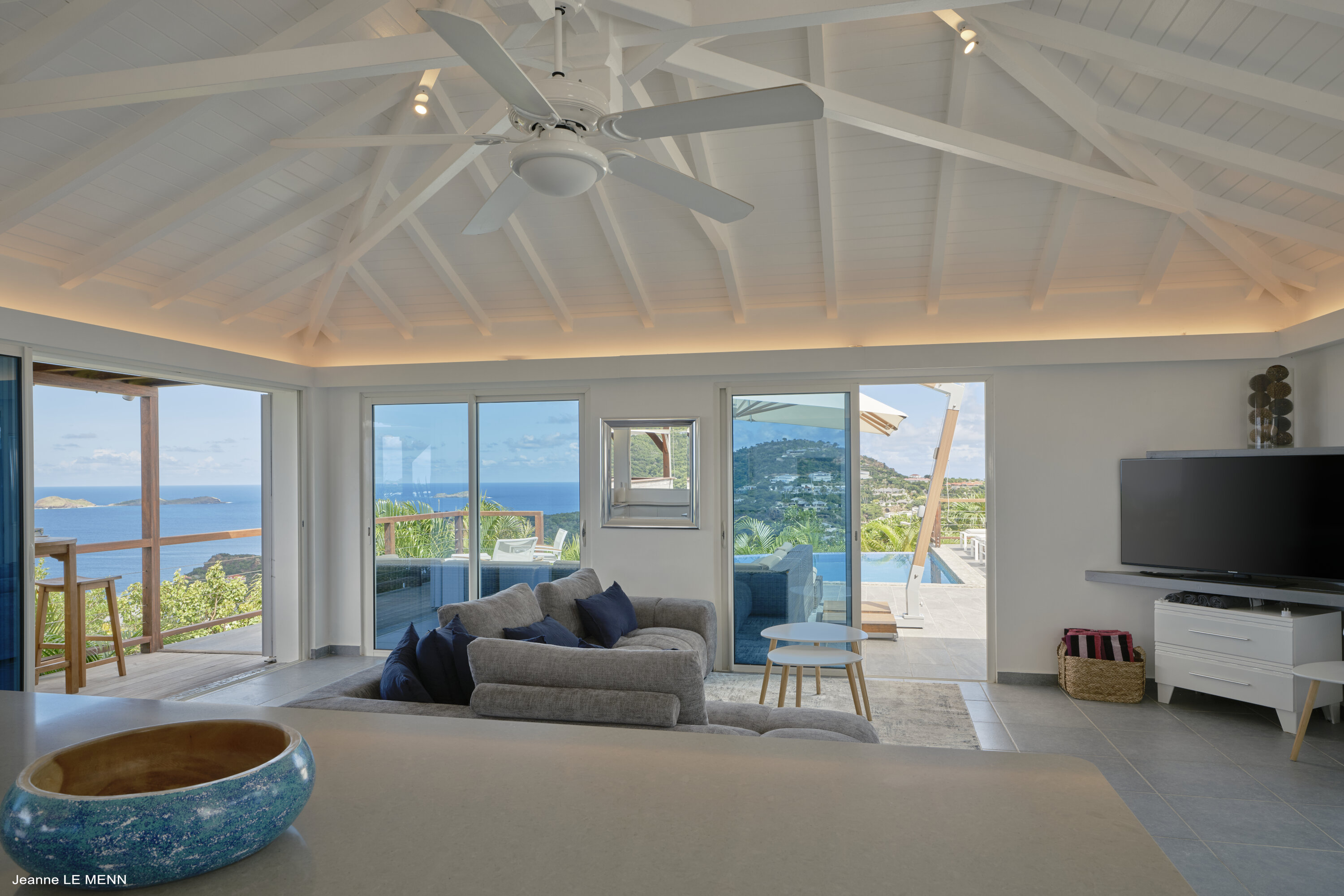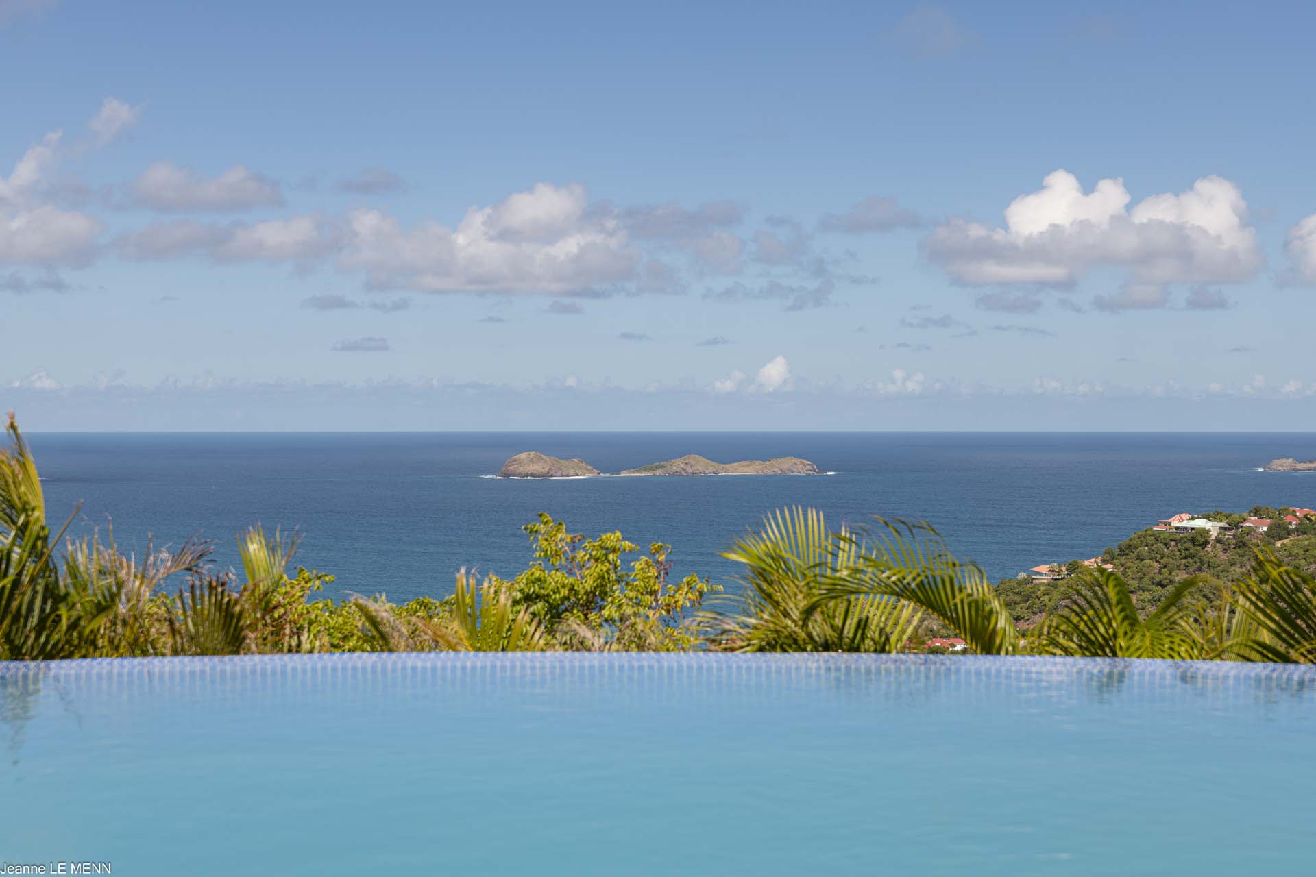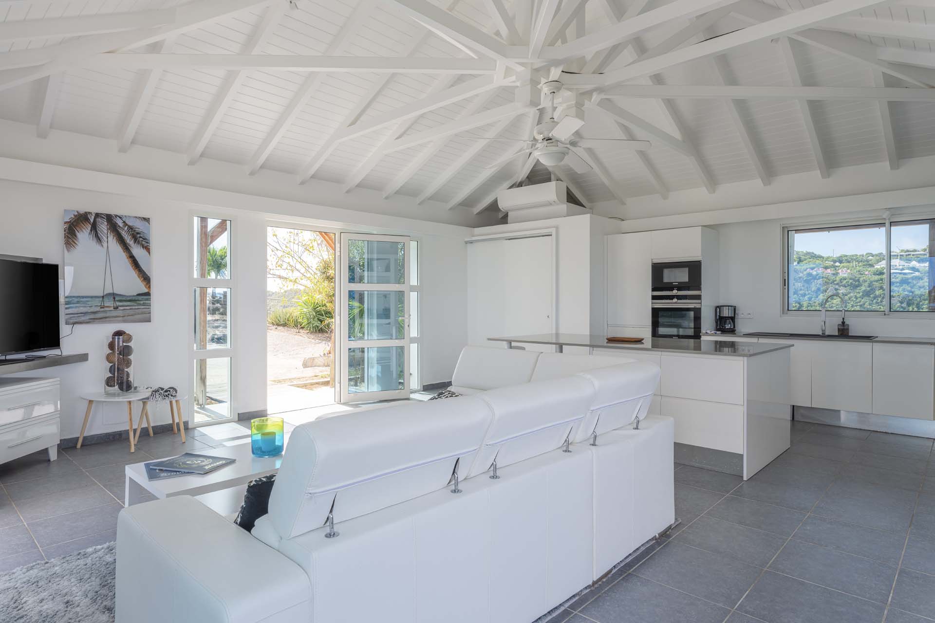 Poised high on the St. Jean hillside, this two bedroom deluxe villa offers privacy and a spectacular view of St. Jean Beach and the bustling little airport’s arrivals and departures in the distance. The entrance is graced with a lily pond, and the main house includes airy living spaces with contemporary décor in an all-white palette. A well-equipped kitchen, an adjoining dining area, and a guest bath are all in the main house as well. Two of the bedrooms (king platform beds) are in an adjacent pavilion and are identical in size. They feature en suite baths with double vanities and vessel sinks, access to the pool terrace and a fabulous view. The 3rd en suite bedroom, also with an ocean view, has a deck, and is privately situated on the lower levelThe focal point of the sunny terrace is a delightful infinity pool, heated in winter and chlorine-free; there are loads of outdoor living-and-relaxing spaces, including a covered dining terrace and a gazebo. Villa Ellede also features a fitness room. Techno amenities include U.S. Satellite, Wifi, and surround sound. Romantic enough for honeymooners, it would also be a great choice for vacationing friends.Please fill out the form to begin your inquiry and we will connect you with a seasoned villa rental specialist.