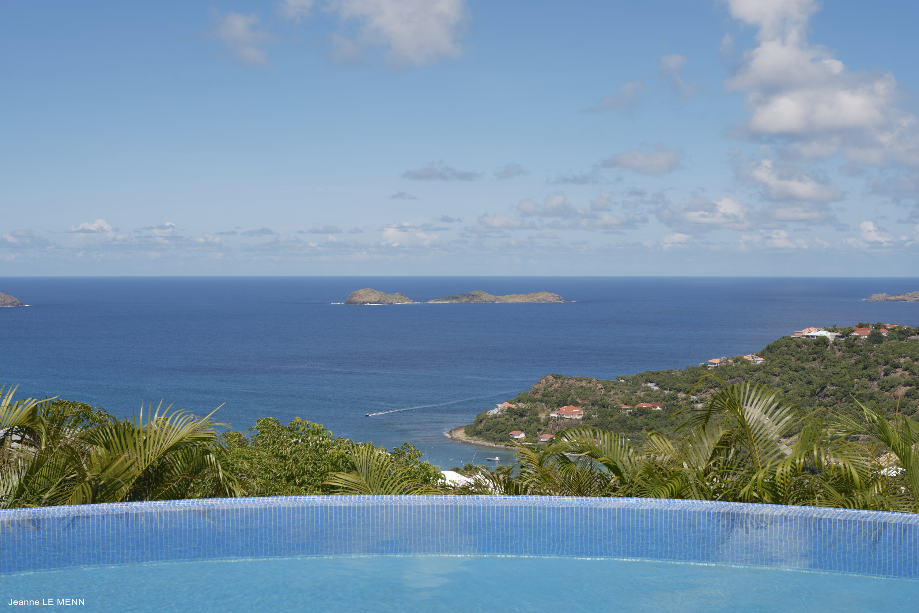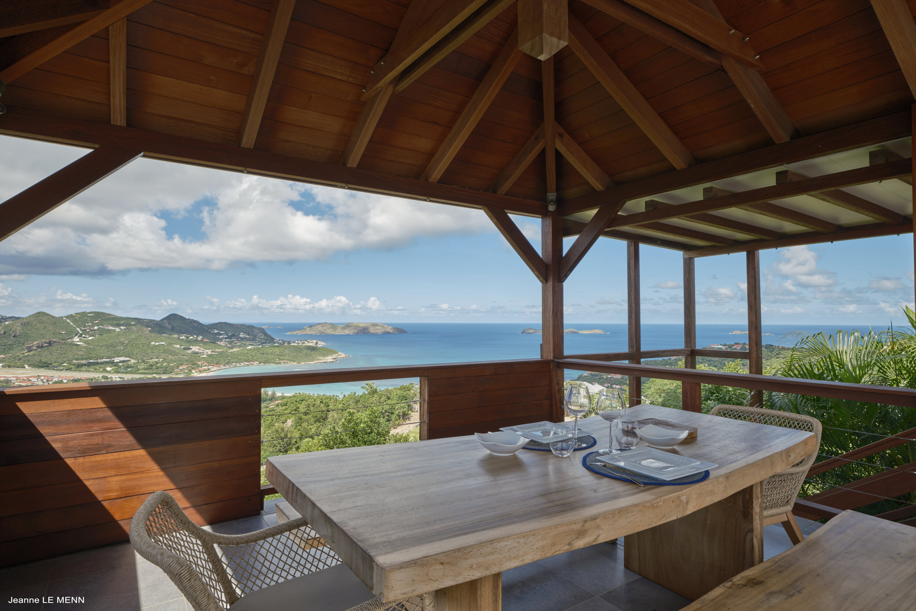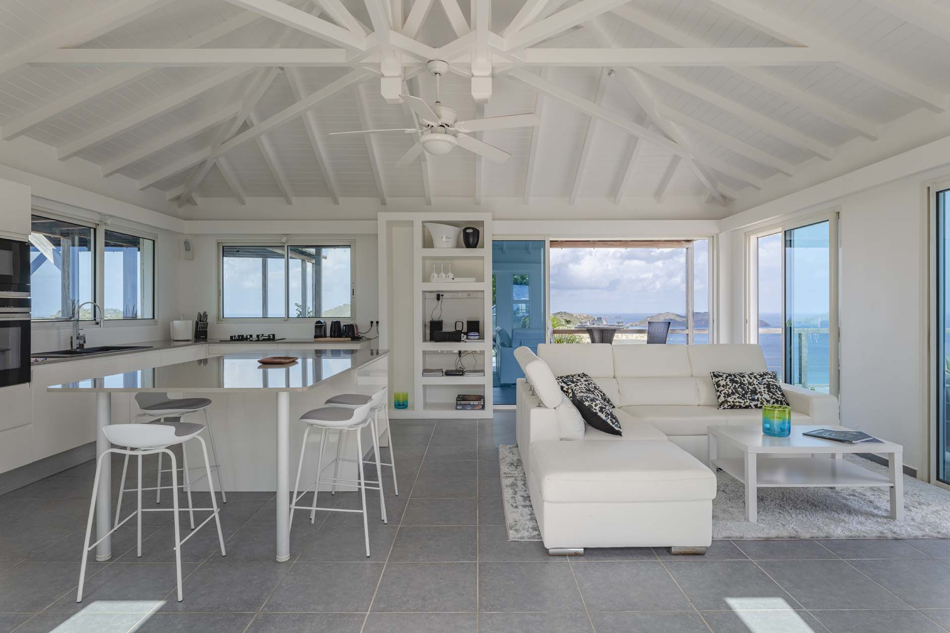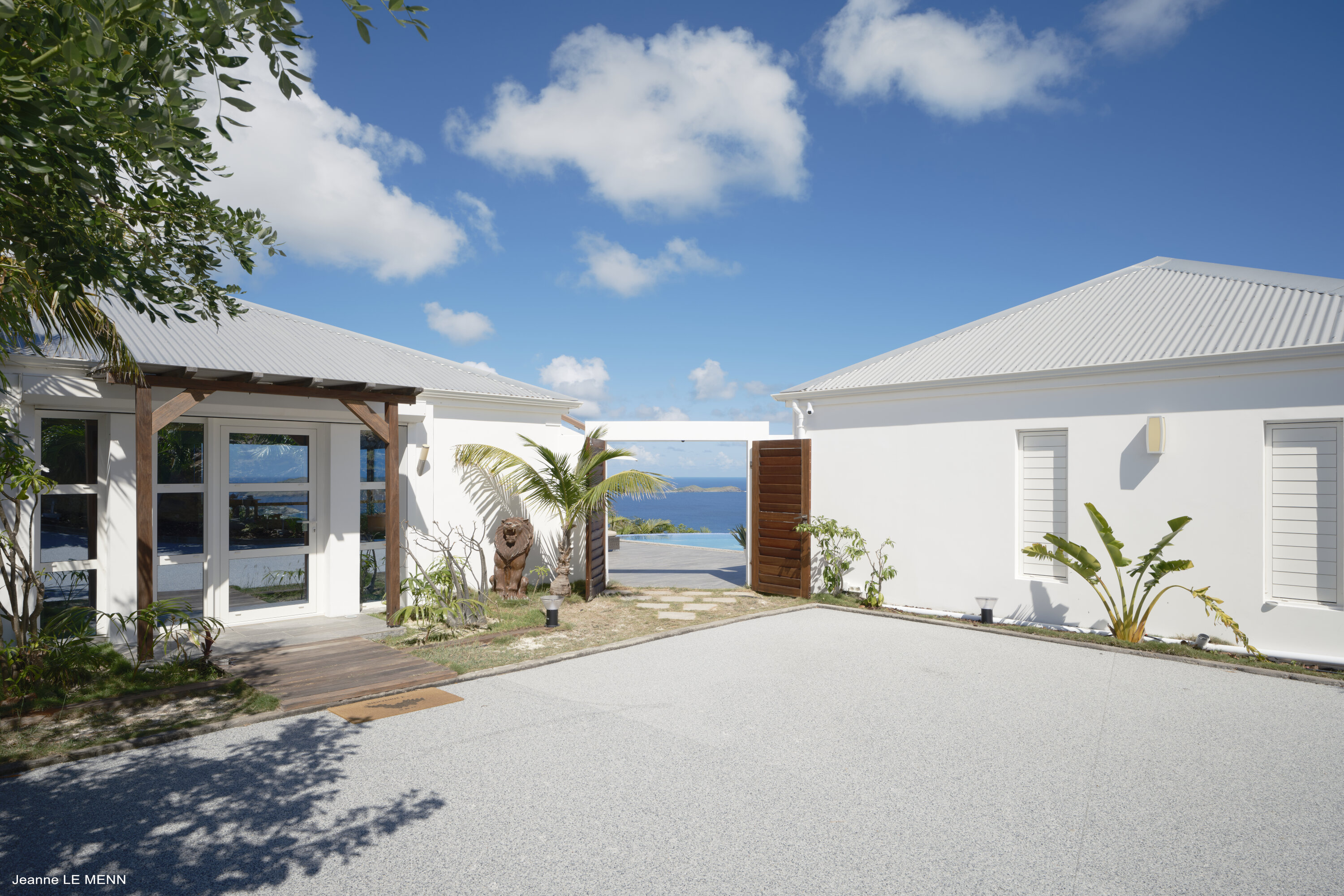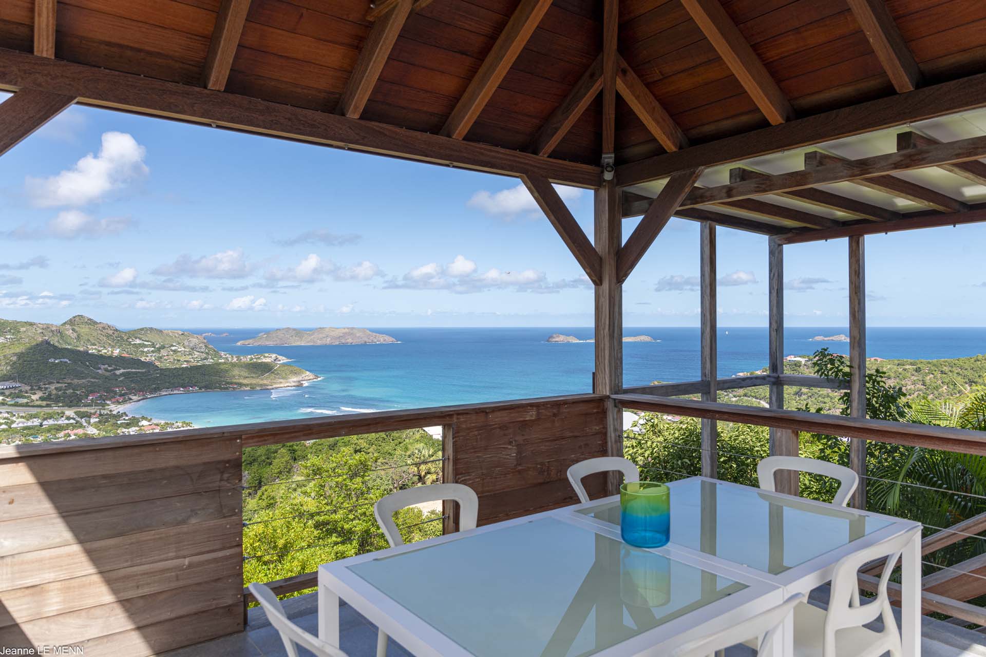 Poised high on the St. Jean hillside, this two bedroom deluxe villa offers privacy and a spectacular view of St. Jean Beach and the bustling little airport’s arrivals and departures in the distance. The entrance is graced with a lily pond, and the main house includes airy living spaces with contemporary décor in an all-white palette. A well-equipped kitchen, an adjoining dining area, and a guest bath are all in the main house as well. Two of the bedrooms (king platform beds) are in an adjacent pavilion and are identical in size. They feature en suite baths with double vanities and vessel sinks, access to the pool terrace and a fabulous view. The 3rd en suite bedroom, also with an ocean view, has a deck, and is privately situated on the lower levelThe focal point of the sunny terrace is a delightful infinity pool, heated in winter and chlorine-free; there are loads of outdoor living-and-relaxing spaces, including a covered dining terrace and a gazebo. Villa Ellede also features a fitness room. Techno amenities include U.S. Satellite, Wifi, and surround sound. Romantic enough for honeymooners, it would also be a great choice for vacationing friends.Please fill out the form to begin your inquiry and we will connect you with a seasoned villa rental specialist.