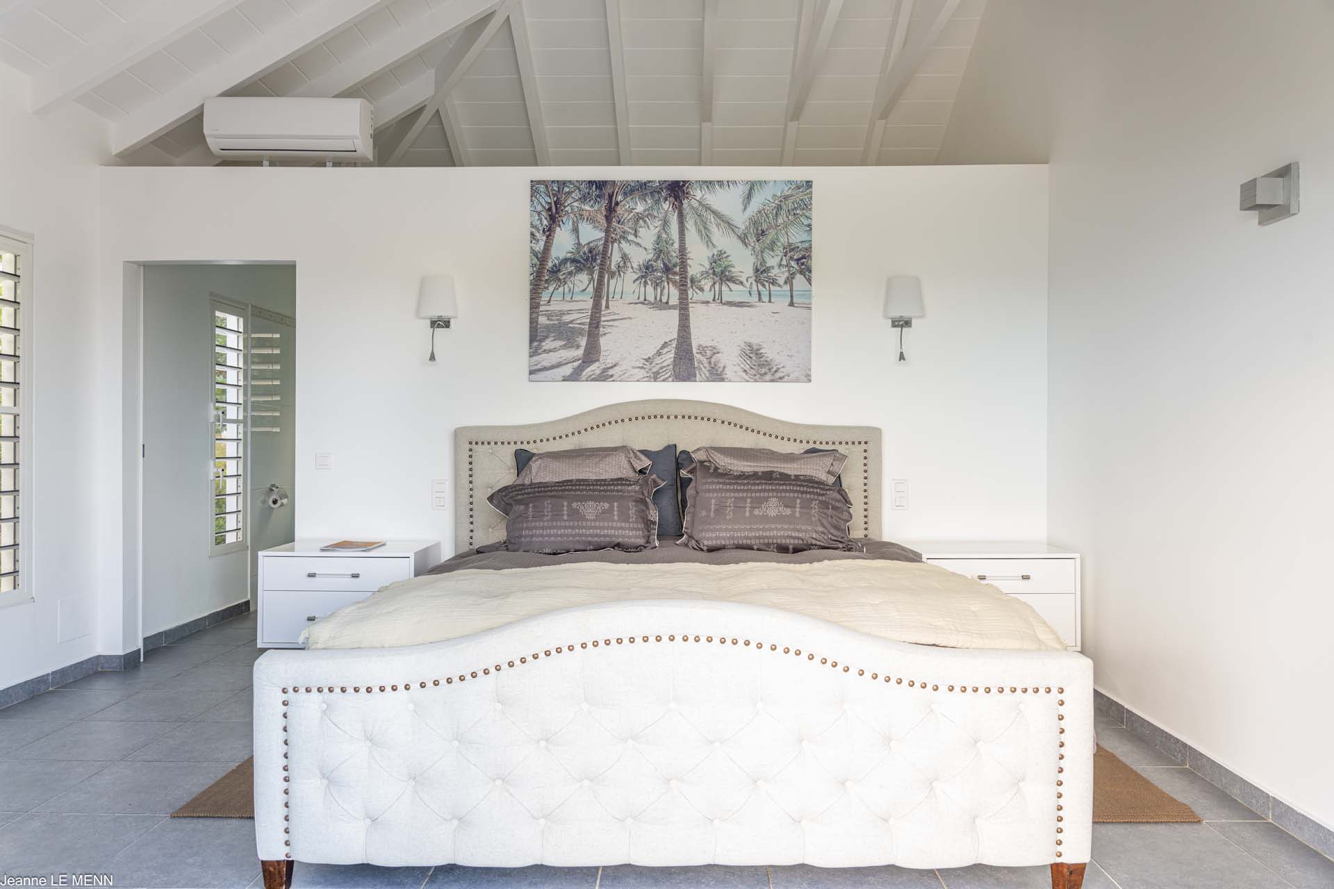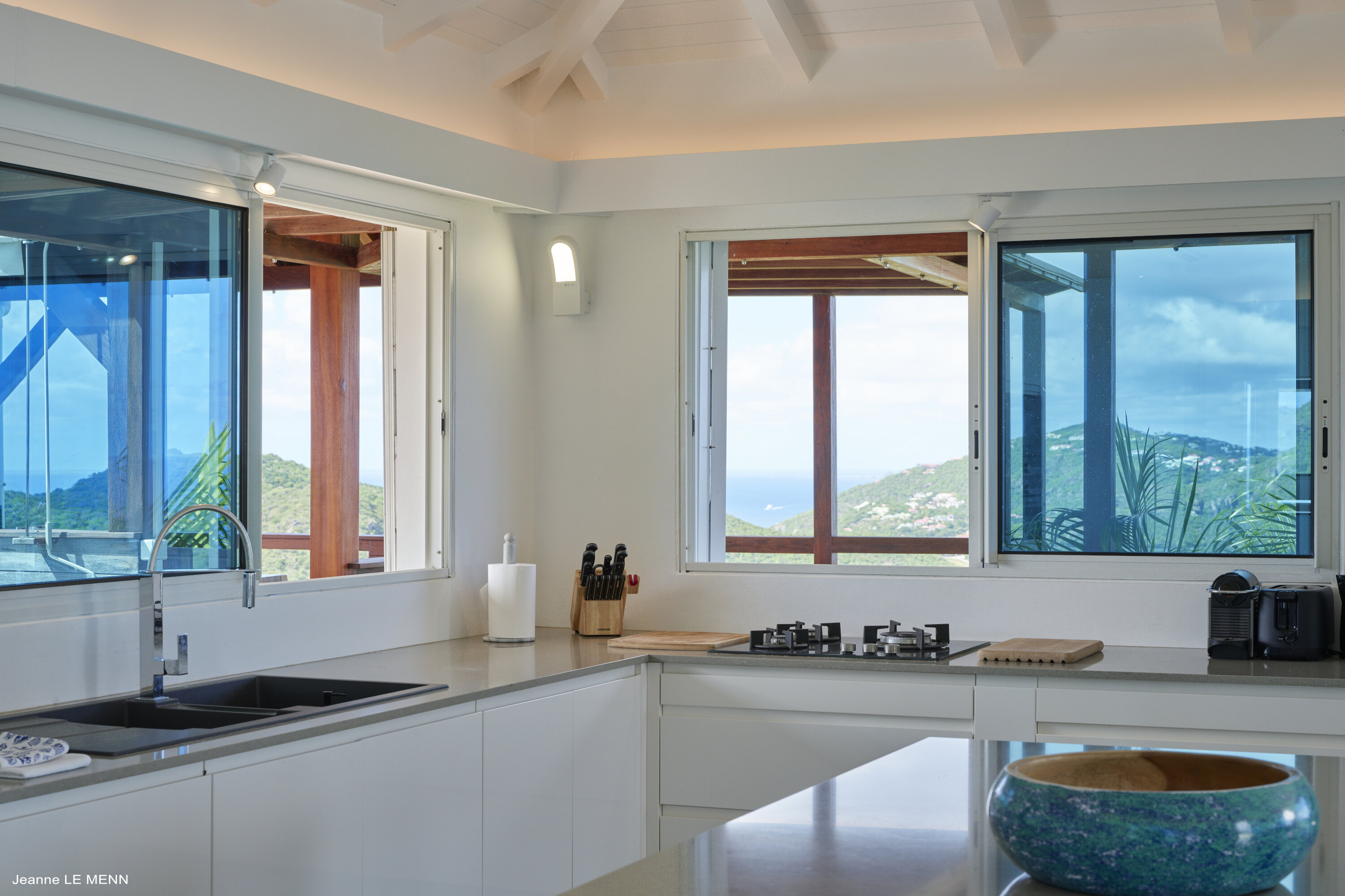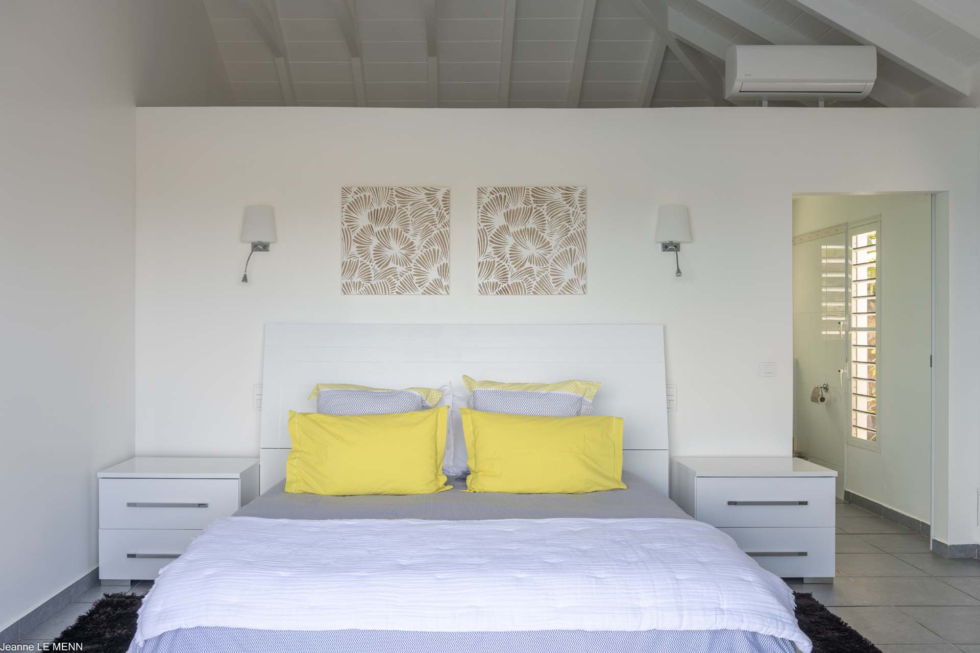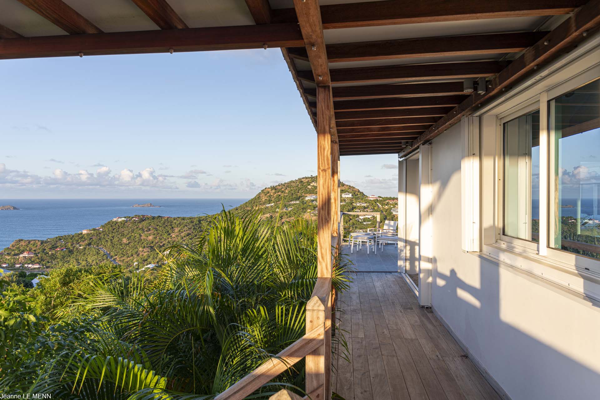 Poised high on the St. Jean hillside, this two bedroom deluxe villa offers privacy and a spectacular view of St. Jean Beach and the bustling little airport’s arrivals and departures in the distance. The entrance is graced with a lily pond, and the main house includes airy living spaces with contemporary décor in an all-white palette. A well-equipped kitchen, an adjoining dining area, and a guest bath are all in the main house as well. Two of the bedrooms (king platform beds) are in an adjacent pavilion and are identical in size. They feature en suite baths with double vanities and vessel sinks, access to the pool terrace and a fabulous view. The 3rd en suite bedroom, also with an ocean view, has a deck, and is privately situated on the lower levelThe focal point of the sunny terrace is a delightful infinity pool, heated in winter and chlorine-free; there are loads of outdoor living-and-relaxing spaces, including a covered dining terrace and a gazebo. Villa Ellede also features a fitness room. Techno amenities include U.S. Satellite, Wifi, and surround sound. Romantic enough for honeymooners, it would also be a great choice for vacationing friends.Please fill out the form to begin your inquiry and we will connect you with a seasoned villa rental specialist.