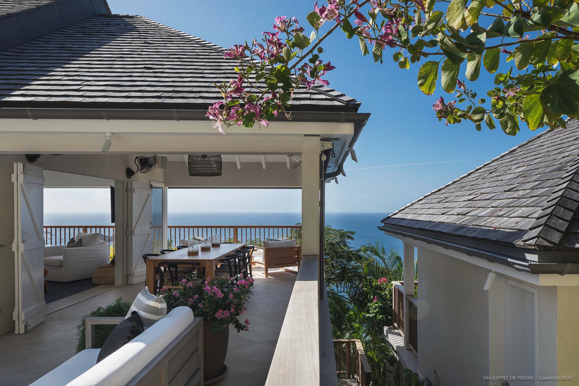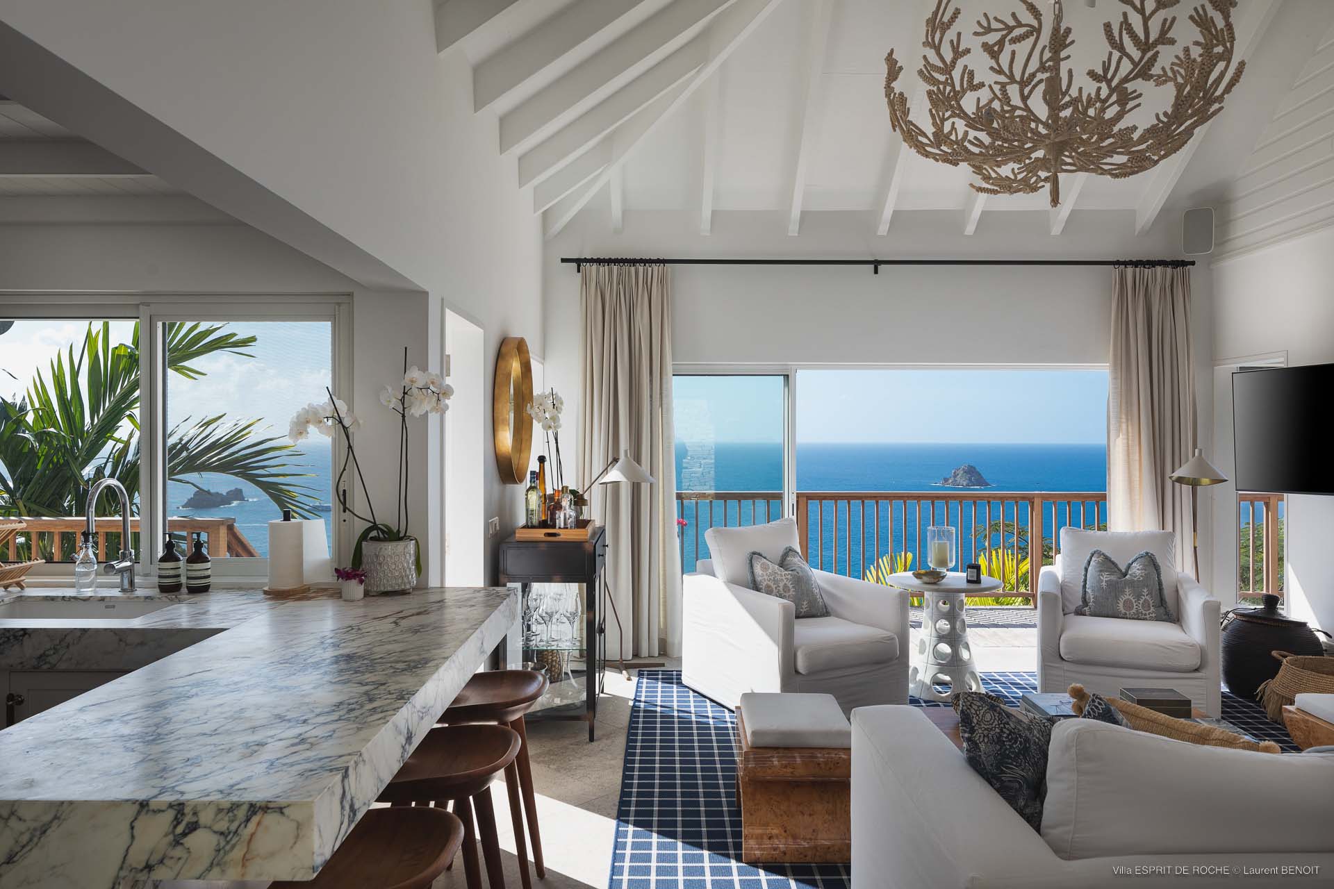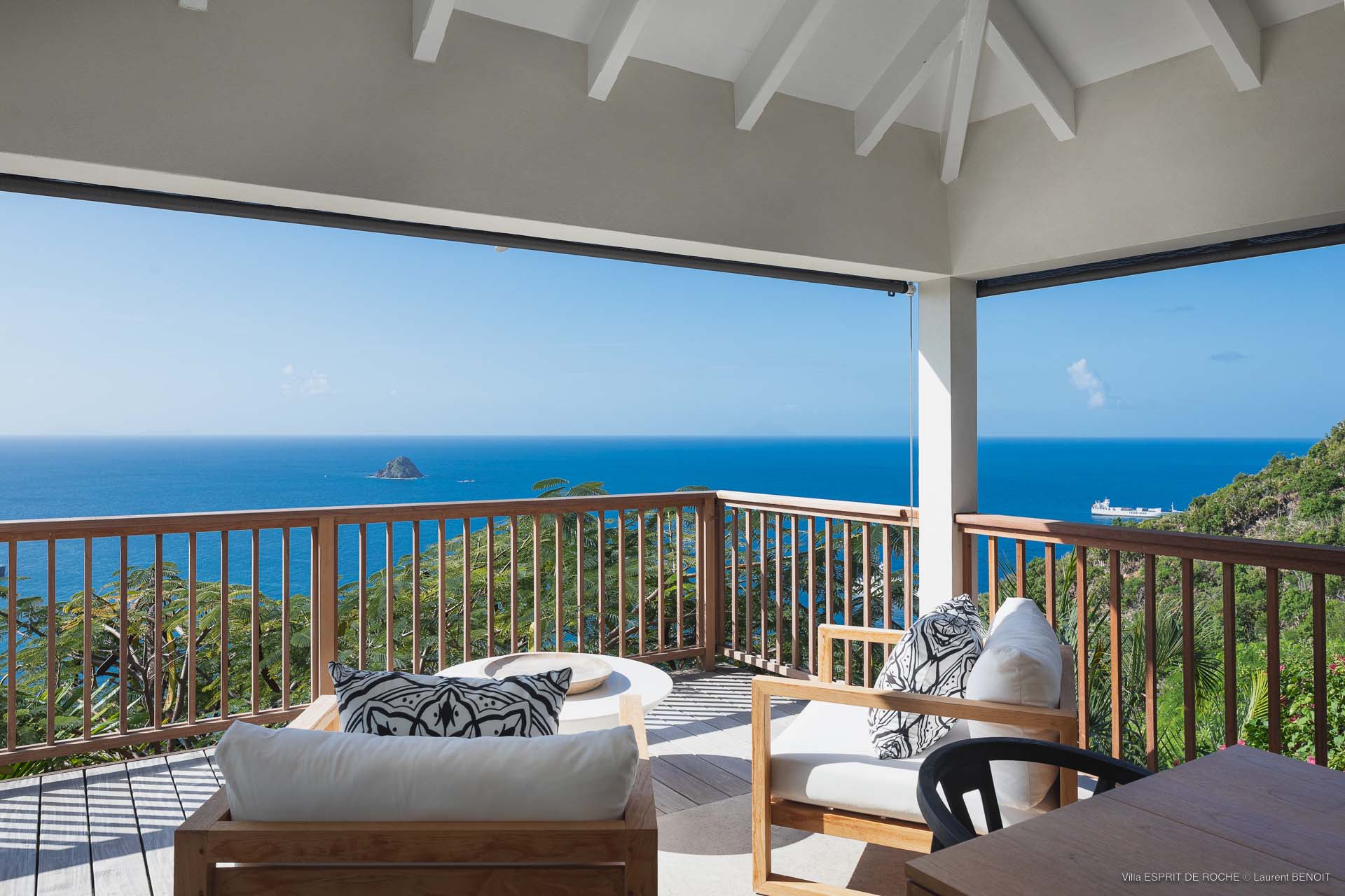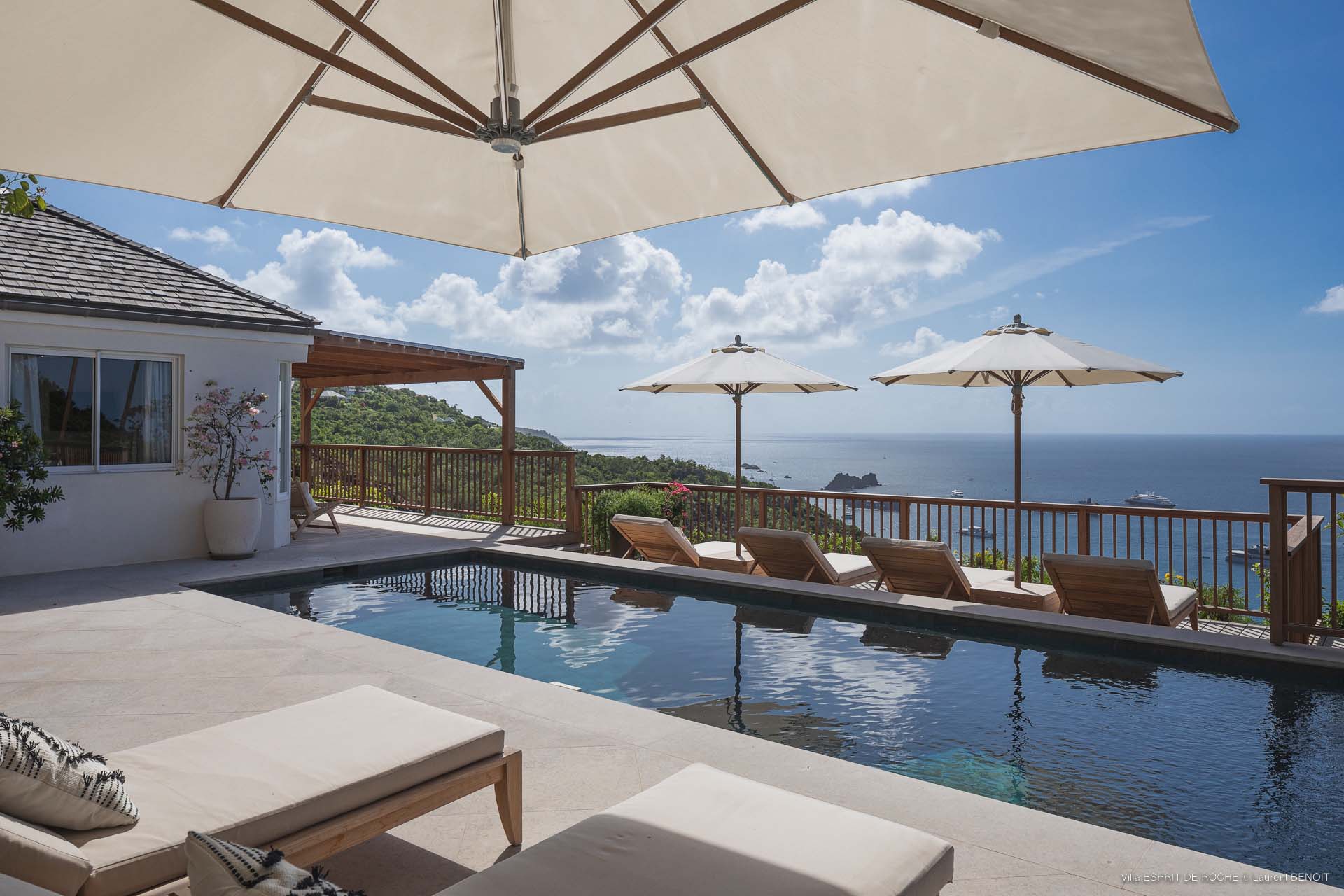 Ideally located in Colombier, a 3-bedroom Villa Esprit de Roche (villa code: WV EDR), treats its guests to a panoramic seascape that encompasses the neighboring islands of Nevis, St. Kitts, Statia, and Saba. Fiery sunsets are a bonus with an opportunity to witness the “green flash.” Totally renovated, and beautifully decorated, the villa’s main level encompasses a living room, kitchen with a breakfast bar, and a covered dining terrace, all with a stunning view of the sea. All three air-conditioned bedrooms have en suite baths and TVs. One bedroom is on the main level with a king bed and features a terrace. The second bedroom has a king or 2 twin beds and is located a few steps down in a separate pavilion with a private terrace. The lower-level master suite has a king bed and a terrace as well and is near the extra-large swimming pool. The pool area affords abundant space for sunning and outdoor living. Parking is ample.Please fill out the form to begin your inquiry and we will connect you with a seasoned villa rental specialist.