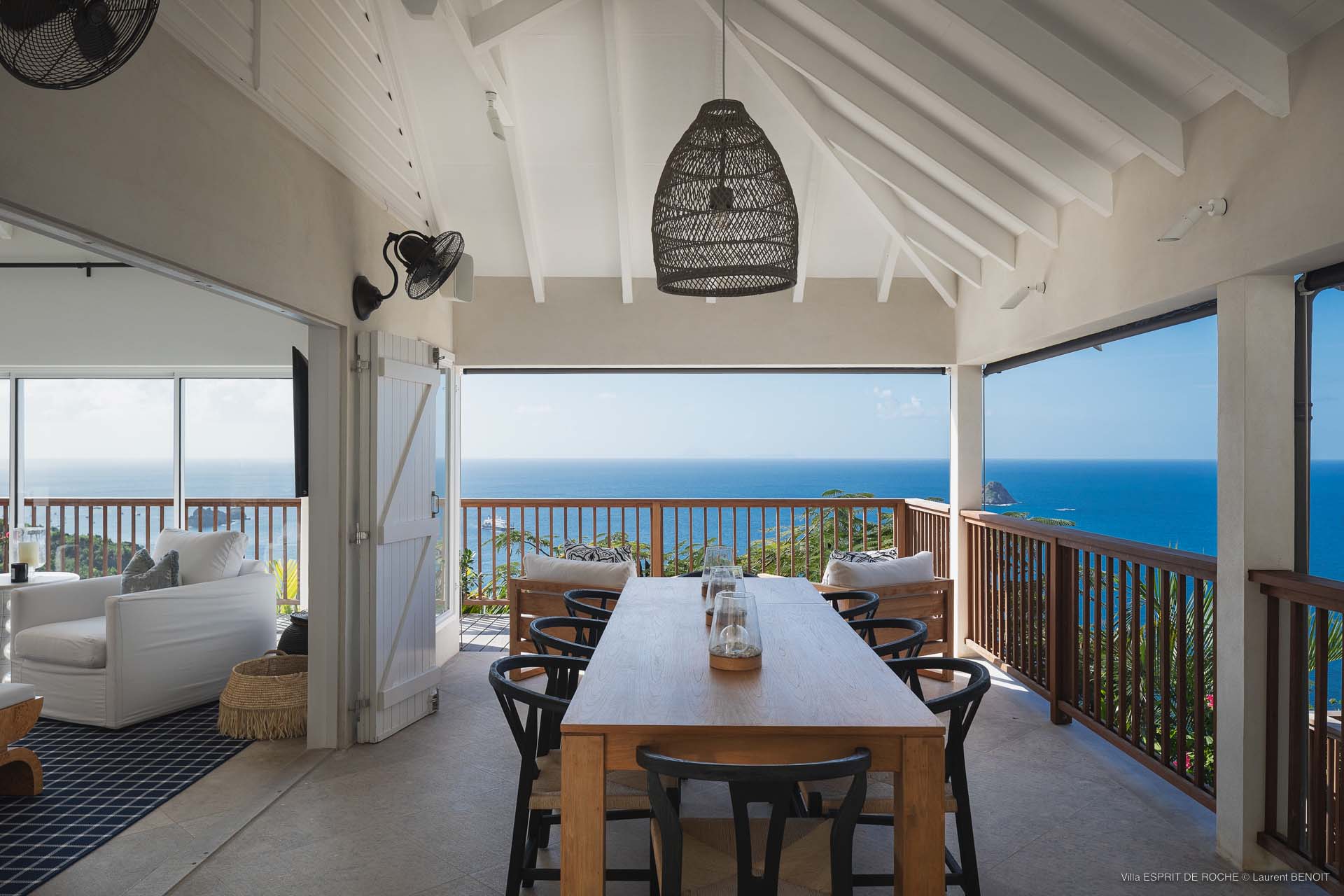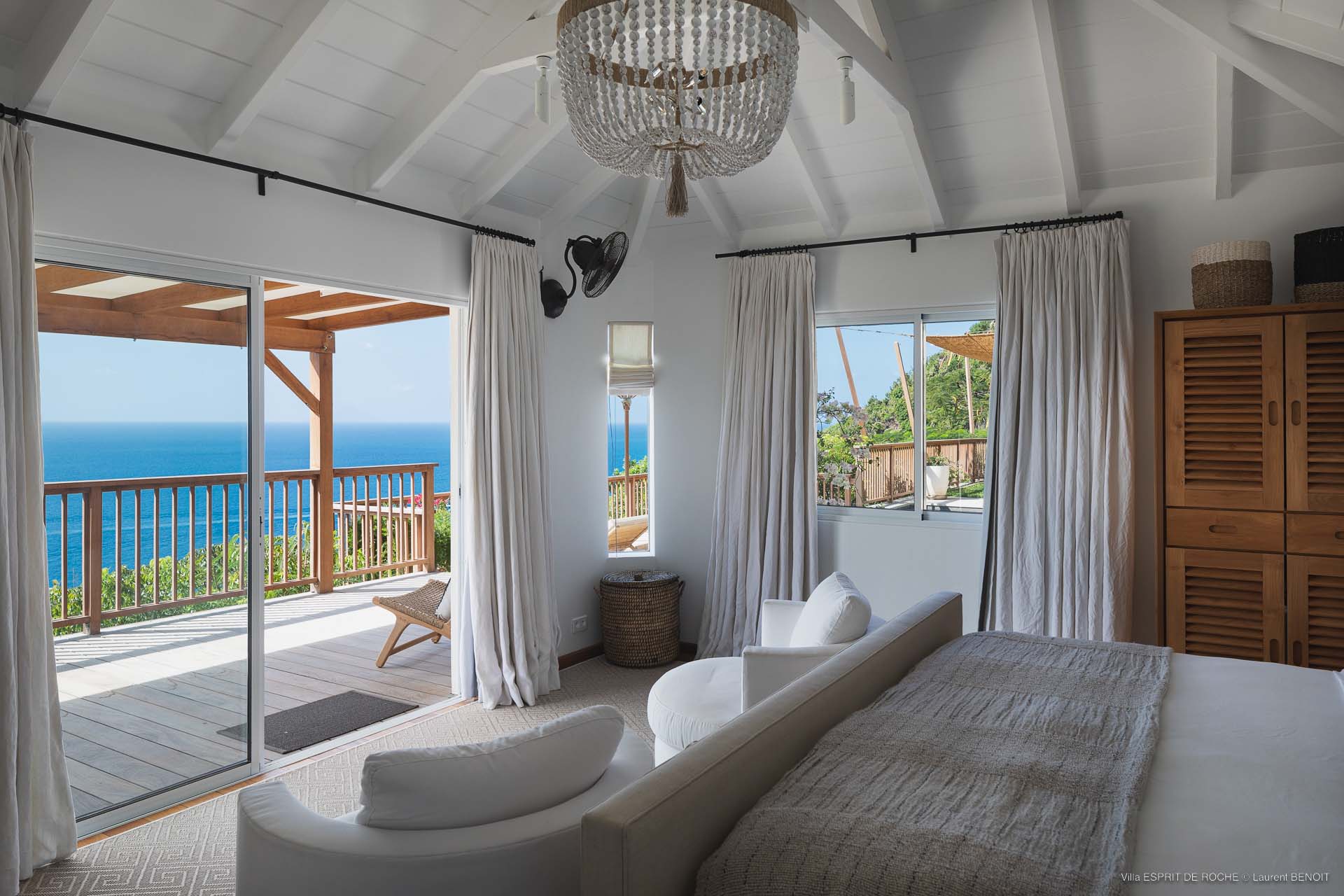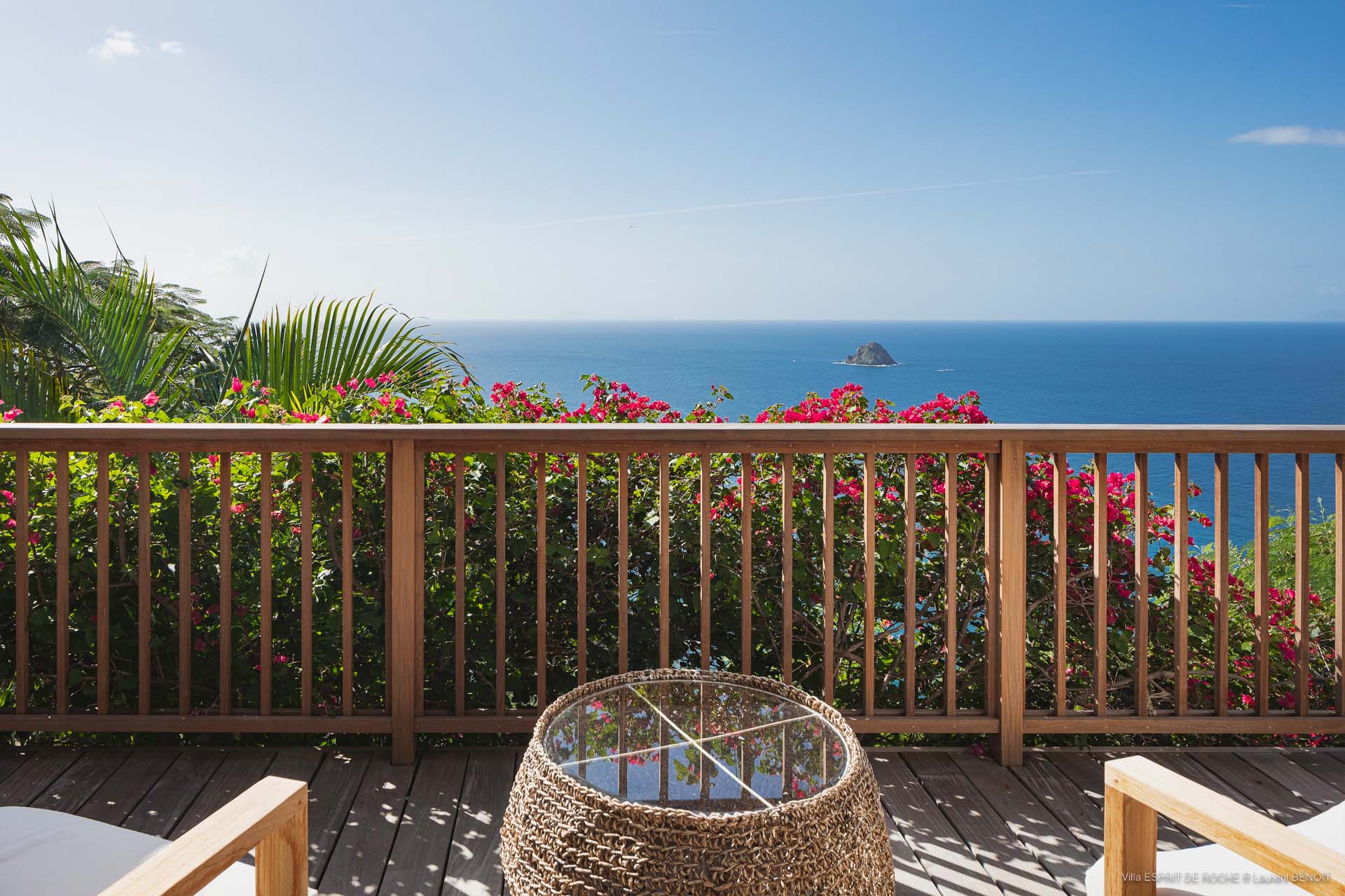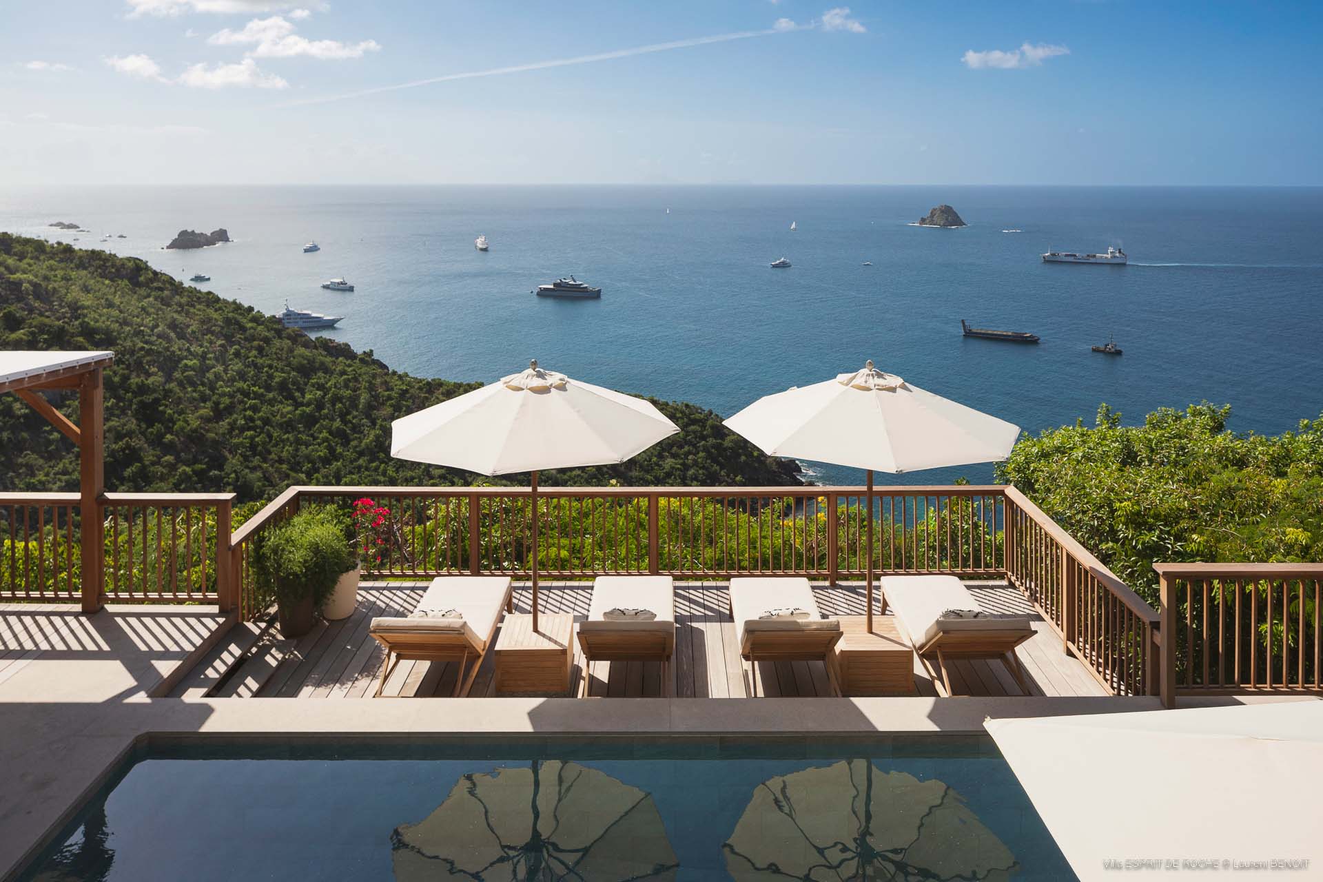 Ideally located in Colombier, a 3-bedroom Villa Esprit de Roche (villa code: WV EDR), treats its guests to a panoramic seascape that encompasses the neighboring islands of Nevis, St. Kitts, Statia, and Saba. Fiery sunsets are a bonus with an opportunity to witness the “green flash.” Totally renovated, and beautifully decorated, the villa’s main level encompasses a living room, kitchen with a breakfast bar, and a covered dining terrace, all with a stunning view of the sea. All three air-conditioned bedrooms have en suite baths and TVs. One bedroom is on the main level with a king bed and features a terrace. The second bedroom has a king or 2 twin beds and is located a few steps down in a separate pavilion with a private terrace. The lower-level master suite has a king bed and a terrace as well and is near the extra-large swimming pool. The pool area affords abundant space for sunning and outdoor living. Parking is ample.Please fill out the form to begin your inquiry and we will connect you with a seasoned villa rental specialist.