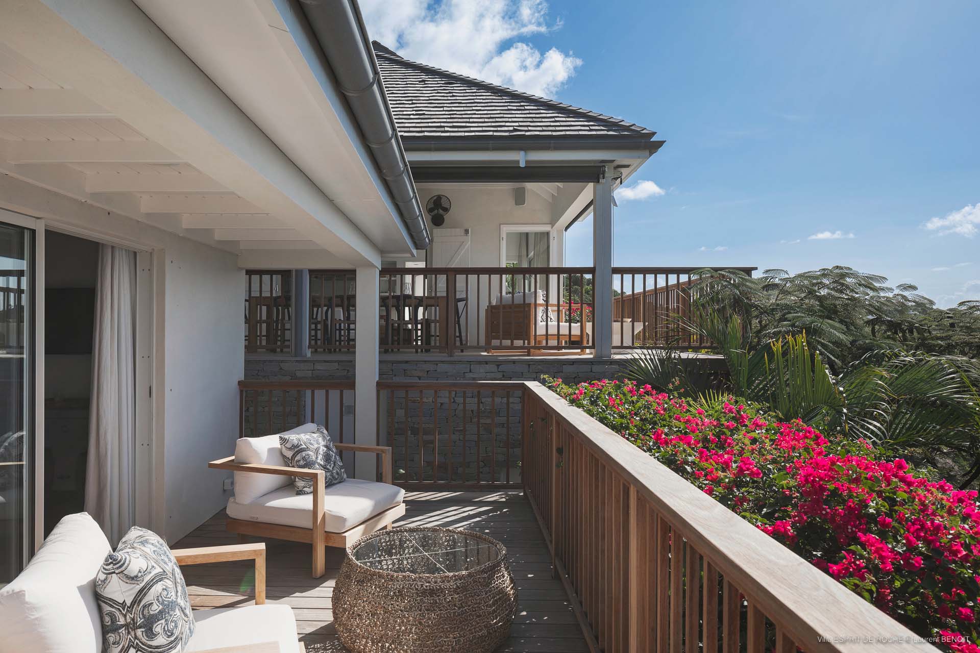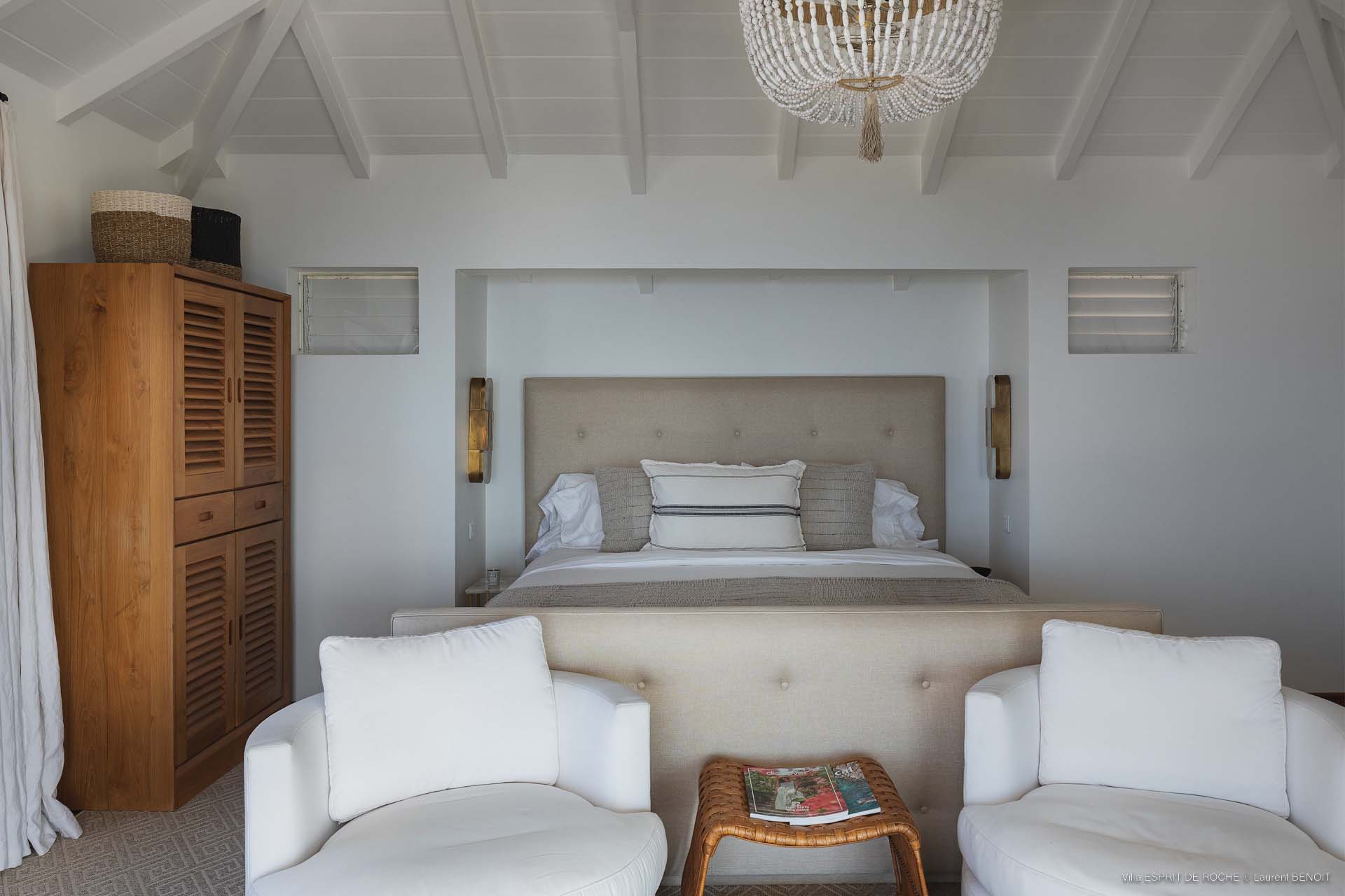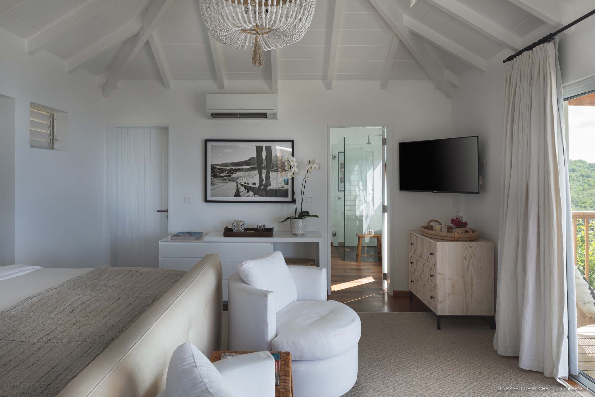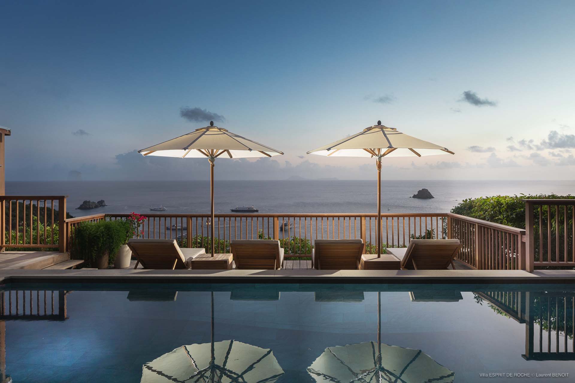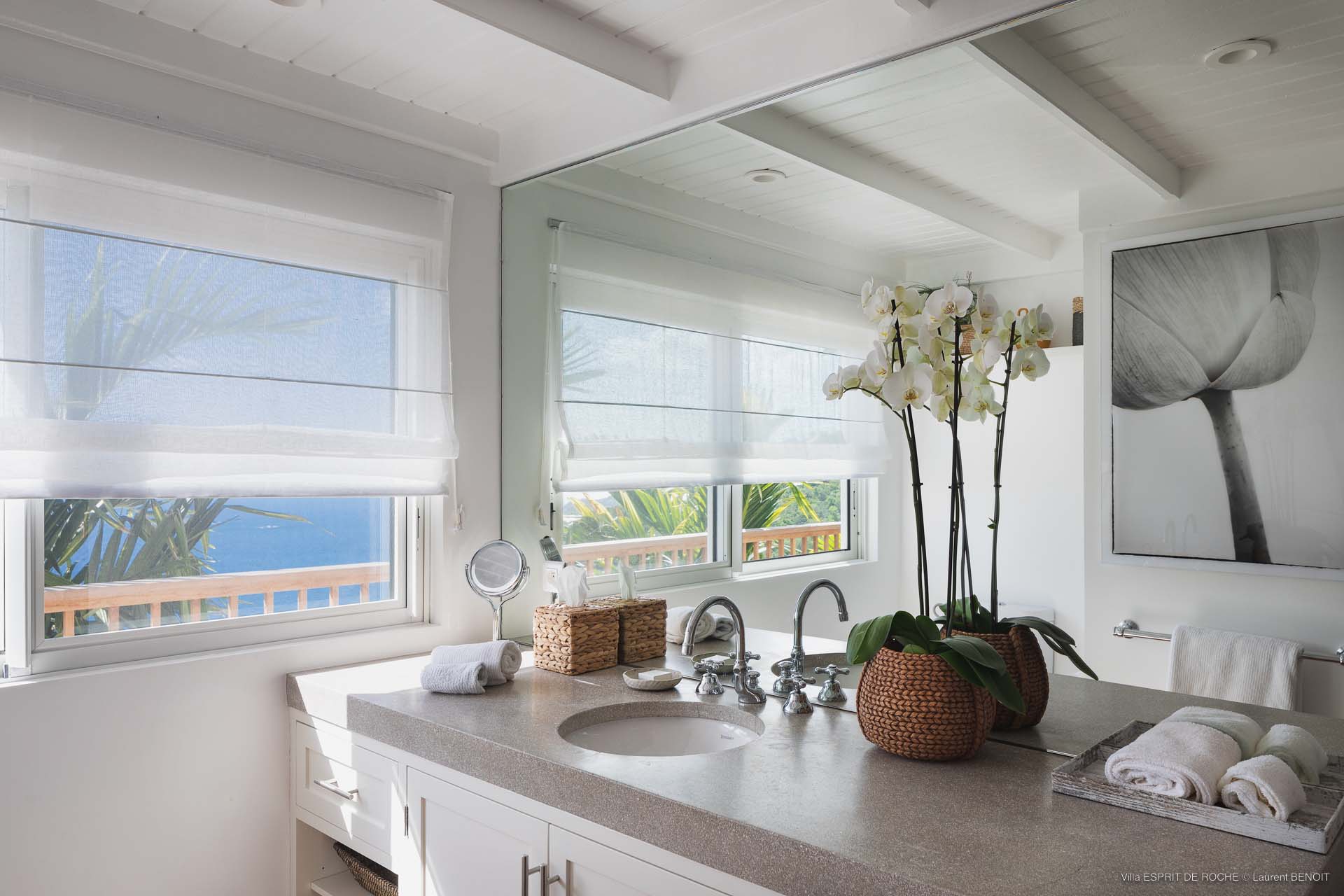 Ideally located in Colombier, a 3-bedroom Villa Esprit de Roche (villa code: WV EDR), treats its guests to a panoramic seascape that encompasses the neighboring islands of Nevis, St. Kitts, Statia, and Saba. Fiery sunsets are a bonus with an opportunity to witness the “green flash.” Totally renovated, and beautifully decorated, the villa’s main level encompasses a living room, kitchen with a breakfast bar, and a covered dining terrace, all with a stunning view of the sea. All three air-conditioned bedrooms have en suite baths and TVs. One bedroom is on the main level with a king bed and features a terrace. The second bedroom has a king or 2 twin beds and is located a few steps down in a separate pavilion with a private terrace. The lower-level master suite has a king bed and a terrace as well and is near the extra-large swimming pool. The pool area affords abundant space for sunning and outdoor living. Parking is ample.Please fill out the form to begin your inquiry and we will connect you with a seasoned villa rental specialist.