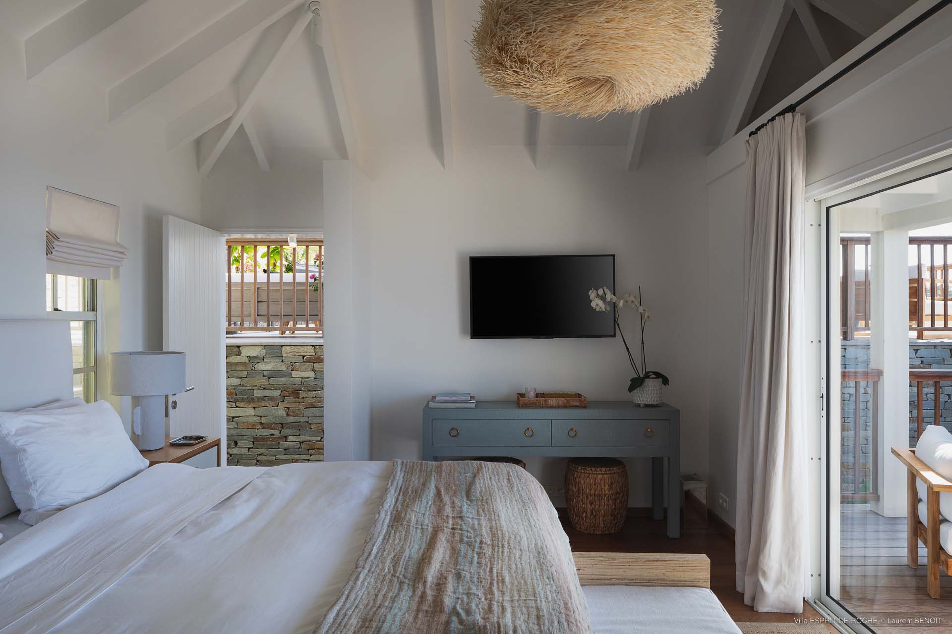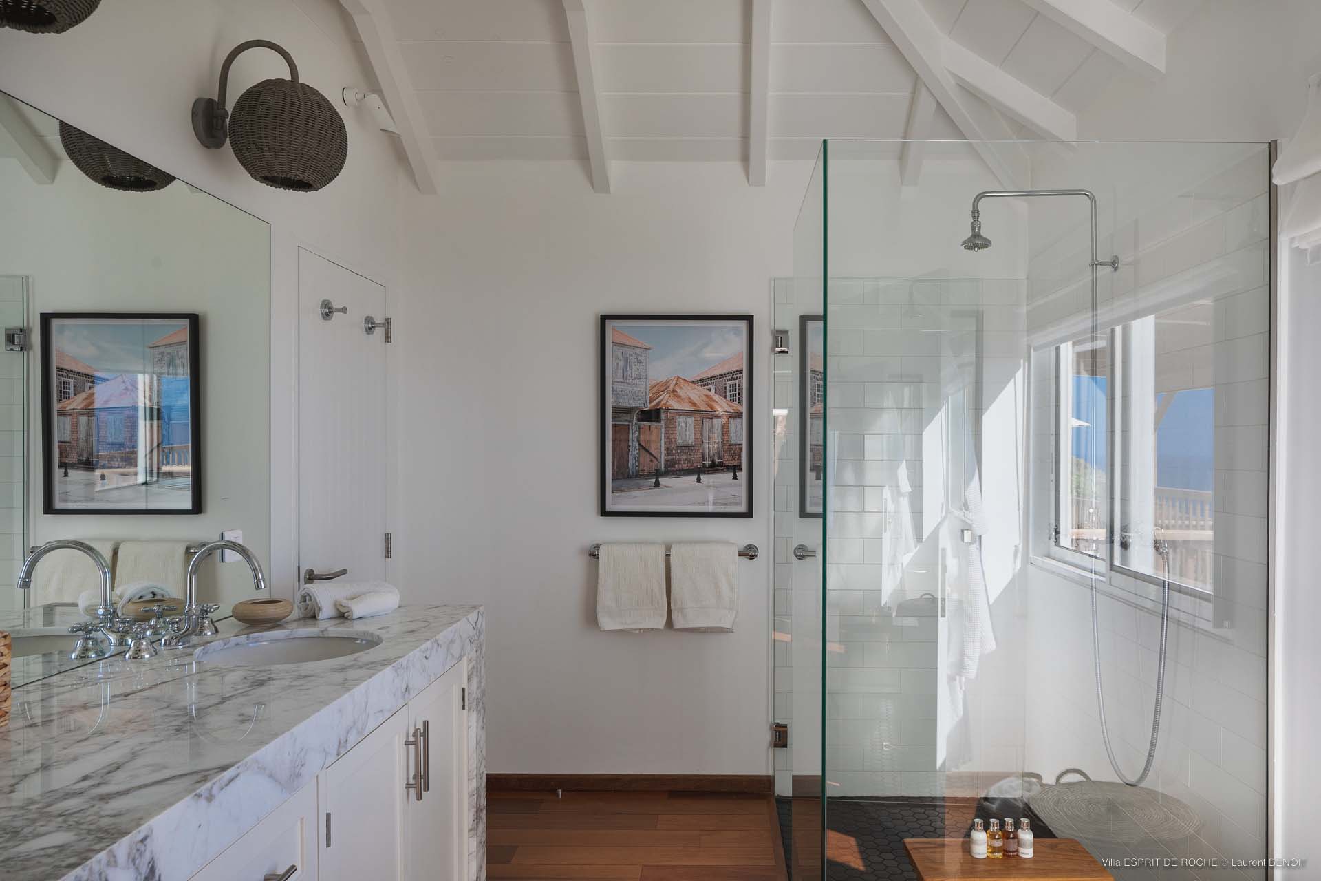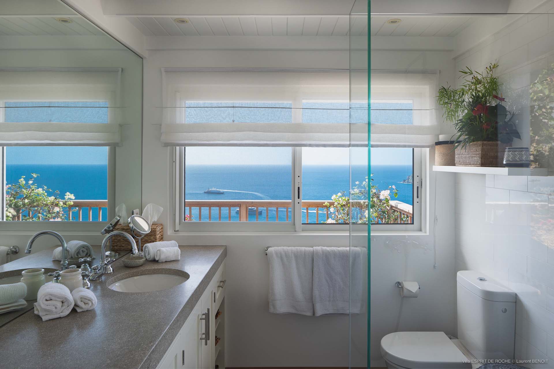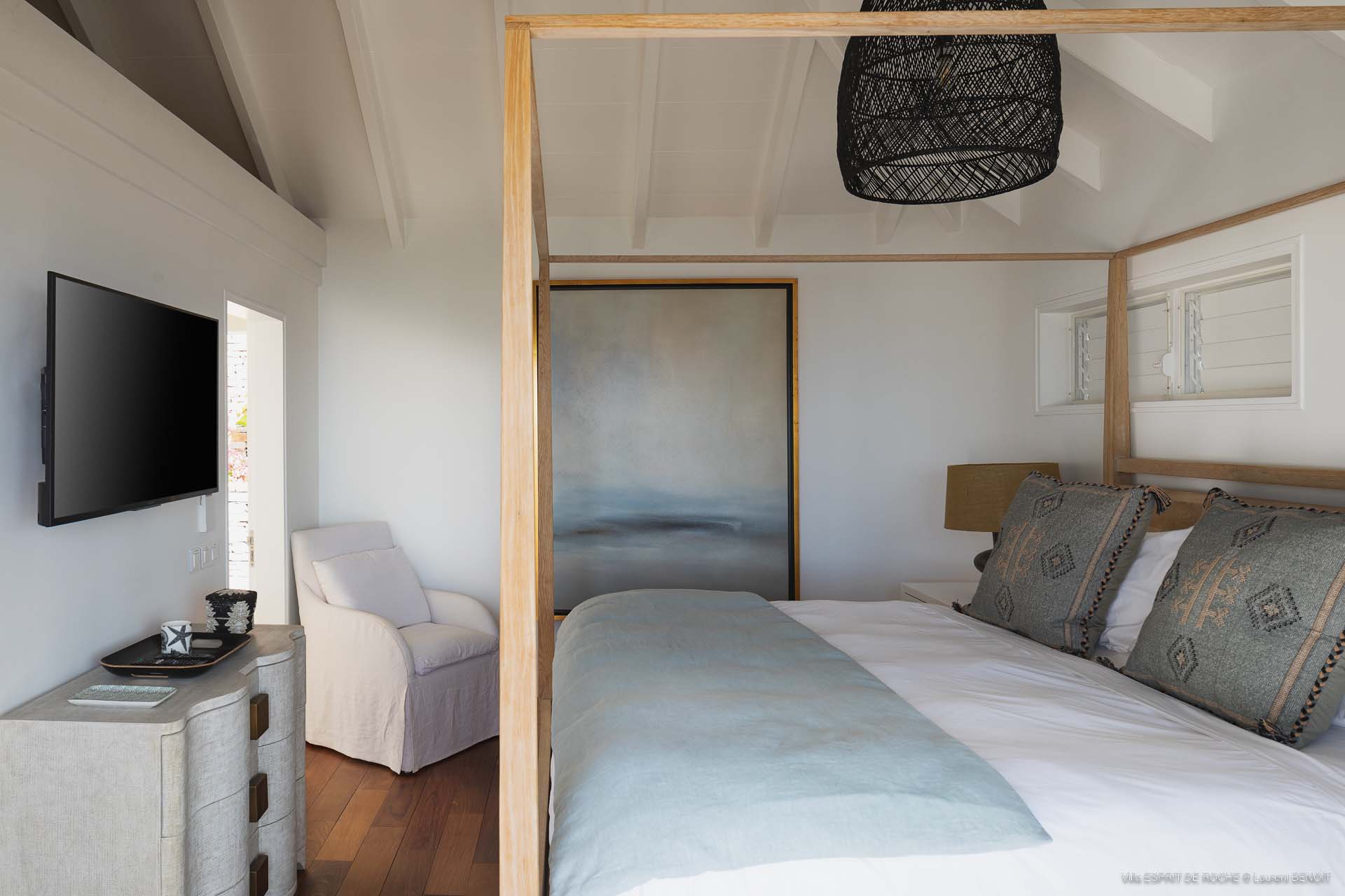 Ideally located in Colombier, a 3-bedroom Villa Esprit de Roche (villa code: WV EDR), treats its guests to a panoramic seascape that encompasses the neighboring islands of Nevis, St. Kitts, Statia, and Saba. Fiery sunsets are a bonus with an opportunity to witness the “green flash.” Totally renovated, and beautifully decorated, the villa’s main level encompasses a living room, kitchen with a breakfast bar, and a covered dining terrace, all with a stunning view of the sea. All three air-conditioned bedrooms have en suite baths and TVs. One bedroom is on the main level with a king bed and features a terrace. The second bedroom has a king or 2 twin beds and is located a few steps down in a separate pavilion with a private terrace. The lower-level master suite has a king bed and a terrace as well and is near the extra-large swimming pool. The pool area affords abundant space for sunning and outdoor living. Parking is ample.Please fill out the form to begin your inquiry and we will connect you with a seasoned villa rental specialist.