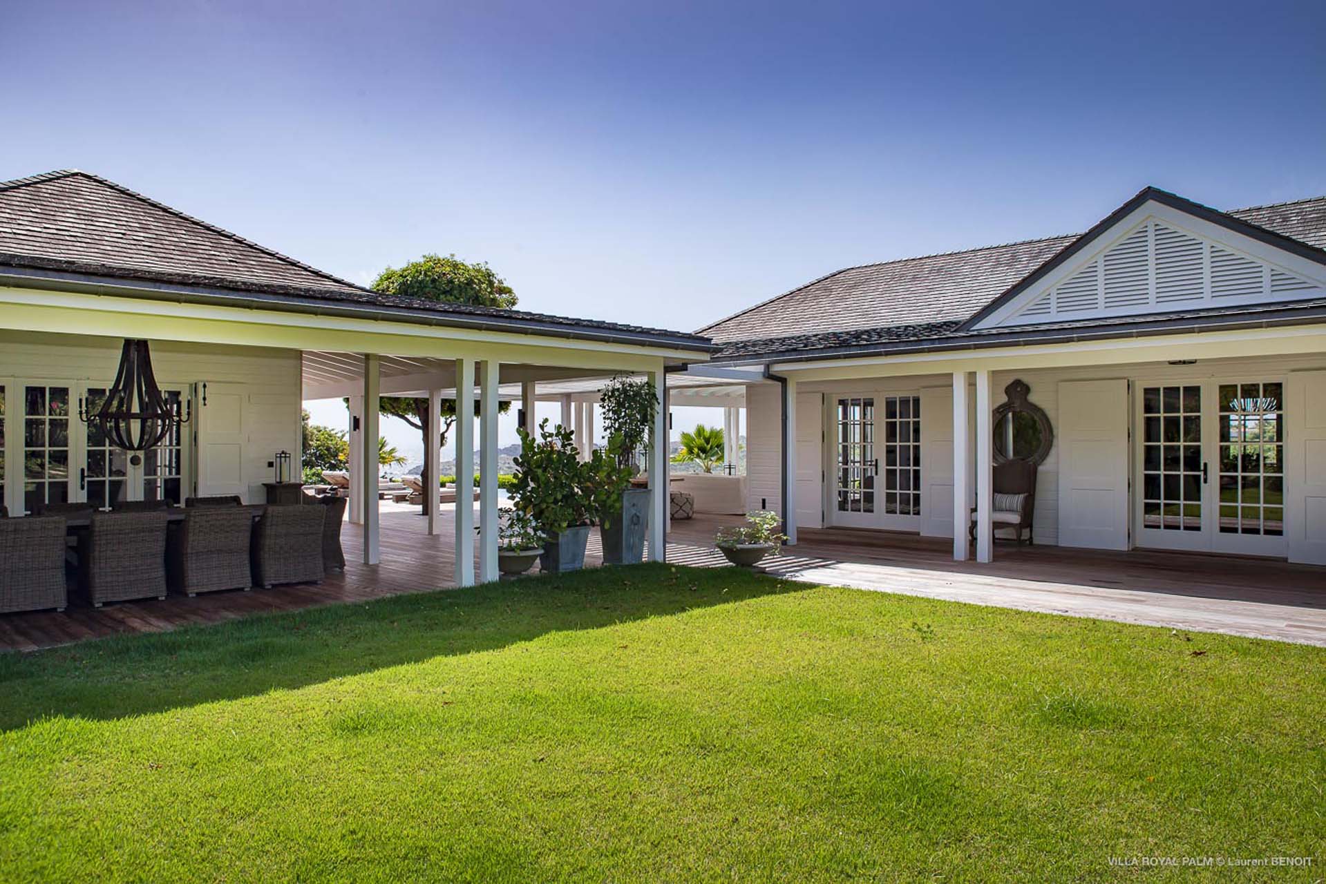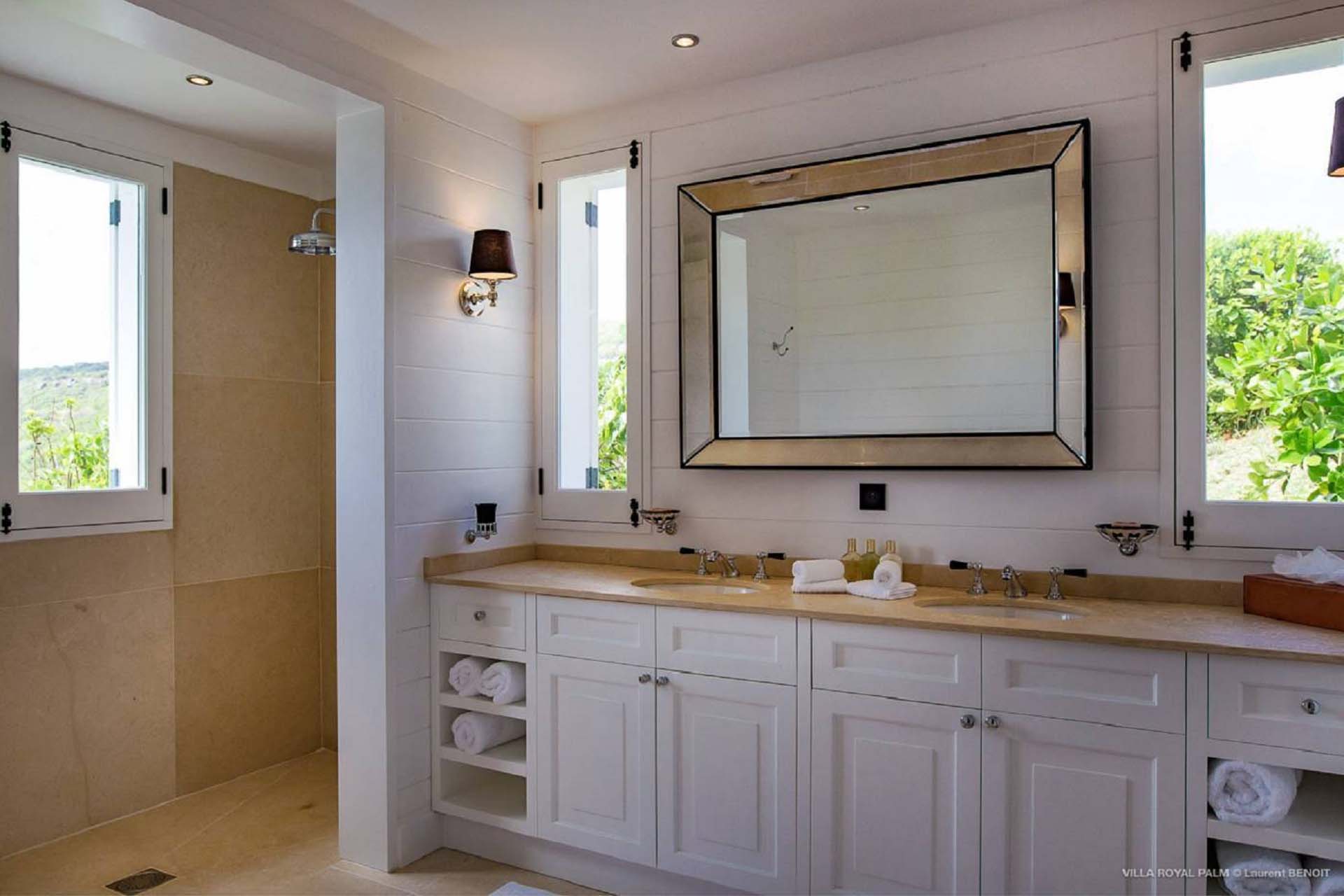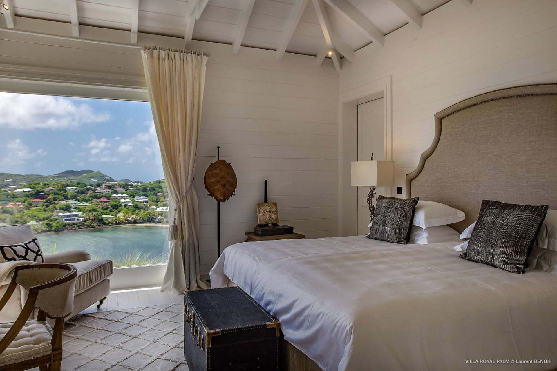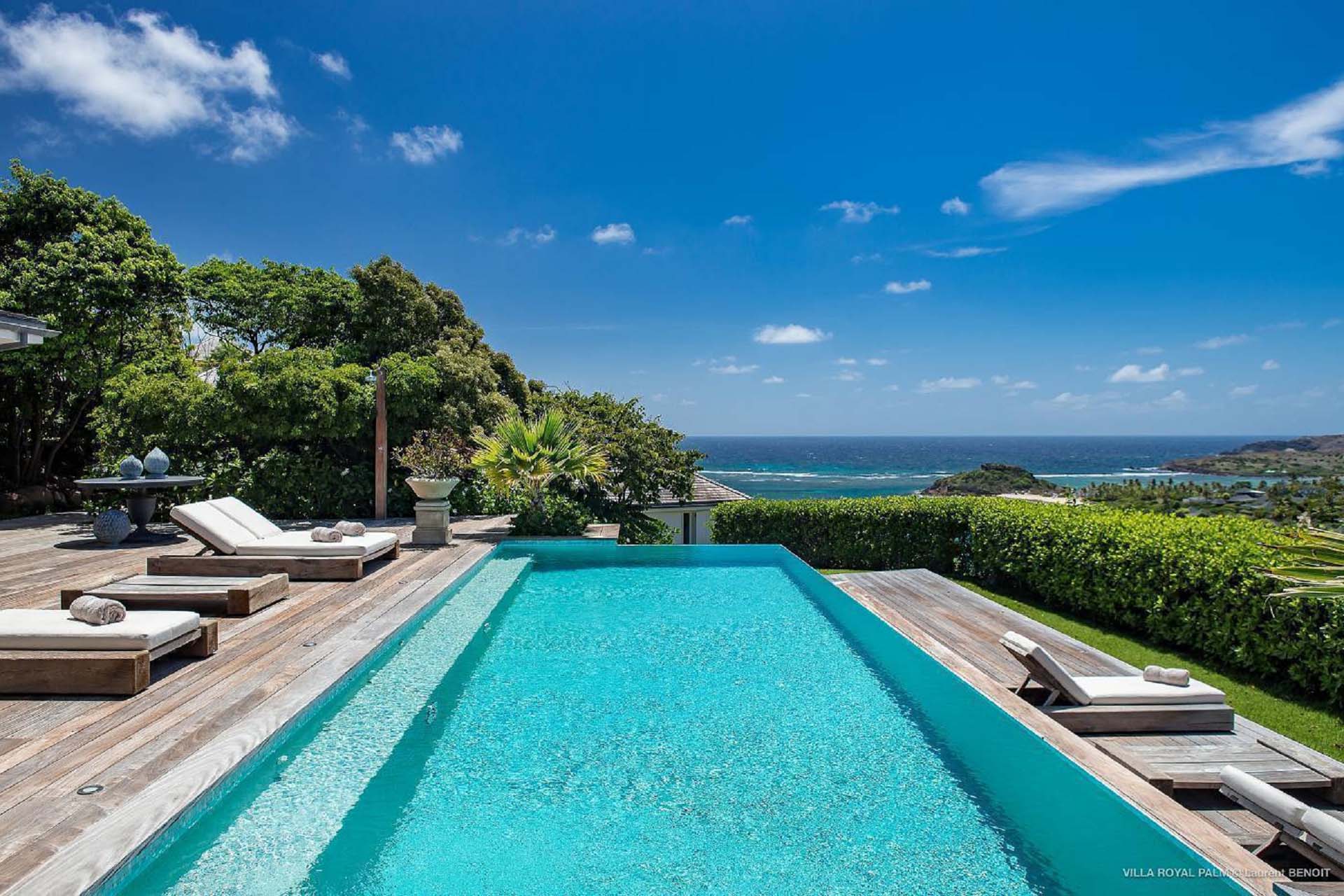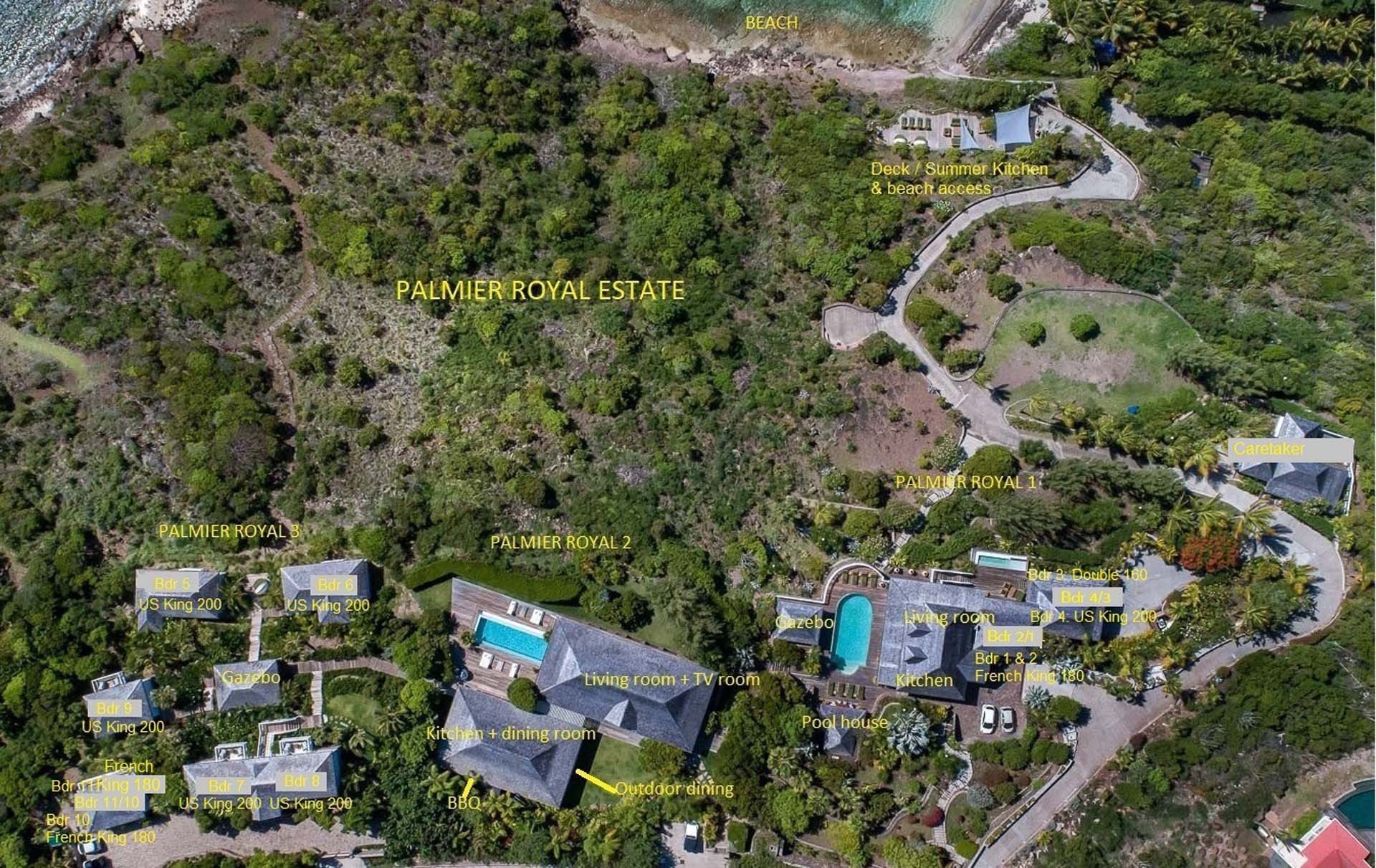Palmier Royal Estate, (villa code: WV EPR) is a large compound, consisting of 2 large villas with a total of 11 bedrooms, 3 pools, and direct water access to the protected bay of Marigot. Palmier Royal Estate is not just a villa, it's a statement and the epitome of luxury. With fitness and massage rooms, 2 gourmet kitchens, and a beautiful terrace just above the water which allows access to the water for swimming, or to explore the nature reserve that is Marigot Bay on a paddleboard or canoe. The estate consists of 2 separate villas with annexes, built in a contemporary West Indies style, and are all connected by wooden walkways adorned by tropical gardens. One villa has 4 bedrooms, of which 2 are full masters and 2 guest rooms, the other has 7 bedrooms, 2 are master suites, 3 guest rooms, and 2 smaller rooms, for a total of 11 bedrooms. Gorgeous views can be enjoyed from almost every corner of the estate and are arguably amongst the best views of Marigot Bay. The first villa has a large, air-conditioned main room consisting of a gourmet kitchen, a living area, and a loft/TV area for kids. A large, heated pool is the centerpiece of the spacious terrace along with a pool house and covered dining area. Comfortable seating underneath a gazebo allows you to enjoy the breezes and views, while in the shade. The 2 master bedrooms are accessed from the covered terrace. Each has a Euro king-sized bed and ensuite bathroom with both shower and bathtub, dressing area, U.S. satellite, Apple TV, and Sonos. Directly below the 2 master bedrooms are 2 bedrooms each with a Euro king-sized bed, ensuite bathroom with and U.S. satellite, Apple TV, and Sonos. All the way down the path is a large deck, just above the water with direct access to the protected bay, where turtles swim freely. There's ample seating on the deck, with loungers and a large table for waterfront dining. The second villa is just a few steps above the main level of the first. This villa includes a large fitness room with a bathroom and massage room. On the main level are two separate bungalows that are fully air-conditioned. The first is the spacious living room with comfortable seating and the second is a large gourmet kitchen with a breakfast corner and a large grilling area outside with covered dining. The deck ends in a heated infinity pool and a separate gazebo. The bedrooms of the 2nd villa are in 6 separate pavilions. 2 master suites are on the lowest level, each in a separate bungalow. Both come with a Euro king-sized bed, dressing area, and an ensuite bathroom with a shower, as well as an outdoor bathroom with a shower and bathtub. A cozy balcony out front is perfect to enjoy the view. There are 3 guest bedrooms, all with Euro king-sized beds and ensuite bathrooms; and 2 smaller guest rooms are situated in a separate pavilion at street level and separated by a common area. Each room has a Euro king-sized bed, dressing area, and an ensuite bathroom with a shower, as well as a private balcony with seating. During the high season only, guests at the villa enjoy the services of a private chef and waitress (food not included), along with two maids providing daily service and turndown, seven days a week. A mini fridge is stocked with still and sparkling water for your convenience. For on-the-water adventures, guests have access to two paddle boards, two kayaks, and four life jackets. Please note: a security deposit of $10,000 is required.Please fill out the form to begin your inquiry and we will connect you with a seasoned villa rental specialist.