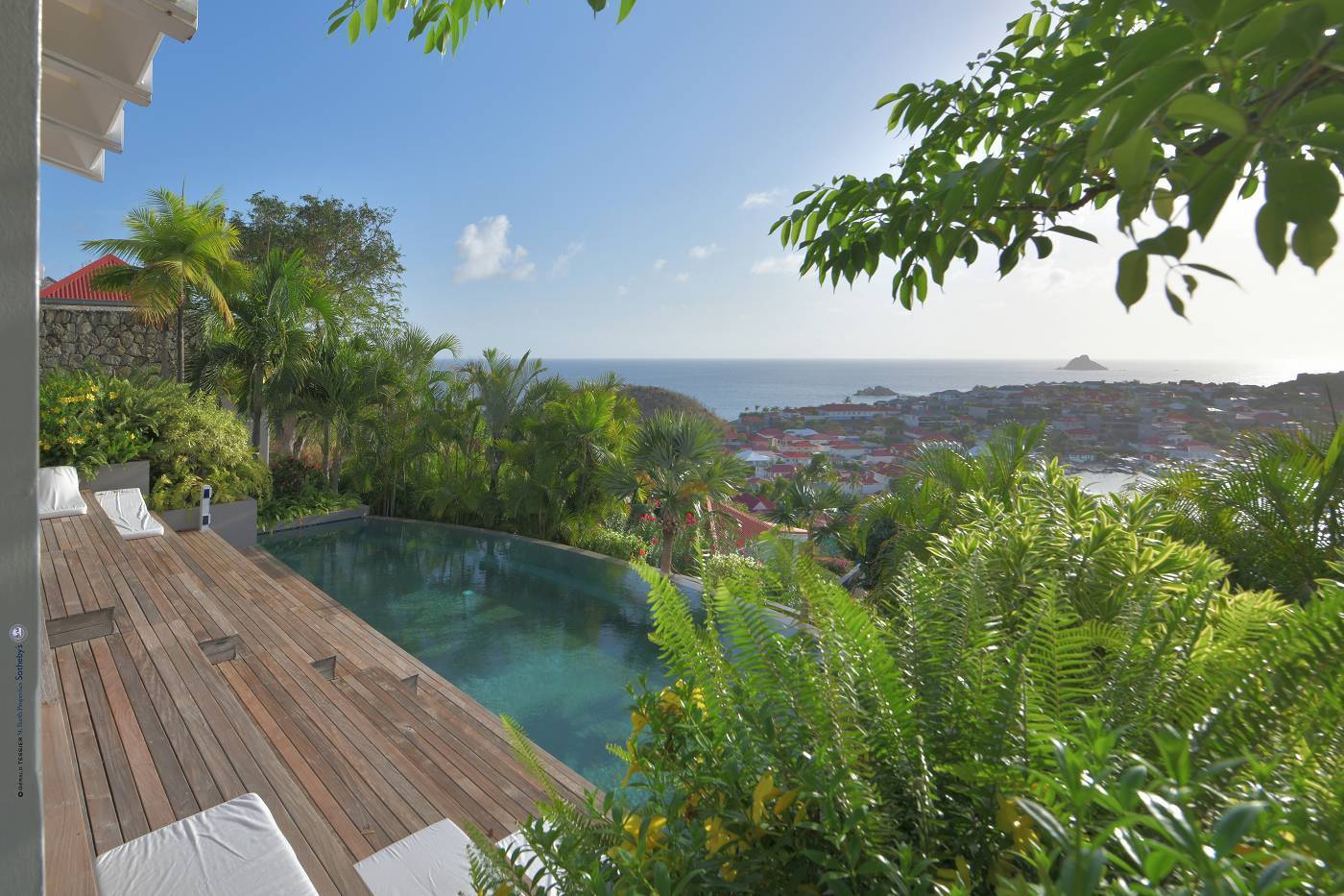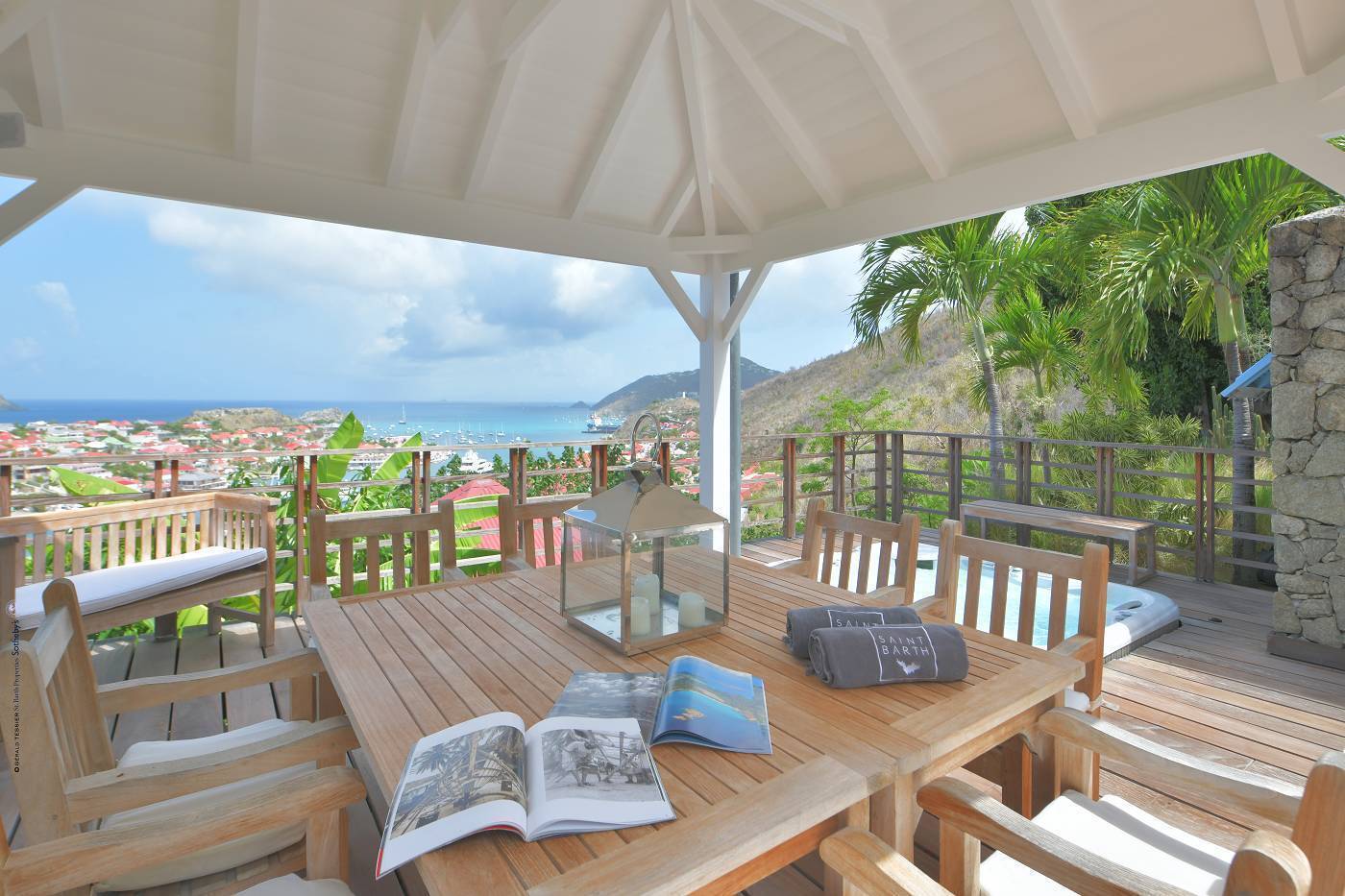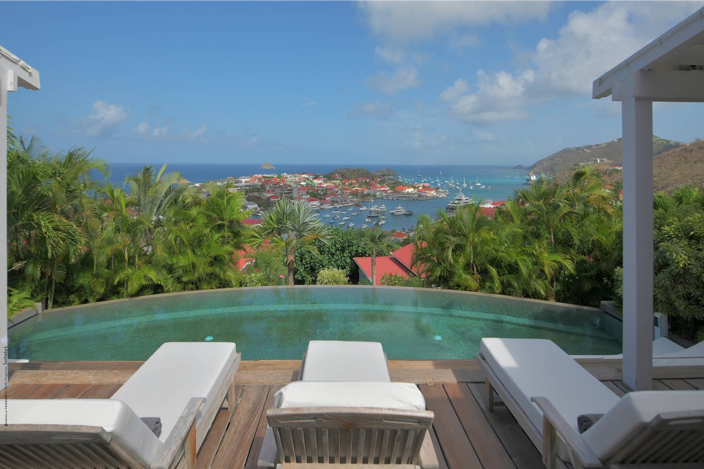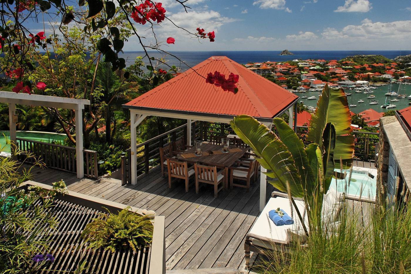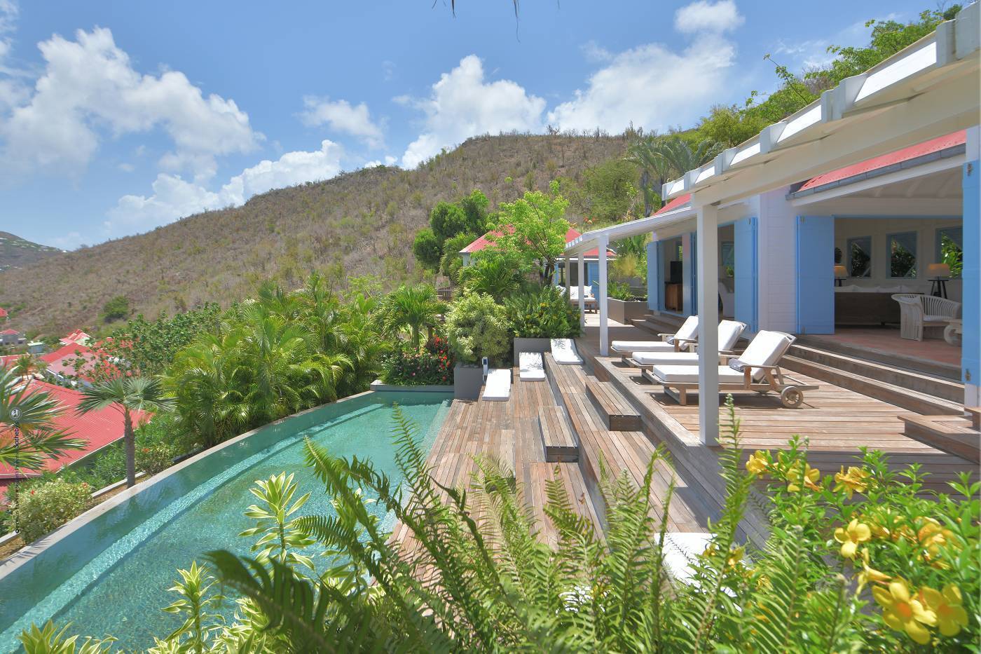 Castaway to Villa Fabrizia (villa code: WV FAB), a magnificent 8-bedroom villa located in Gustavia, St. Barts. This hillside villa offers panoramic views of the harbor and spectacular sunsets, all within a short walk of restaurants, shopping, and nightlife. Bright, colorful, and luxurious, this property is all about Caribbean chic. Casual yet elegant décor adds tropical touches to each room, connected with a breezy open-plan design. Split between a series of Creole-style pavilions, Villa Fabrizia is a gorgeous mix of comfortable interiors, lush gardens, and sunny terraces. Located in the hills above the capital city, Villa Fabrizia provides easy access to the boutiques, restaurants, and nightlife of Gustavia. Shell Beach is just a short walk away, while Gouverneur Beach is a 5-minute drive. The living spaces at Villa Fabrizia are split across a series of pavilions on a hillside, all open to outdoor terraces. On the middle level of the property is the main pavilion, with the living room on one side and the kitchen and dining room on the other. The living room has comfortable sofas and vibrant pops of color. The doors open to the harbor views and ocean breeze, making this a great spot to relax with friends and family. If you’re after some quiet time, in a separate pavilion is the villa’s library, with a cozy sofa and a great selection of books. The modern kitchen at Villa Fabrizia is well-equipped to handle any culinary challenge thrown its way. Our concierge can organize grocery pre-stocking or delivery, catered meals, or arrange private chef service for a special occasion. When it’s time to dine, all that’s left to do is to choose where. An indoor dining area next to the kitchen is a fantastic choice, while outside a dining gazebo offers a chance for open-air meals. Enjoying dinner with the twinkling lights of Gustavia Harbor below is a fabulous way to make the most of your vacation. There’s a total of 8 bedrooms at Villa Fabrizia, spread out in pavilions across the upper and lower levels. Dual staircases (approximately 24 steps) lead you to the upper level, where there are four bedrooms. All of these bedrooms feature double beds. Four more bedrooms are located on the lower level (approximately 44 steps). Two bedrooms have double beds while the third has twin beds. These bedrooms feature their own furnished terrace overlooking the Caribbean. The fourth room has 6 twin beds, a great option for kids. On the main level, a gorgeous boardwalk surrounds the inviting infinity pool. Steps leading down towards the water each have a comfortable sunbed, ideal for soaking up the island rays after a refreshing swim. From here, the views over Gustavia are amazing. As the sun starts to set, a covered lounge area between the living room and kitchen is a fabulous spot to admire the sunset. In the distance, you can see the islands of Saba, St. Kitts, and St. Eustatius twinkle to life. For days on the sand, the popular Shell Beach is a 5-minute walk away. Jumping in the car lets you explore the rest of St. Bart’s beaches with ease. On the south side of the island is Gouverneur Beach, a remote stretch of pristine sand just 5 minutes away by car. On the north side is St. Jean, where beach bars and restaurants line the water. During the December holidays, the villa rents at the full occupancy rate regardless of how many bedrooms are used. * Please note: Villa Fabrizia has numerous steps leading to the bedrooms so please be aware if there are young kids or people with mobility issues in your party.Please fill out the form to begin your inquiry and we will connect you with a seasoned villa rental specialist.