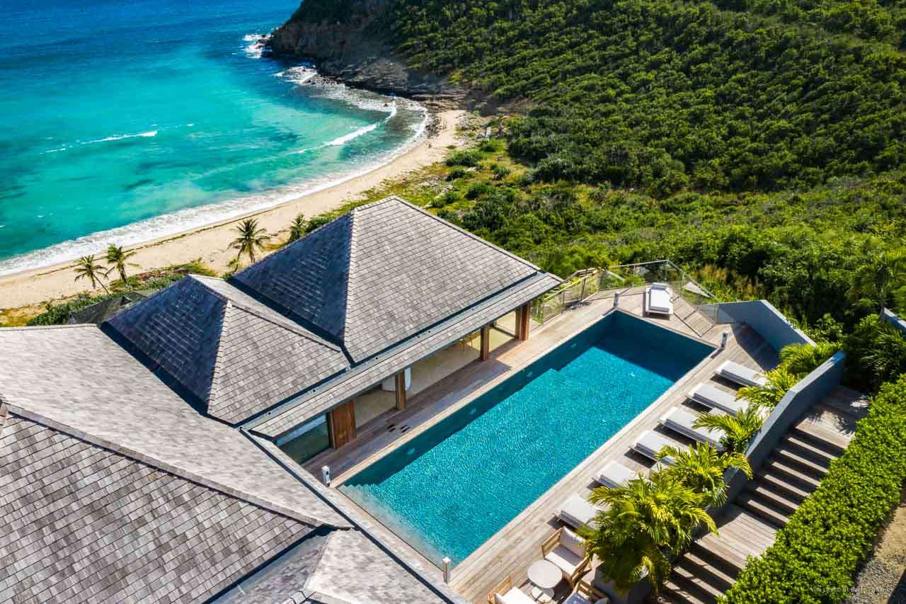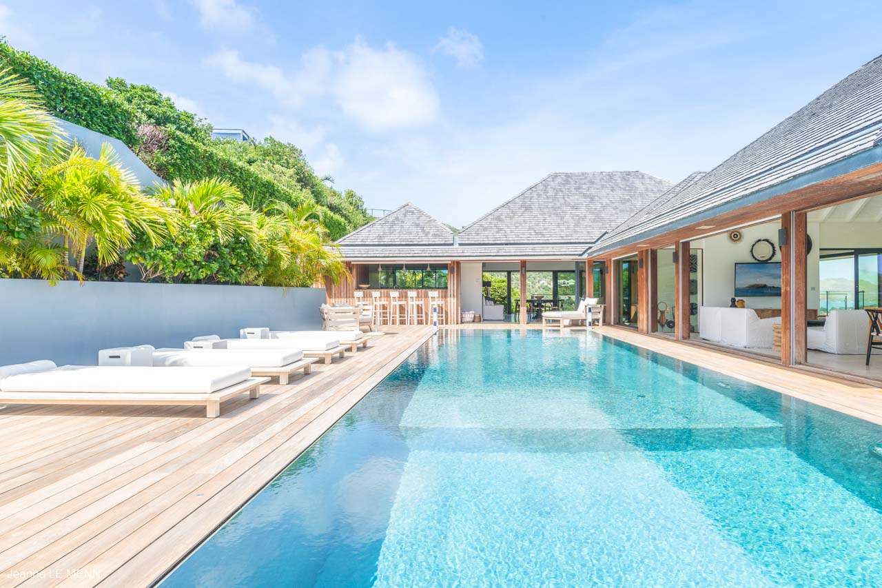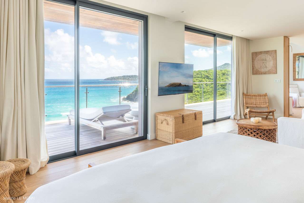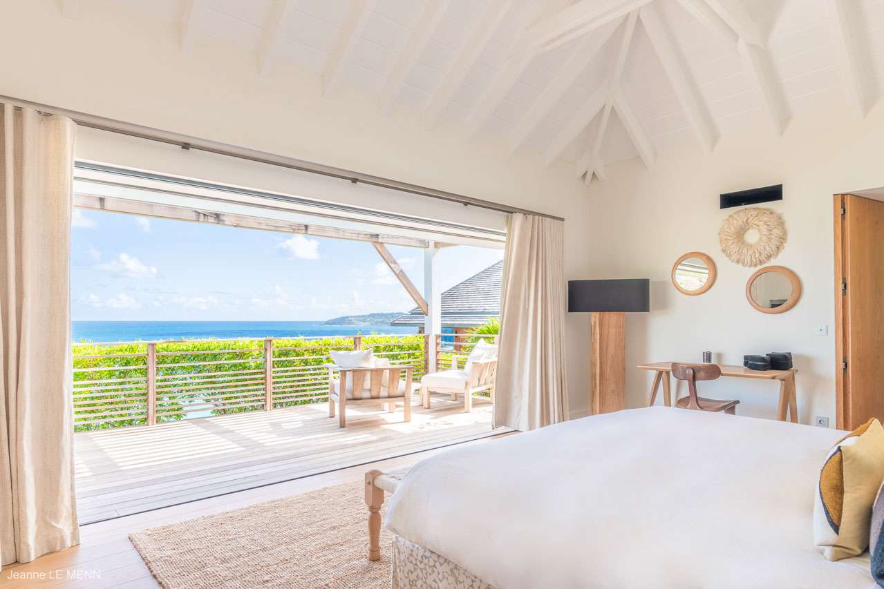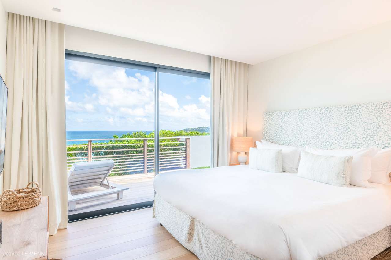 Villa Firefly, (villa code: WV FLY) is a 7-bedroom villa located in Anse des Cayes. This brand-new villa perched above the beach offers panoramic ocean views. The living room connects to the well-equipped kitchen and has ample seating. The dining room also serves as an annex living room with seating around a TV. The dining room, which has floor-to-ceiling glass doors, can be fully opened or closed off. The large gourmet kitchen has a bar, which leads out to the pool. Behind the living room is a separate bungalow with a master bedroom, which has a king-size bed, dressing area, an ensuite bathroom with an outdoor shower, and a small private terrace with seating. In between the living and dining rooms is a stairway descending to the other bedrooms, which are located on 2 different levels. The middle level has 2 spacious bedrooms mirrored across a hallway, each with a king-size bed, dressing area, and bathroom with an indoor shower, which has a sliding door to the outside. On the lowest level are 4 smaller bedrooms with king-size bed and a small bathroom with an indoor shower. The dining room protects the large pool from the prevailing winds. A deck with loungers surrounds the pool, making this an ideal spot for sunbathing. Due to the abundant use of glass, views are visible from the living and dining areas, stairs, and bedrooms. Two manicured lawns adorn the grounds. During the December holidays, the villa rents at full occupancy rates regardless of how many bedrooms are used. * Please note - No arrivals/departures on the same day.Please fill out the form to begin your inquiry and we will connect you with a seasoned villa rental specialist.